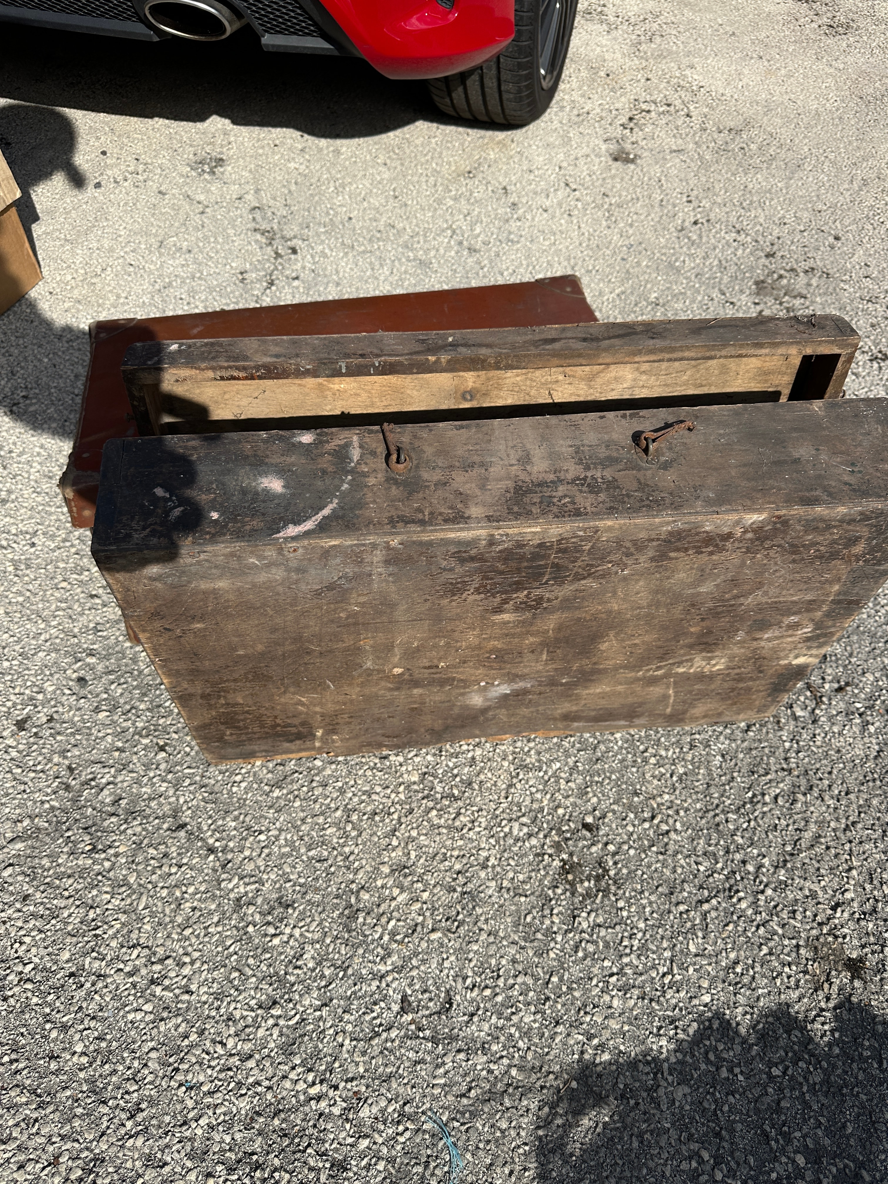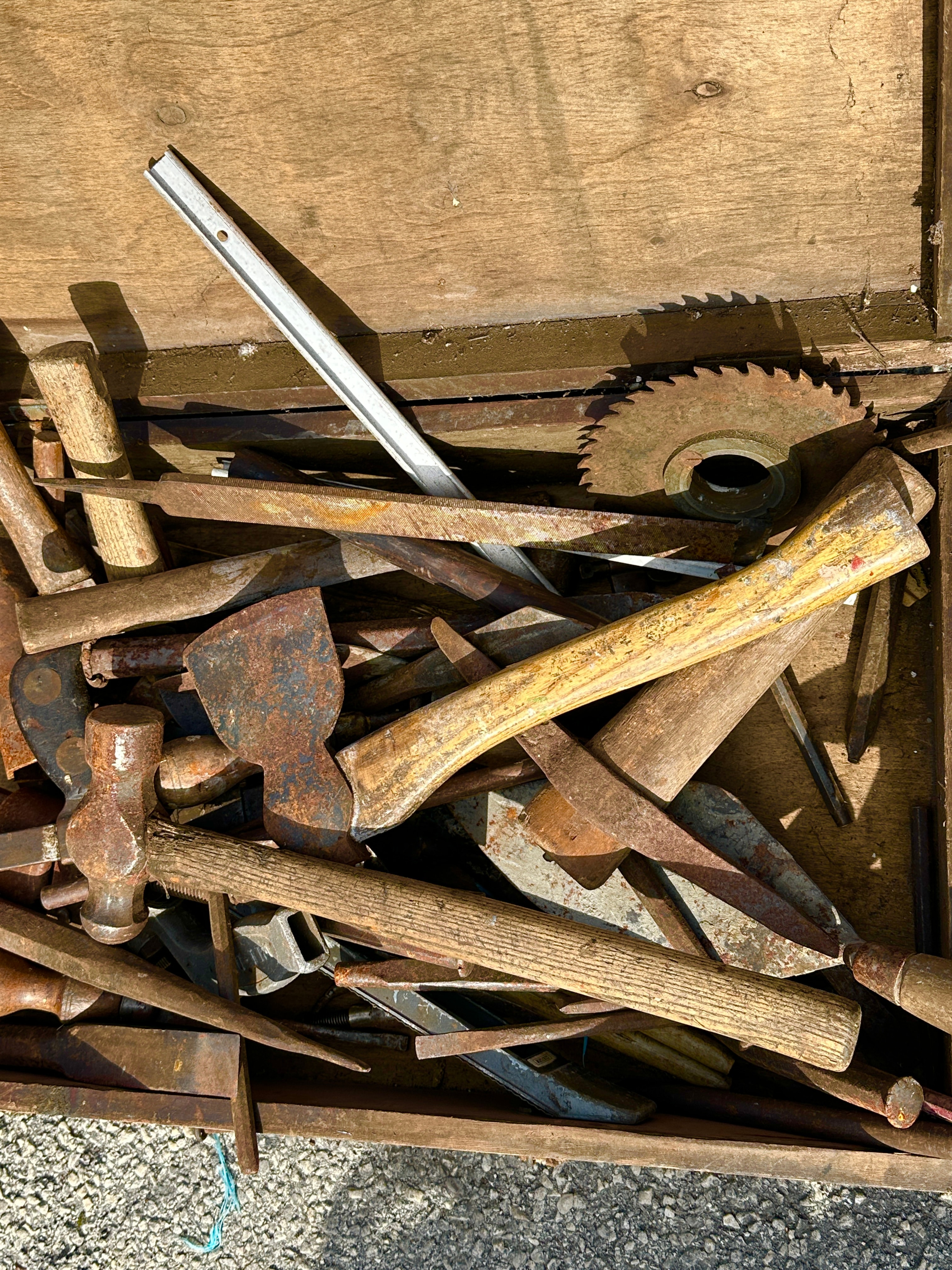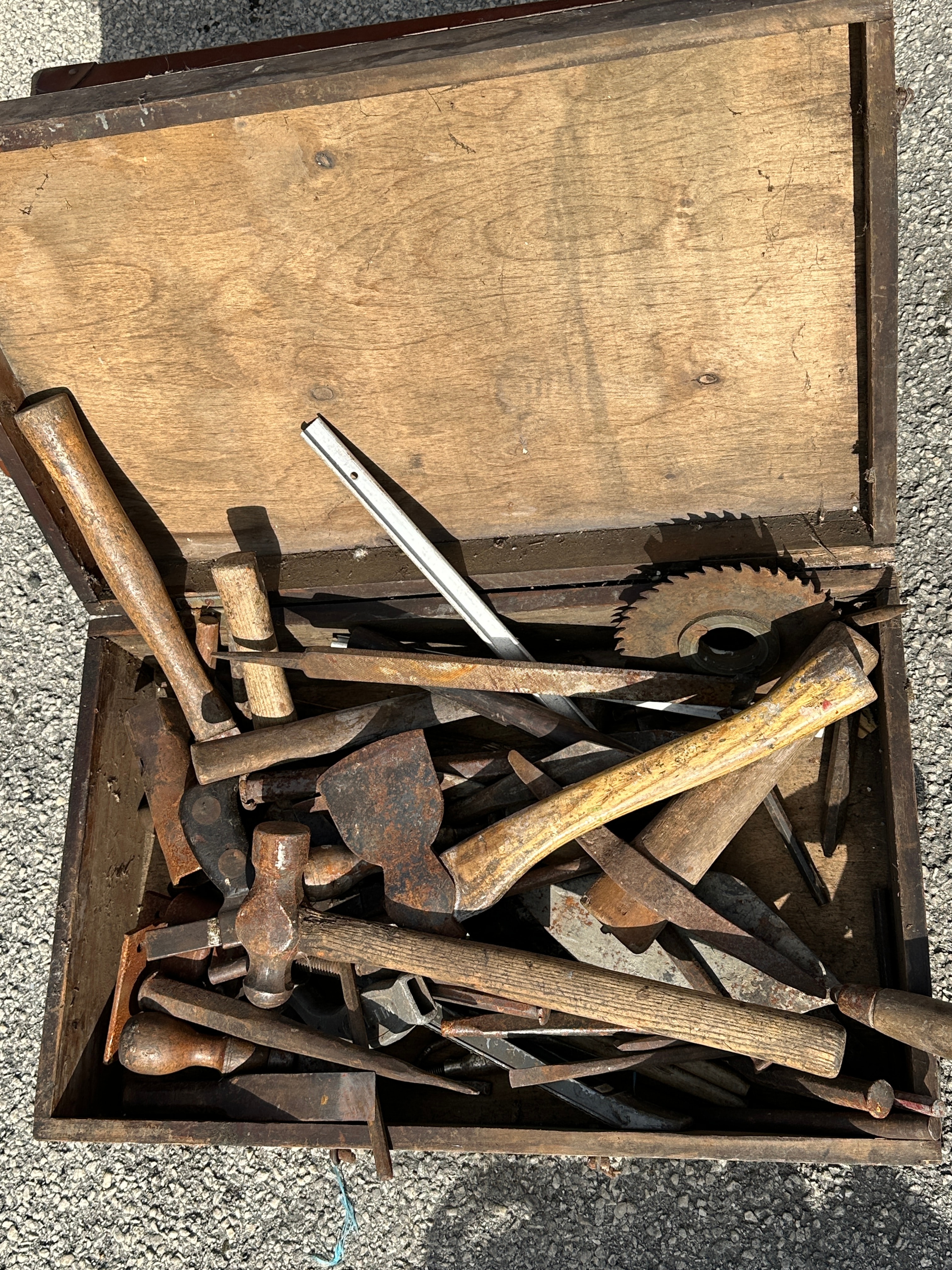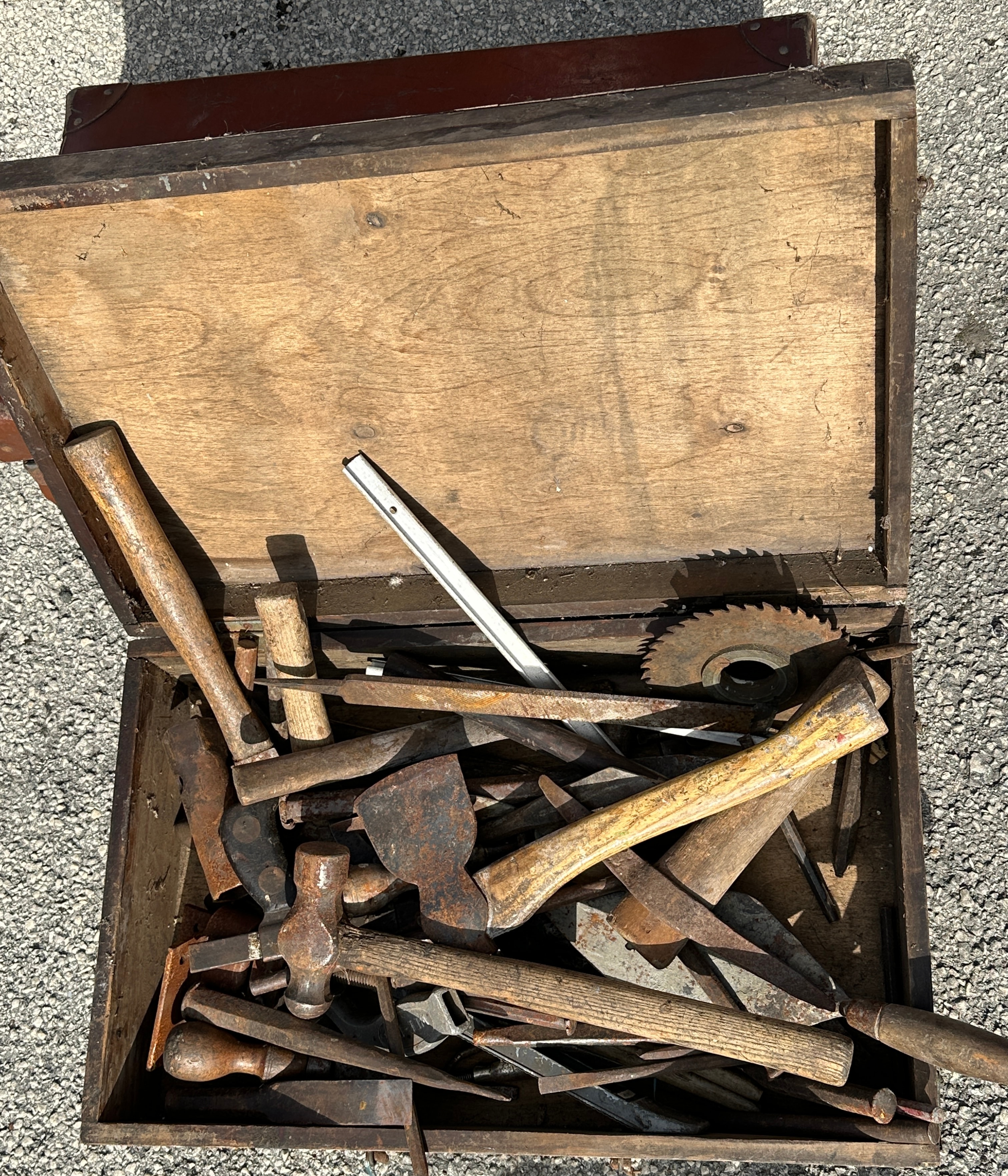A collection of vintage hand tools housed within a rectangular, hinged wooden toolbox. The box is constructed from dark, unfinished wood. The assortment of tools includes multiple hammers (such as ball-peen and claw types), axes/hatchets, chisels, a circular saw blade, various pry bars, and other utilitarian implements. The tools are predominantly crafted from forged metal, likely steel or iron, with various wooden handles. No visible text, brand names, or specific identifying markings are discernible on either the box or its contents.
