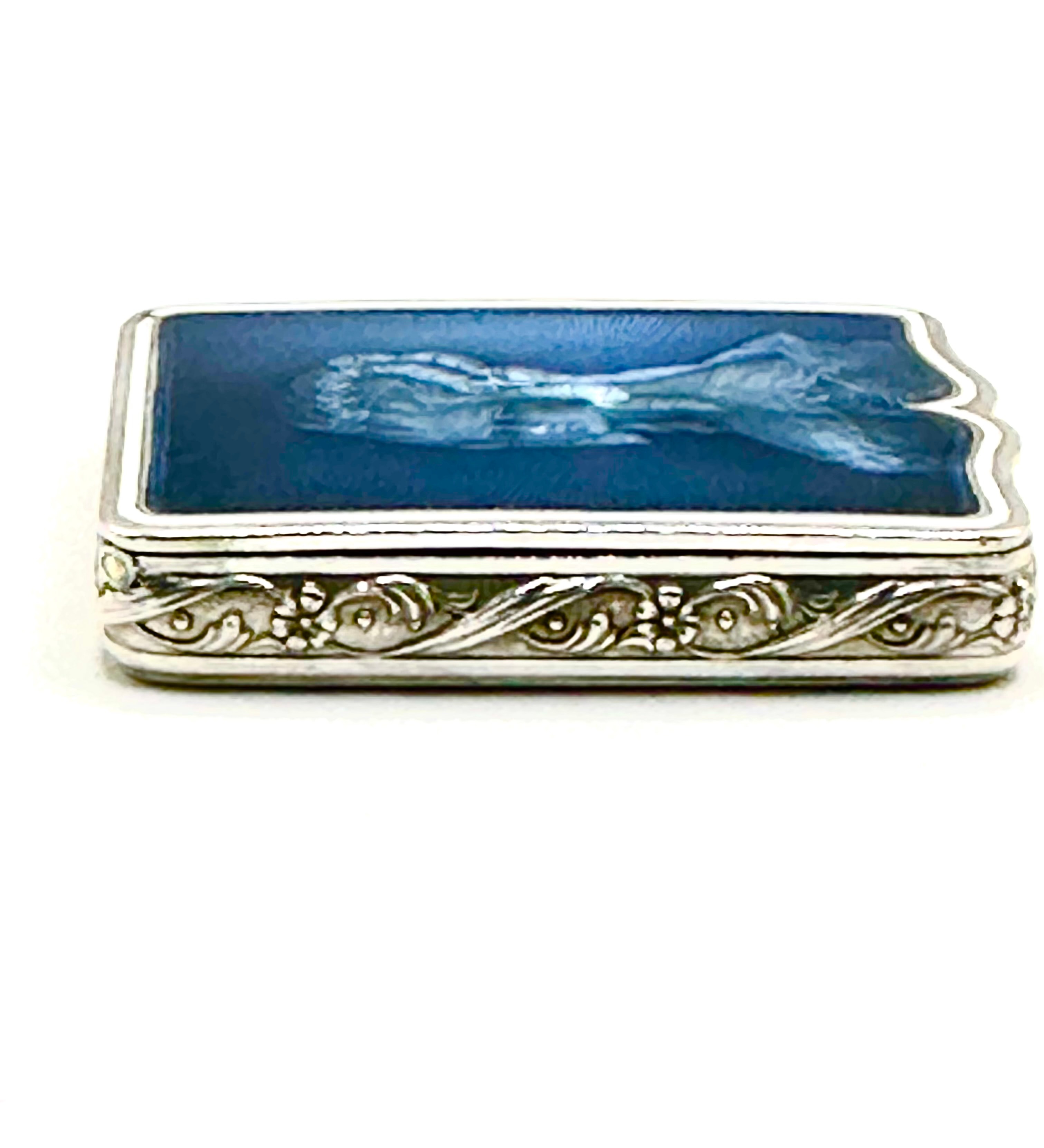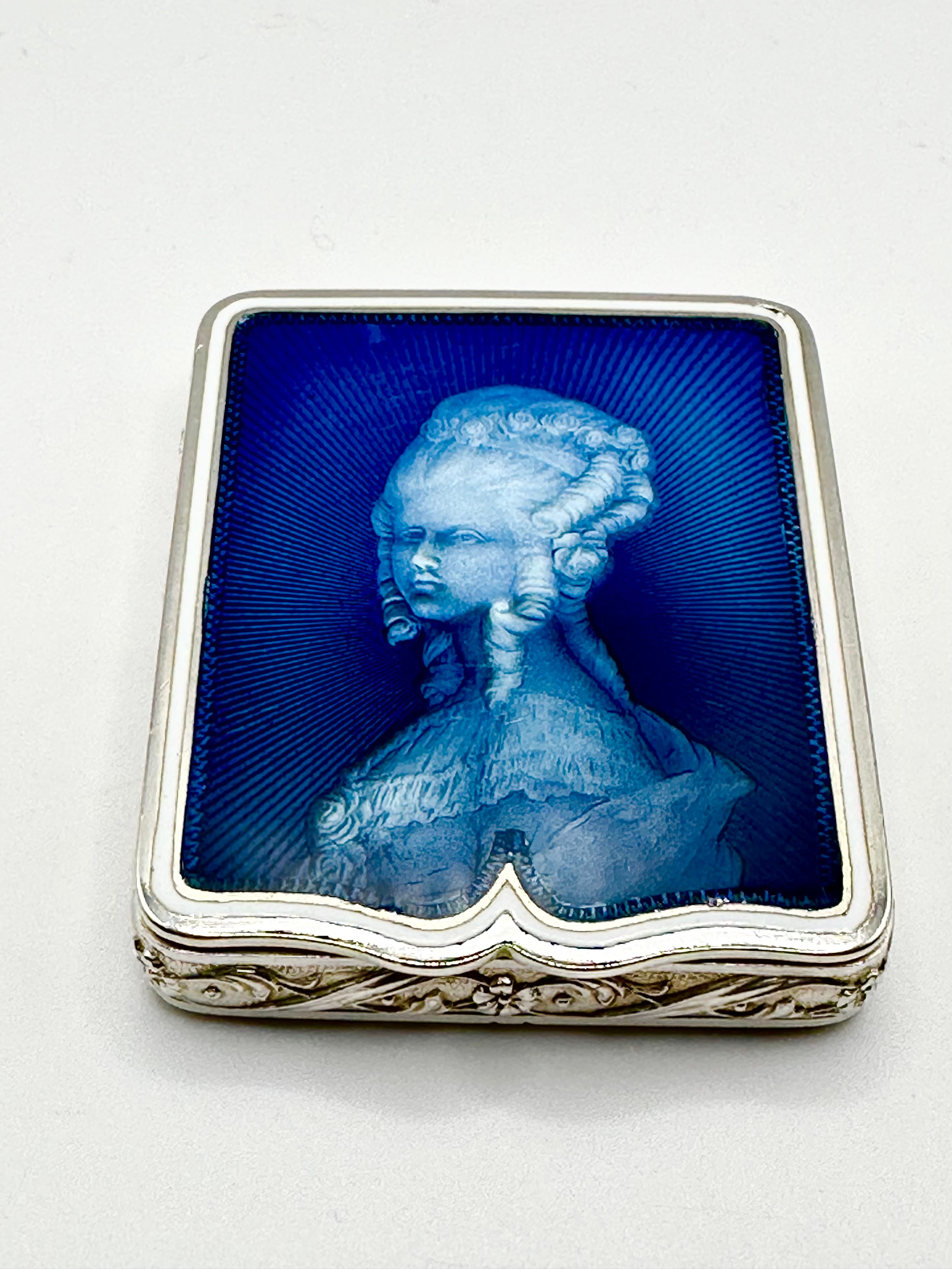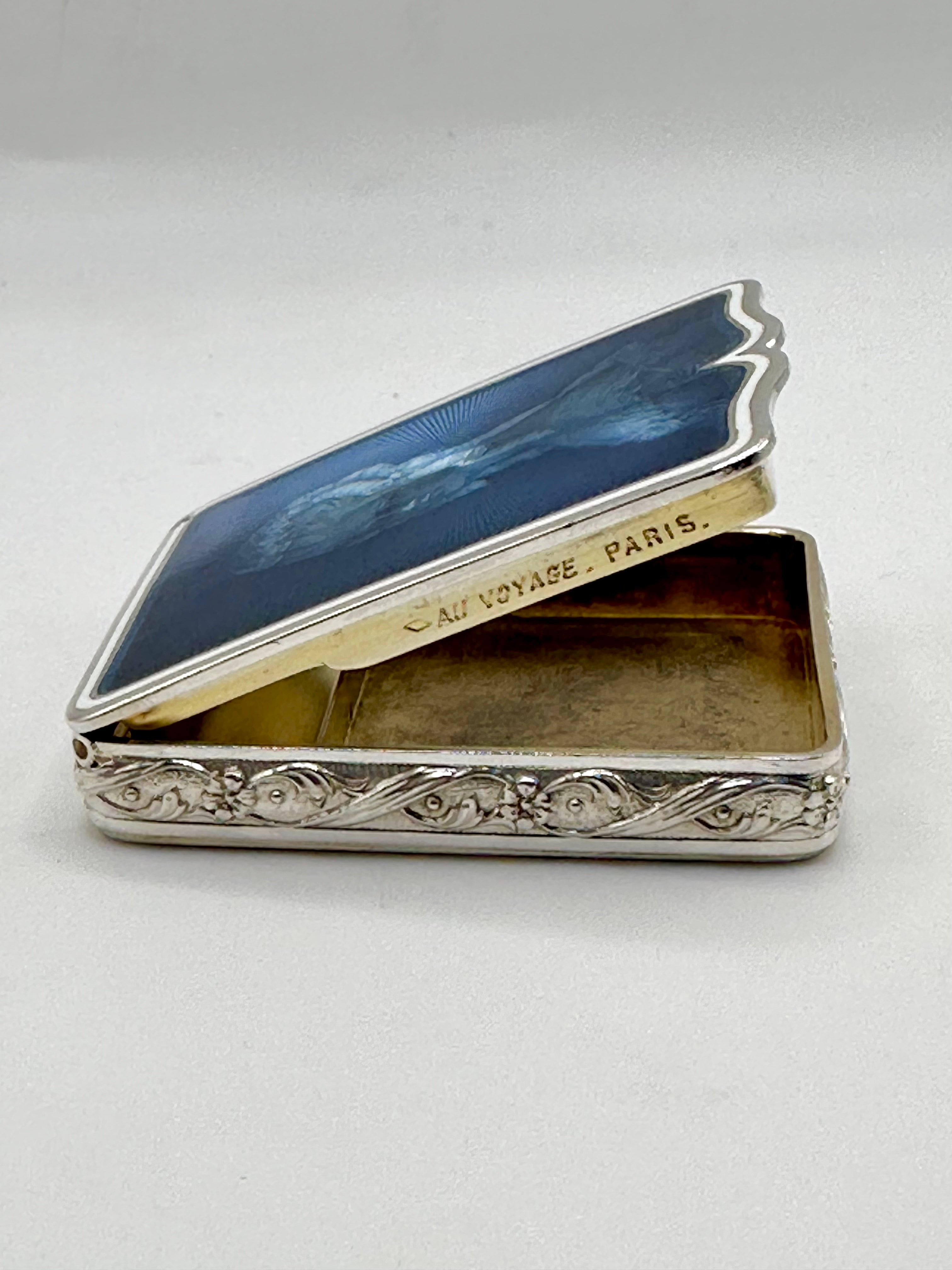 A rectangular hinged vanity case, crafted from 925 silver. The exterior sides are adorned with ornate floral and scroll relief decoration. The lid features a deep blue guilloché enamel ground, over which a light blue portrait of a woman in an 18th-century style powdered wig and dress is depicted. The interior is gilded and fitted with a mirror in the lid, along with internal compartments. The interior rim of the lid is engraved “AU VOYAGE . PARIS.”, indicating a Parisian retailer.