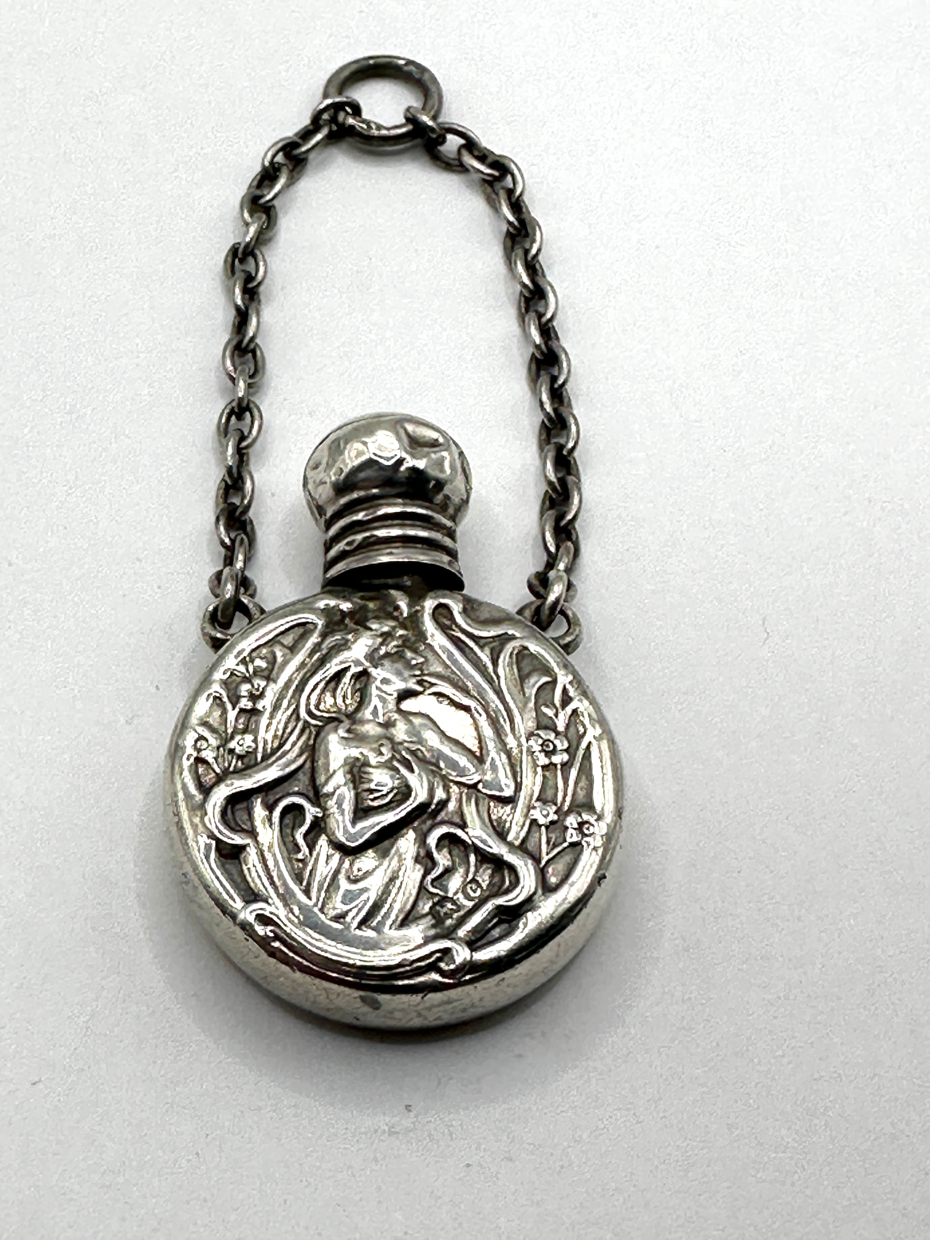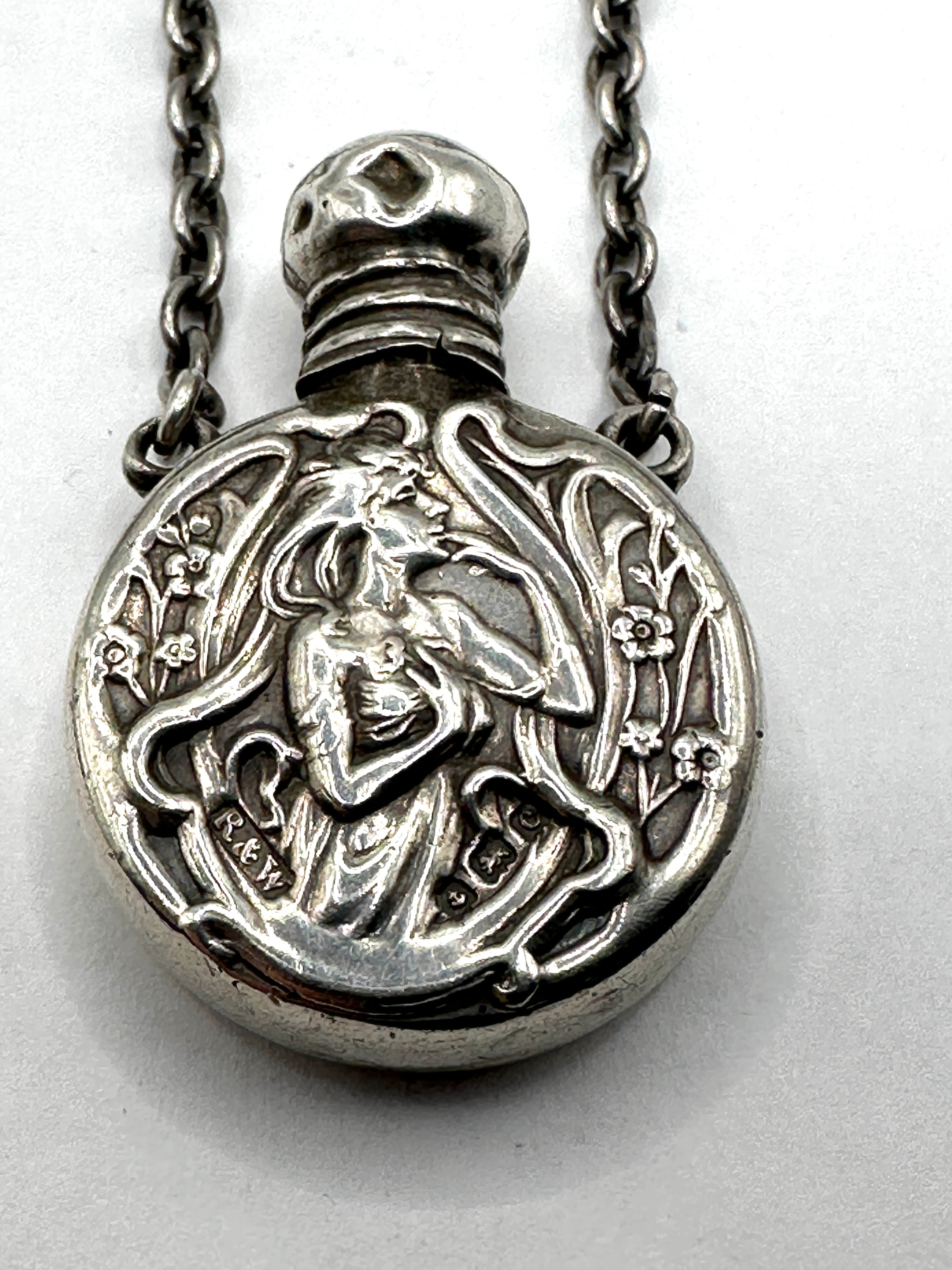 An Art Nouveau sterling silver perfume bottle pendant, depicting a nymph playing a lyre. This small, round, silvery-toned metal bottle features a screw-top stopper and an attached chain, allowing it to be worn as a pendant or used as a vinaigrette. The body is adorned with an embossed Art Nouveau design, showcasing a stylized female figure with flowing hair surrounded by organic and floral motifs. The initials “R.E.W.” are visibly engraved into the lower left of the main design. Likely dating from the late 19th to early 20th century.