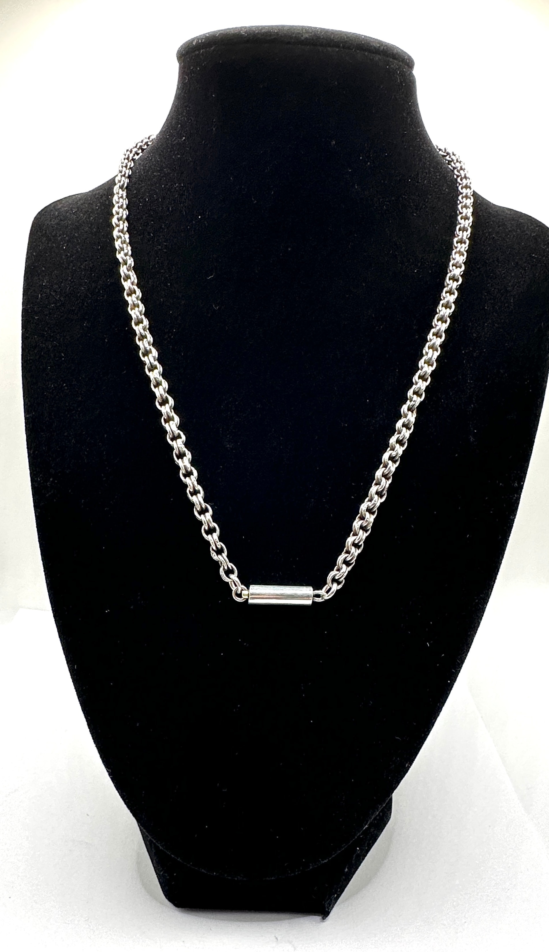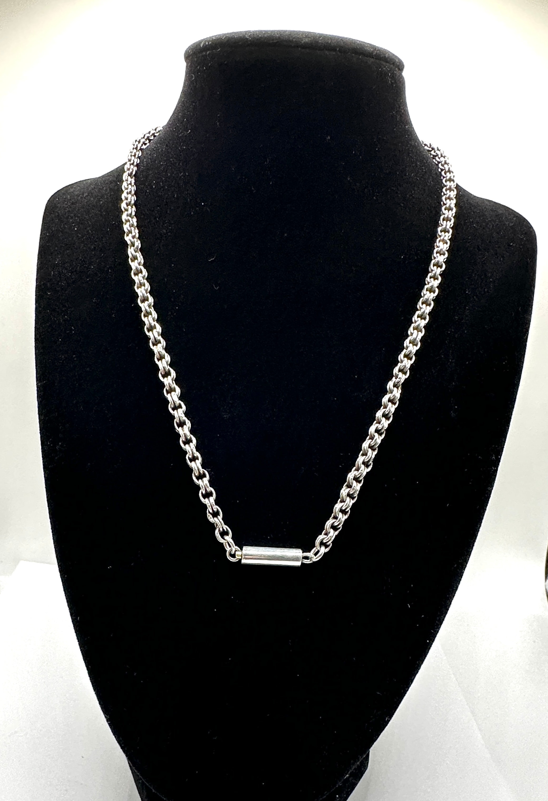 A 15.5-inch locking chain necklace with an Allen key closure. This silver-toned metal necklace features a rolo or belcher style chain, composed of round, interlocking links. A smooth, polished cylindrical bar element is positioned centrally at the front, designed to function as the locking mechanism. No discernible text, markings, or hallmarks are visible.