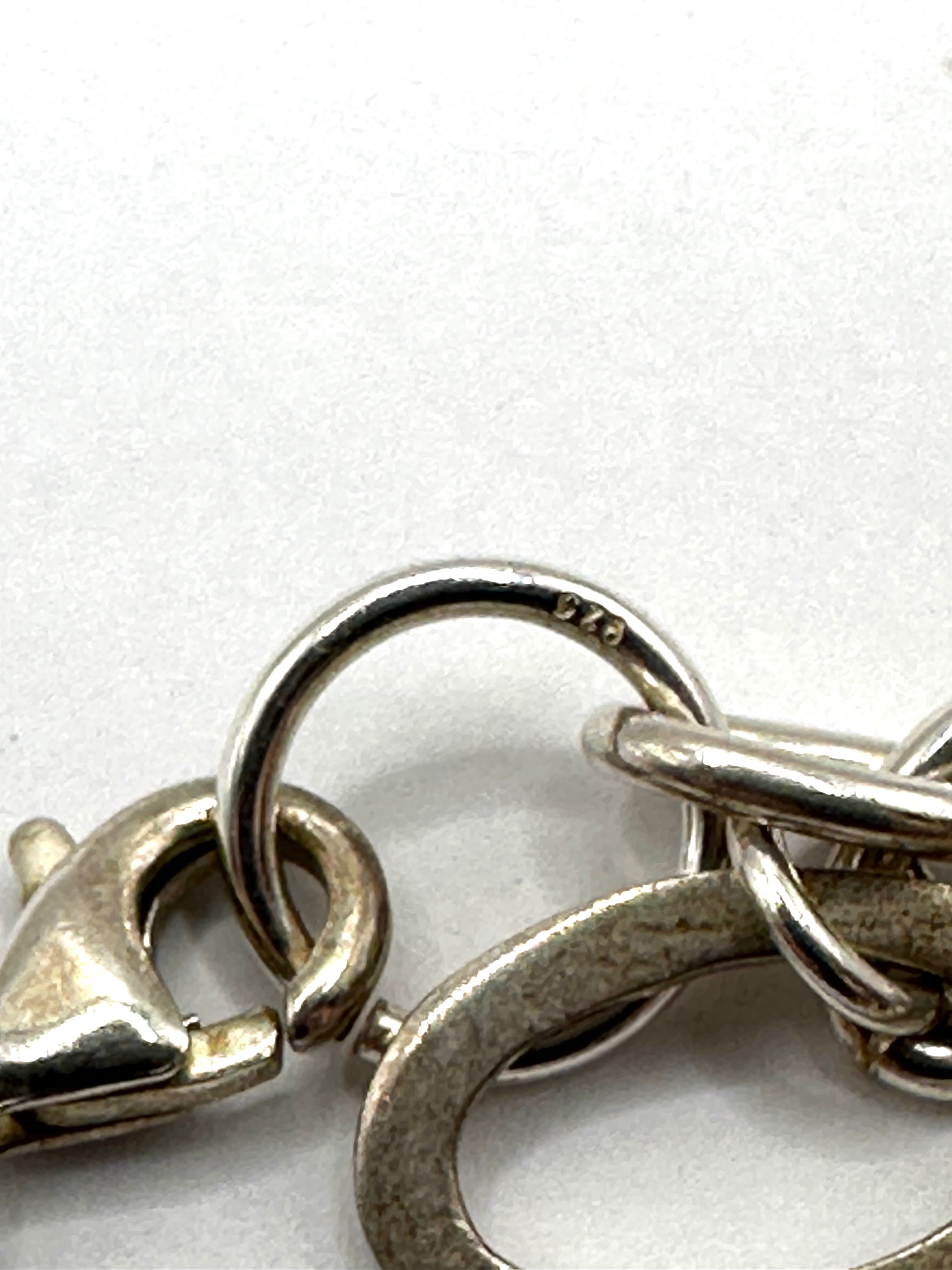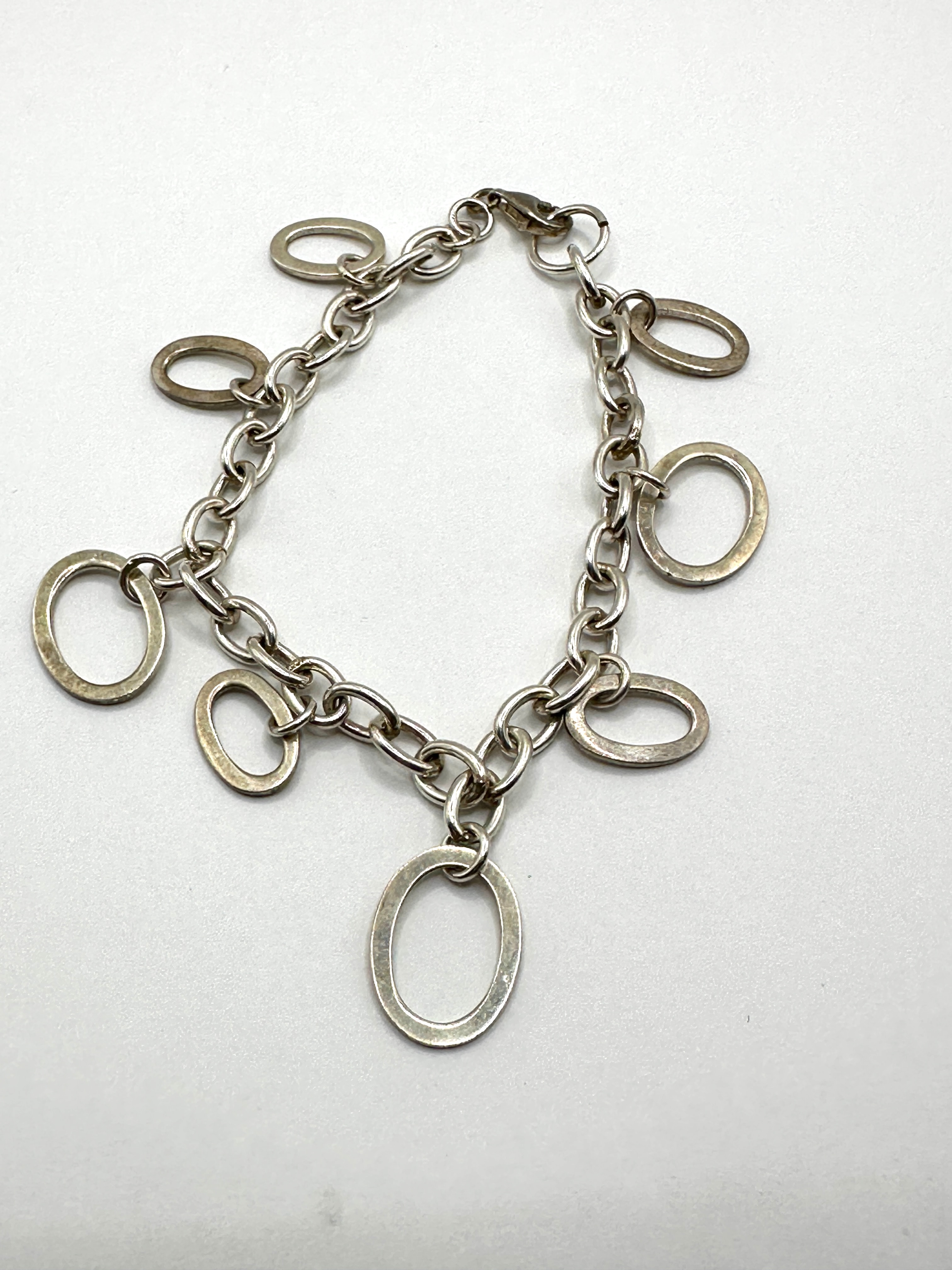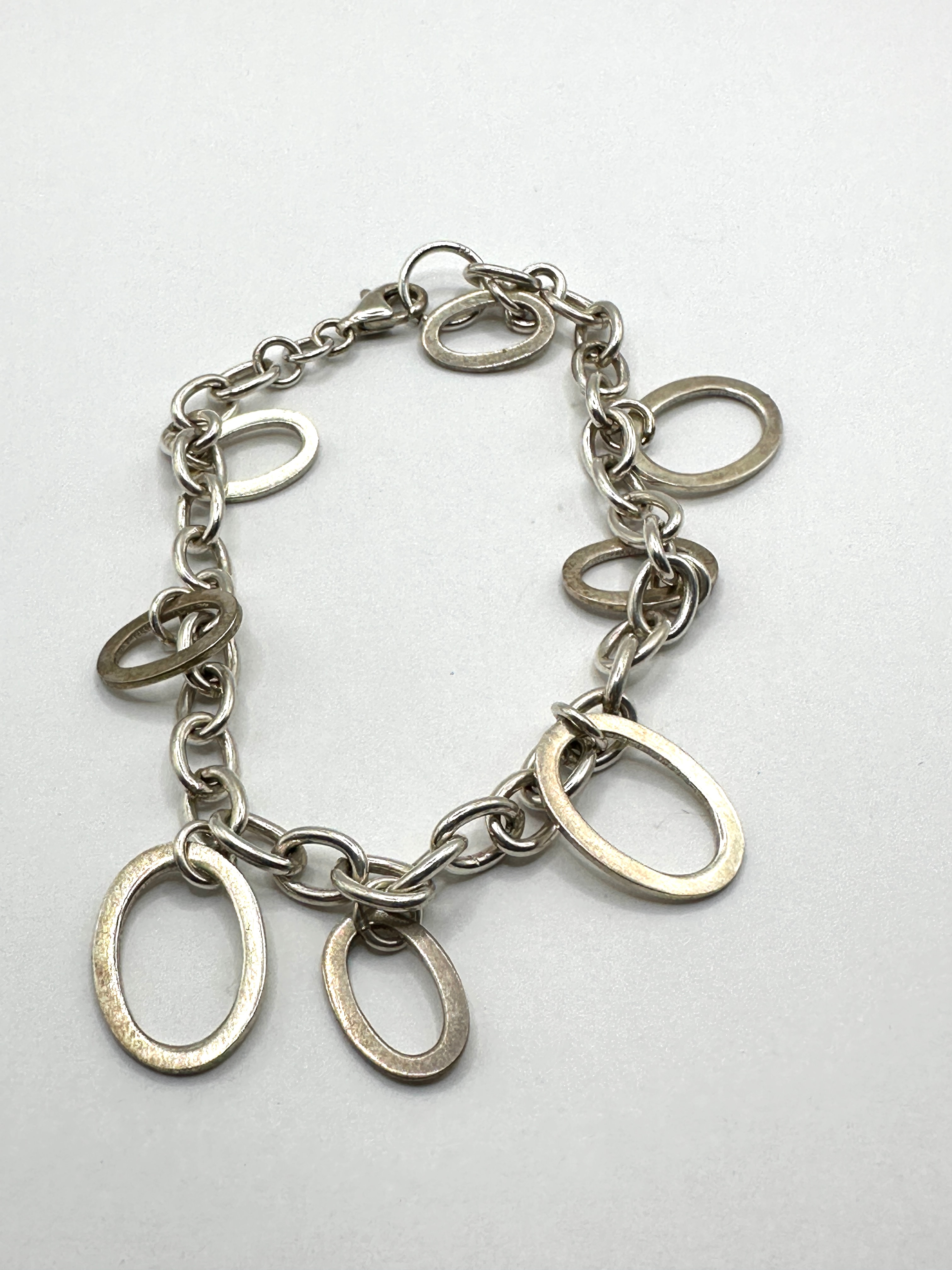 A sterling silver oval dangle link bracelet, featuring a chain-link design with a lobster clasp closure. Approximately ten flat, oval-shaped charms or links are suspended at intervals. A ‘925’ hallmark, indicating sterling silver, is clearly visible on a jump ring near the clasp.