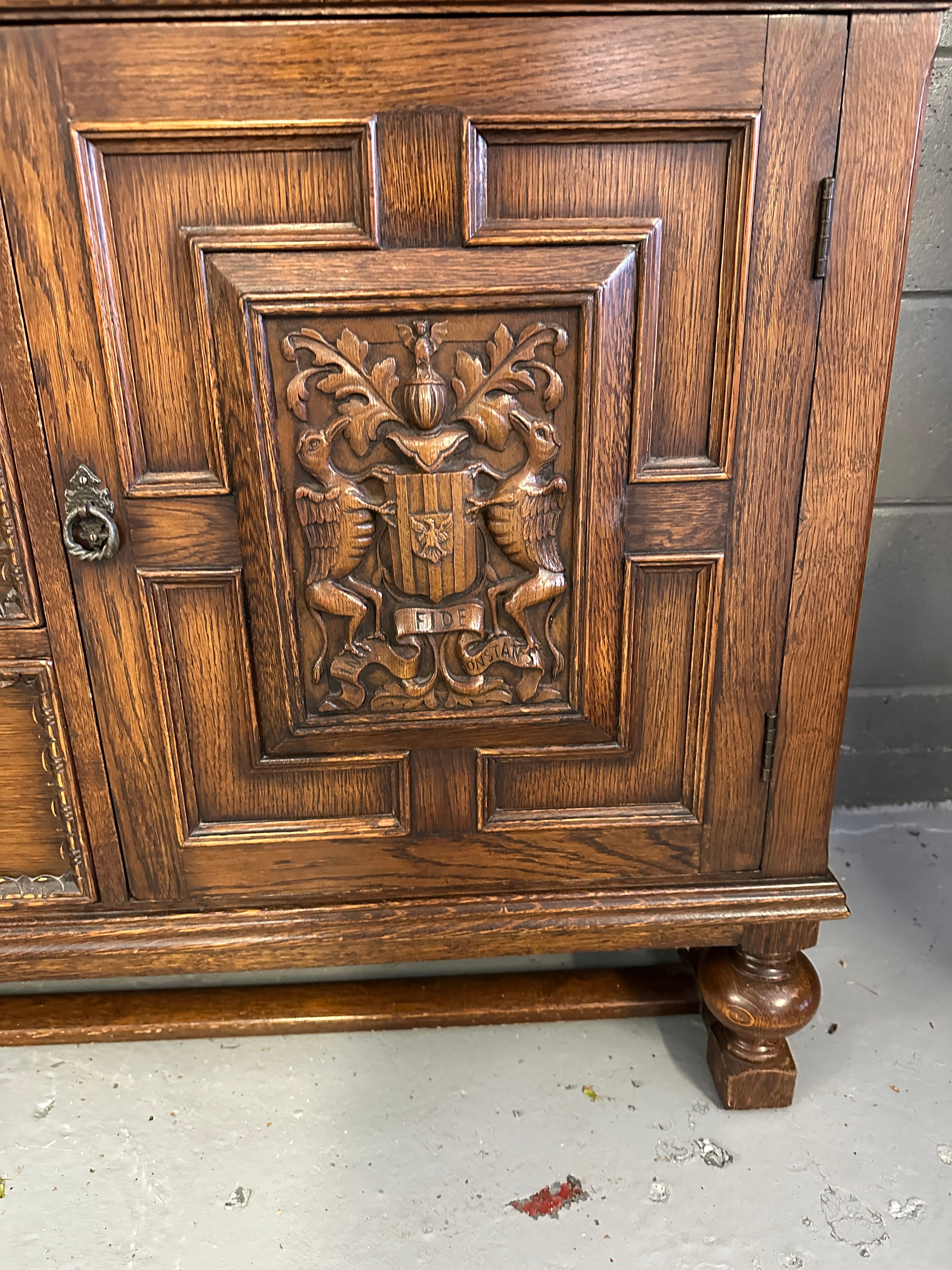 A two-part oak dresser with an open hutch top, presenting in a Jacobean or Renaissance Revival style, likely dating from the late 19th to early 20th century. Constructed from dark-stained wood, the piece features a deeply carved pediment-style top and three open shelves with brass-toned rails. The base unit comprises two paneled cupboard doors flanking three central drawers. The cupboard doors are extensively carved with armorial crests, each depicting a shield flanked by mythical winged creatures. Visible text on the crest banners includes “FIDE ET FORTITUDINE” (By Faith and Fortitude) and “VIGILATE ET ORATE” (Watch and Pray). Hardware consists of small brass-toned drawer pulls and dark metal ring pulls on the doors.