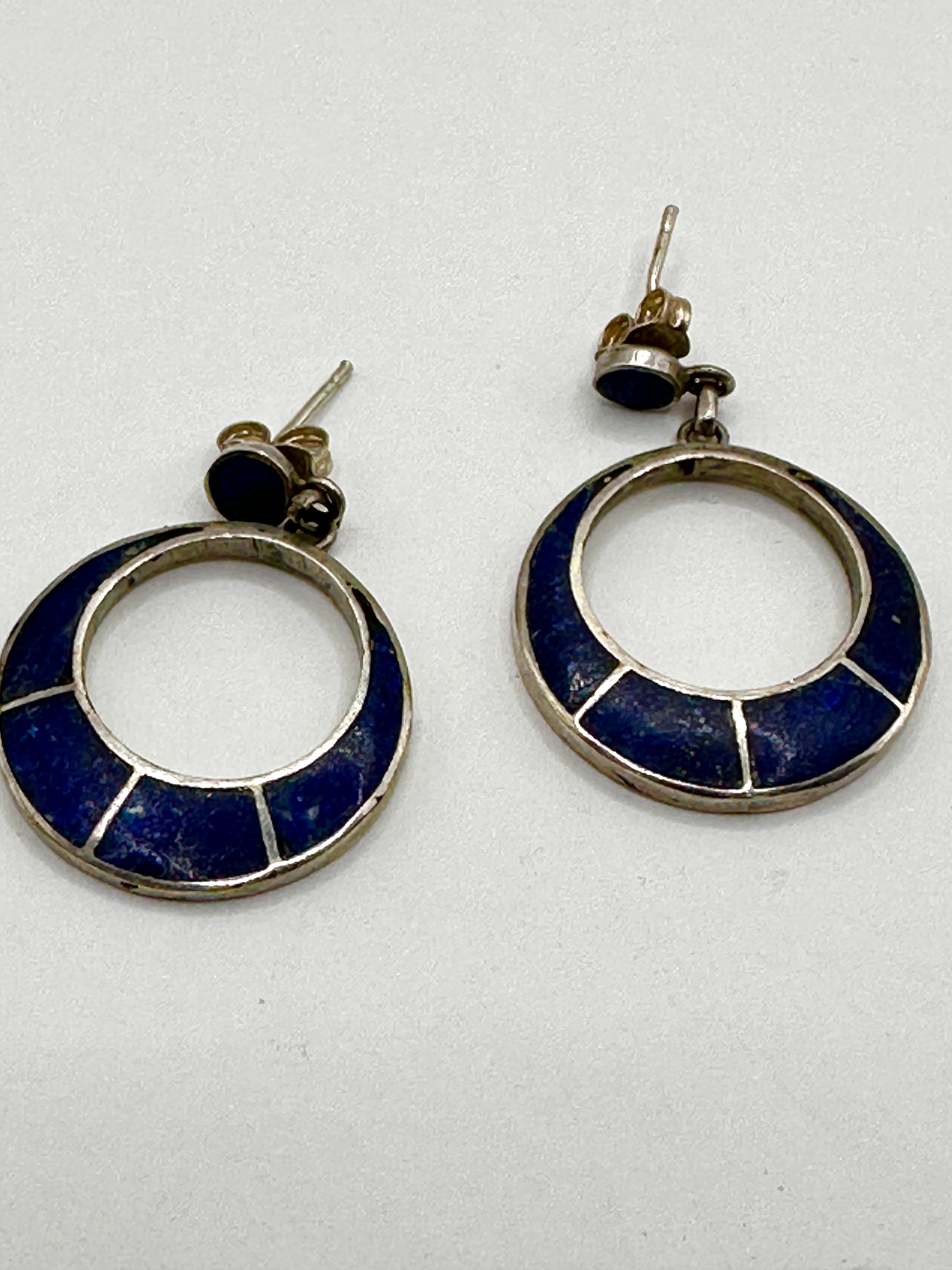 A pair of dangle earrings, each featuring a circular, open-hoop drop suspended from a small dark blue cabochon stud with a post back. The front surface of the circular drops is inlaid with irregularly shaped pieces of dark blue stone, consistent with lapis lazuli, separated by thin silver-tone metal lines in a mosaic pattern. The metal components appear to be sterling silver or a similar alloy, with several web sources suggesting 950 fine silver or sterling silver. The style is consistent with Southwestern or Chilean handcrafted jewelry.