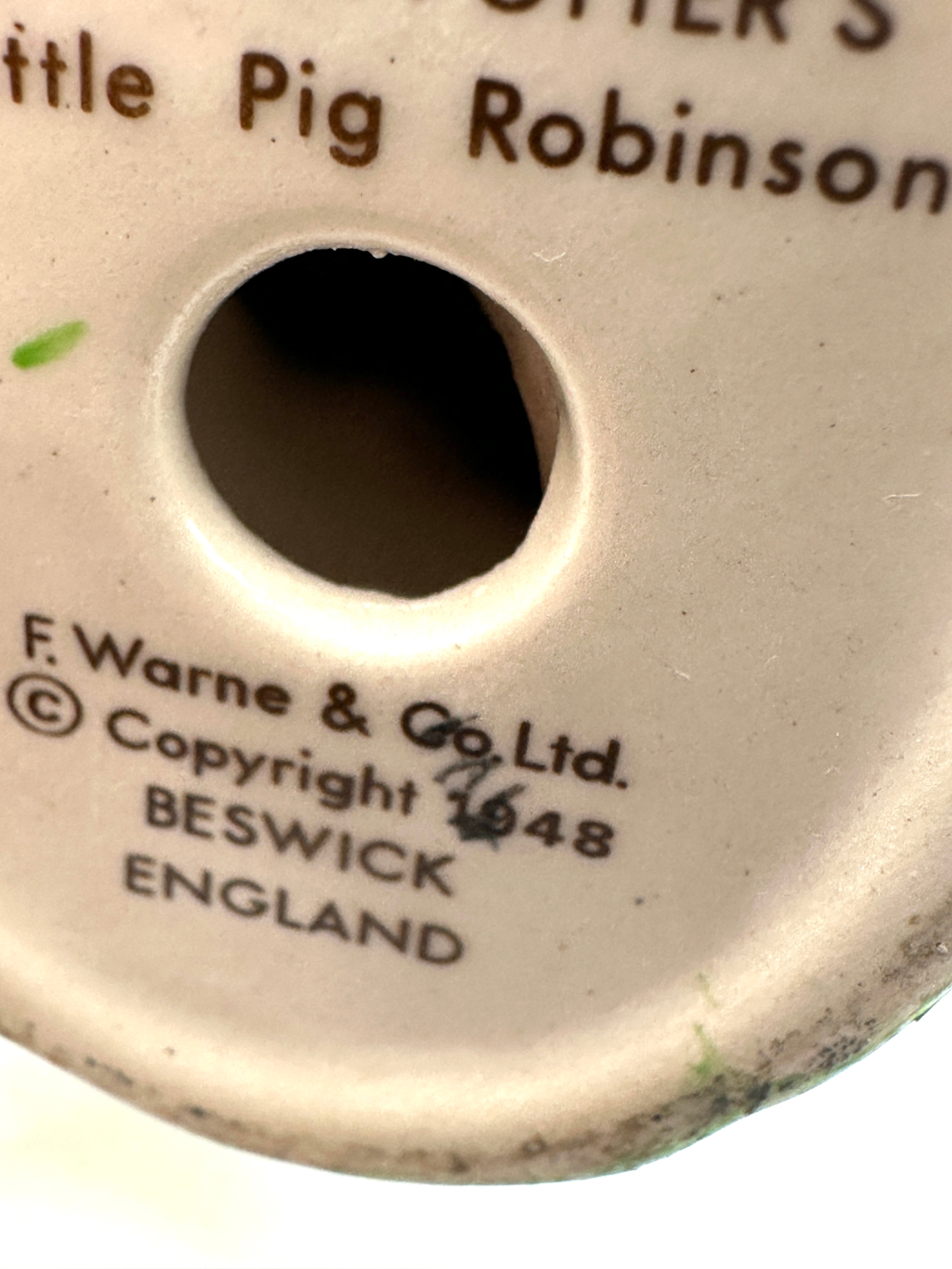 A pair of Beswick Beatrix Potter glazed ceramic figurines, depicting anthropomorphic pig characters from Beatrix Potter’s stories. One figure, ‘Pigling Bland,’ is dressed in a purple jacket and blue vest, marked on the underside “BEATRIX POTTER’S ‘Pigling Bland'” with “F. Warne & Co. Ltd. © Copyright 1956 BESWICK ENGLAND” and small handwritten decorator’s marks. The other, ‘Little Pig Robinson,’ wears a blue plaid sweater and carries a basket of produce, marked on the underside “BEATRIX POTTER’S ‘Little Pig Robinson'” with “F. Warne & Co. Ltd. © Copyright 1948 BESWICK ENGLAND” and small handwritten decorator’s marks. Both stand on green bases with a central hole.
