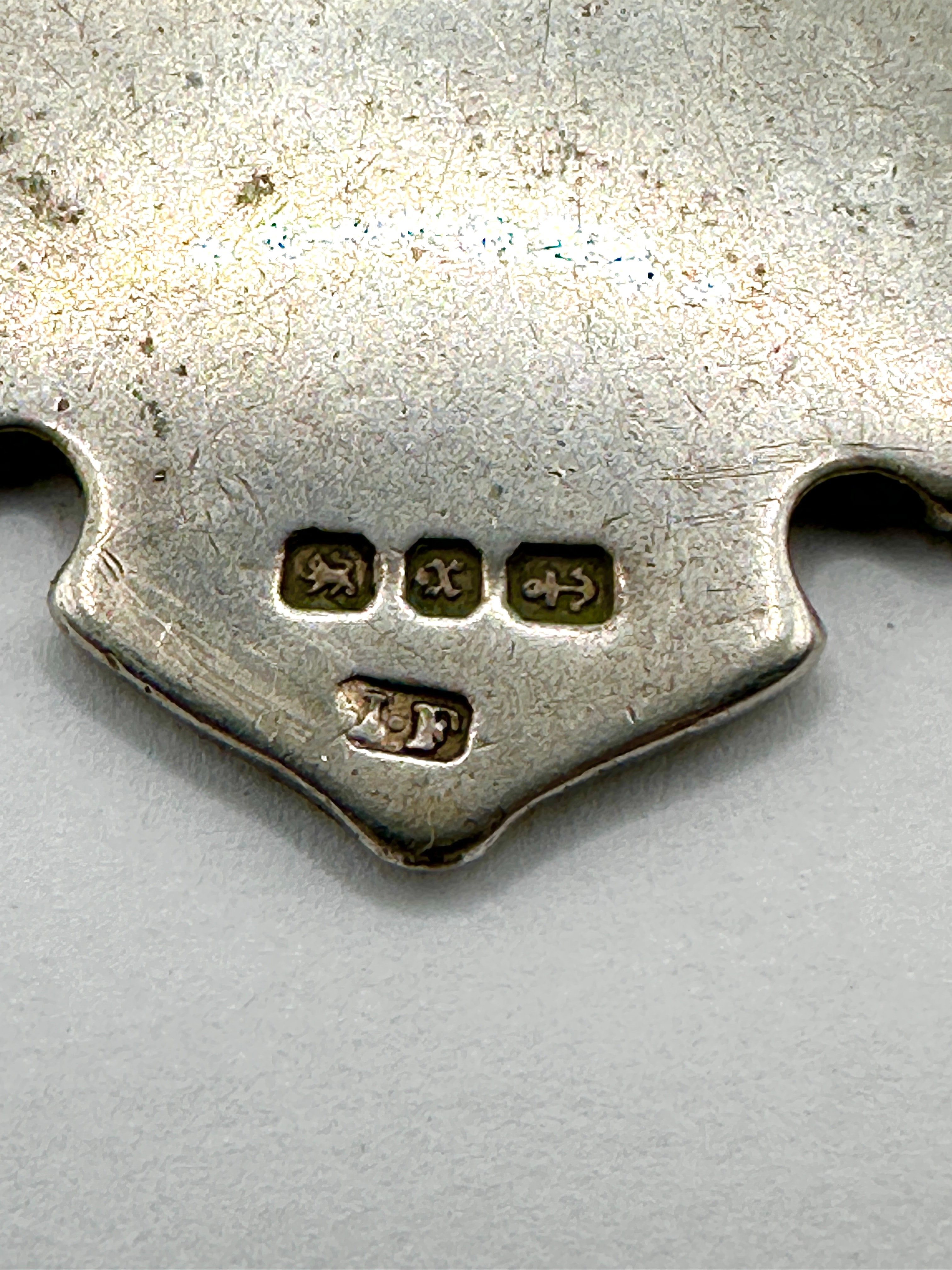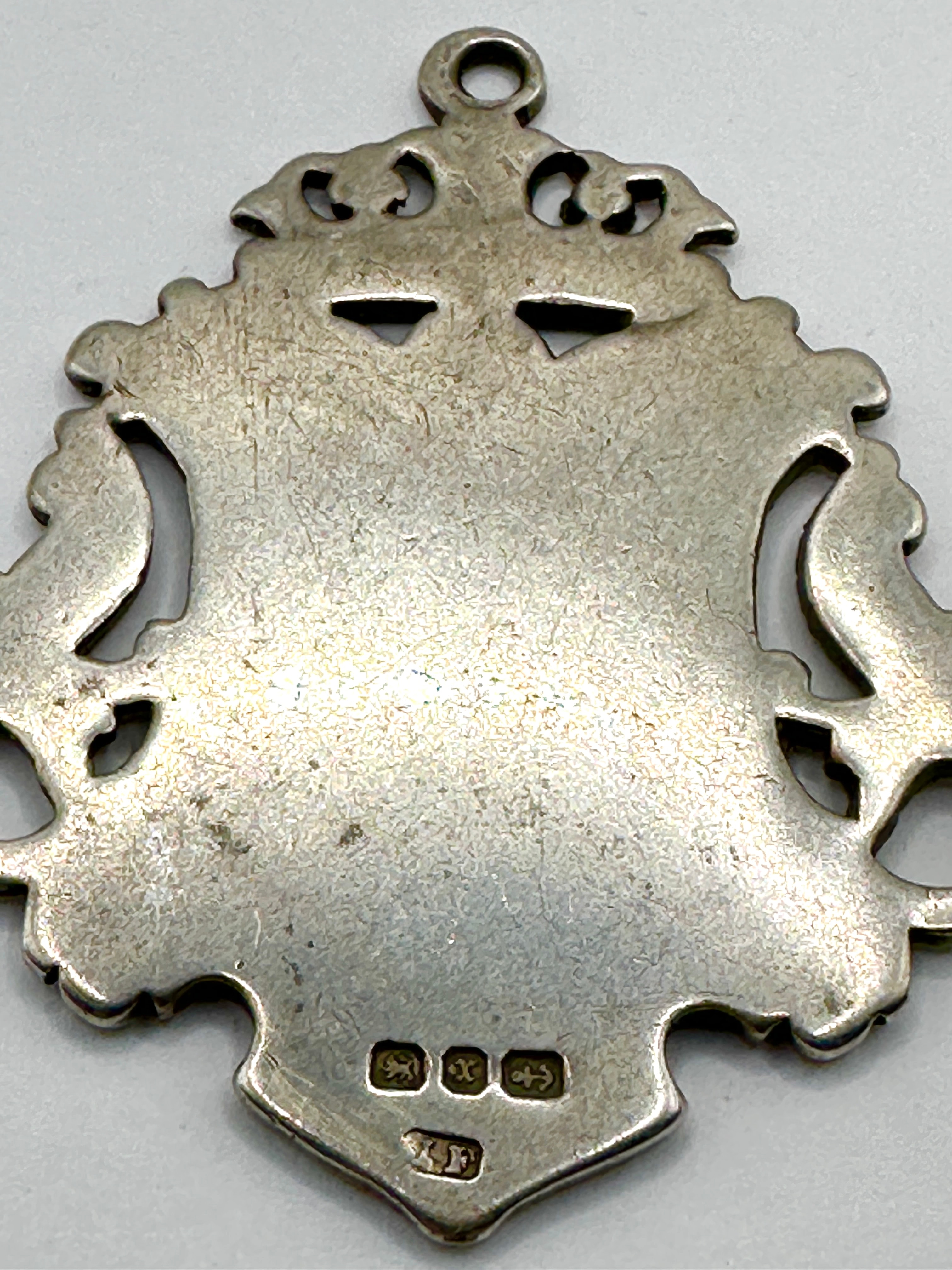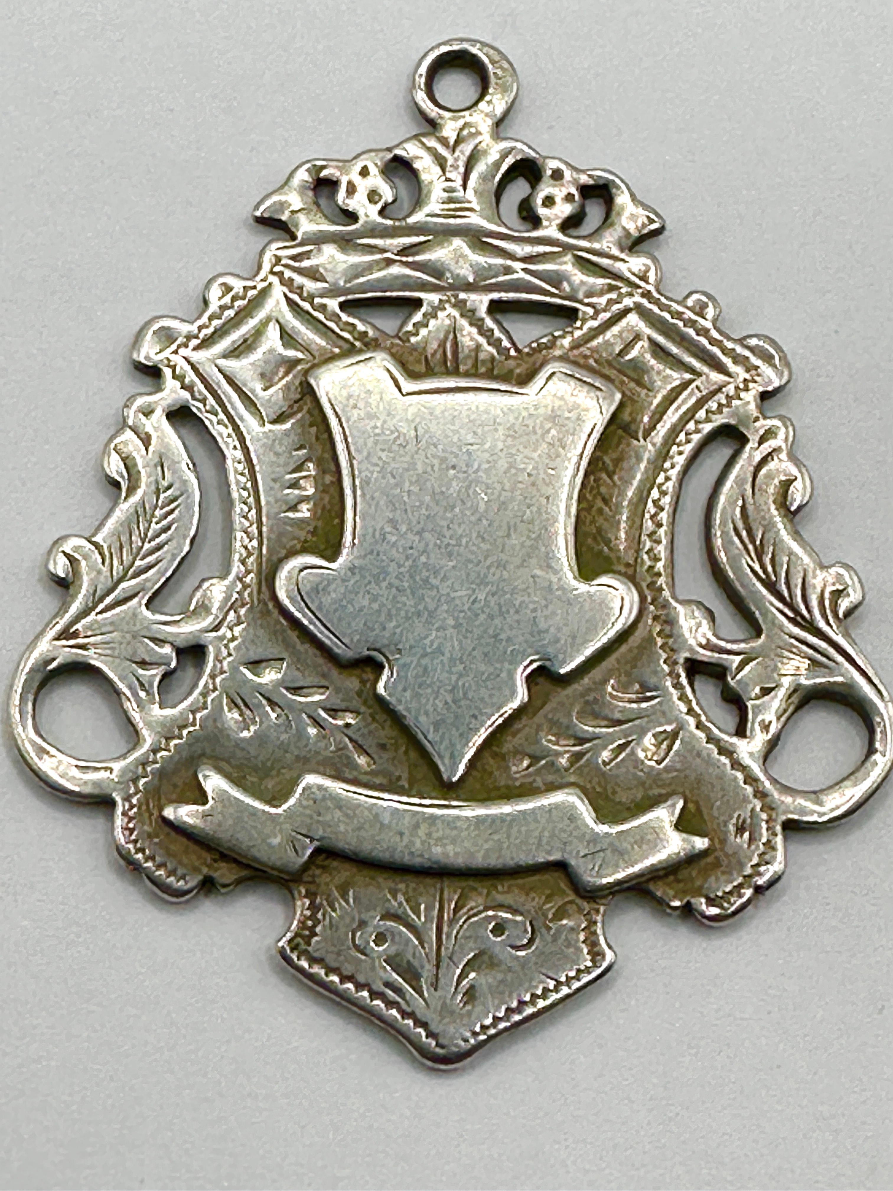 A Late Victorian sterling silver fob medal. This ornate piece exhibits a late Victorian or Edwardian aesthetic, featuring a central blank escutcheon for engraving, surrounded by intricate scrollwork, foliage motifs, and a blank banner cartouche at the base. A stylized crown or crest element adorns the top, below a suspension loop. The reverse, otherwise plain, clearly displays British hallmarks: the lion passant for sterling silver, an anchor indicating the Birmingham Assay Office, and a capital ‘X’ date letter for the year 1897. A maker’s mark, possibly ‘J.F’ for James Fenton, is also visible.