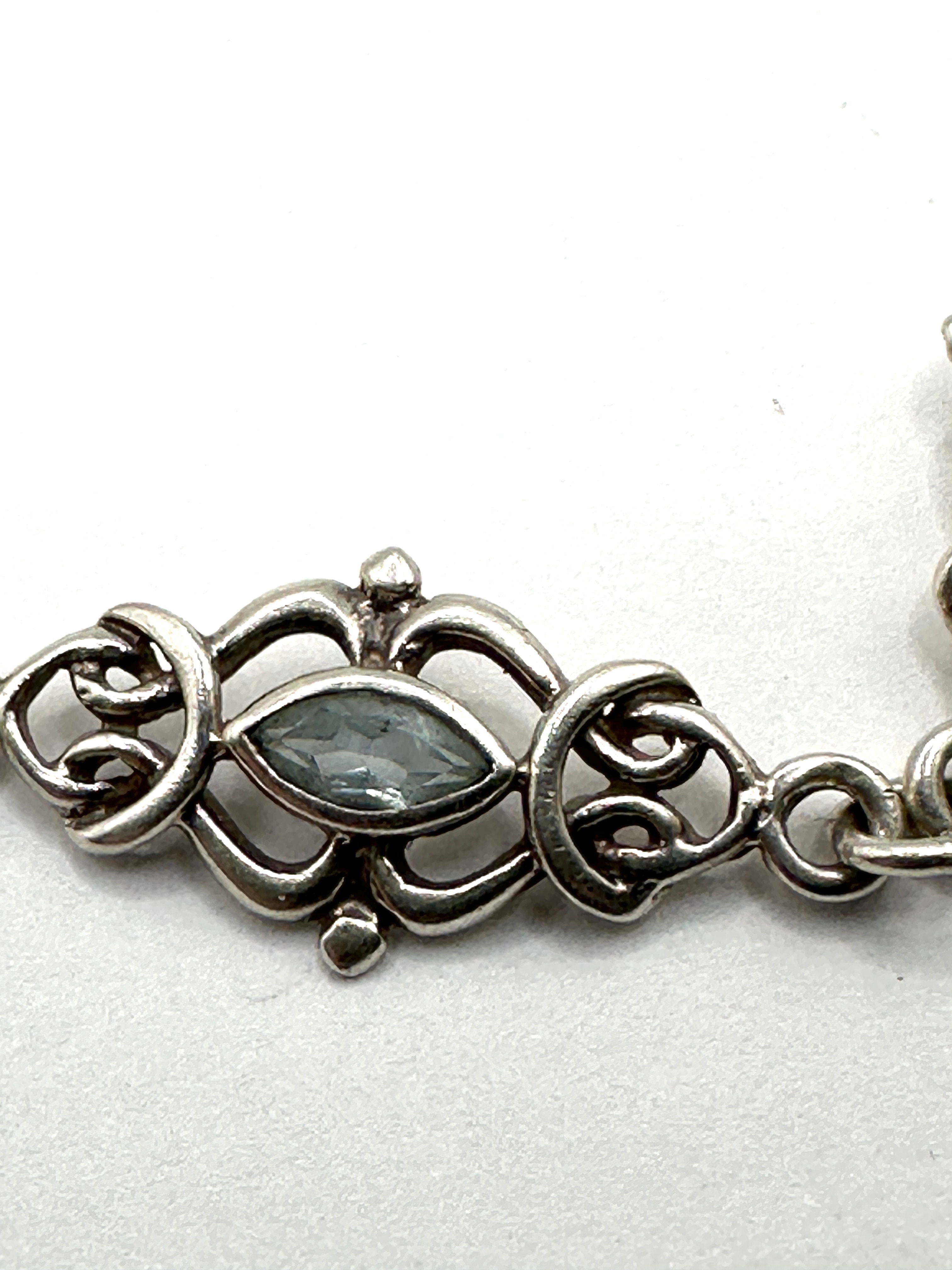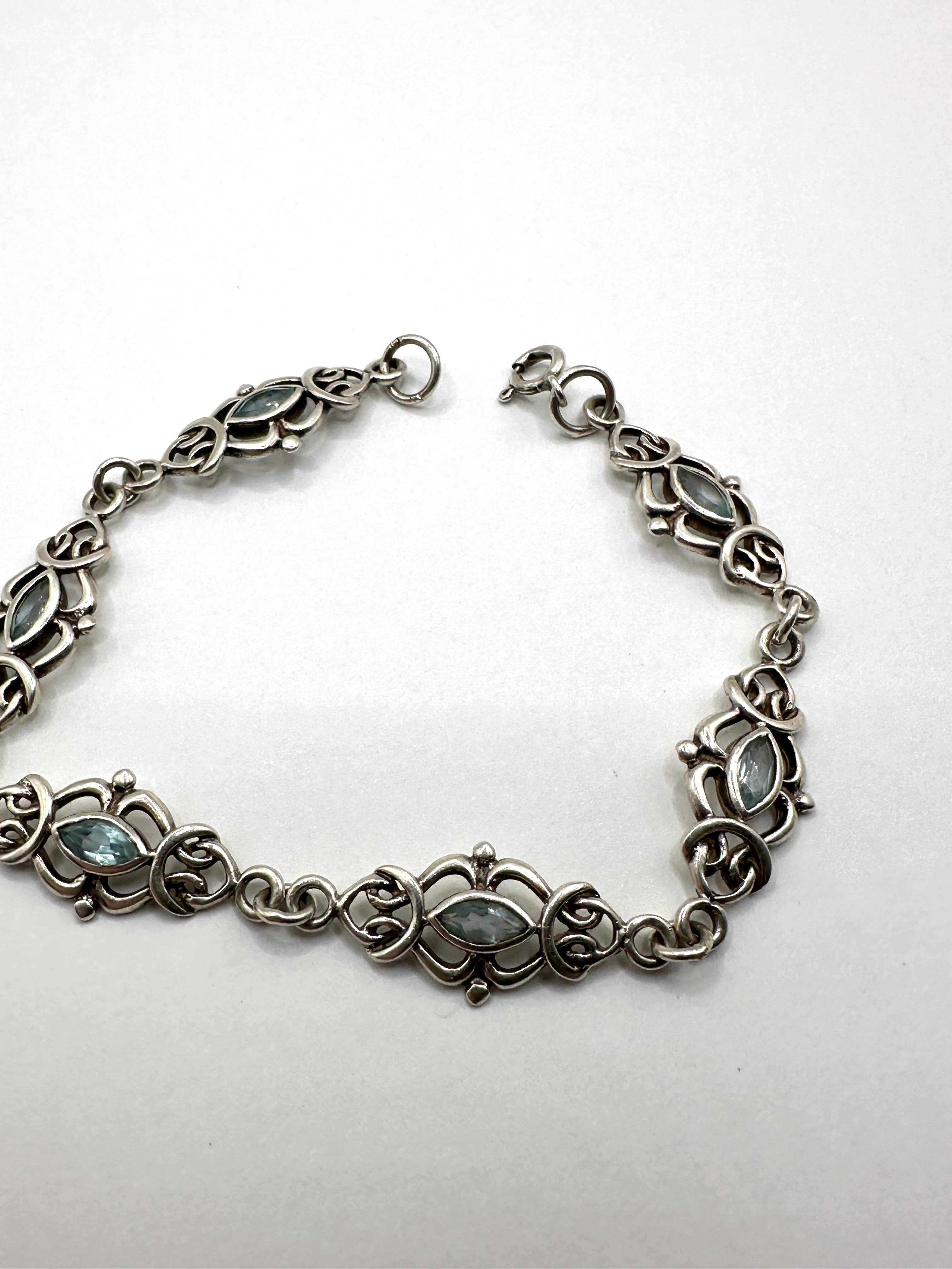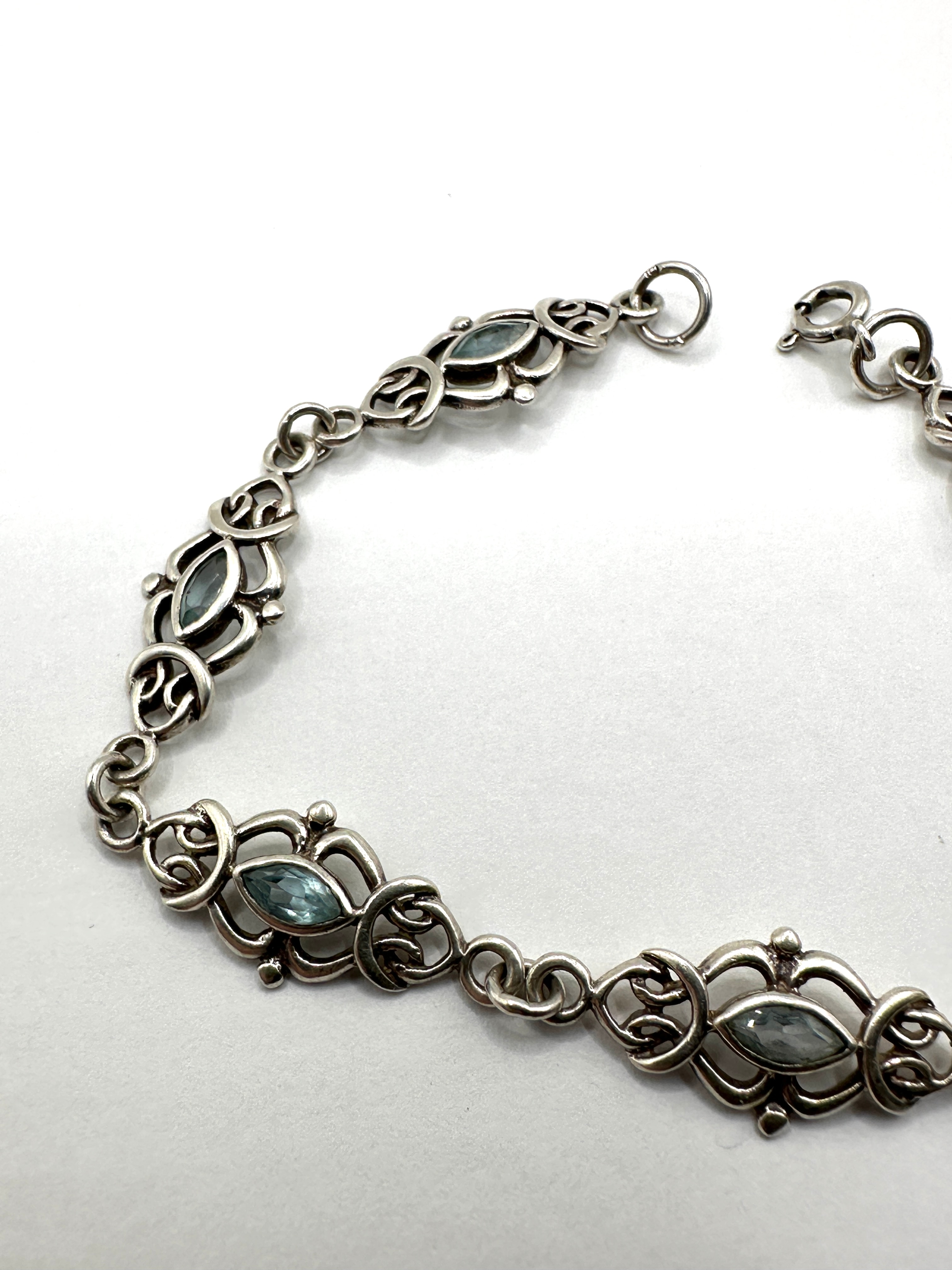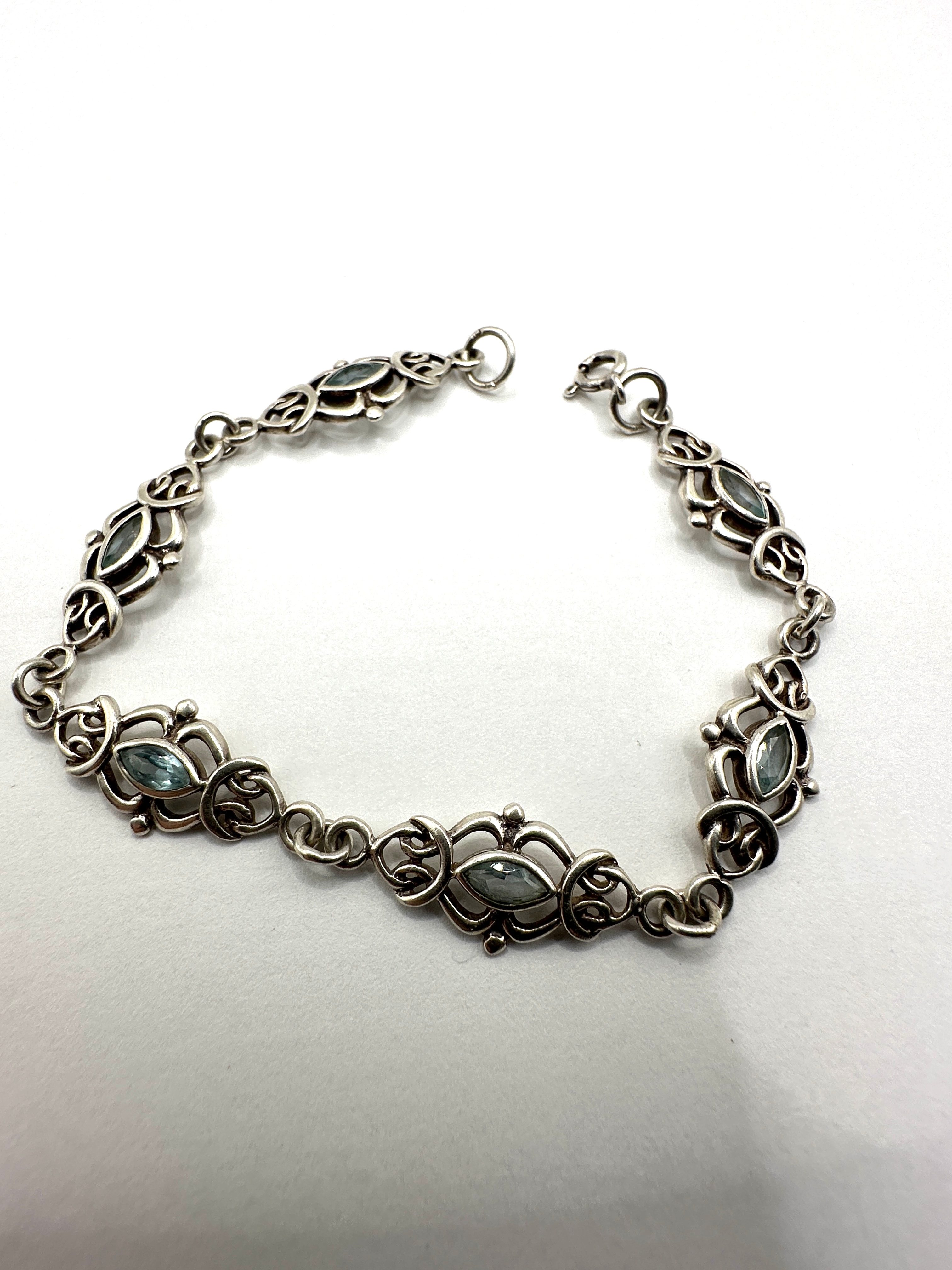 A Sarda sterling silver bracelet. This link bracelet features a series of alternating openwork decorative links and small circular connectors. Each ornate link is centrally set with a single marquise-cut, translucent light blue stone, likely blue topaz, surrounded by curvilinear, knot-like motifs and accented with small raised dot elements. The design style, with its flowing lines and organic forms, is reminiscent of Art Nouveau or Celtic Revival aesthetics. The bracelet is secured by a spring ring clasp and jump ring closure.
