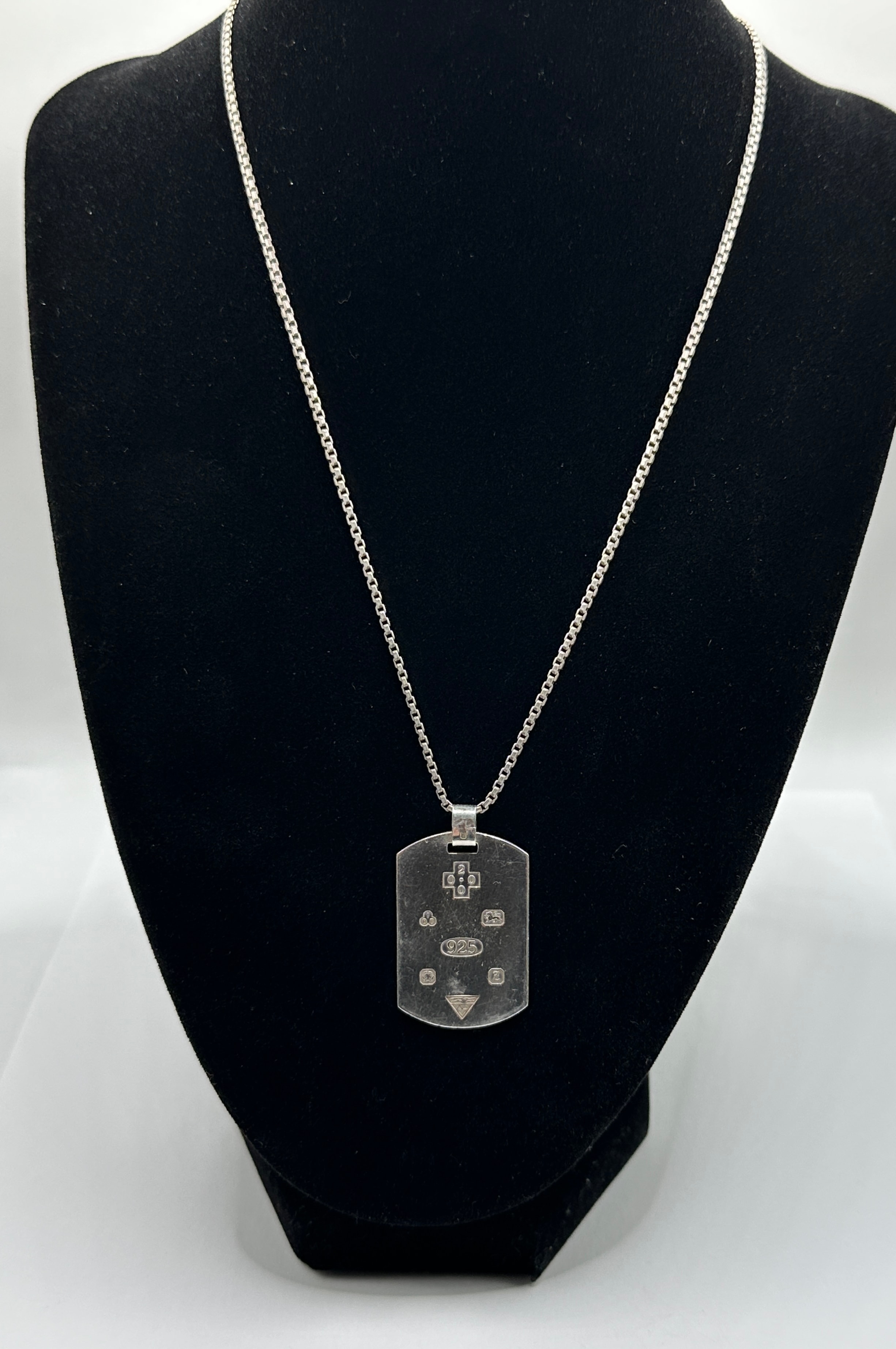 A contemporary necklace featuring a rectangular, dog tag-style pendant with rounded corners, suspended from a box chain. The piece is crafted from sterling silver, as indicated by the impressed hallmarks on the reverse of the pendant. These hallmarks include ‘925’ for sterling silver, a maker’s mark ‘BC’ within a circle, a lion passant, a crown, a date letter ‘Z’ in a shield, a cross-like motif containing ‘200’, and a triangular mark.