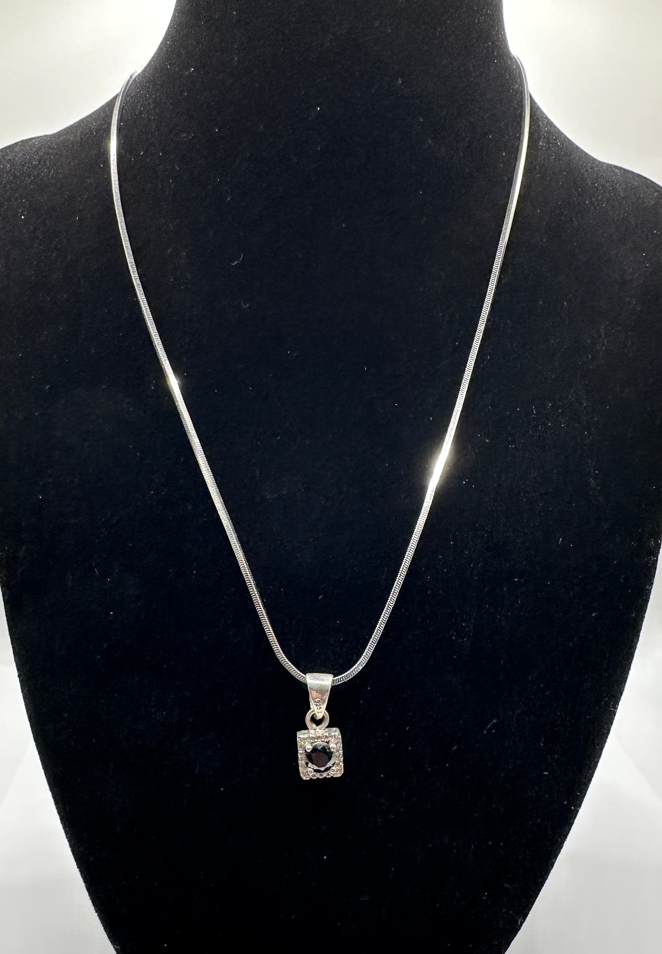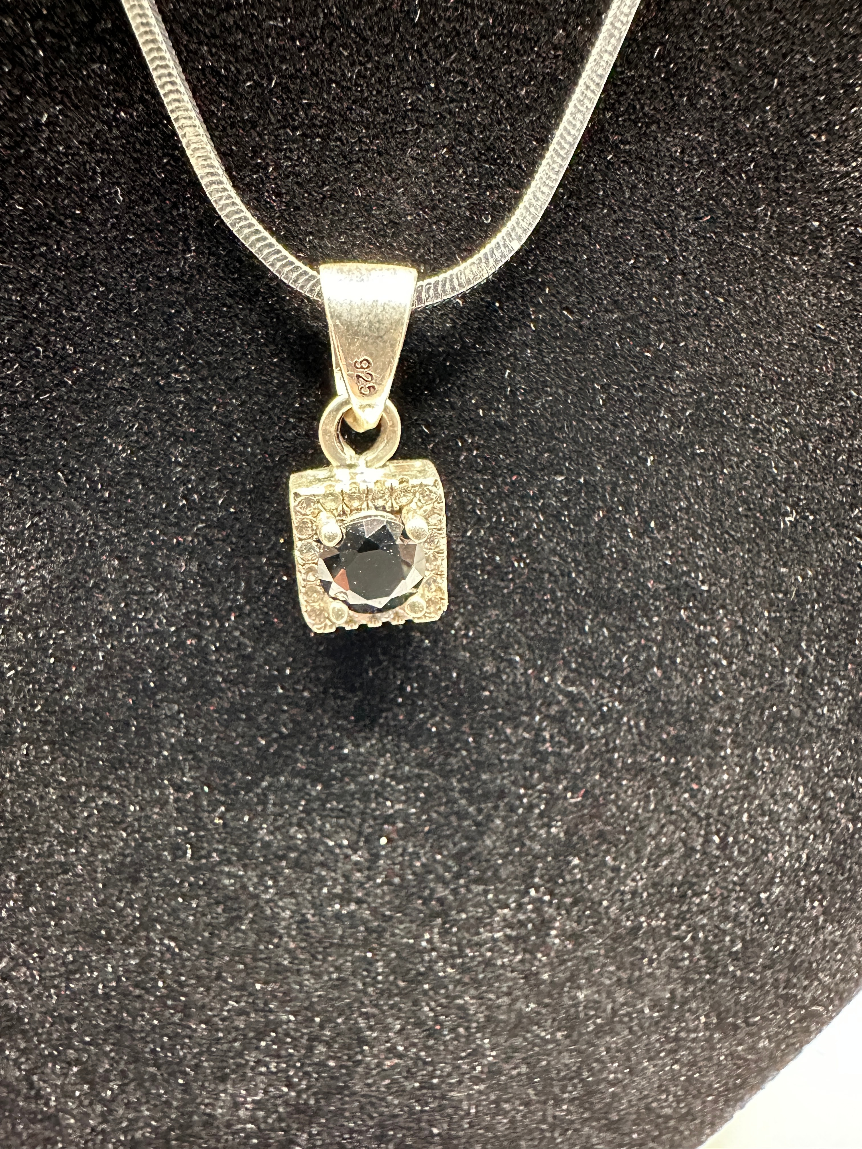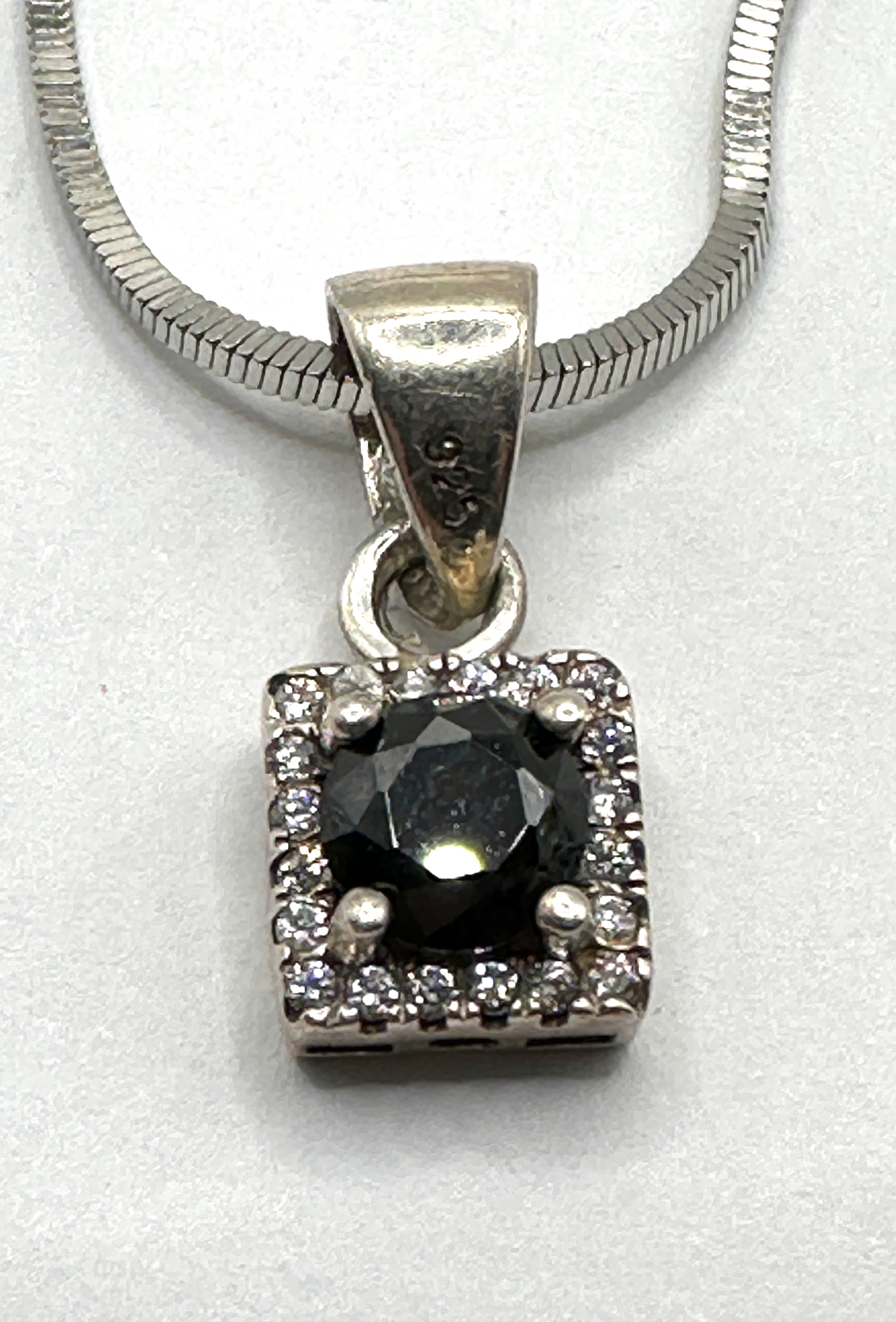 A Silpada sterling silver pendant and necklace. This contemporary jewelry item features a snake chain necklace with a square pendant. The pendant showcases a central round, faceted dark gem, likely a black stone or simulant, framed by a halo of small, clear, round, faceted stones. The pendant’s bail is marked “925.”