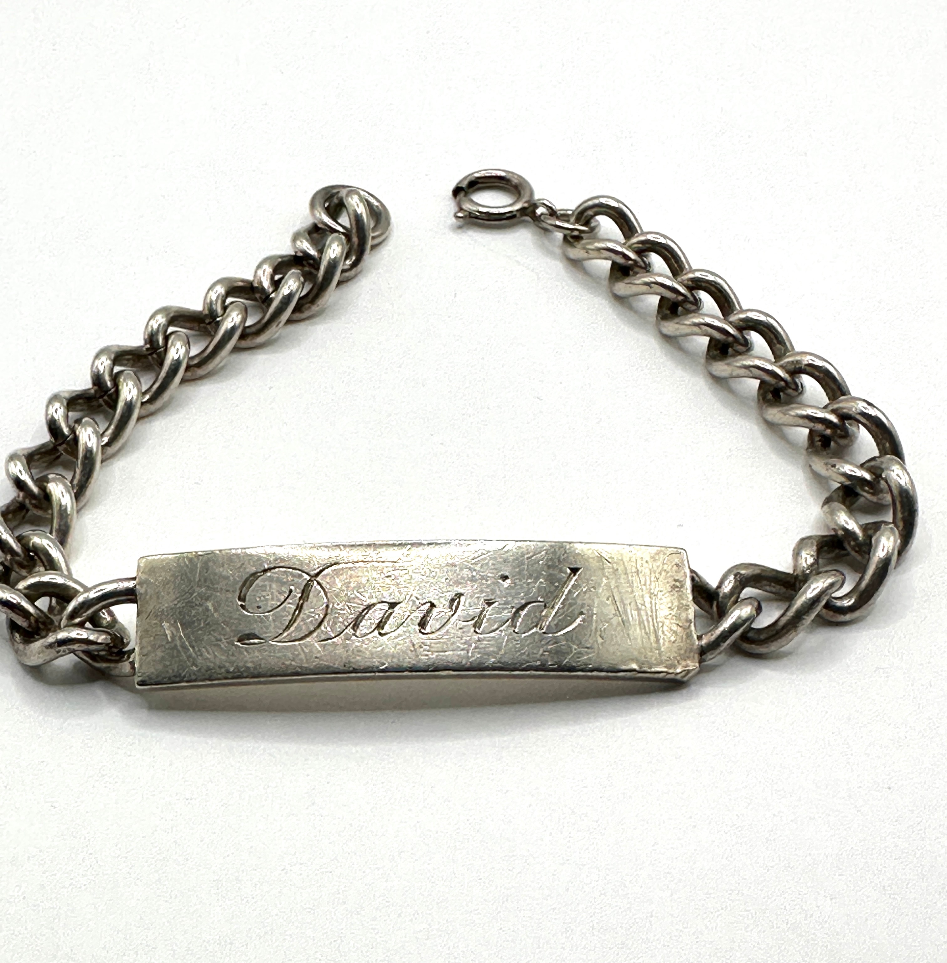 A WWII Era Sterling Silver ID Bracelet, featuring a curb-link chain and a central rectangular bar. The front of the bar is engraved with “David” in a cursive script, and the reverse side features “SMITH” in block capital letters. It is secured by a spring ring clasp.