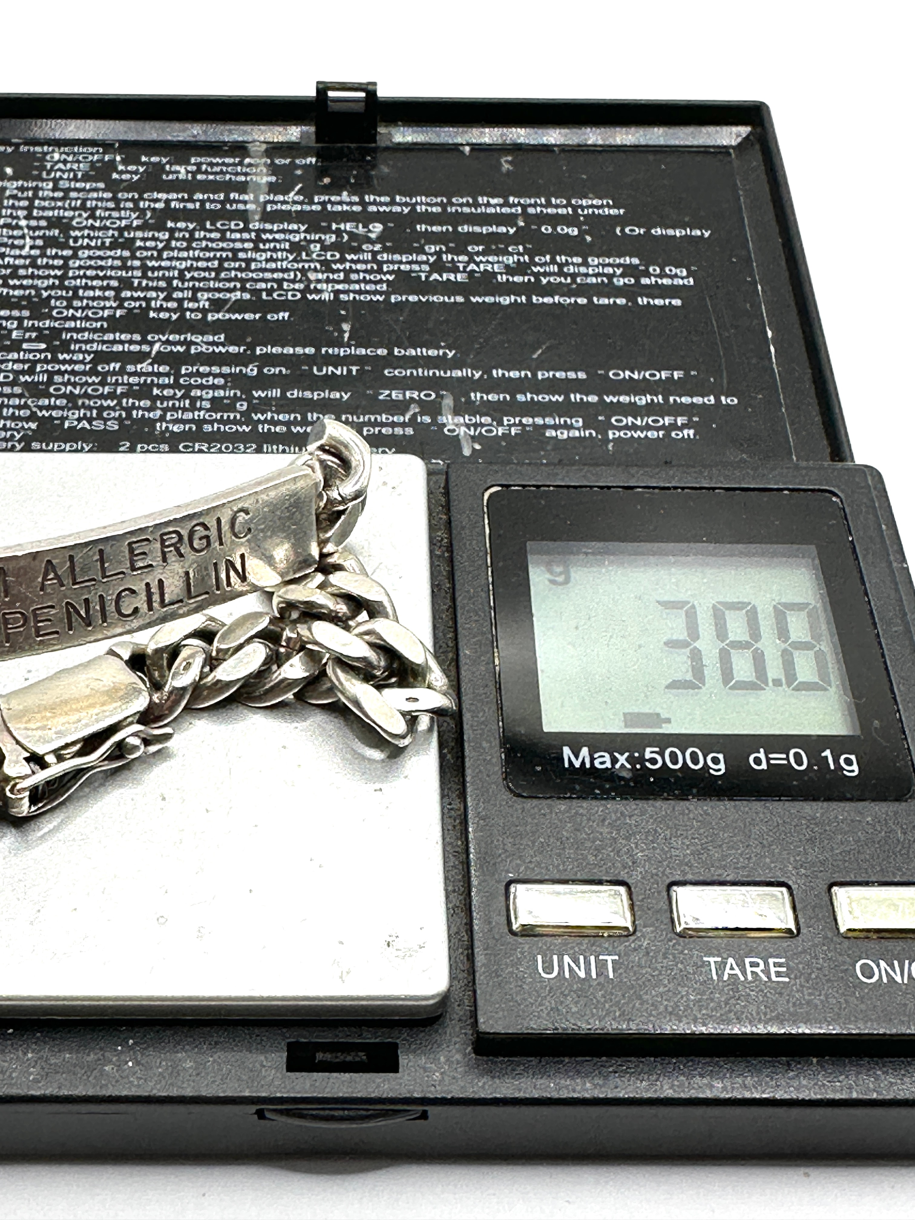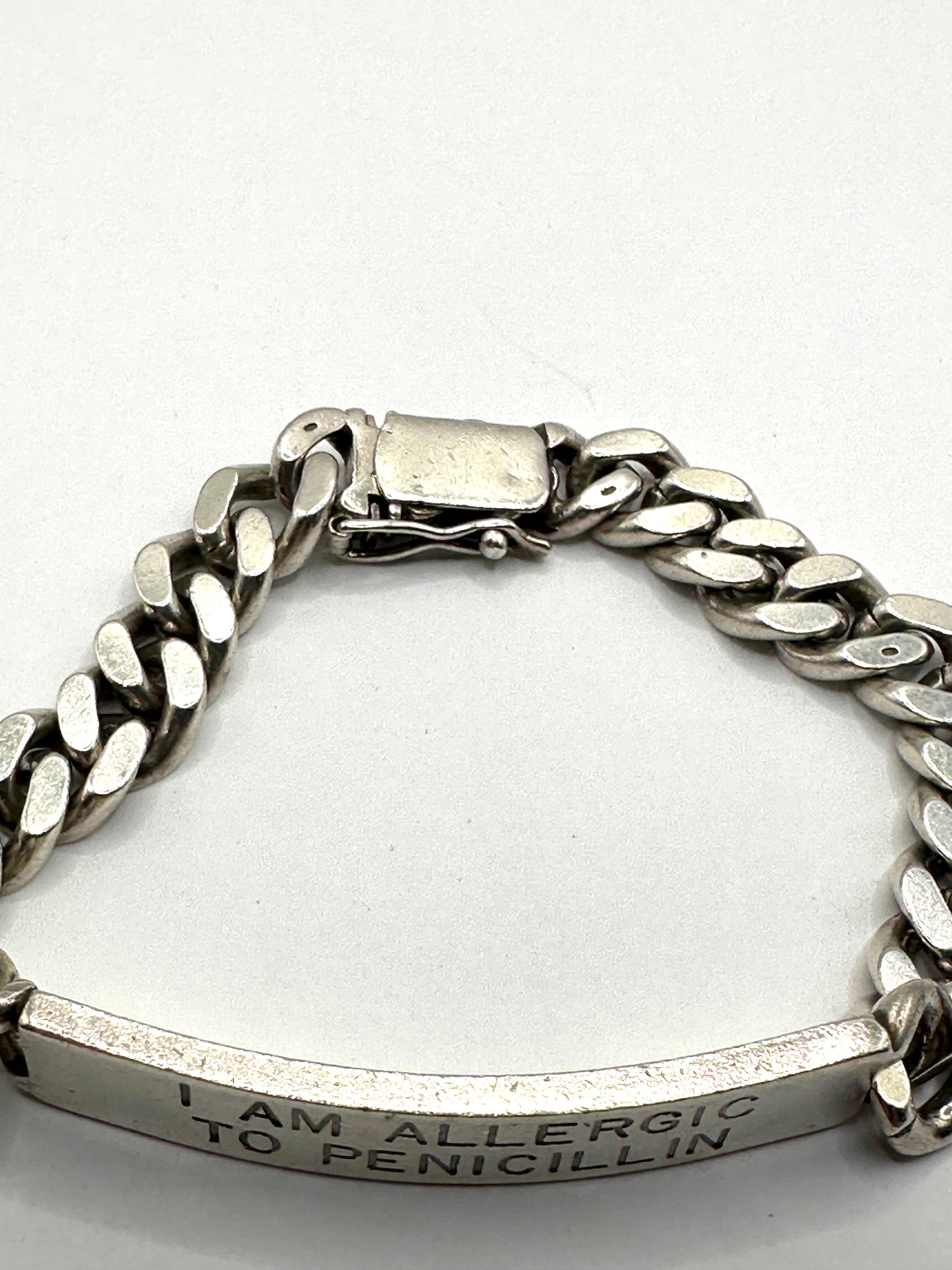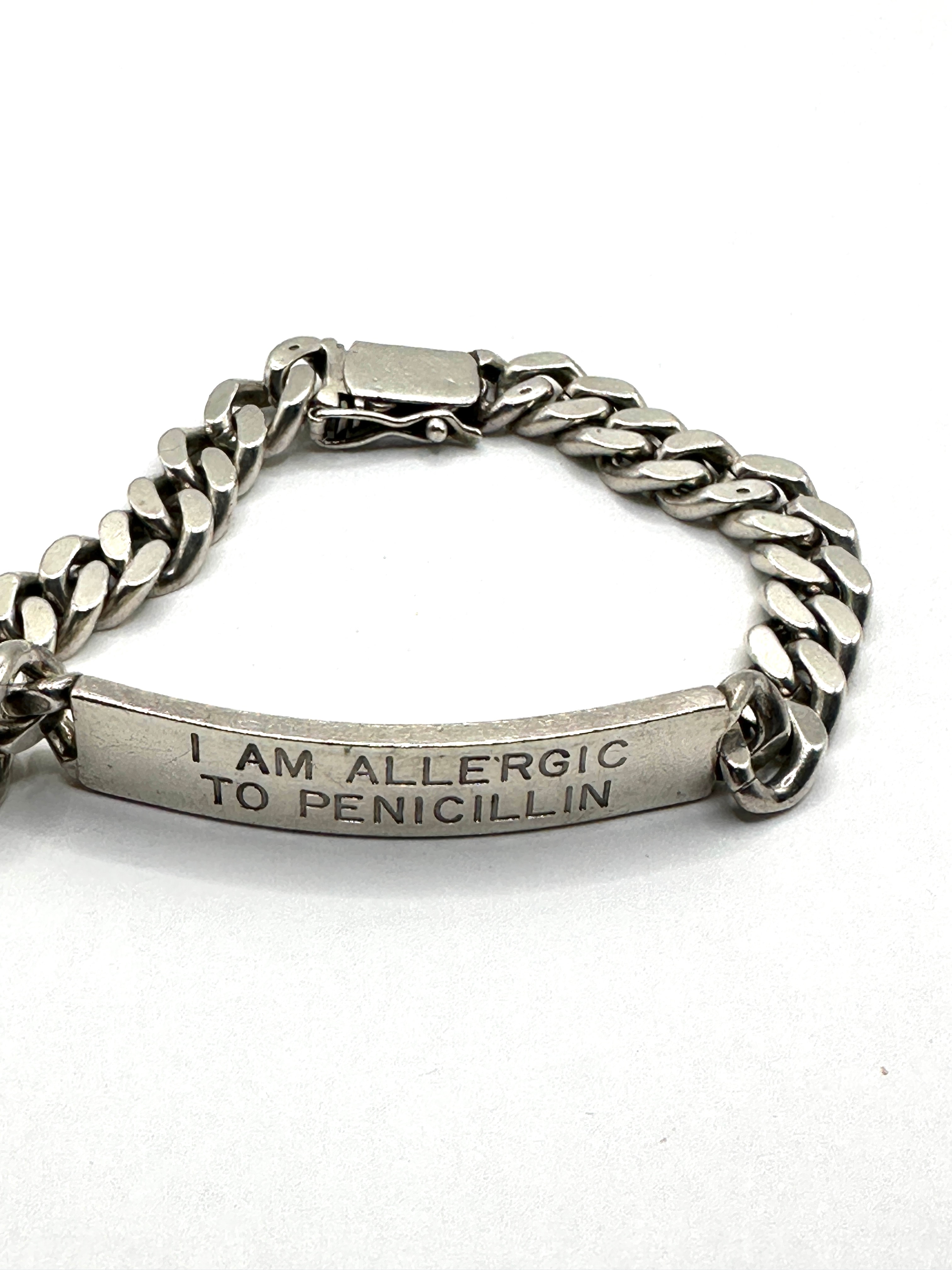 A silver-toned metal medical alert ID bracelet, featuring a curb link chain and a rectangular bar engraved with the English text, ‘I AM ALLERGIC TO PENICILLIN.’ The bracelet fastens with a box clasp.