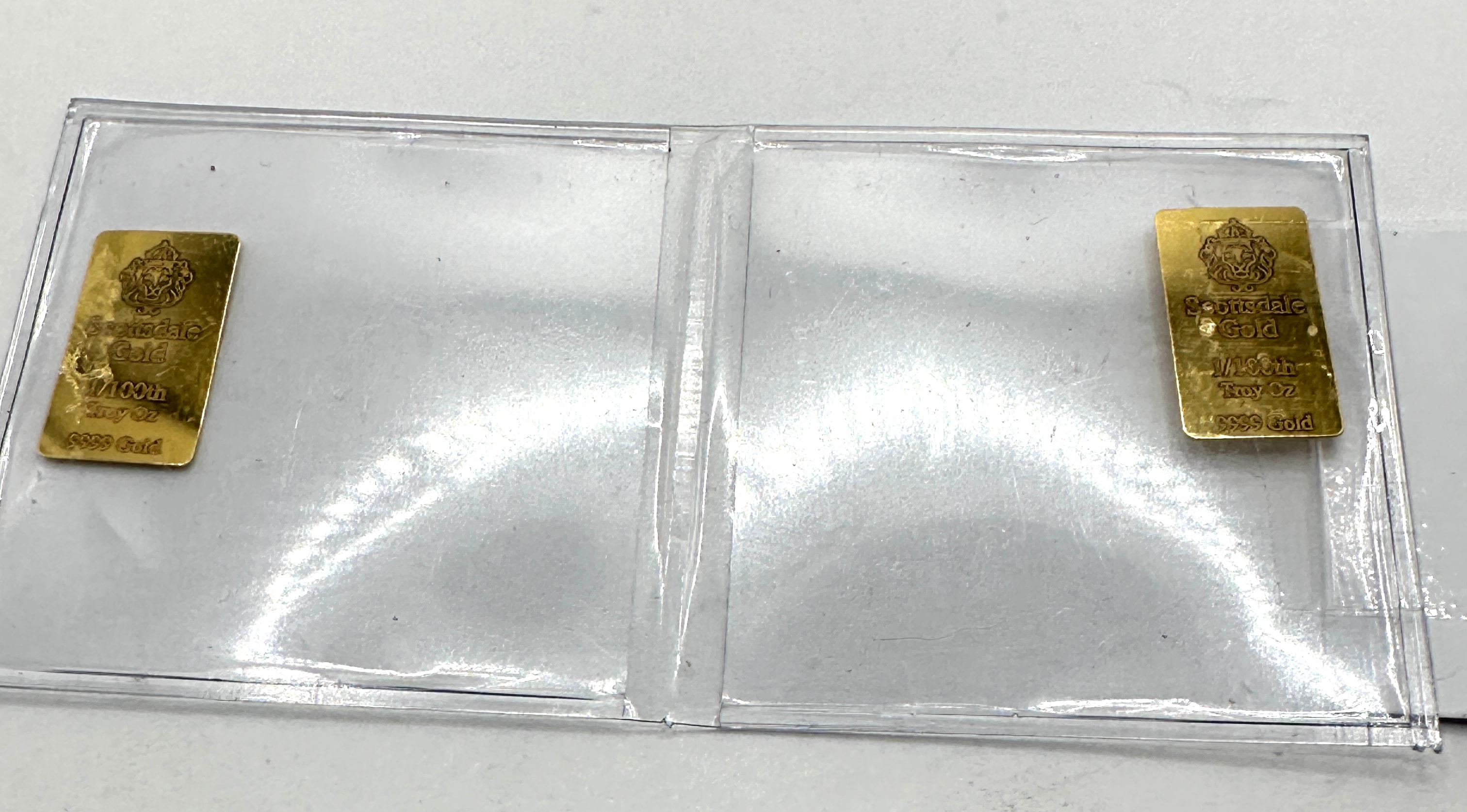 A pair of Scottsdale Mint 1/100 Troy Oz .9999 Fine Gold Bullion Bars. Each rectangular bar features a stylized lion’s head emblem above the text “Scottsdale Gold”, followed by “1/100th Troy Oz” and “.9999 Gold”. The items are presented within a clear, bi-fold plastic protective holder and are consistent with modern bullion precious metal products.
