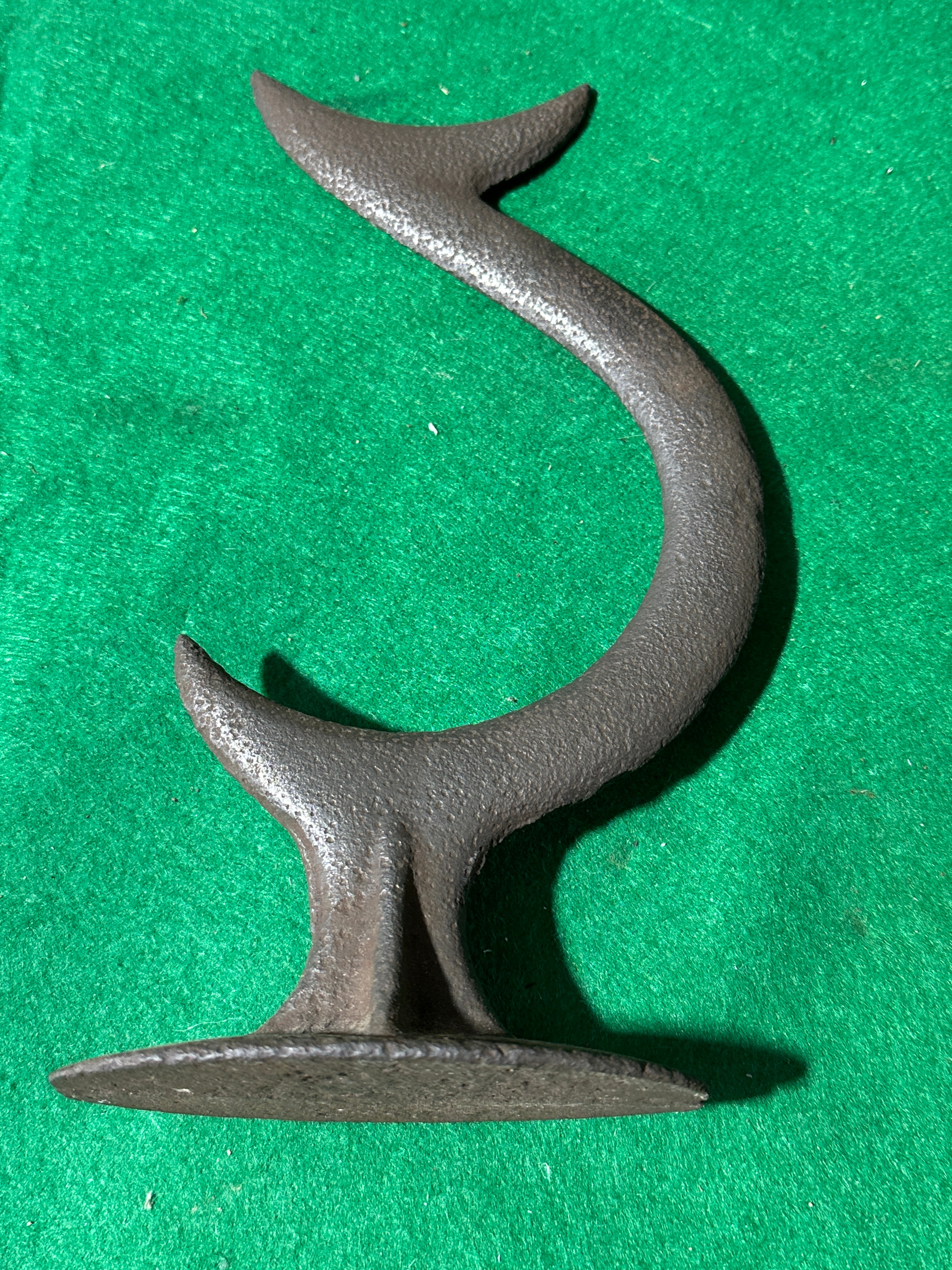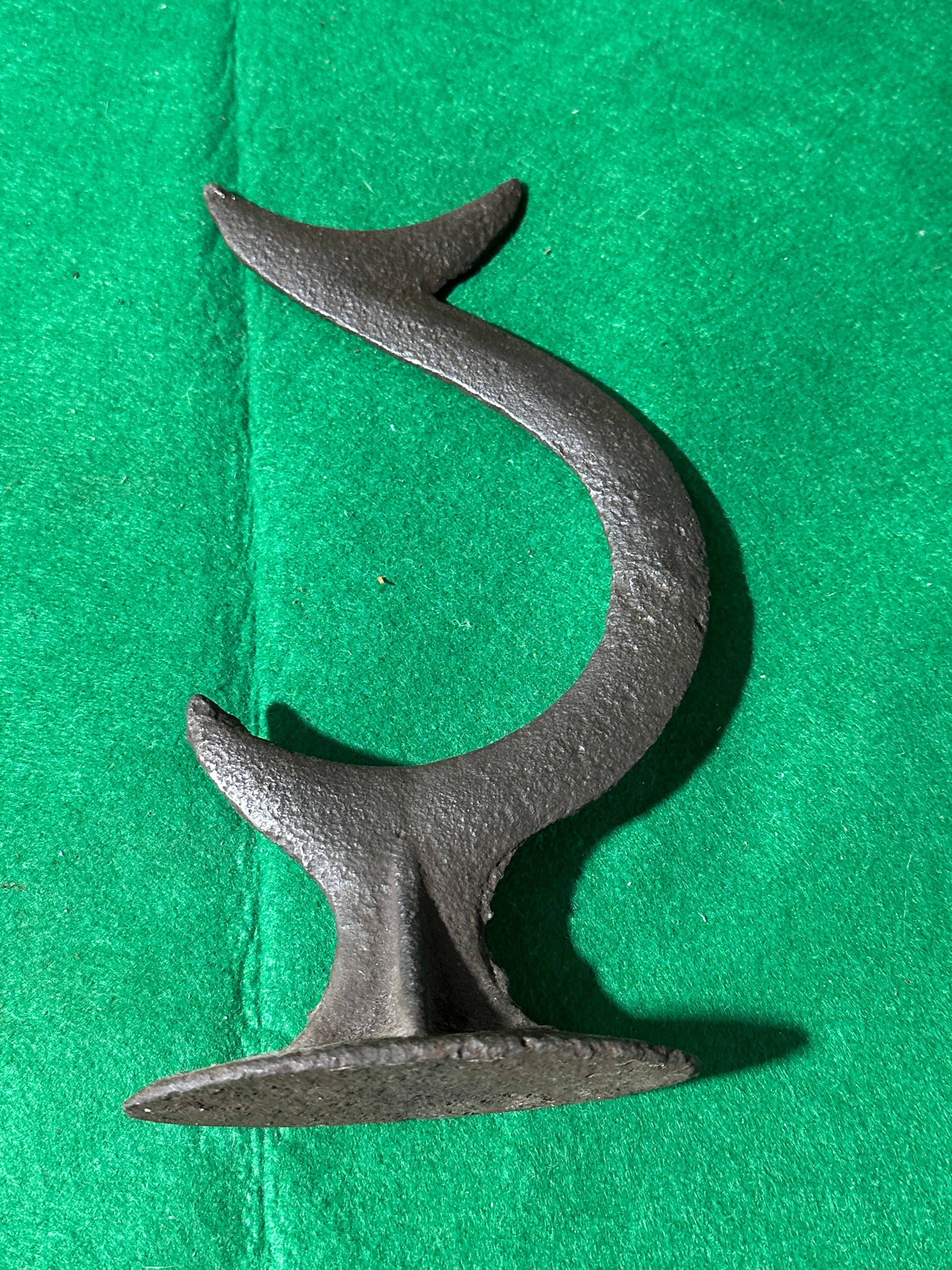 A pair of matching, S-curved objects crafted from cast iron. Each piece features a pronounced, undulating S-shape, tapering to two upward-curving points, supported by a distinct central stem that flares out to an oval-shaped base. The material exhibits a dark, heavily textured, and pitted surface characteristic of aged cast iron, suggesting a vintage or antique period and lending a rustic style. No visible manufacturer’s marks, inscriptions, or identifying text.