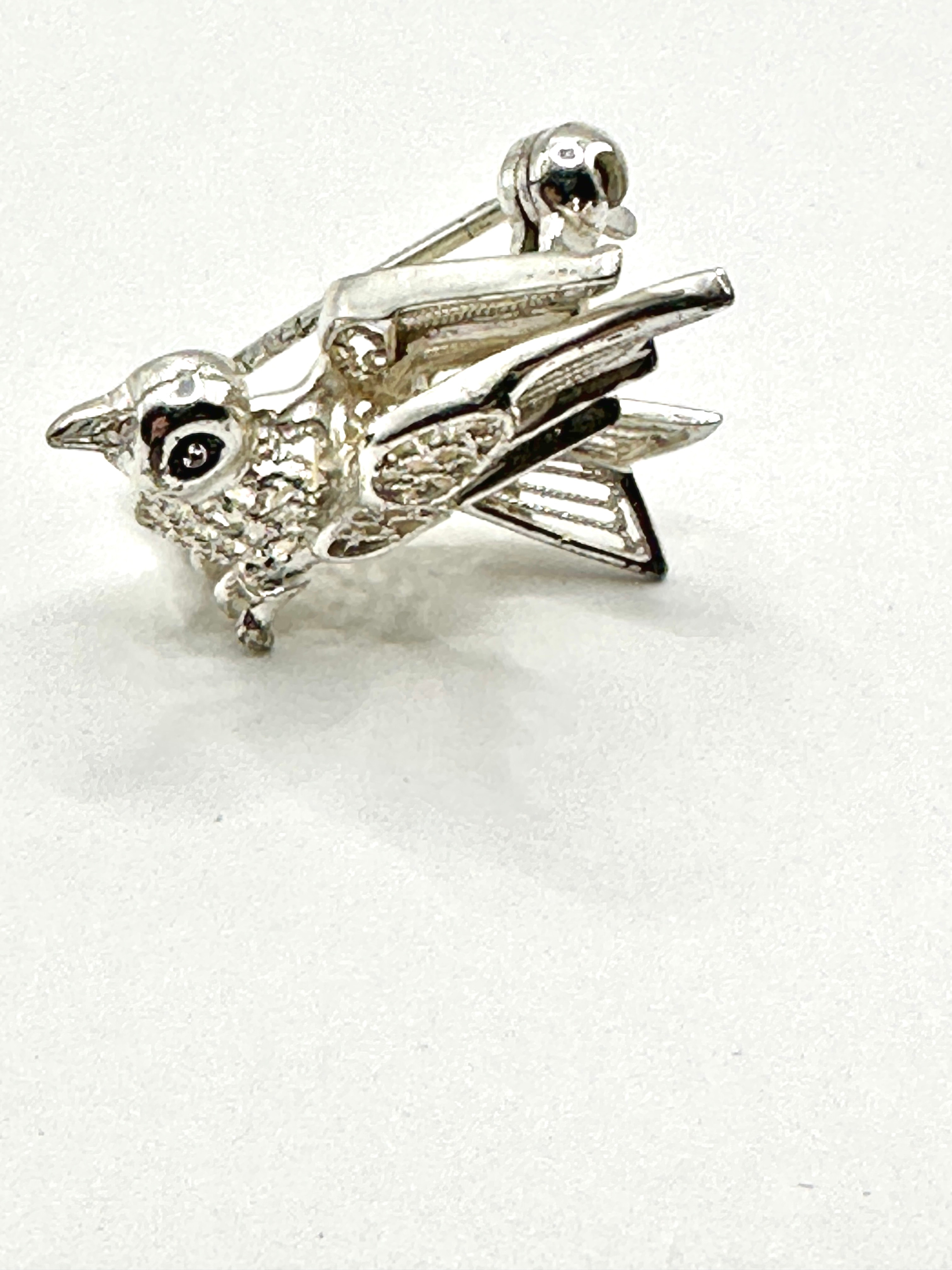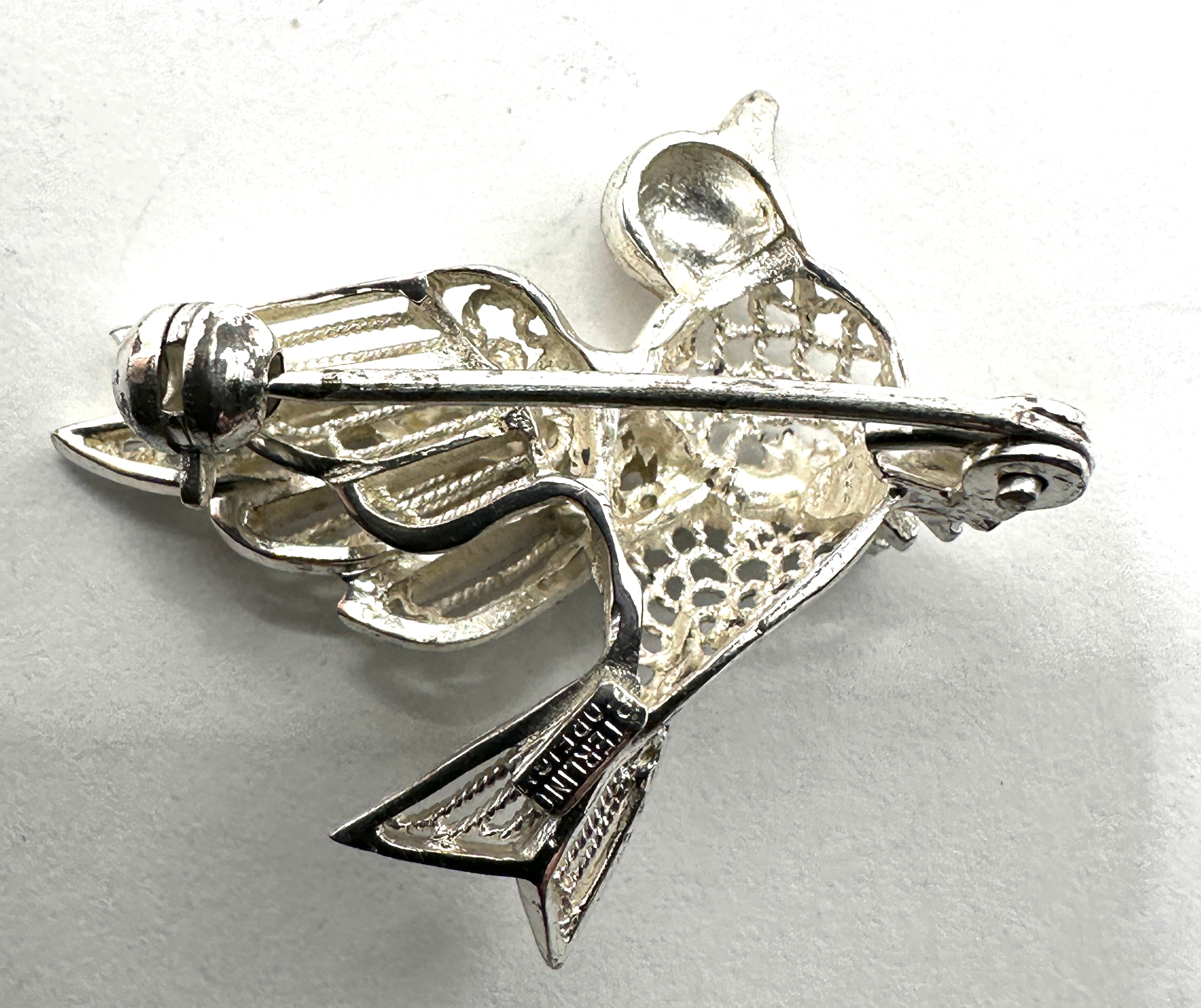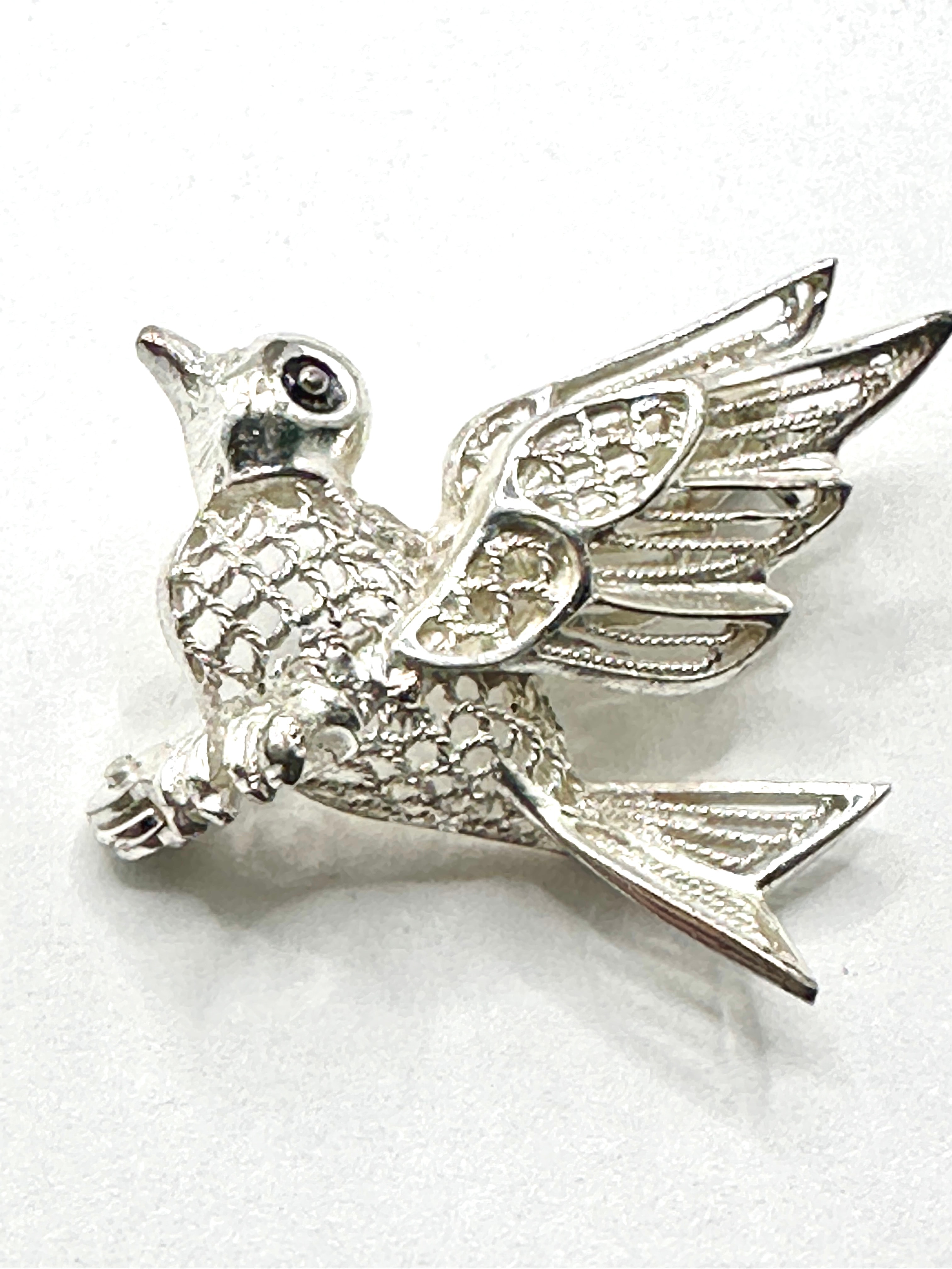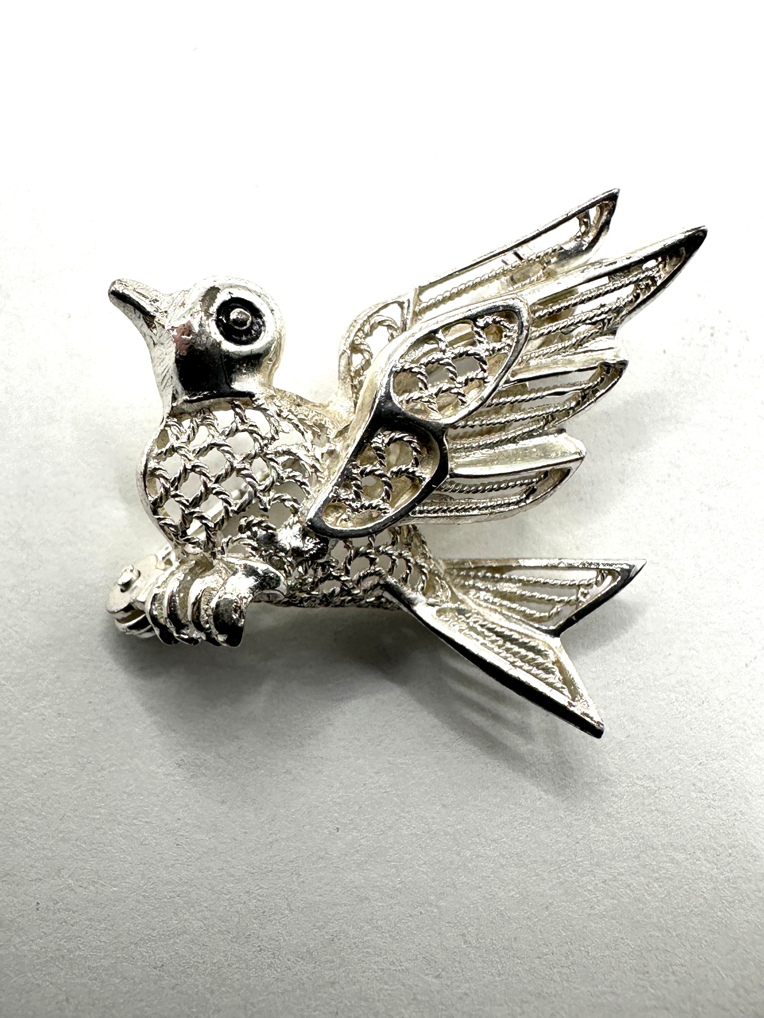 This sterling silver figural brooch is crafted in the likeness of a bird in profile with outstretched wings, exhibiting a dove-like form. The bird’s body features a textured, possibly reticulated or scale-like pattern, while its wings incorporate delicate openwork and filigree details. A dark, possibly enameled, eye is visible. The reverse side is fitted with a functional pin clasp and is clearly stamped with the word “STERLING” near the tail, confirming its material as sterling silver.