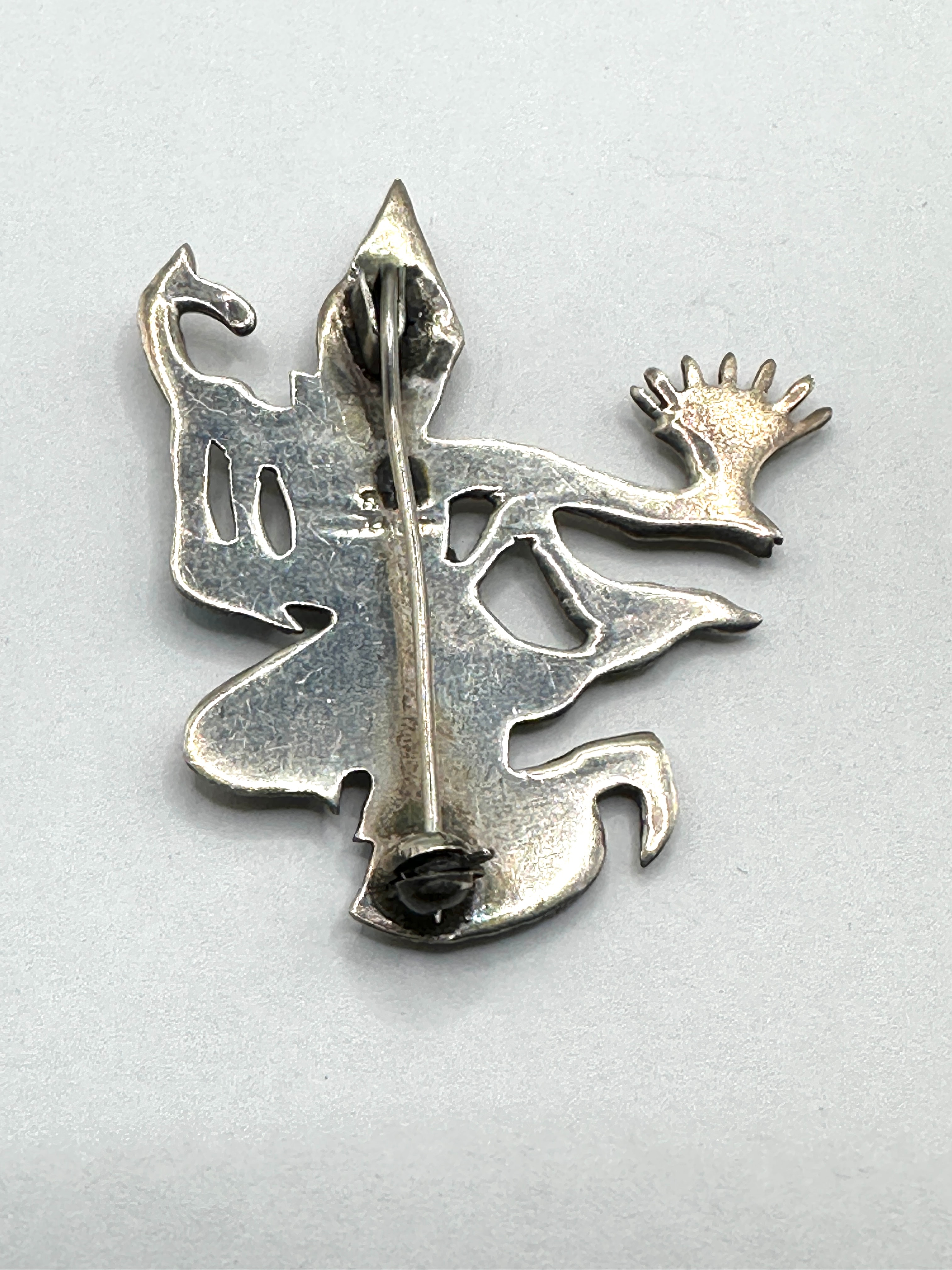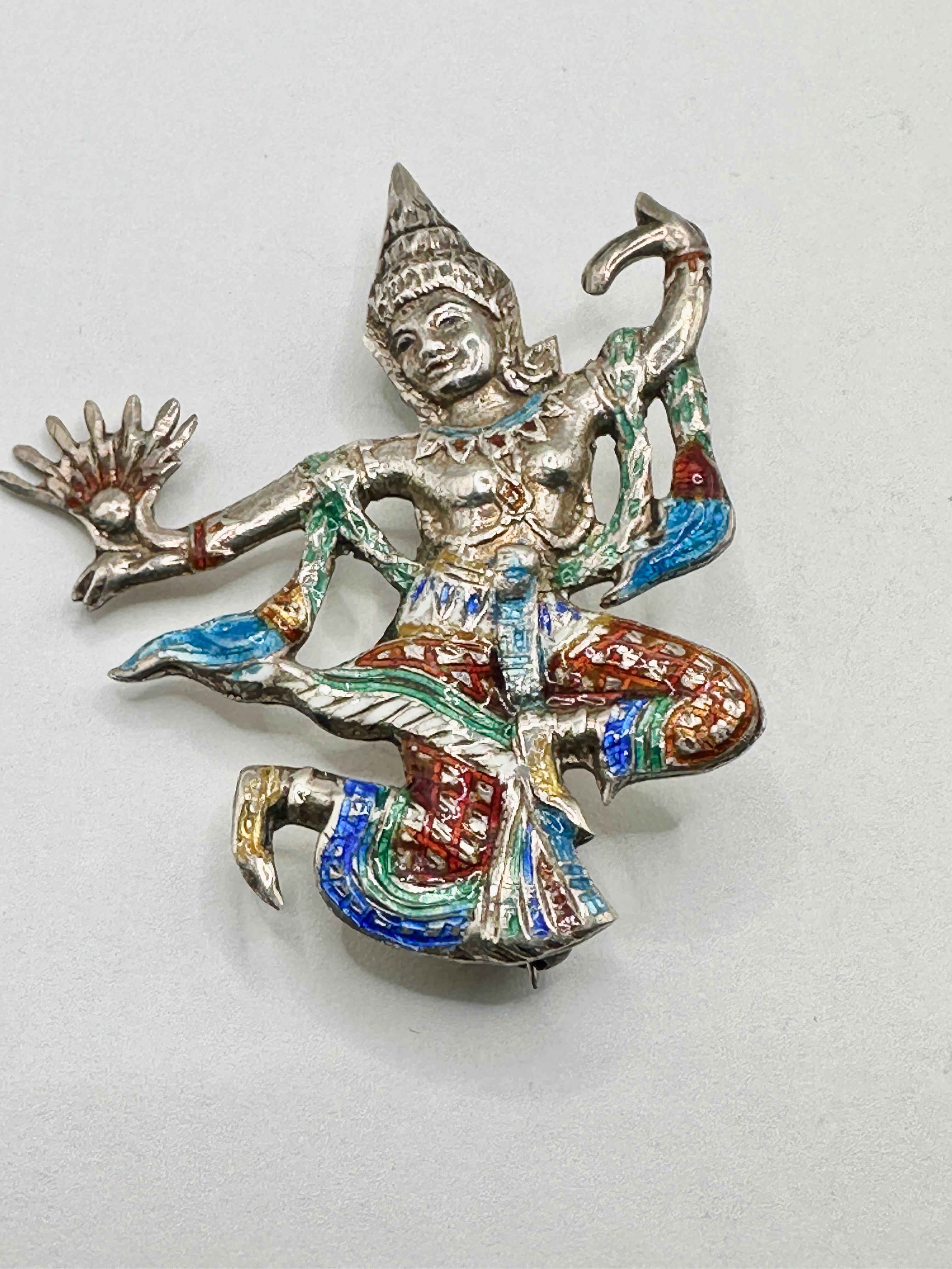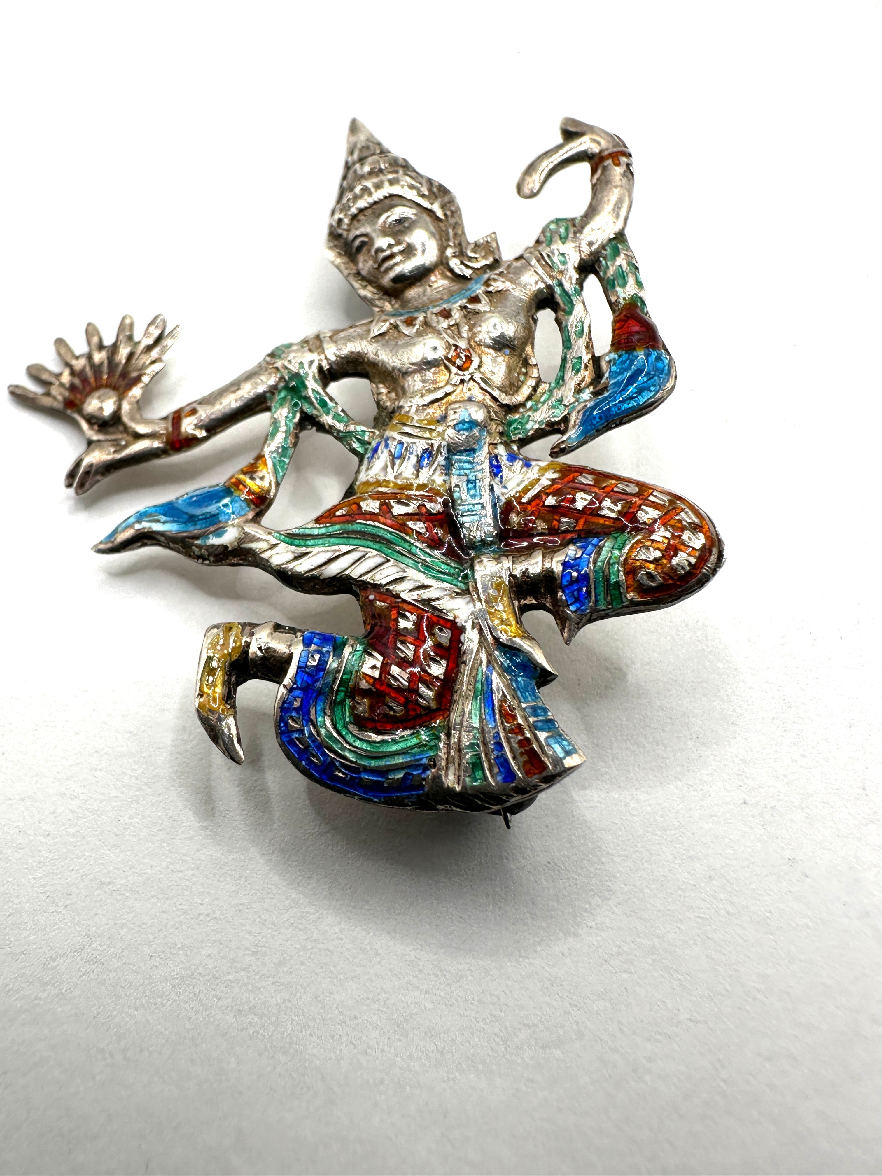 A Vintage Siam Sterling Silver Enamel Niello Hindu Goddess Pin Brooch. The silver-toned metal brooch depicts a stylized, ornate figure in a dynamic dance pose, characteristic of a classical Southeast Asian dancer or deity. The figure features an elaborate pointed headdress and holds a radiating object, possibly a fan or sunburst. It is richly decorated with detailed multi-colored enamel in shades of red, blue, green, and yellow, highlighting garments and accessories, consistent with niello and enamel work from Thailand (Siam). The reverse reveals a simple pin and clasp mechanism. While commonly attributed as Sterling Silver, no visible text, hallmarks, or maker’s marks are present on this specific example.