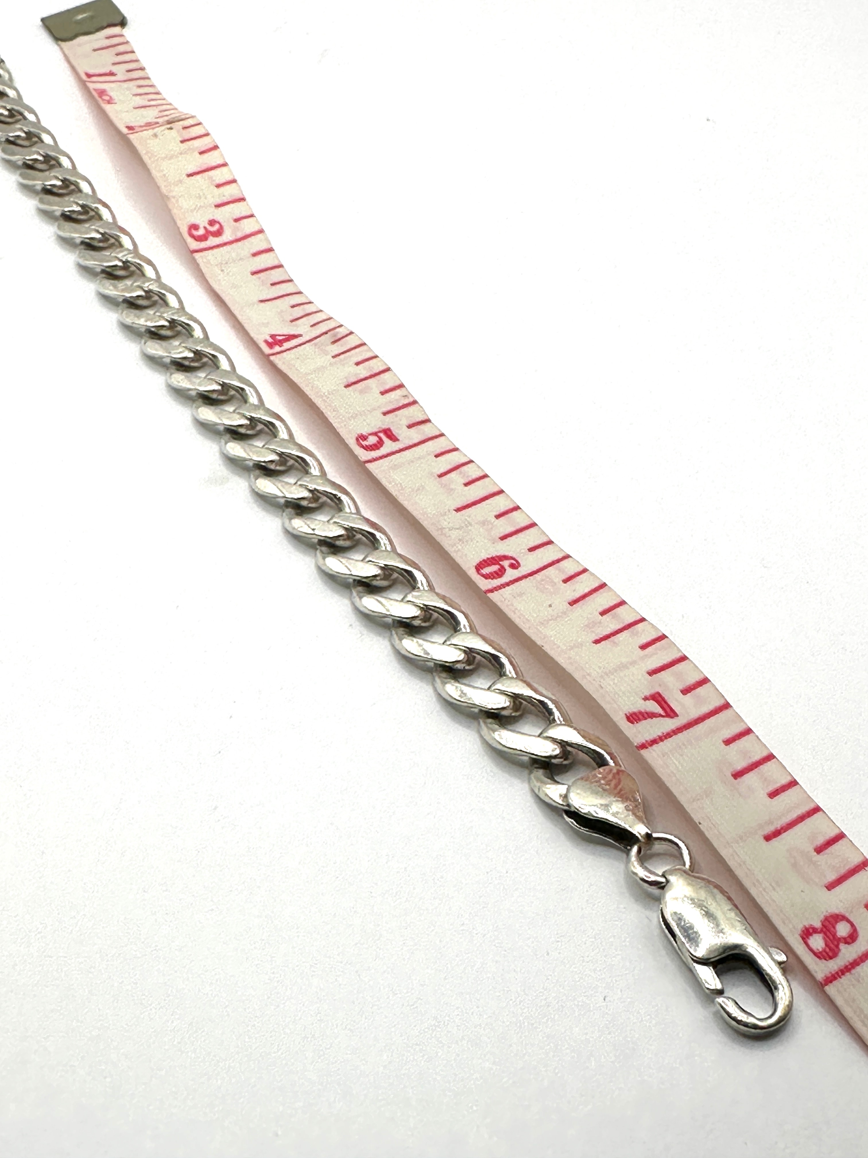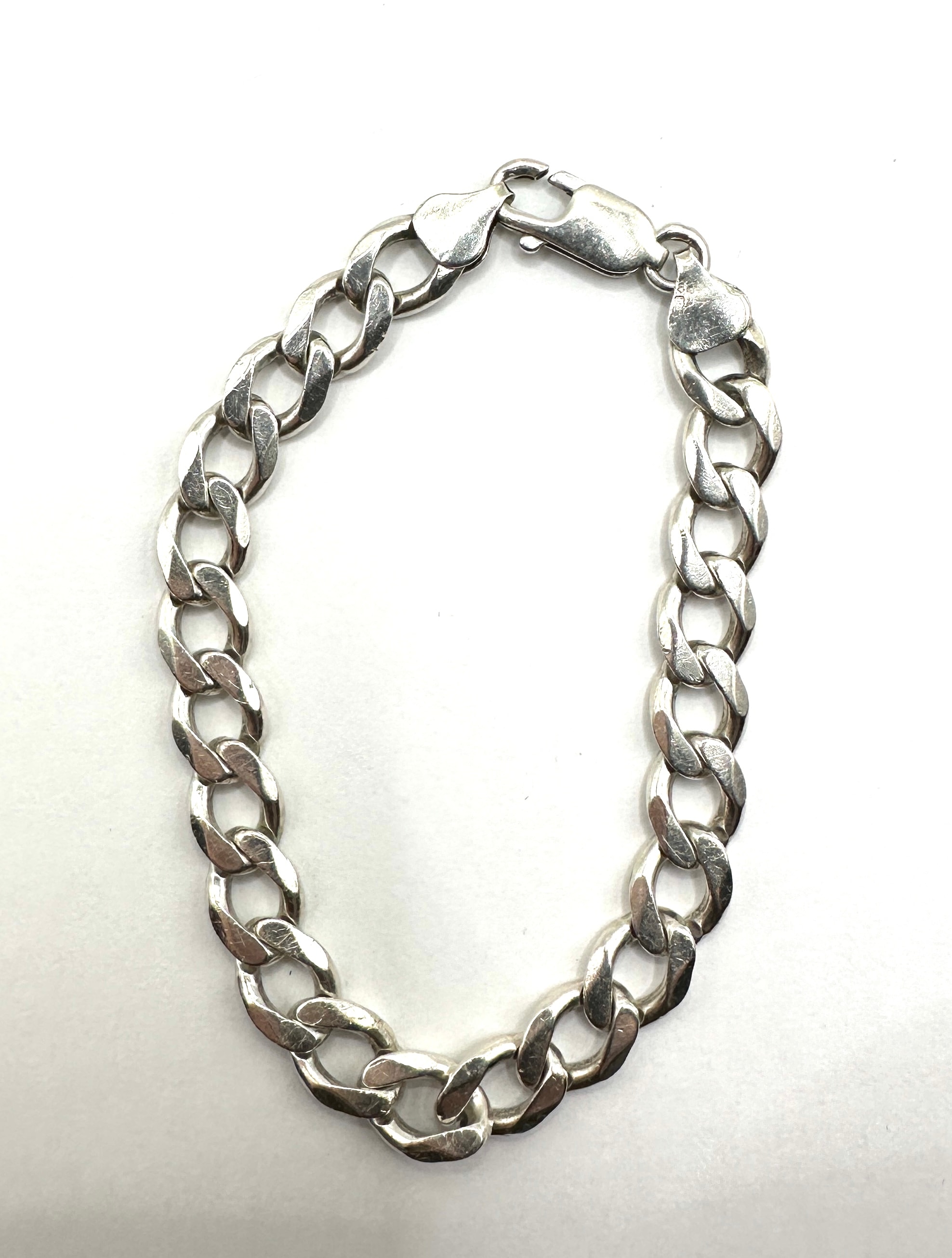 A Sterling Silver 925 Cuban Link Chain Bracelet. This curb link bracelet is constructed from Sterling Silver, as indicated by a “925” stamp and a French ‘tête d’aigle’ (eagle’s head) hallmark visible on the lobster claw clasp. A further lozenge-shaped maker’s mark is also present.