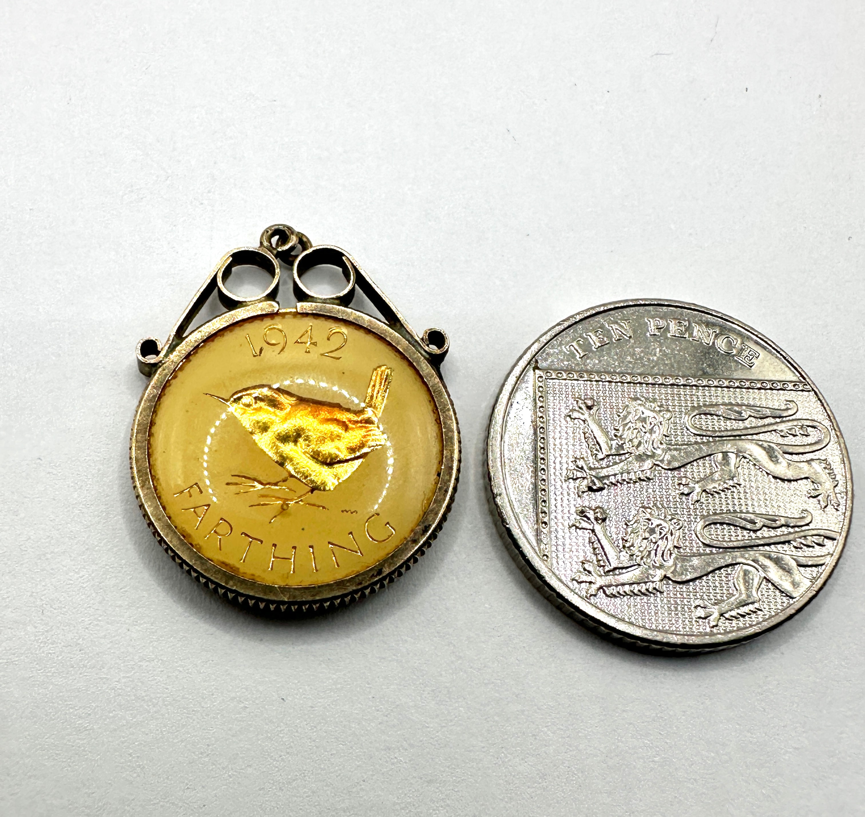 A vintage enamelled 1942 British Farthing coin pendant. The pendant features a mid-20th-century British farthing coin, mounted in a reeded, silver-toned metal mount with a dual-loop bail at the top. One side displays a gold-toned wren and the text ‘1942 FARTHING’ against a cream-yellow enameled or resin background. The reverse side presents a gold-toned profile portrait of King George VI, encircled by the Latin inscription ‘GEORGIVS VI D: G: BR: OMN: REX F: D: IND: IMP’ (George VI, by the Grace of God, King of all Britons, Defender of the Faith, Emperor of India), set against a black enameled or resin background. An accompanying modern British ‘TEN PENCE’ coin, depicting three lions passant guardant, is shown for scale.