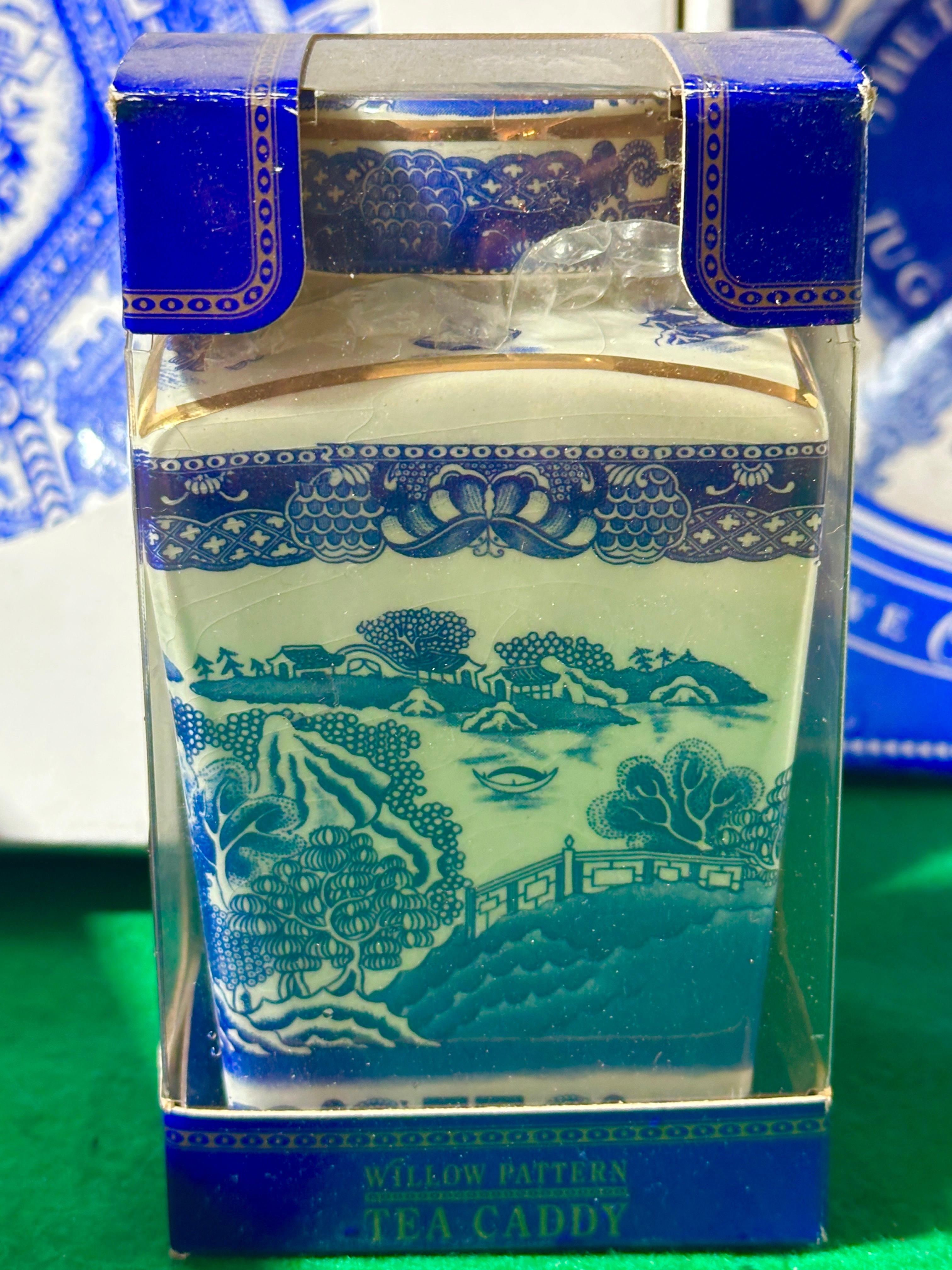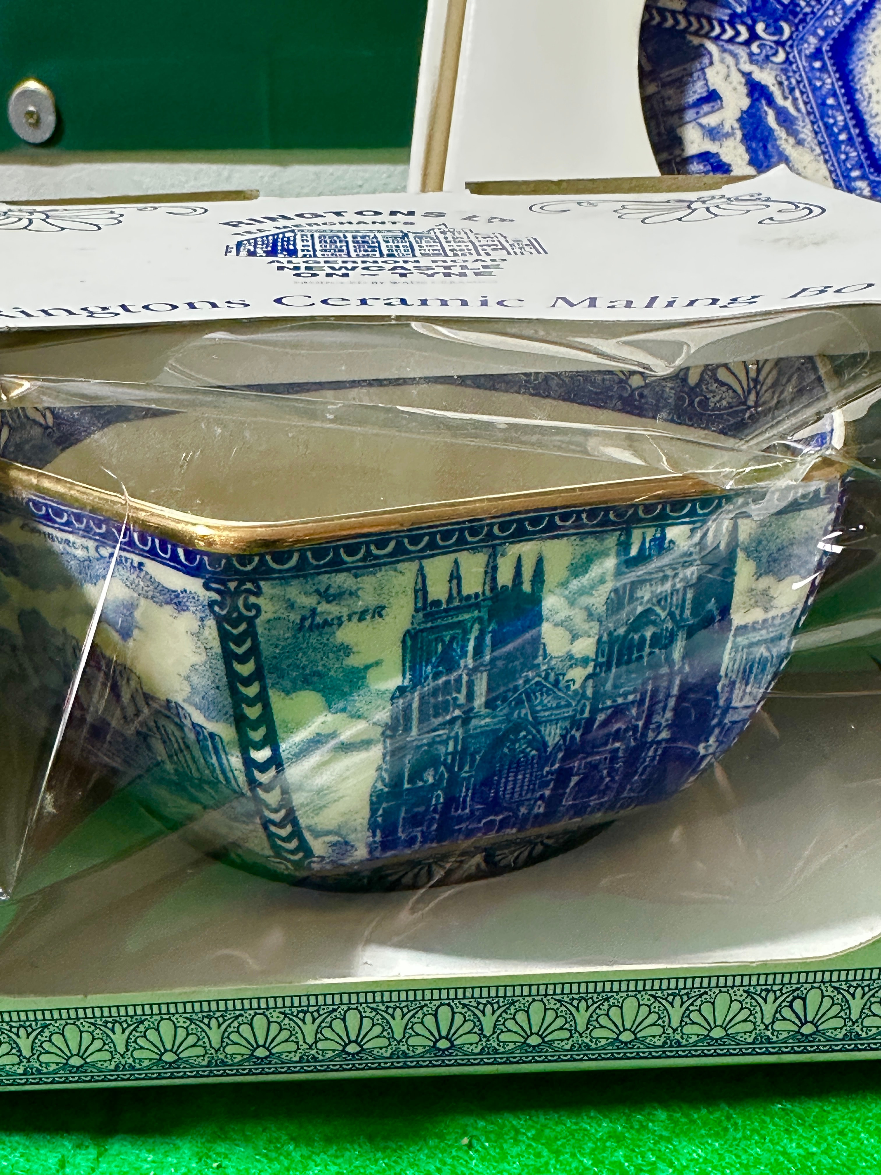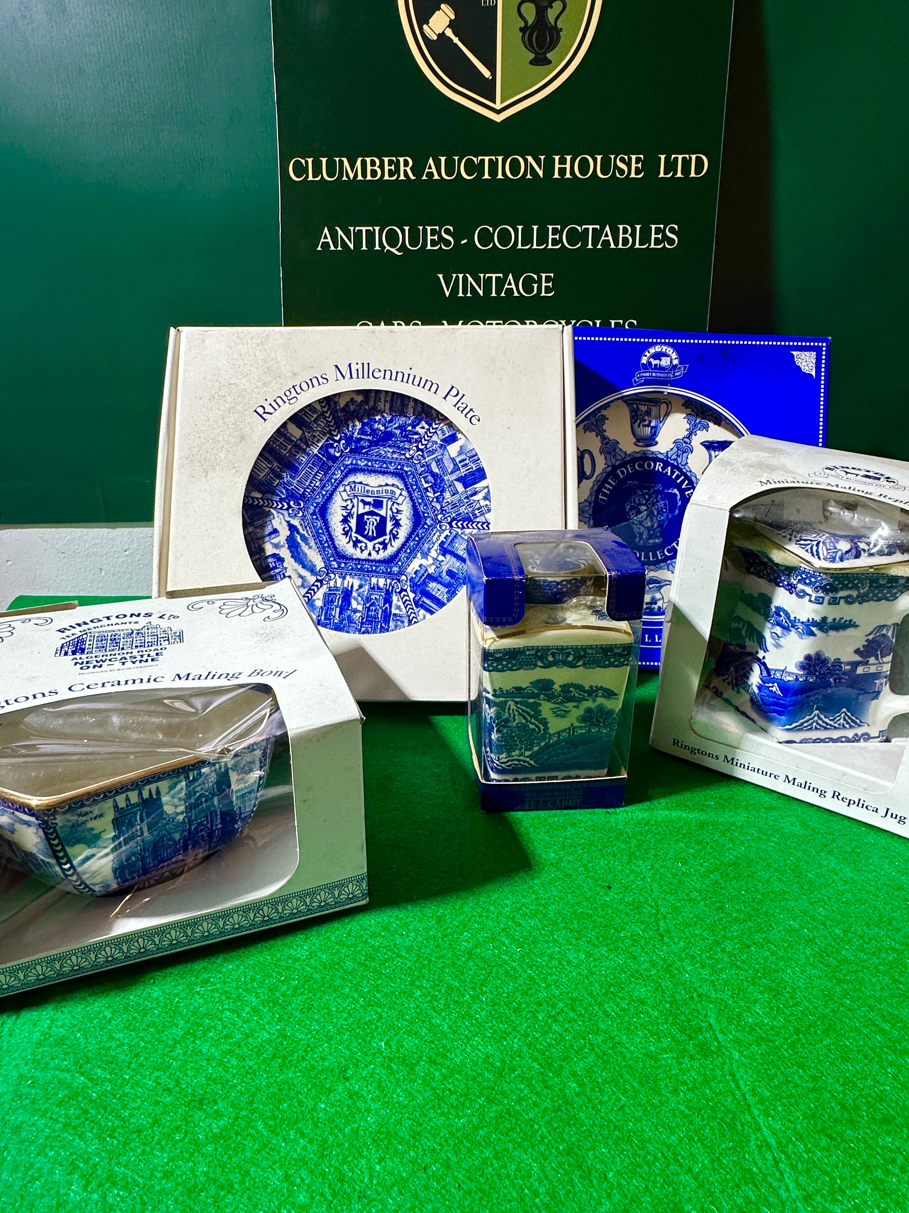 A collection of modern Ringtons ceramic collectibles, featuring Maling-style and Willow Pattern designs. The lot comprises new, cased blue and white ceramic items predominantly from ‘Ringtons, A Family Business Est. 1907’. Specific items include a ‘Ringtons Millennium Plate,’ a ‘Ringtons Ceramic Maling Bowl,’ a ‘Ringtons Miniature Maling Replica Jug,’ and a ‘Willow Pattern Tea Caddy.’ All pieces are presented in their original cardboard boxes, some sealed in clear plastic. The ceramics feature diverse blue and white transferware designs, including architectural scenes (one depicting a ‘Minster’) and classic landscape motifs such as the ‘Willow Pattern,’ often accented with gold trim. The ‘Millennium’ plate and associated collectors’ items suggest a production period around the year 2000.