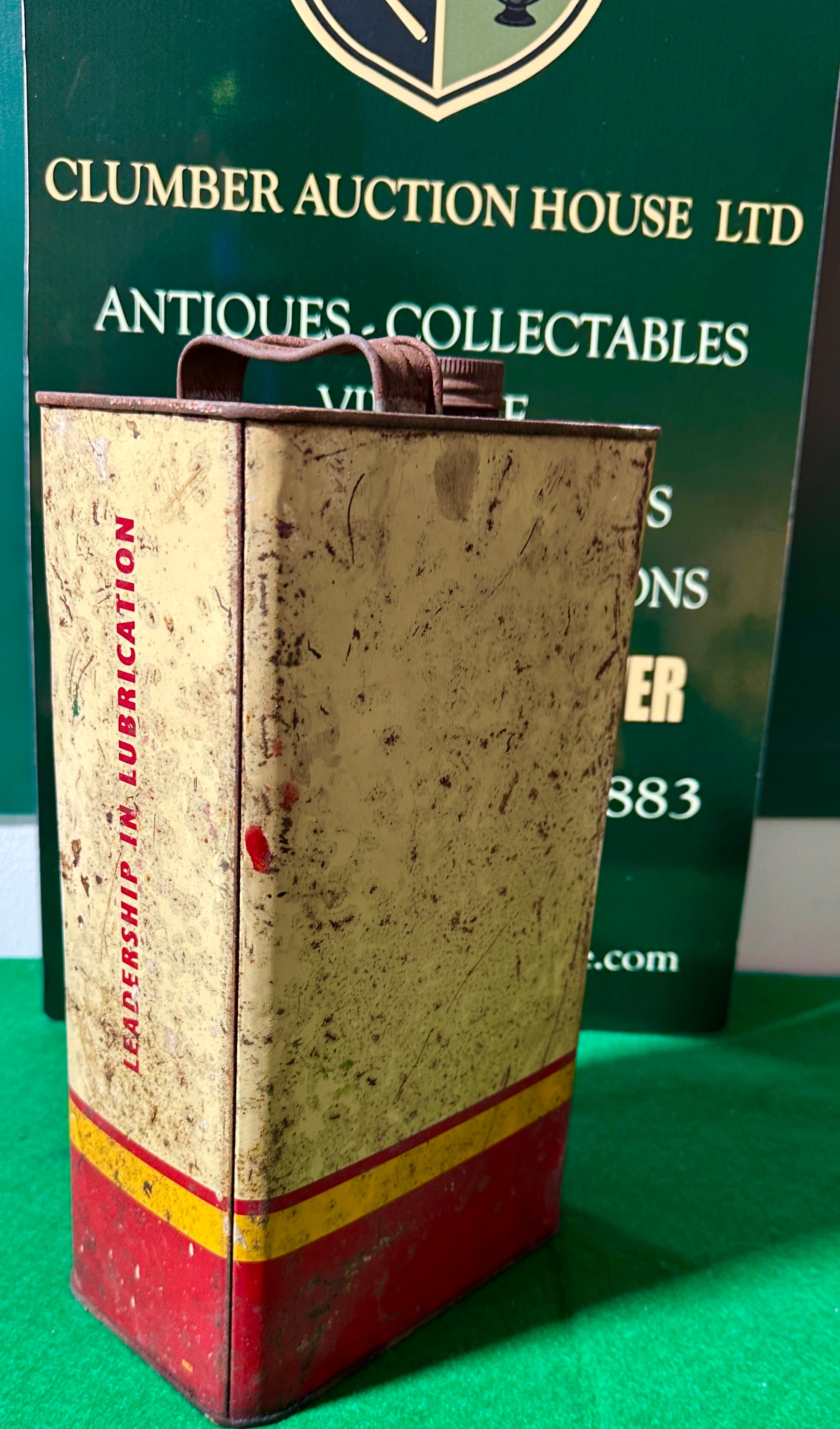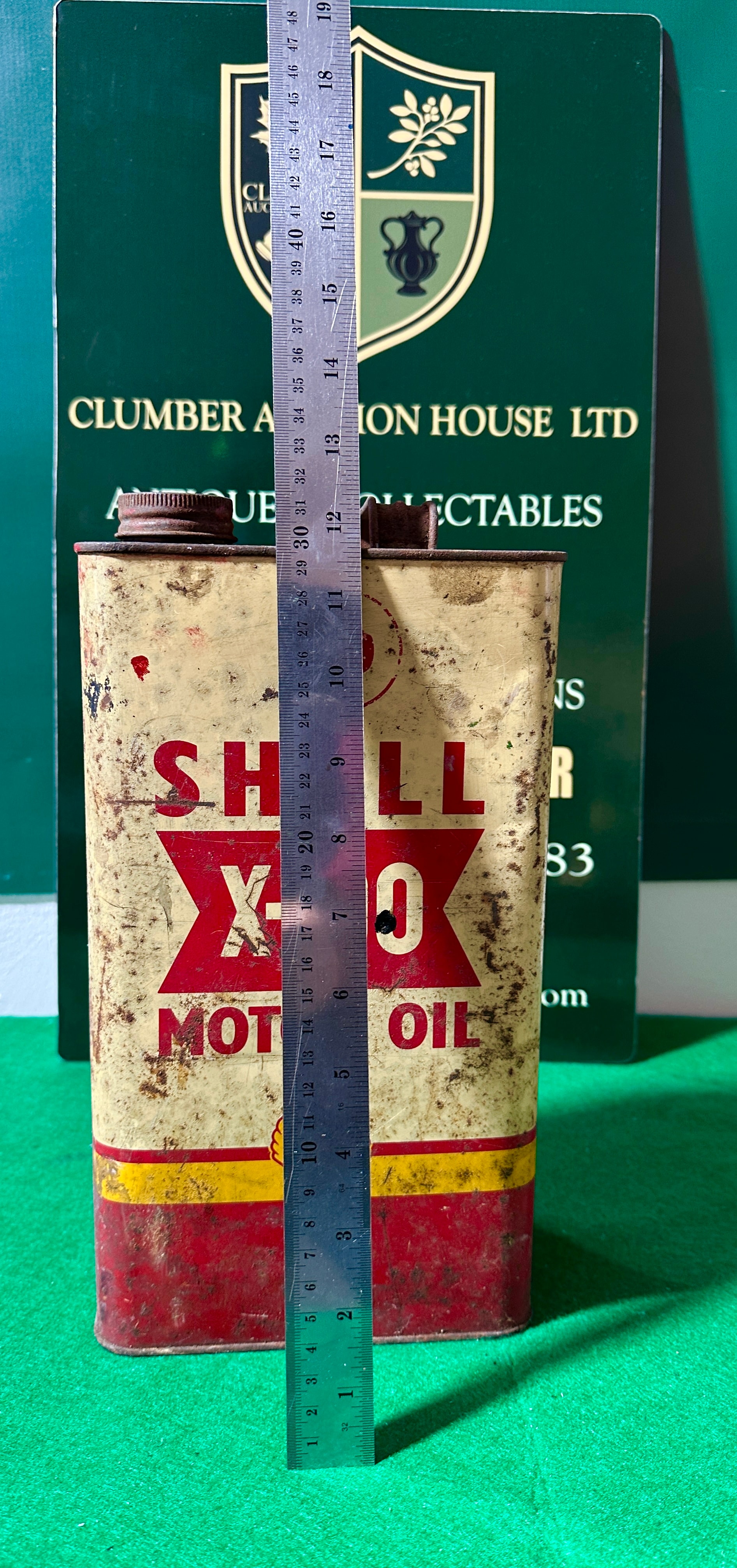 A Vintage Shell X-100 Motor Oil Can, constructed from tin or steel, indicative of a mid-20th-century style. The front prominently features “30”, “SHELL X-100 MOTOR OIL”, and the classic Shell logo, while one side displays the vertical text “LEADERSHIP IN LUBRICATION”.