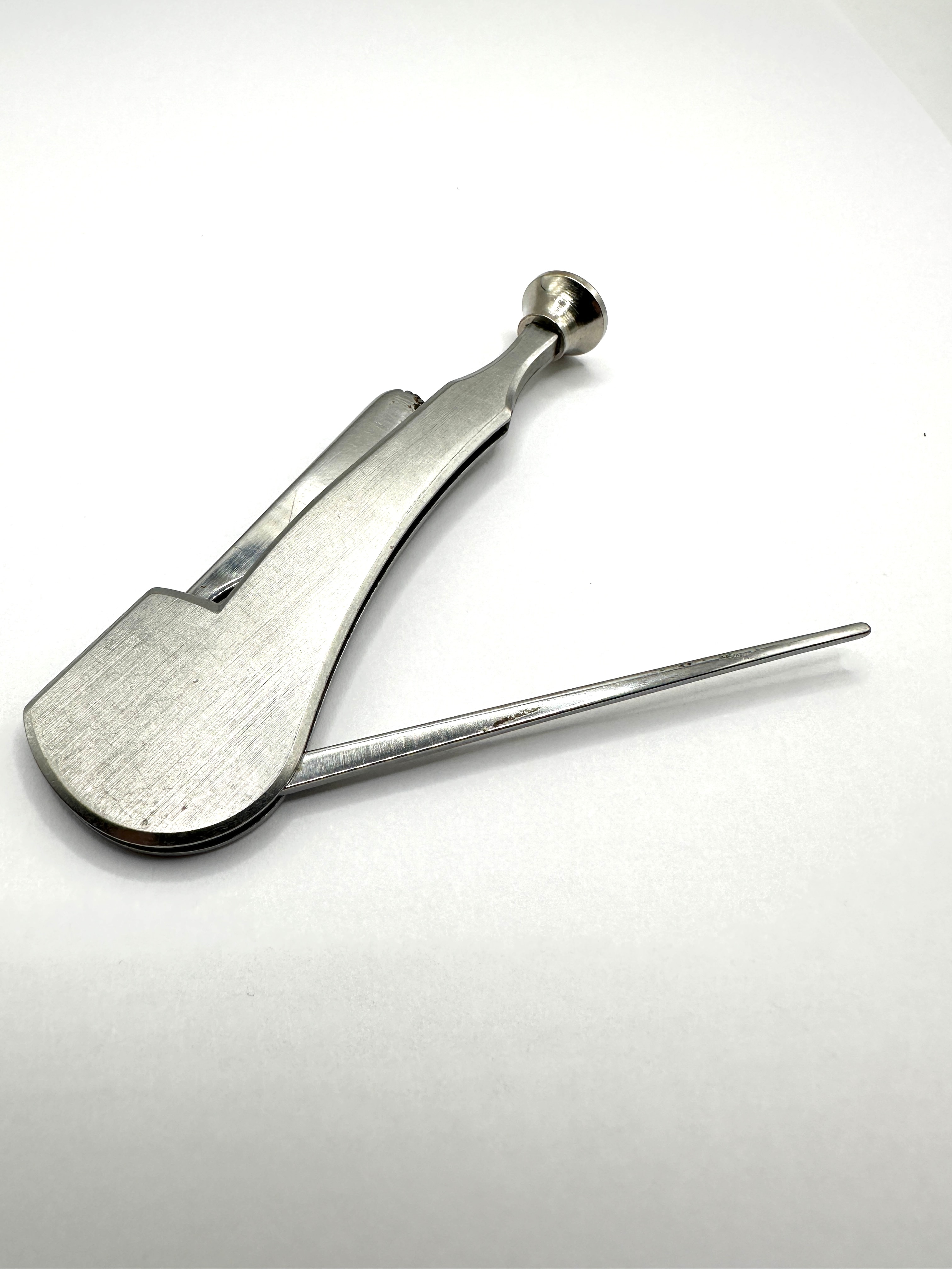 A modern stainless steel pipe tool, designed for cleaning, tamping, and picking. This compact, foldable multi-tool features a brushed silver-tone metallic finish. It incorporates a flat, shovel-like tool, a slender pointed pick, and a rounded tamper at one end. A faint, partially legible inscription, possibly ‘STAINLESS,’ is visible on the pick tool.