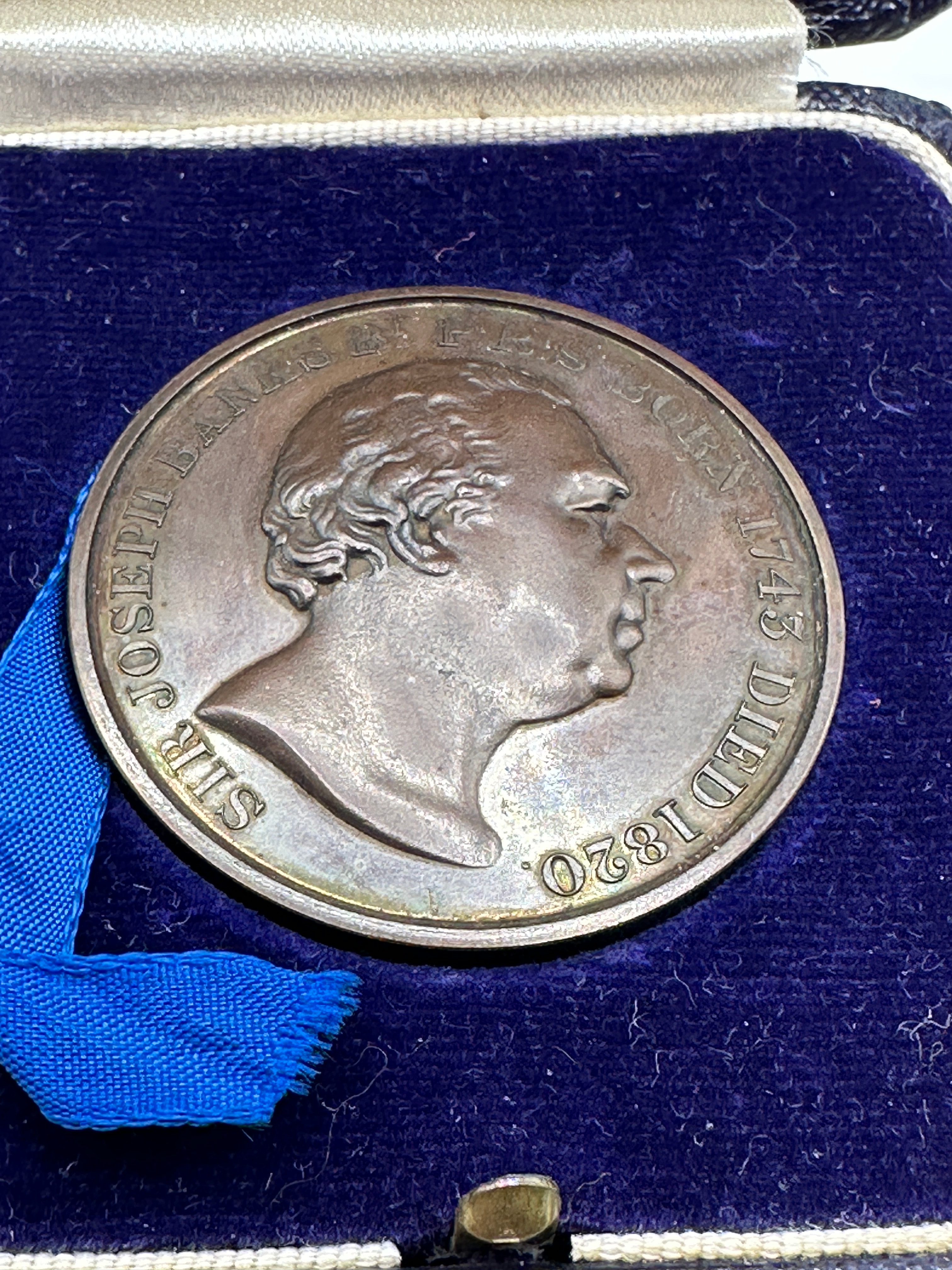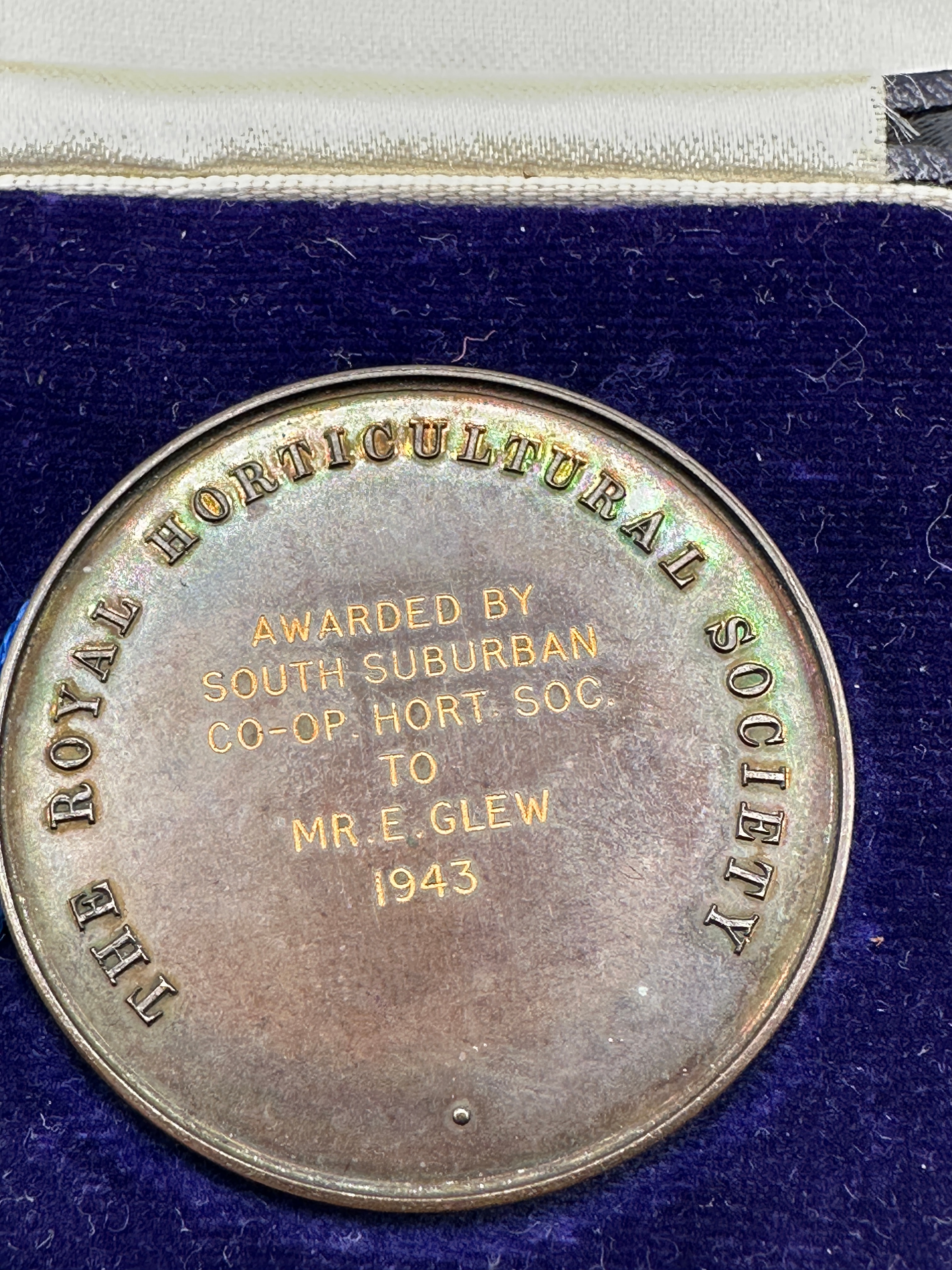 A Sir Joseph Banks Royal Horticultural Society Banksian Award Medal, cast in bronze. The circular medal features on its obverse a classical-style profile bust of Sir Joseph Banks facing right, encircled by the inscription “SIR JOSEPH BANKS F.R.S. BORN 1743 DIED 1820”. The reverse is inscribed “THE ROYAL HORTICULTURAL SOCIETY” around the perimeter, with the central inscription “AWARDED BY SOUTH SUBURBAN CO-OP. HORT. SOC. TO MR E. GLEW 1943”. A short length of blue ribbon is attached. The medal is presented within its original dark blue textured presentation case with a blue velvet interior and a metal clasp.