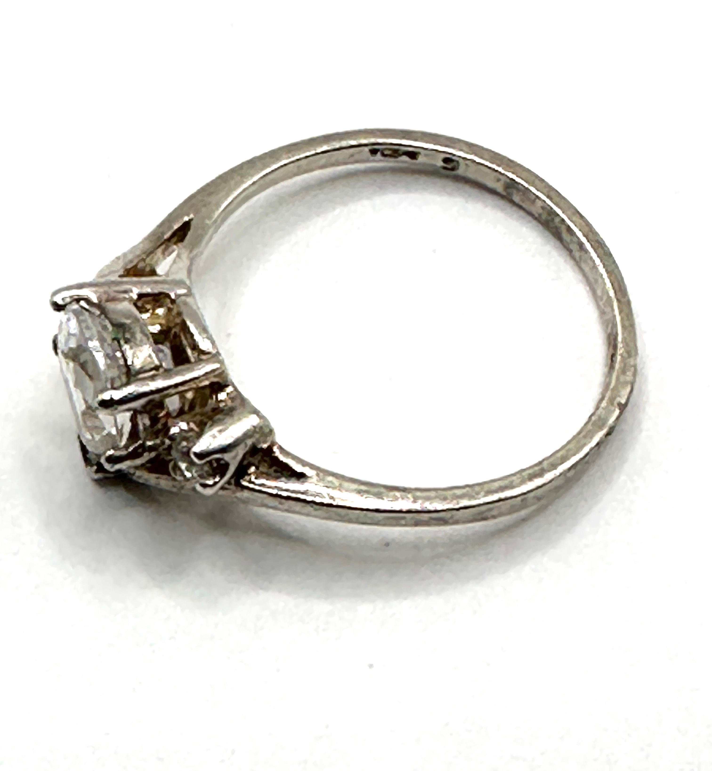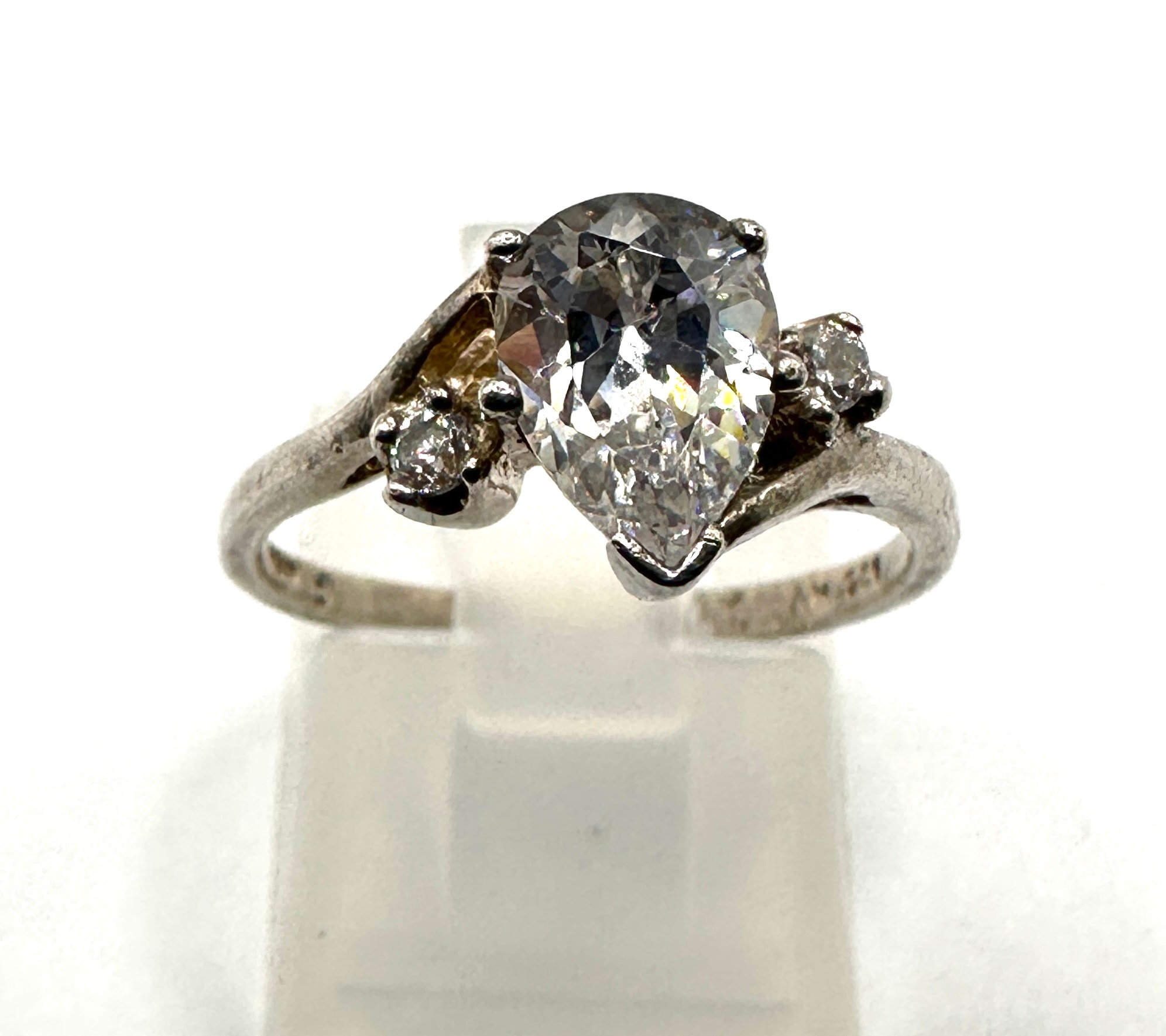 A sterling silver ring featuring a prominent pear-cut colorless faceted gemstone, flanked by two smaller round brilliant-cut colorless faceted accent stones. The ring is crafted from sterling silver, indicated by a “925” hallmark visible on the interior of the band. The central pear-cut stone is set with four prongs. The band exhibits a distinctive bypass or crossover design. The colorless faceted gemstones are consistent with cubic zirconia or simulated diamonds.