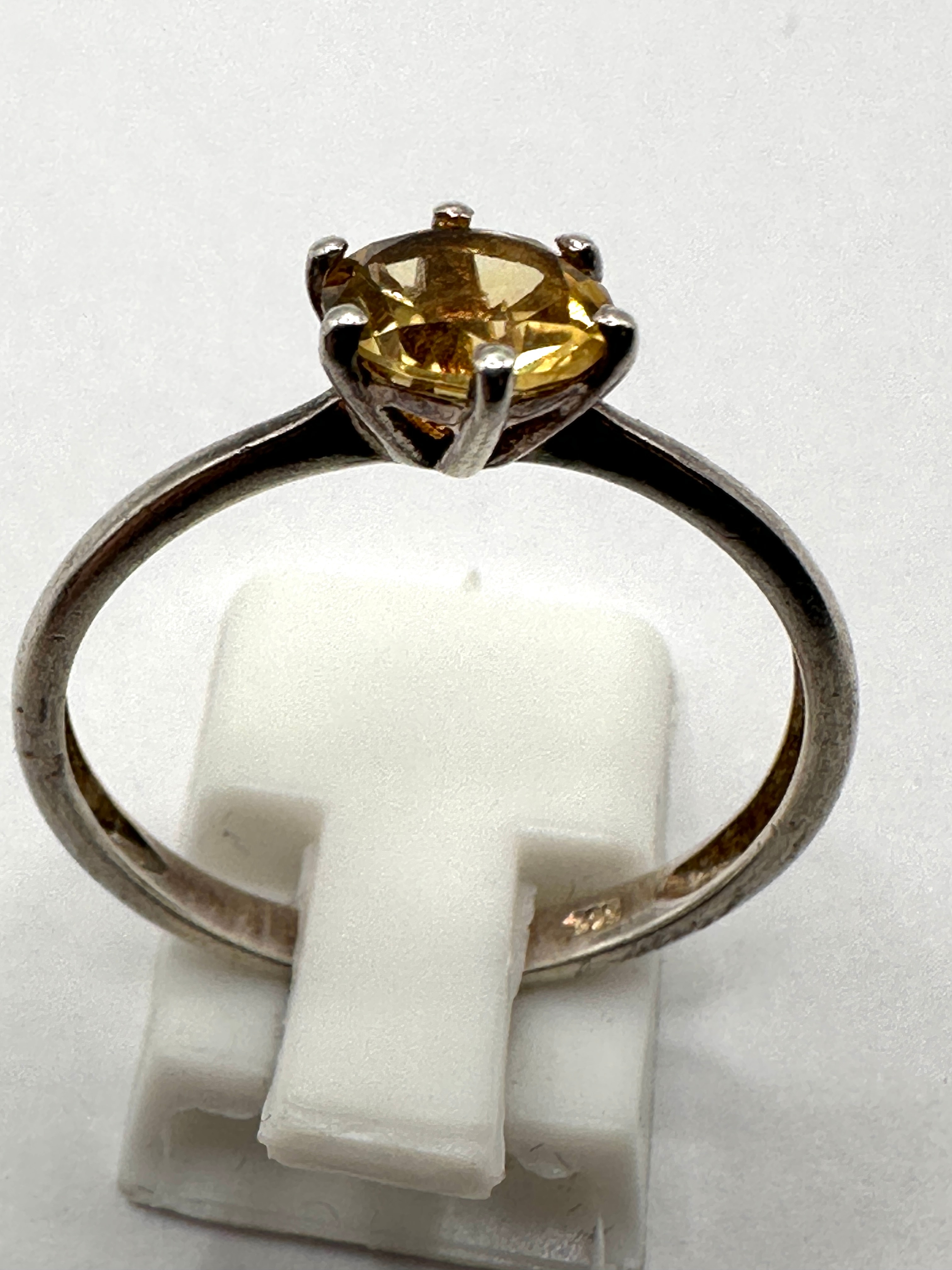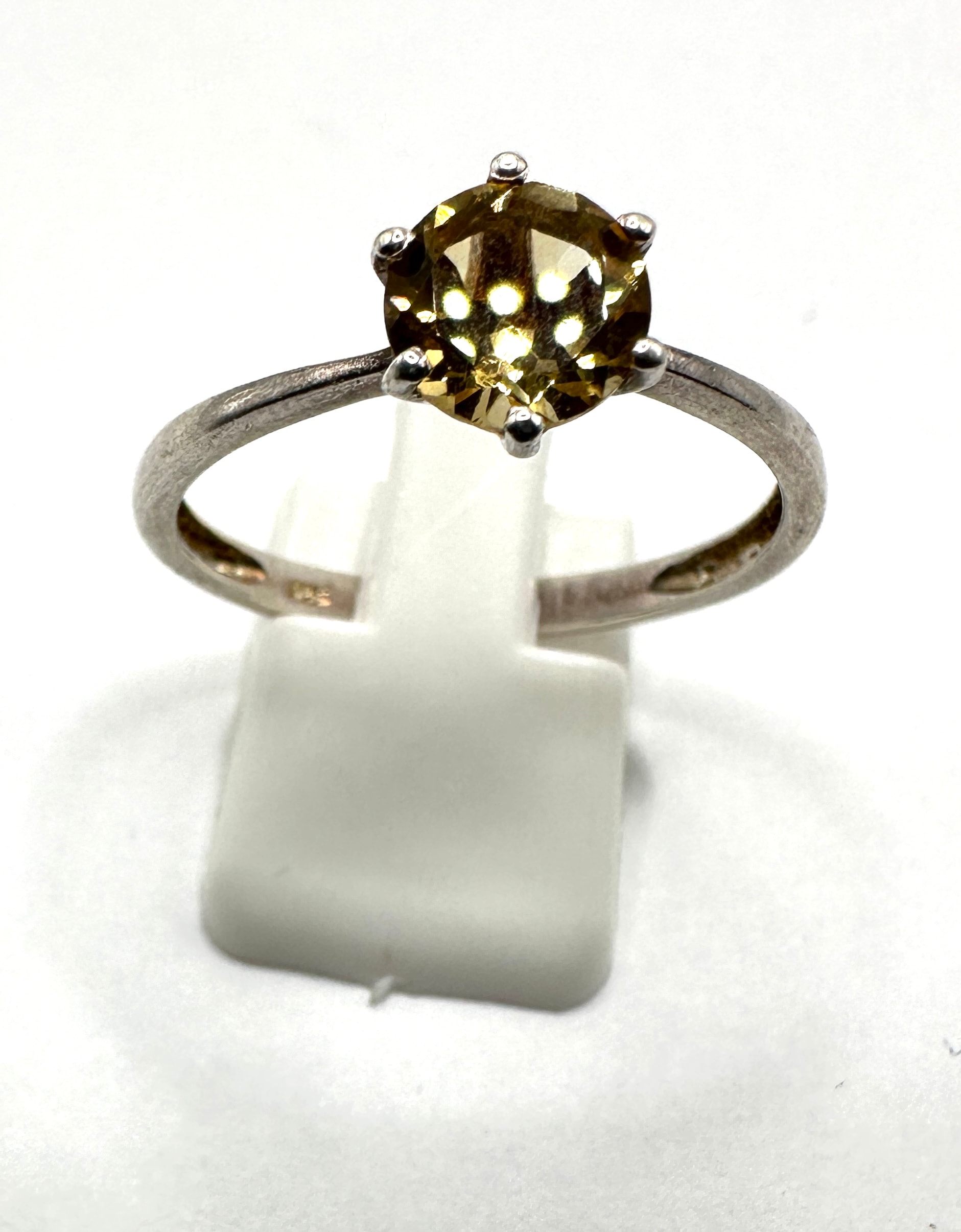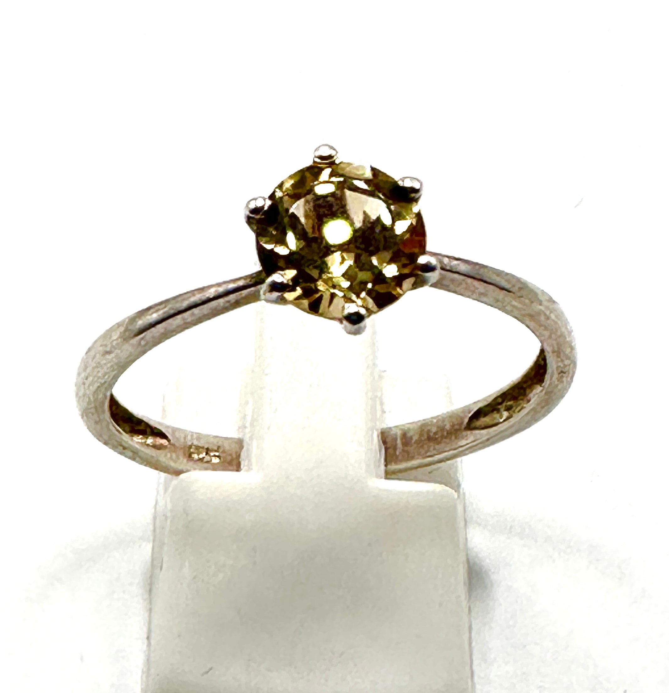 This solitaire finger ring features a single, round brilliant-cut faceted gemstone of a yellowish-brown/olive hue, secured by a six-prong setting. The plain band is crafted from sterling silver, indicated by an “S925” hallmark on its interior.