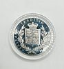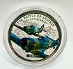 A NumisProof 75th Anniversary of The Battle of Britain silver commemorative proof coin. This modern commemorative proof coin is part of a limited edition NumisProof series, numbered 302 of 499. It is crafted from 1oz of .999 fine silver. The colorized obverse depicts two aircraft in flight, inscribed “THE BATTLE OF BRITAIN 75TH ANNIVERSARY” and “AUG 1940”. The reverse displays a crowned coat of arms within laurel wreaths, inscribed “NUMISPROOF”, “TRADISIO” (Latin for tradition), and “VERITAS” (Latin for truth). The coin is presented in a clear protective capsule within its original black presentation box, accompanied by its certificate of authenticity detailing its specifications and limited edition status.