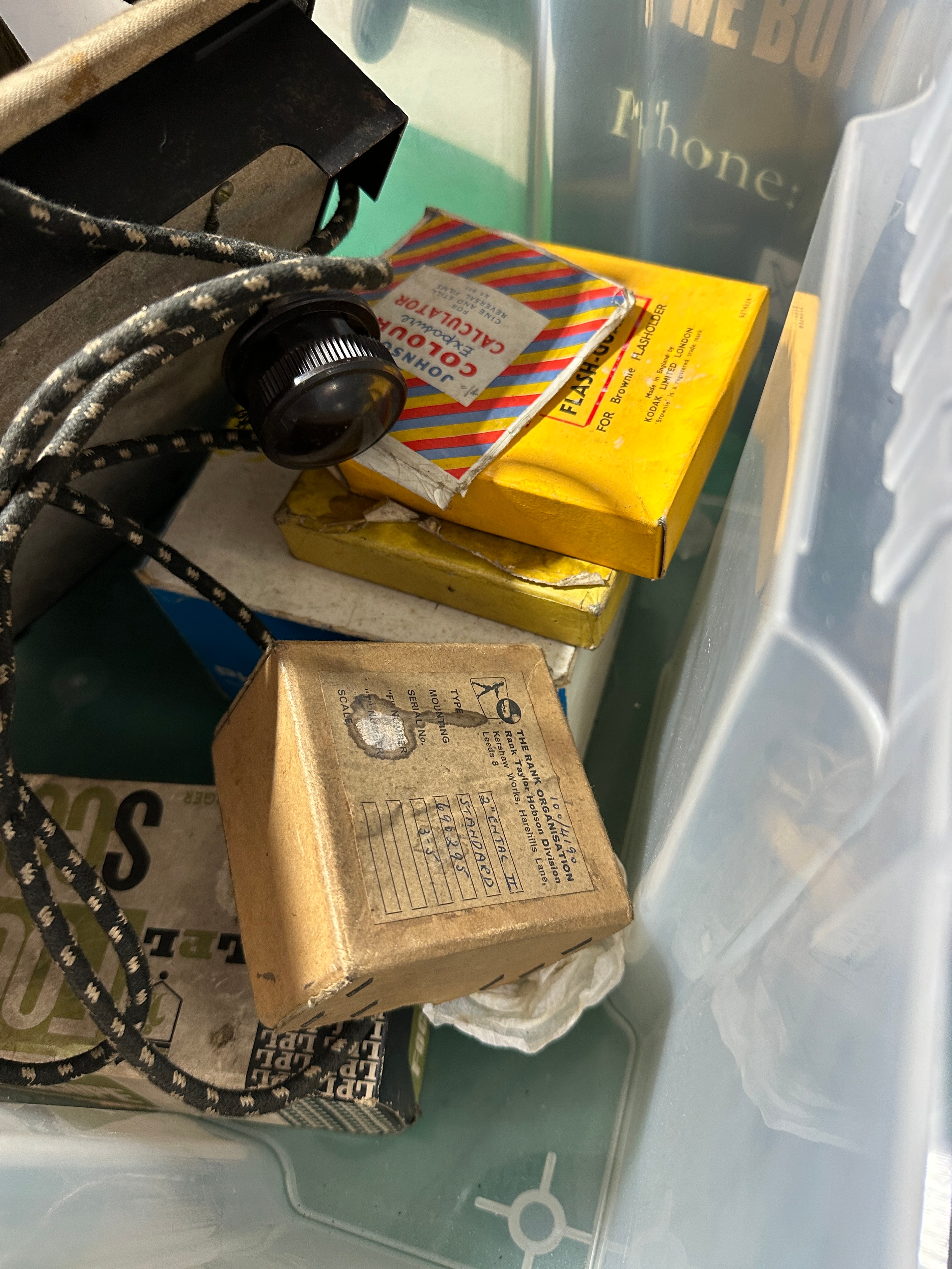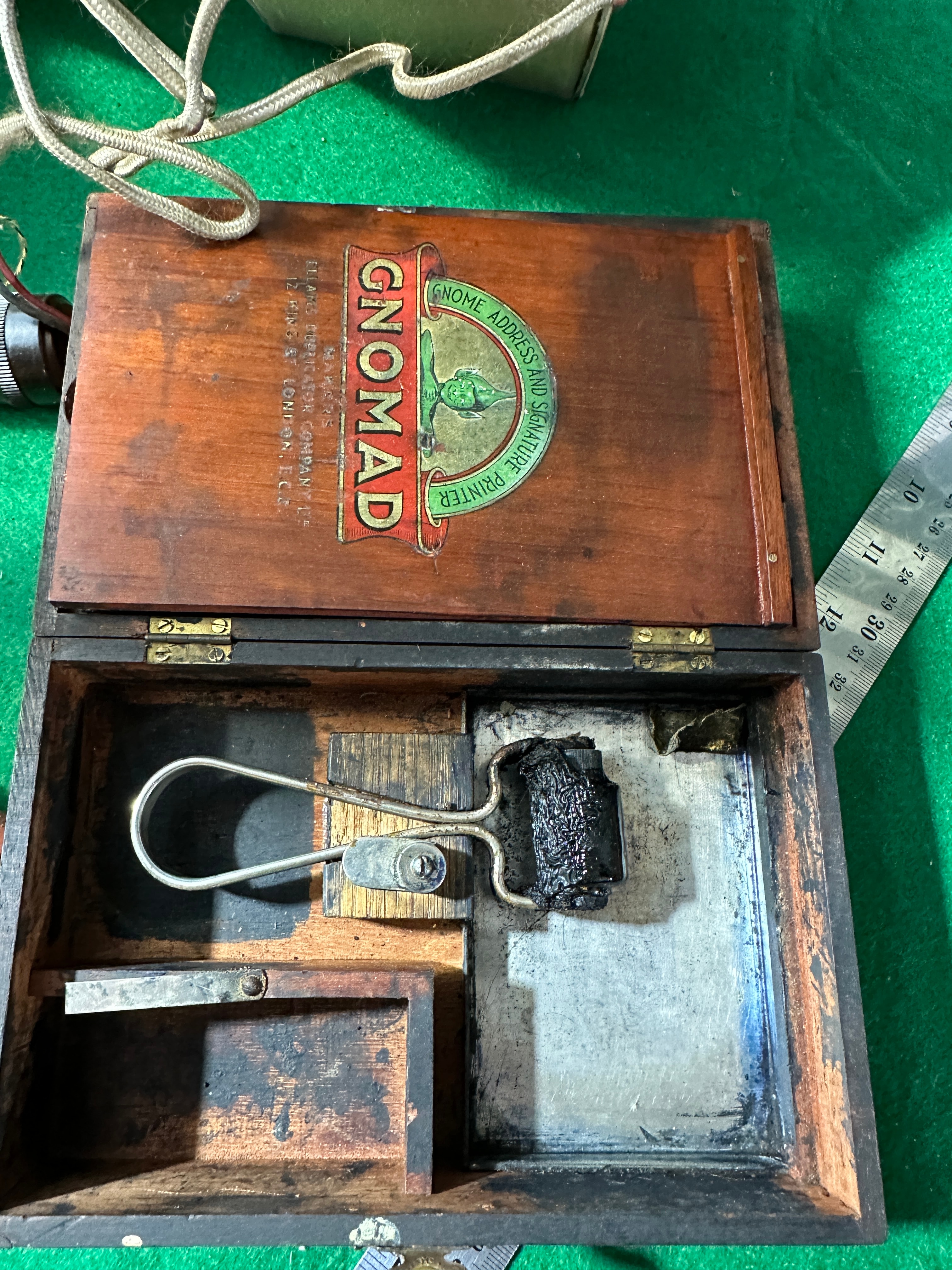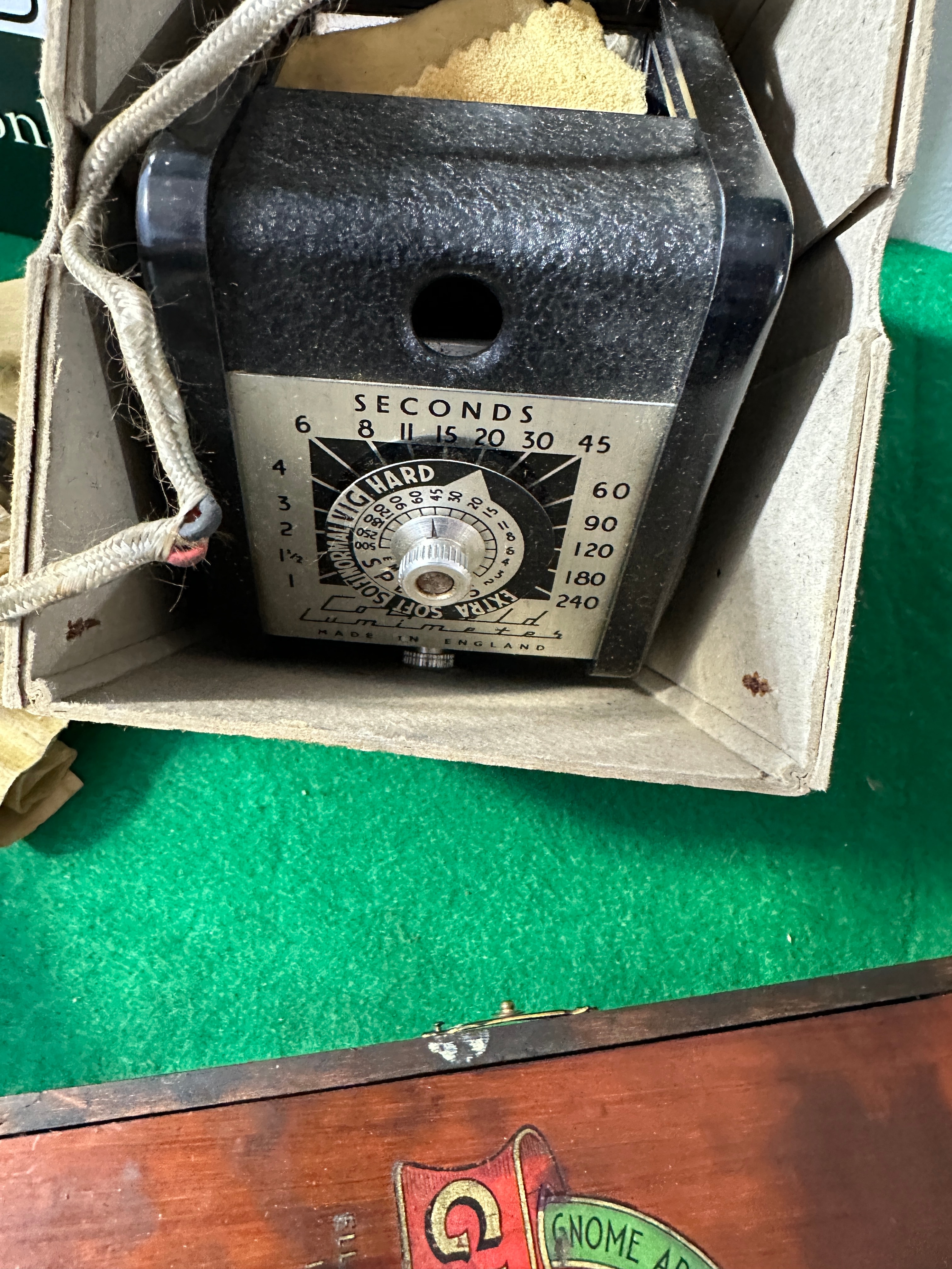 A collection of vintage photographic and printing equipment. The lot is centered around a ‘GNOMIC ENLARGING TIMER’ by ‘JOHNSONS OF HENDON LTD. LONDON,’ ‘MADE IN ENGLAND.’ The timer features a dark, textured body, likely Bakelite or molded plastic, with a metal faceplate displaying ‘SECONDS’ and numerical intervals from 6 to 240, along with a central adjustment dial and a braided cloth-covered electrical cord. Also included is a wooden hinged box labeled ‘GNOMAD GNOME ADDRESS AND SIGNATURE PRINTER,’ containing an inking roller and internal compartments. Further accompanying items comprise a ‘JOHNSON’S COLOUR ENLARGING CALCULATOR,’ a ‘KODAK FLASHOLDER,’ and an ‘ERC UNIVERSAL ENLARGER FOCUSING MAGNIFIER,’ each in their original accessory boxes. A disassembled metal stand or enlarger column is also present.