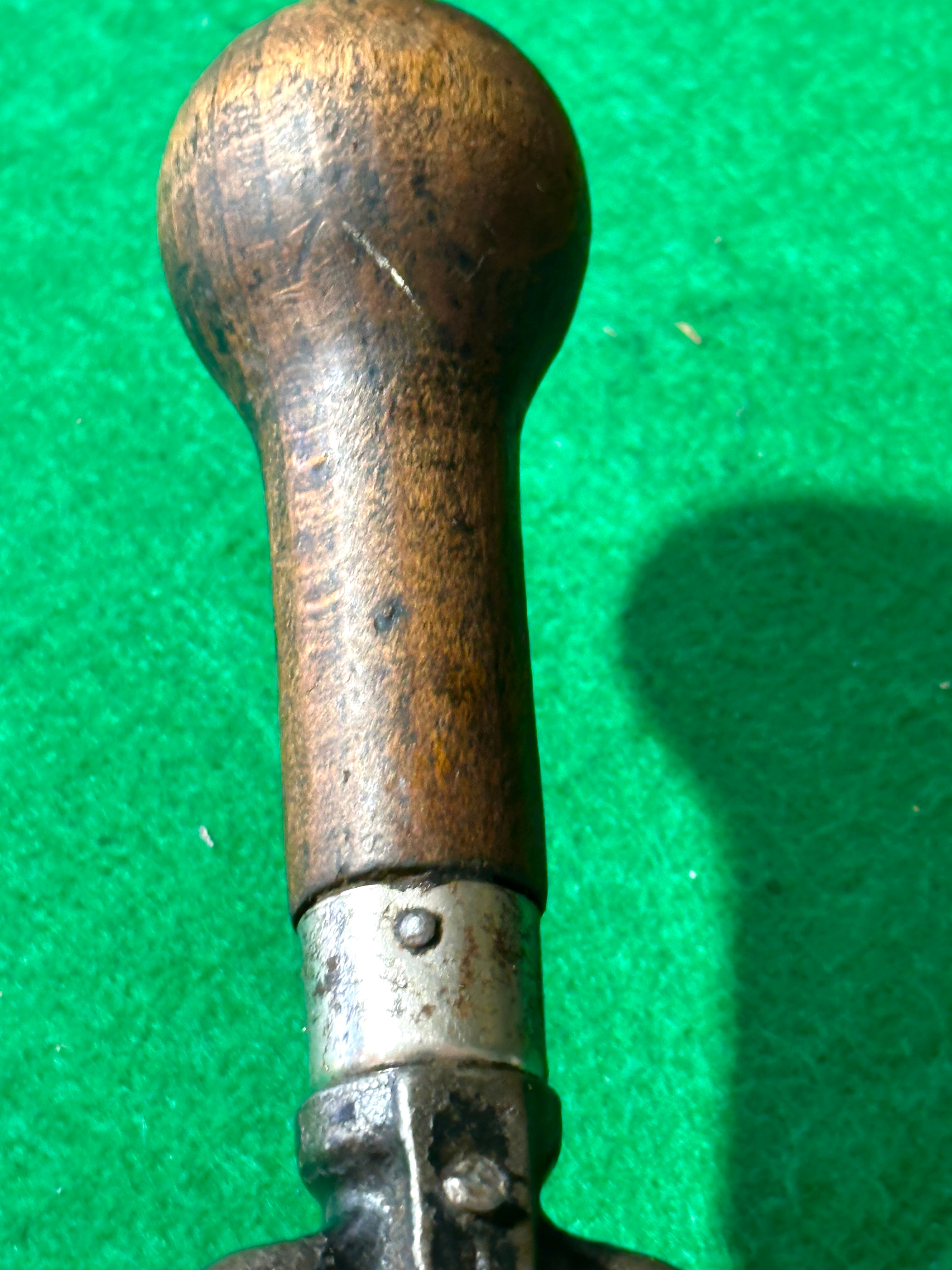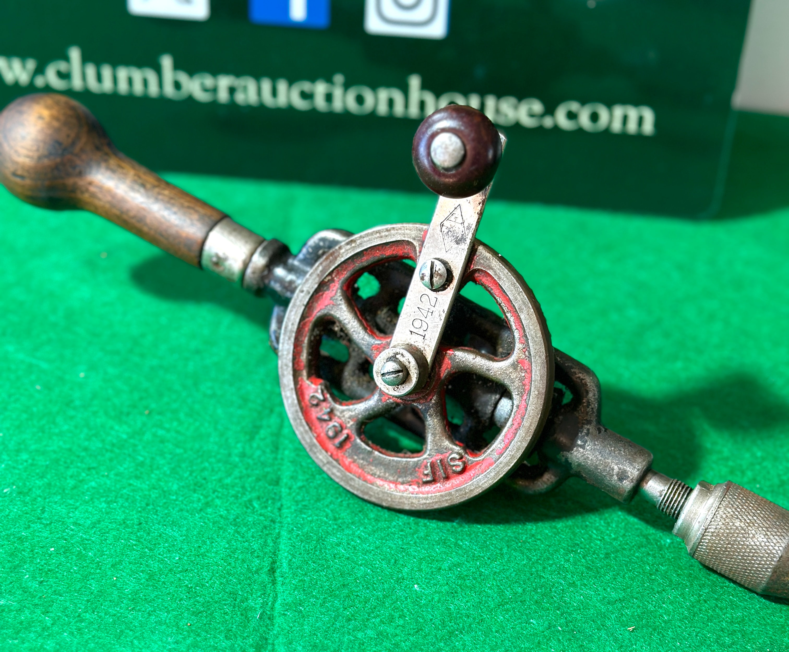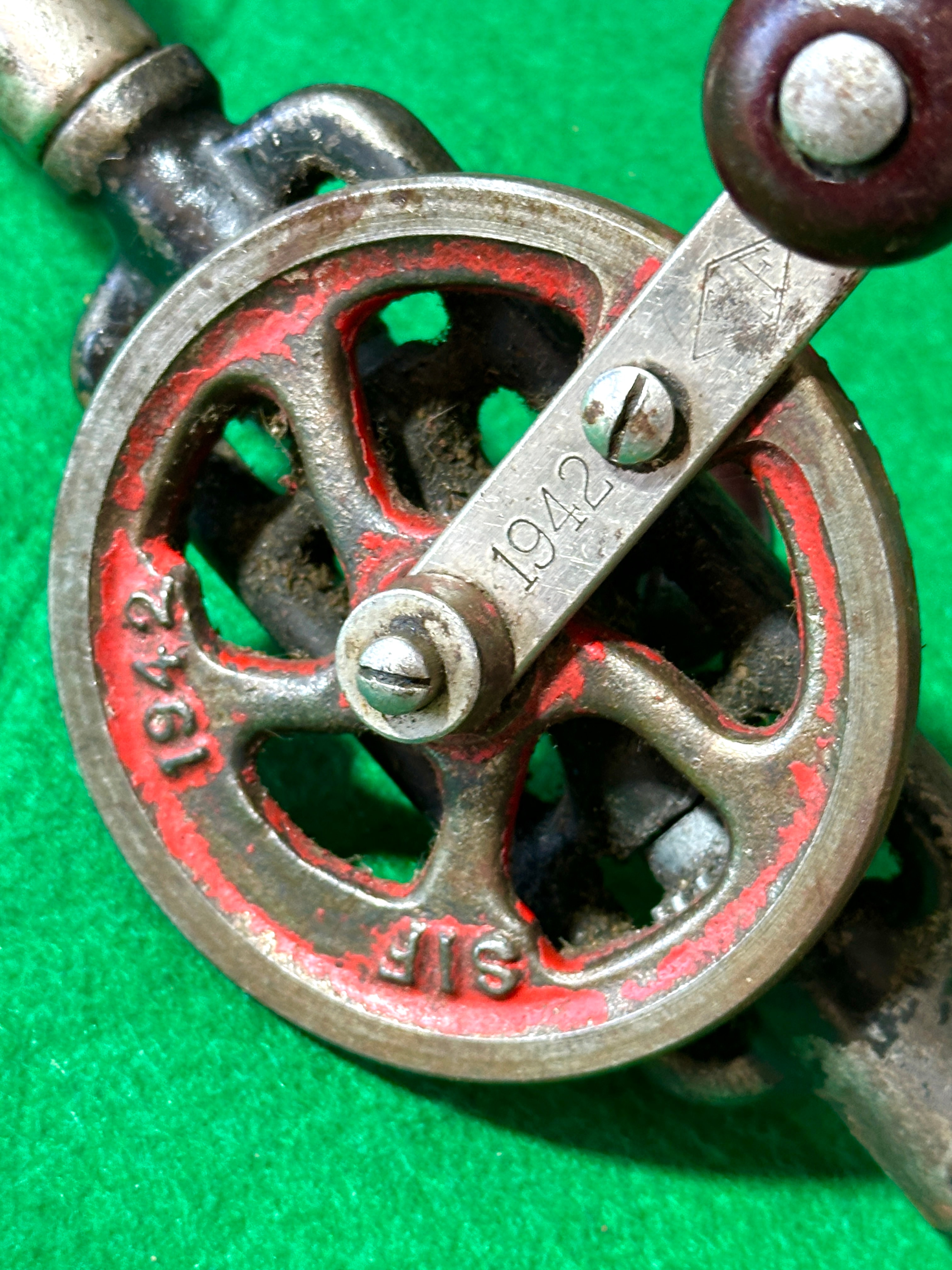 A SIF Double Pinion Hand Egg Beater Drill, dated 1942. This utilitarian tool features a cast iron main body and gear mechanism, with steel components including the chuck and crank arm. It is fitted with a turned wooden main handle and a smaller wooden crank knob. The large drive wheel prominently displays ‘SIF’ and ‘1942’ on its rim, with ‘1942’ also present on the crank arm, which includes a small diamond-shaped logo.