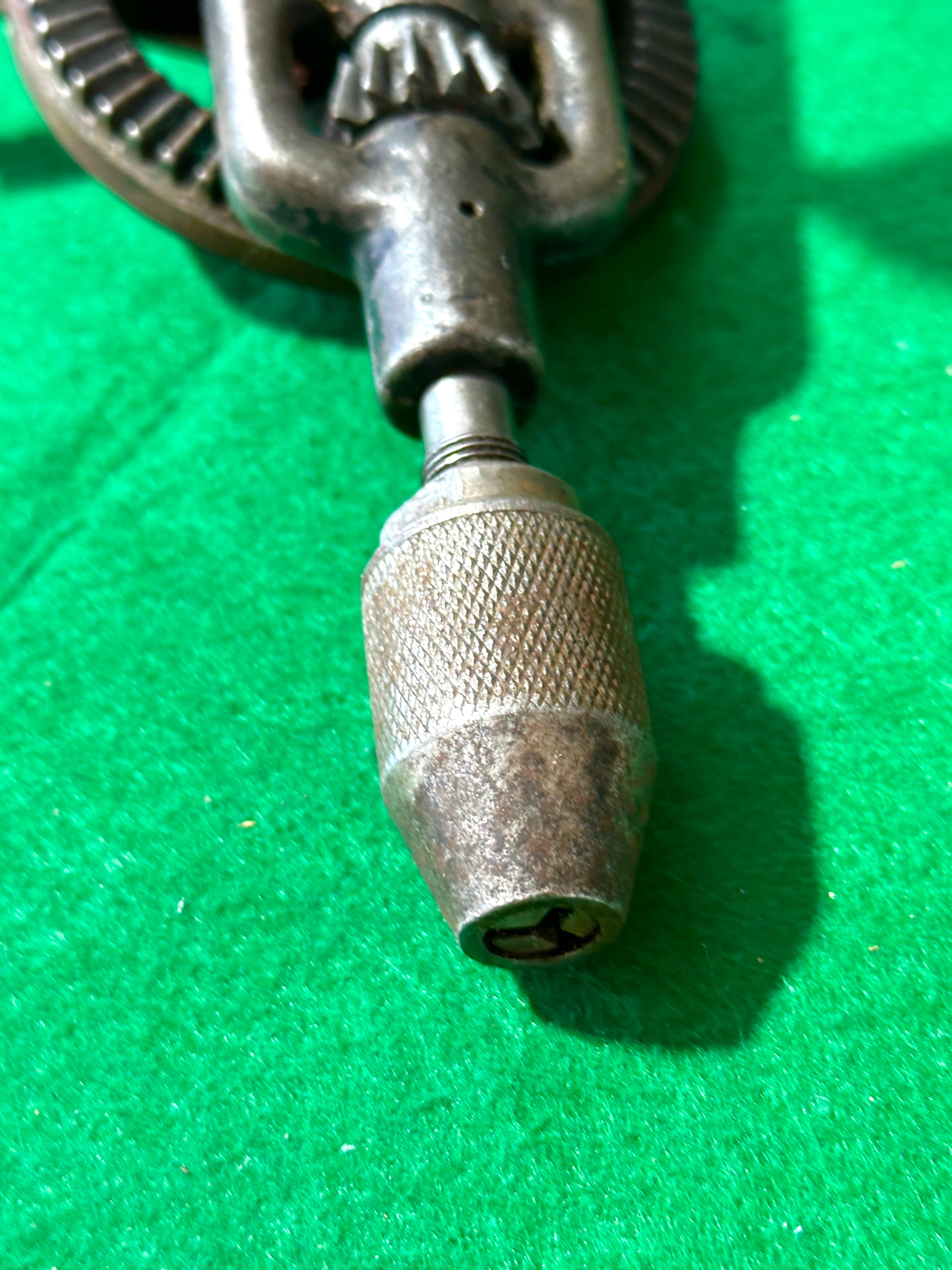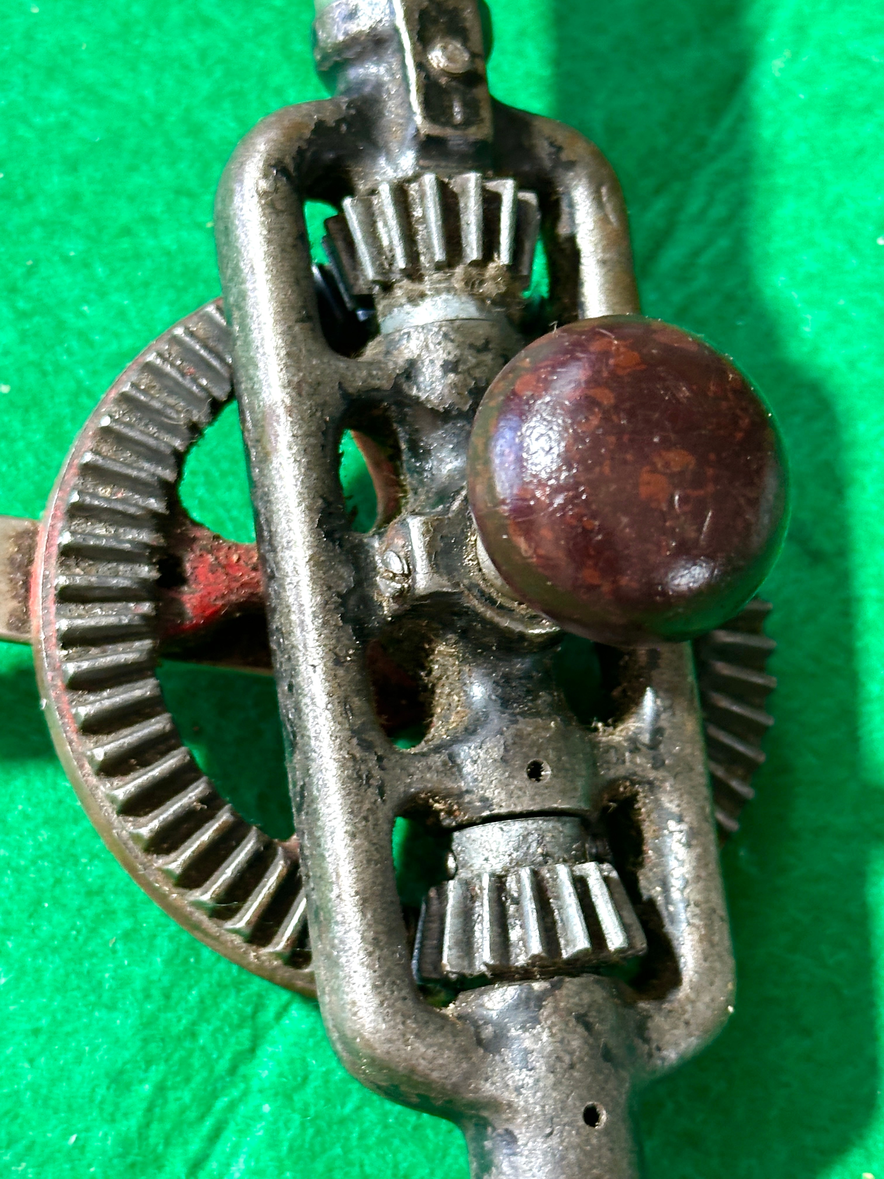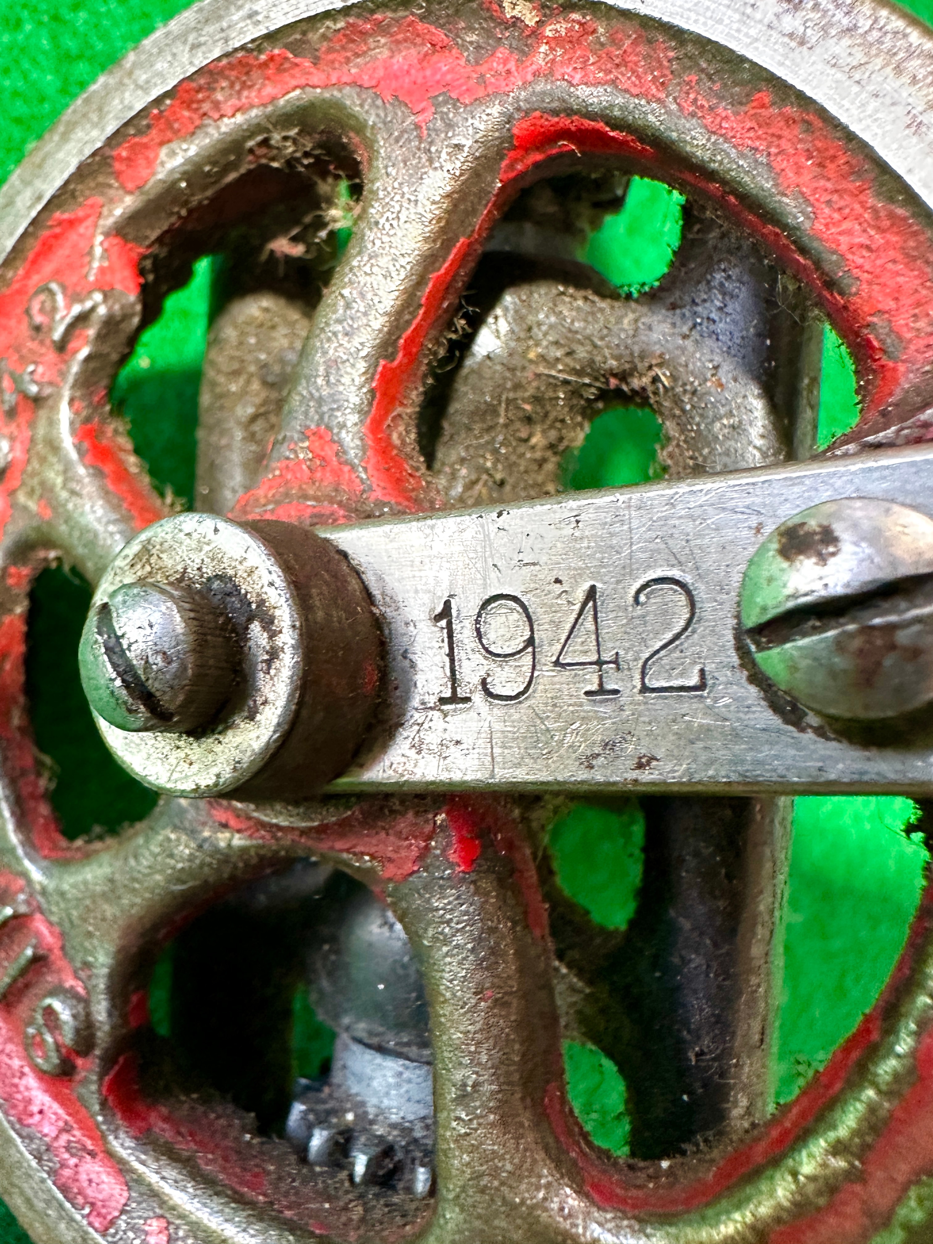 A SIF Double Pinion Hand Egg Beater Drill, dated 1942. This utilitarian tool features a cast iron main body and gear mechanism, with steel components including the chuck and crank arm. It is fitted with a turned wooden main handle and a smaller wooden crank knob. The large drive wheel prominently displays ‘SIF’ and ‘1942’ on its rim, with ‘1942’ also present on the crank arm, which includes a small diamond-shaped logo.