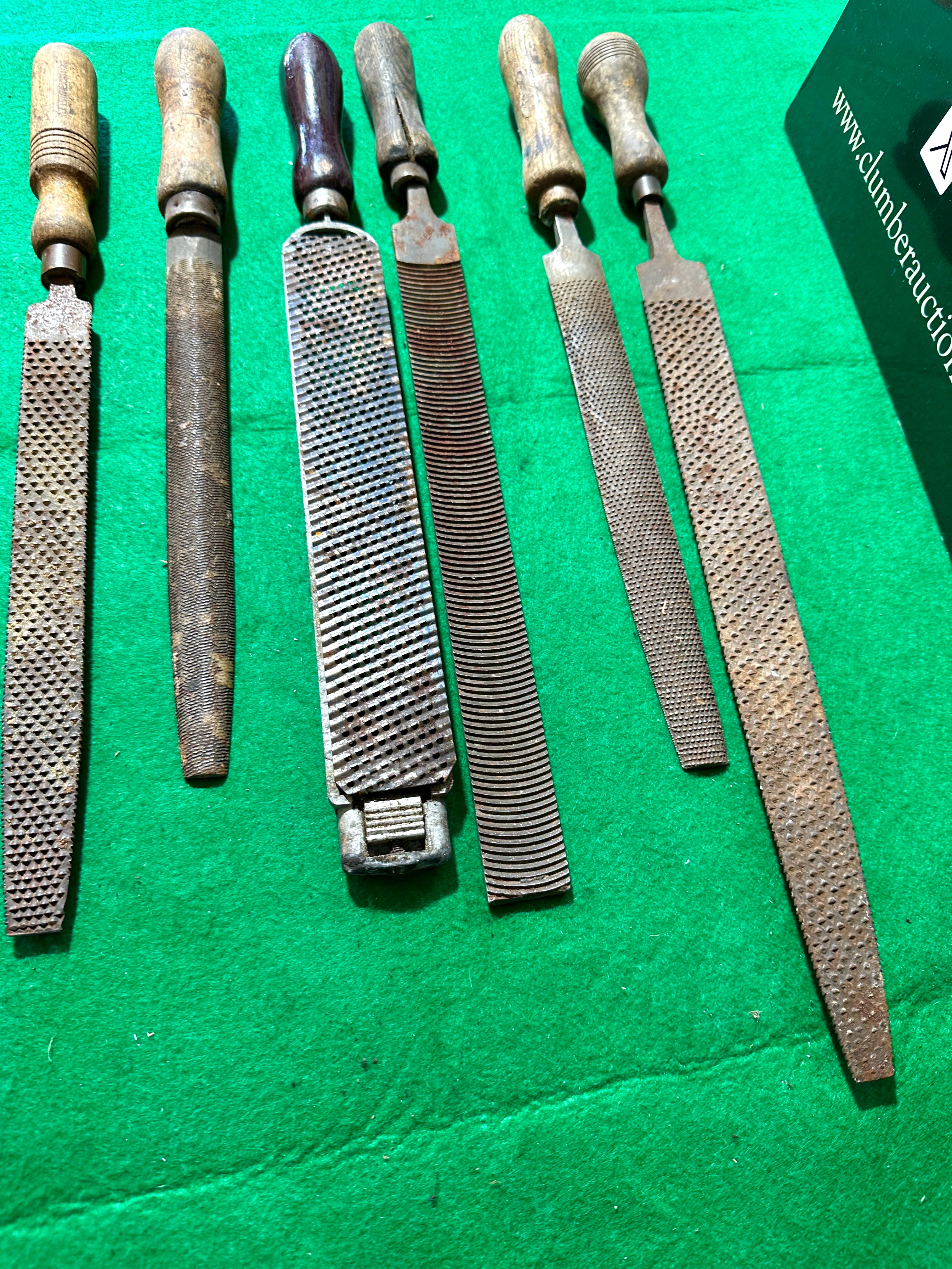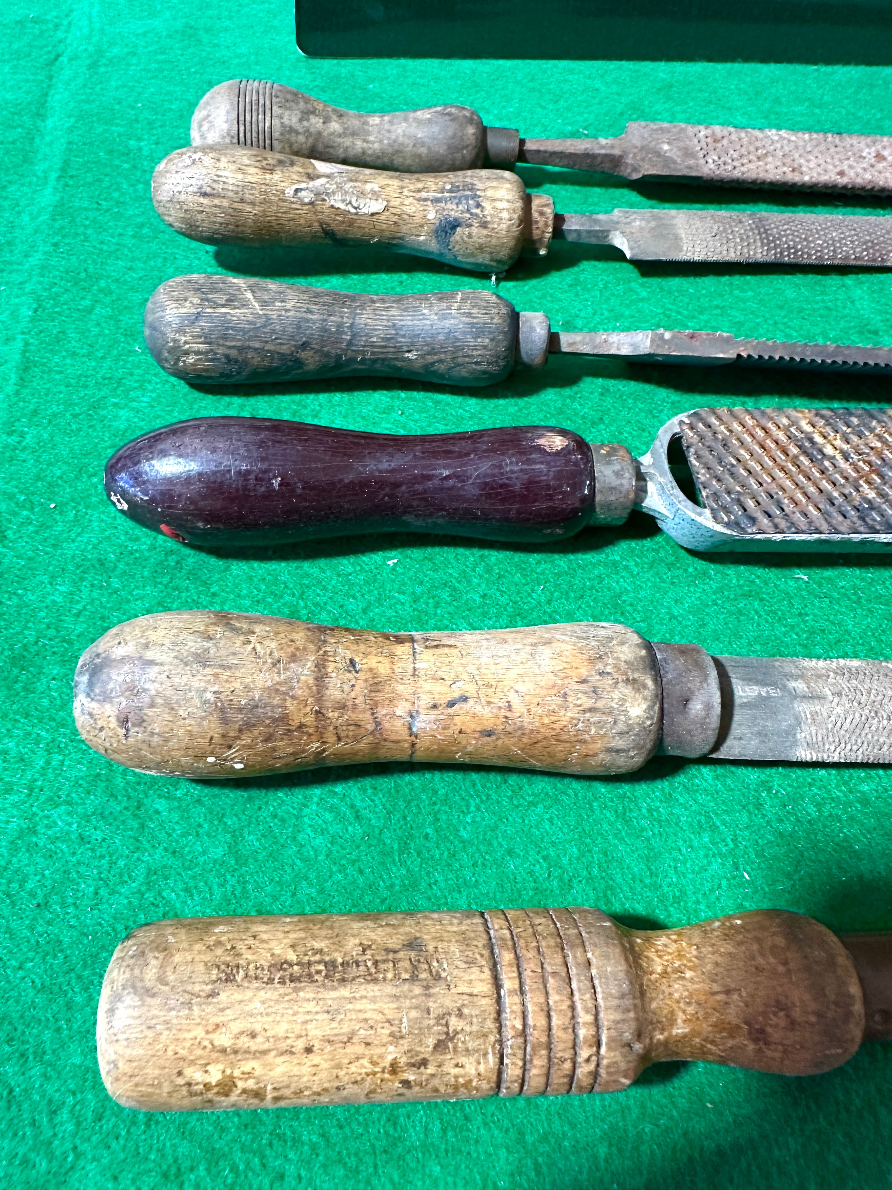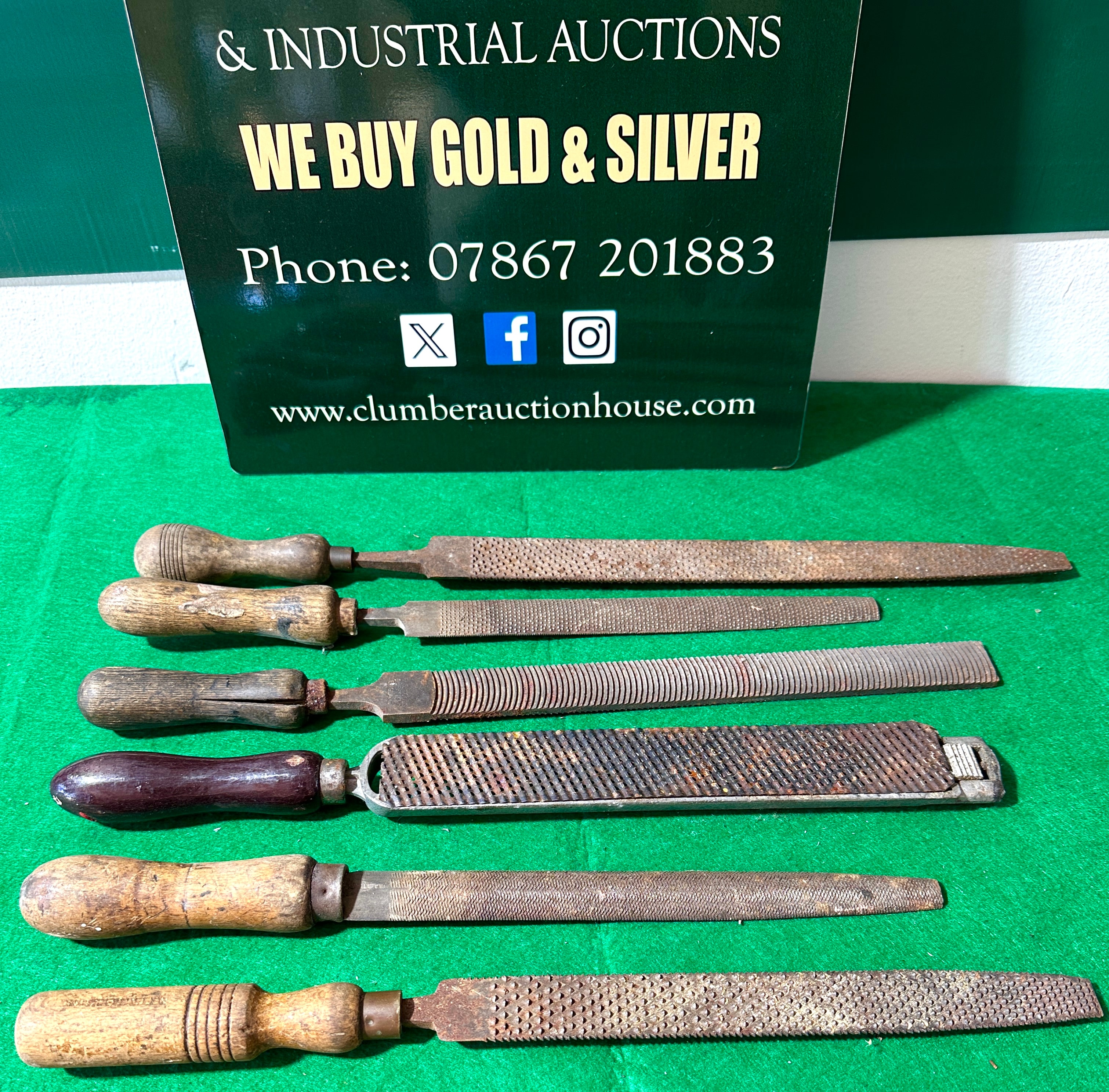 The lot comprises six assorted hand tools, specifically files and rasps, each constructed with a metal blade and a wooden handle. Five of the handles retain a natural wood tone, while one features a dark-stained or painted finish. The metal blades exhibit various patterns of teeth and rasps, consistent with tools designed for shaping or abrading materials. While no manufacturer’s marks are discernible on the tools themselves, similar vintage lots of files and rasps often include examples by prominent makers such as Nicholson.