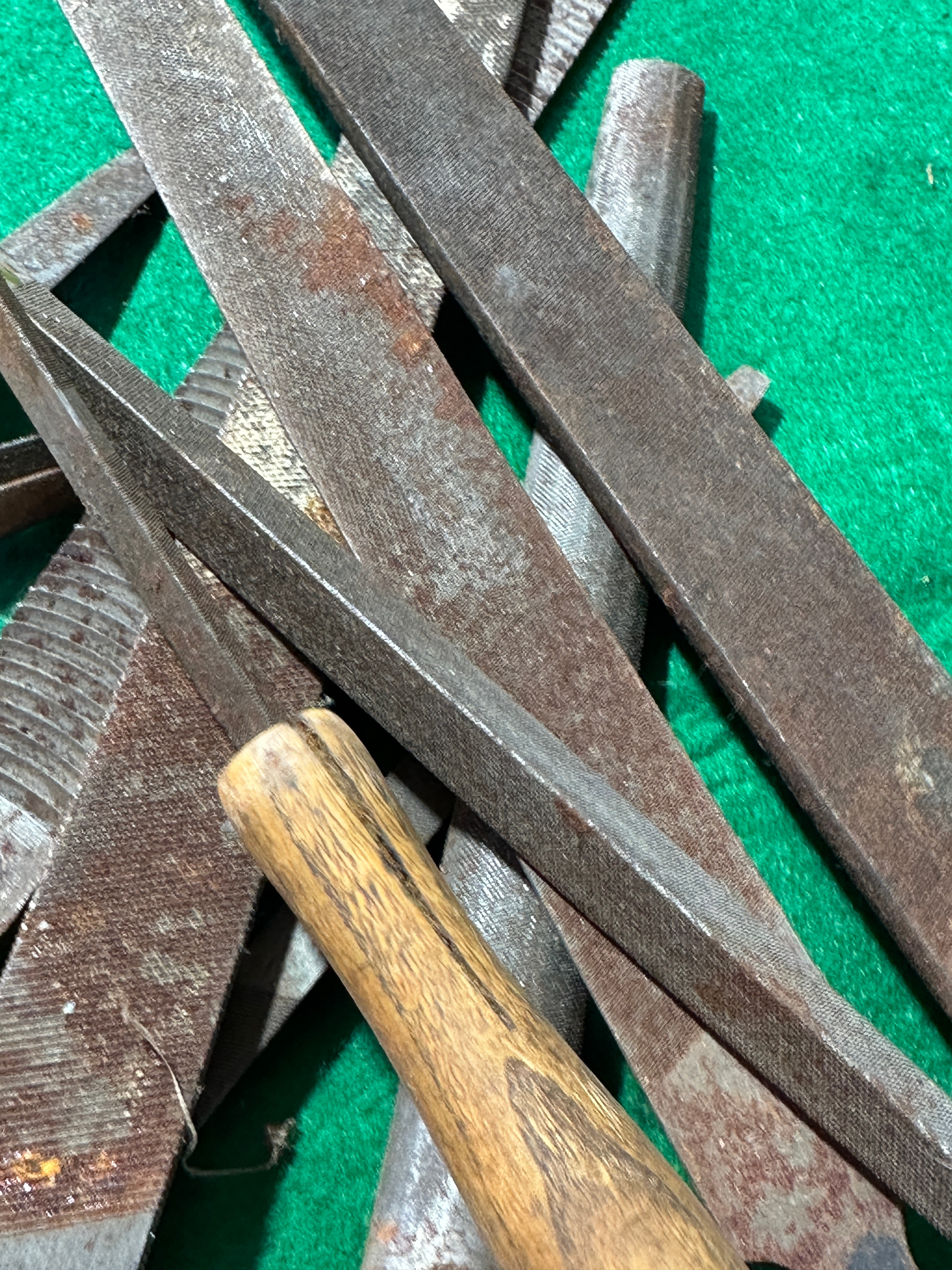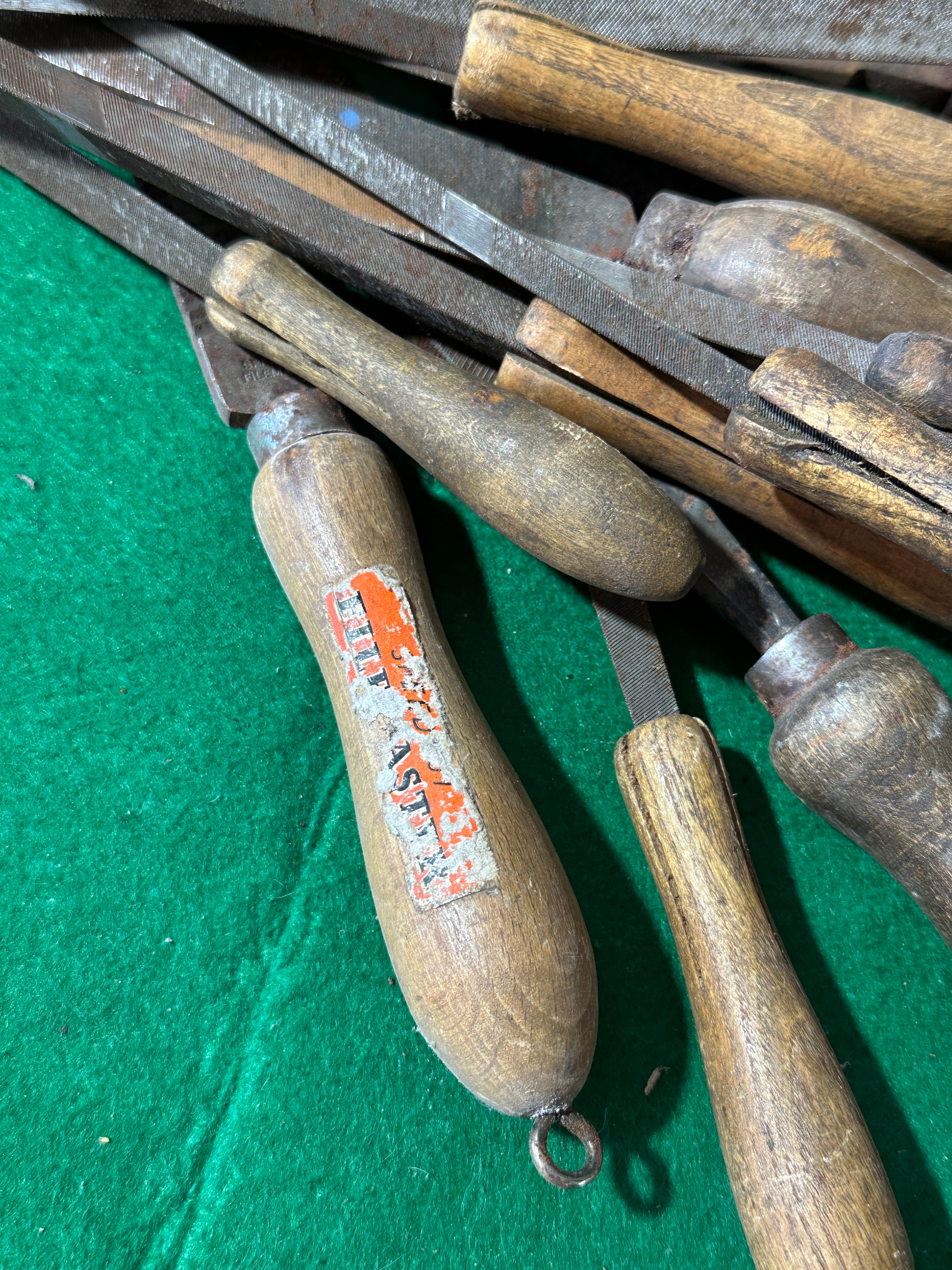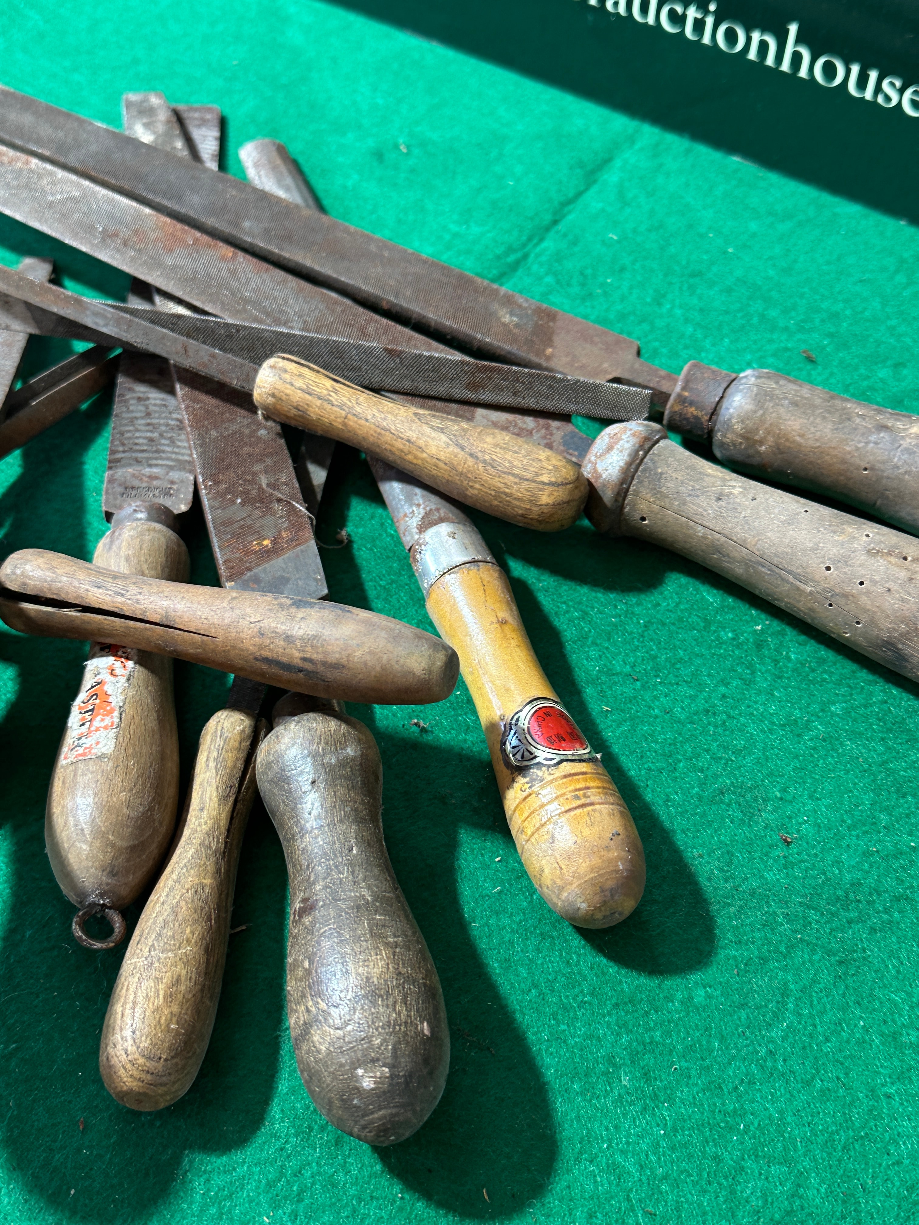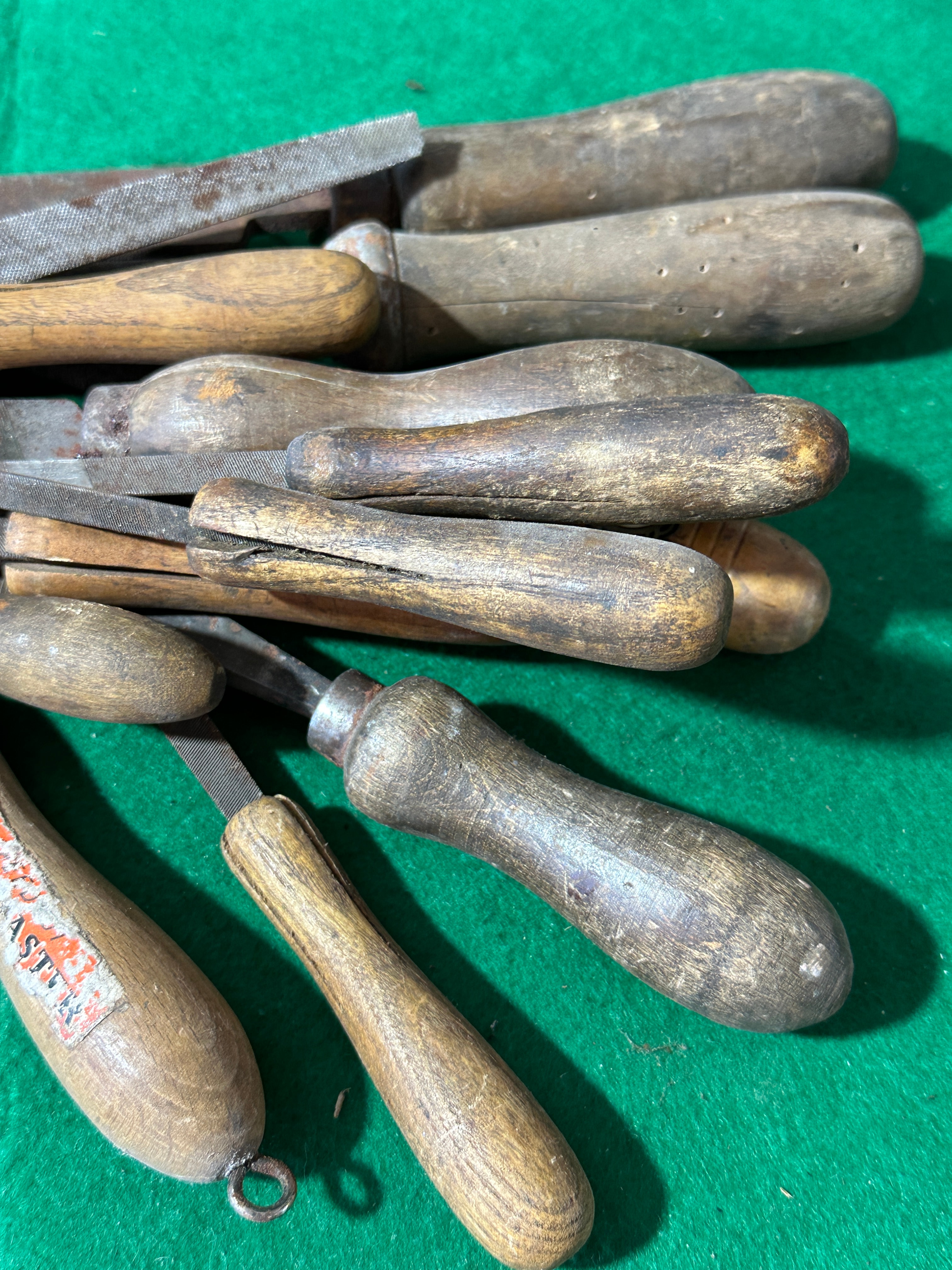 A collection of 12 Kearney & Foot K&F USA hand files, each featuring a steel blade and a wooden handle. The files present various profiles, including flat and triangular shapes. The wooden handles vary in style, with one bearing a partially legible “THE AST” marking on a worn sticker and another adorned with a decorative metal ring set with a red cabochon.
