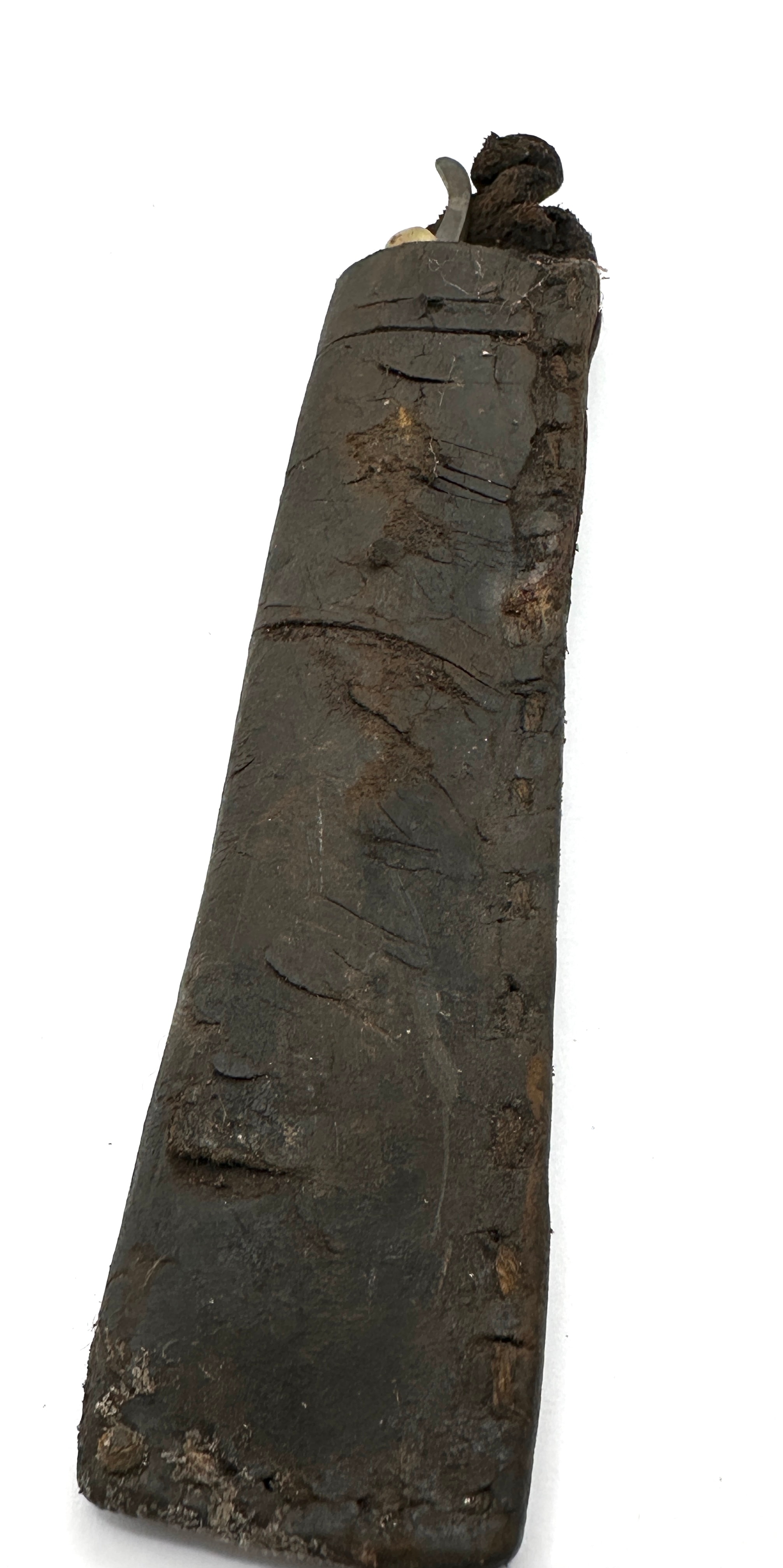 An antique straight razor by John Barber Sheffield, featuring a metal blade and light-colored scales, likely bone or horn, secured by metal pins. It is accompanied by a dark, aged leather sheath.