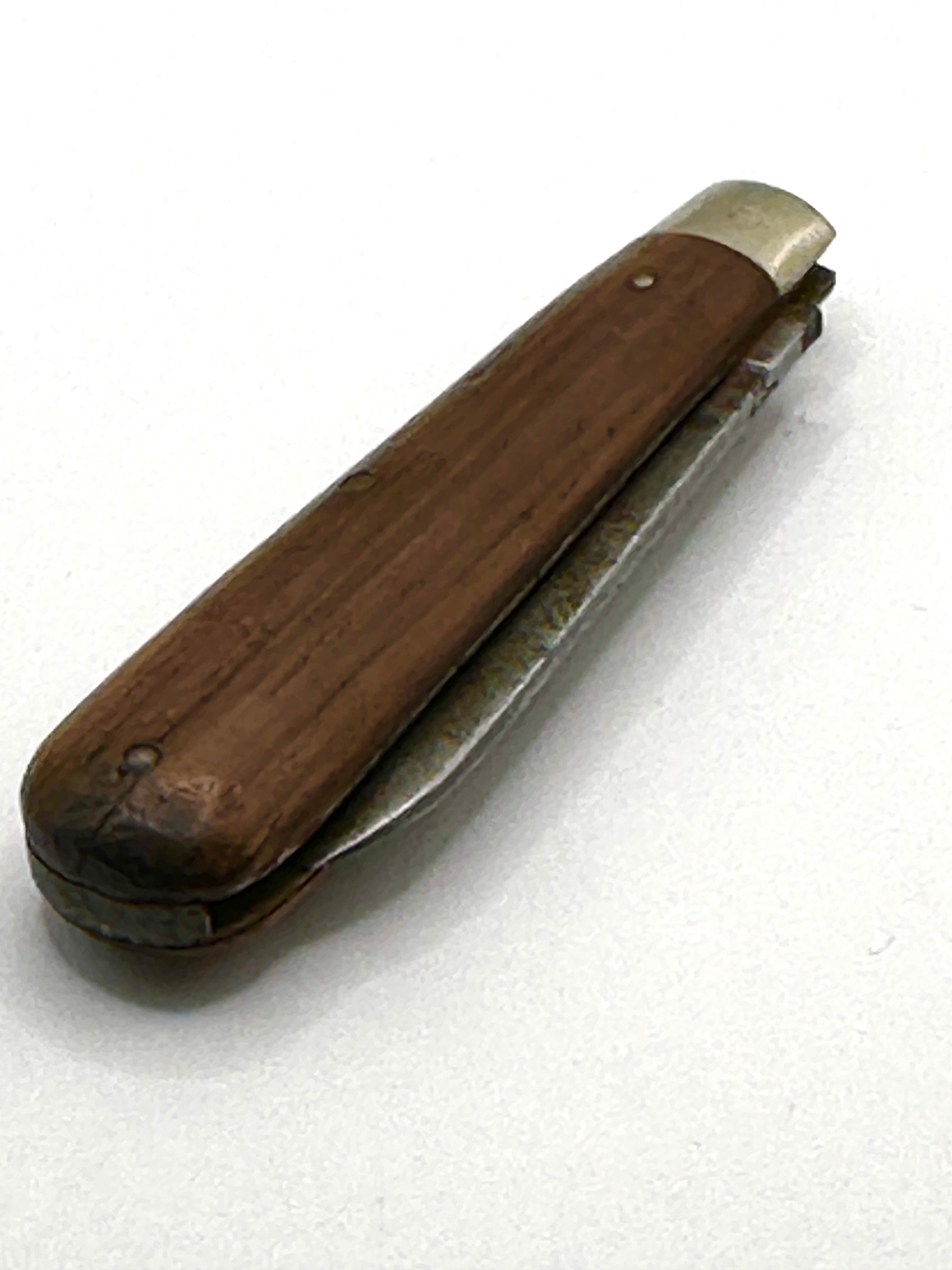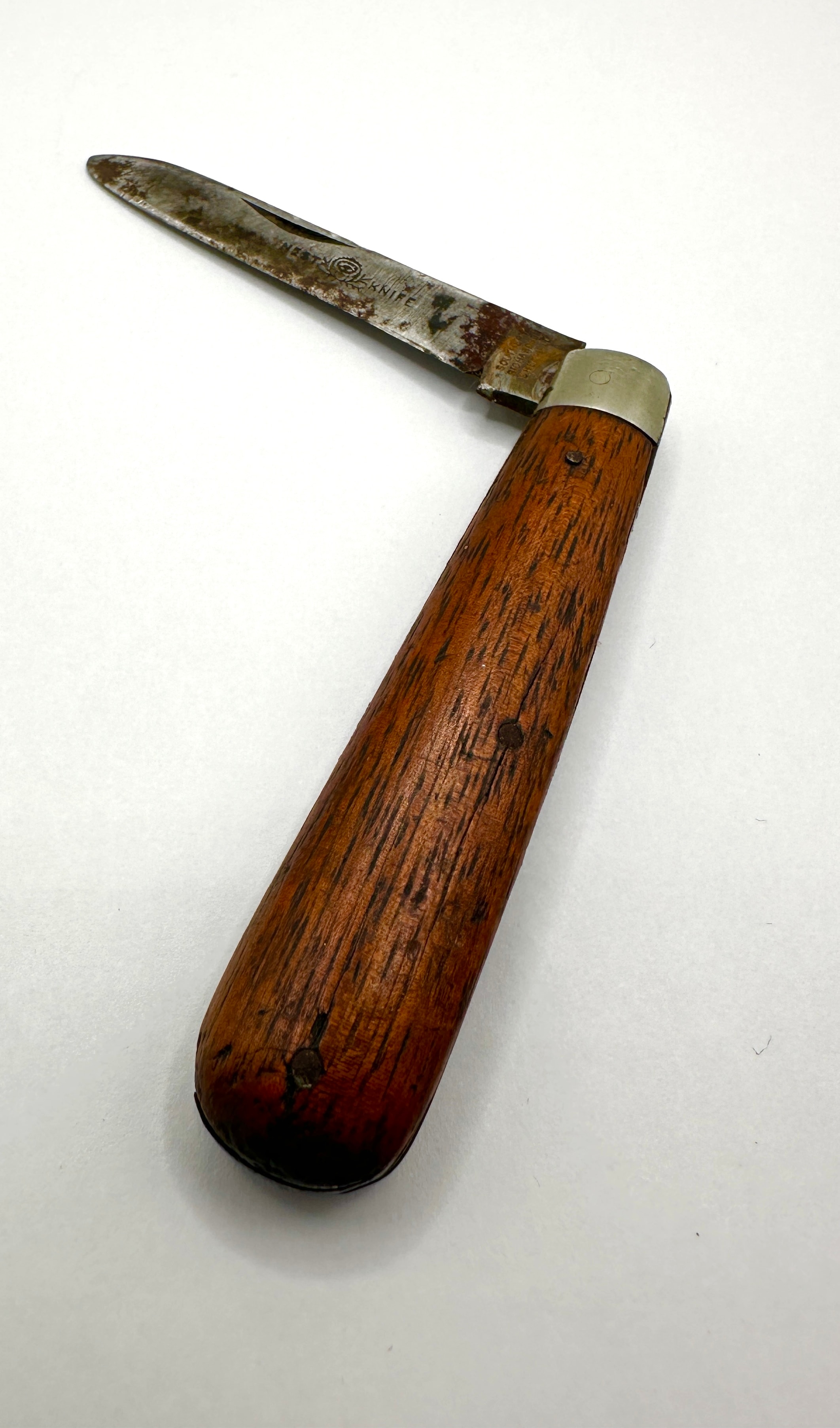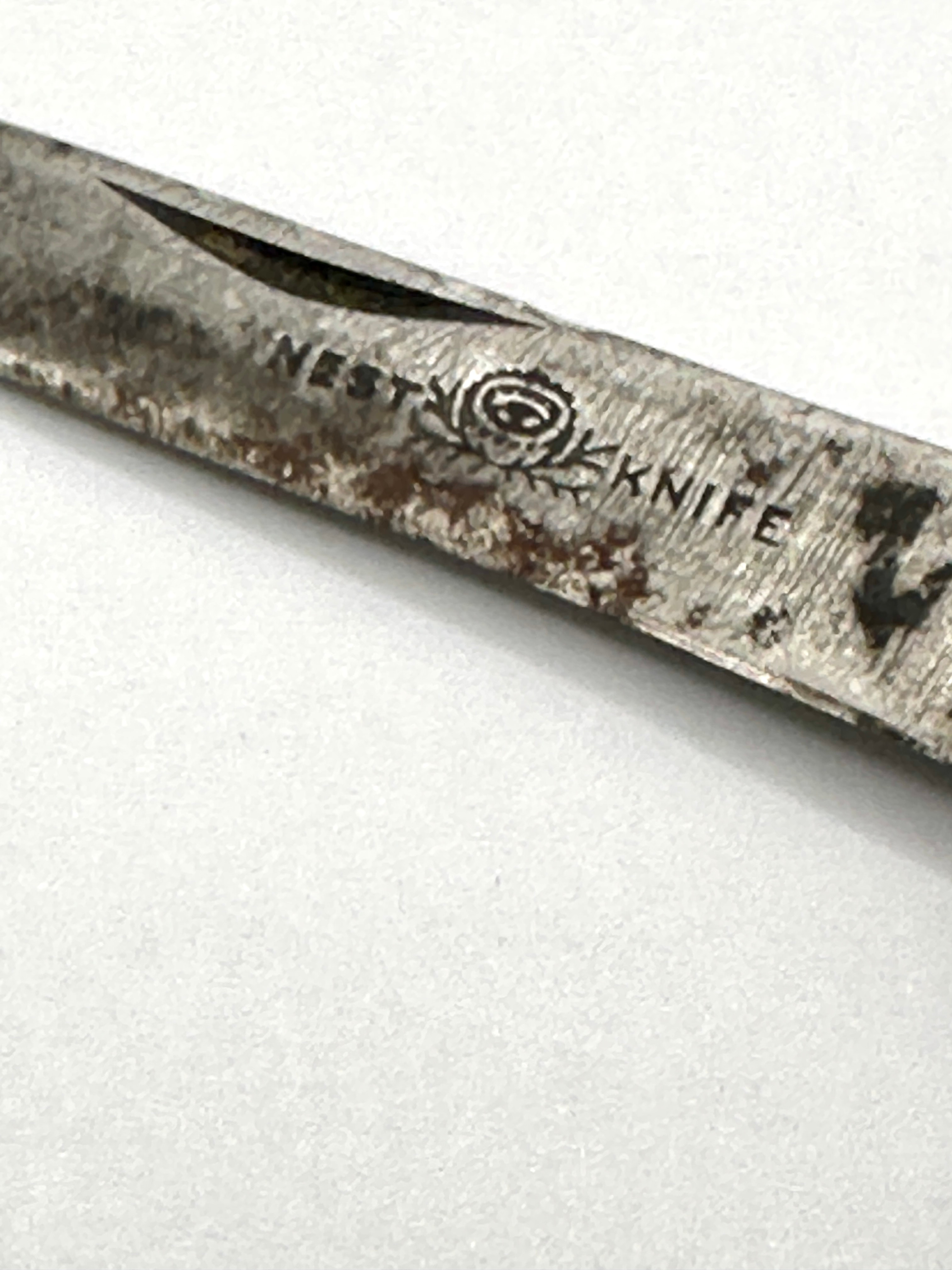 A vintage navaja folding knife, featuring a single metal blade and a dark, reddish-brown wooden handle secured with metal pins. A silver-toned metal bolster is present at the pivot end. The blade is visibly marked with the text “NEST” followed by a circular logo and then “KNIFE”.