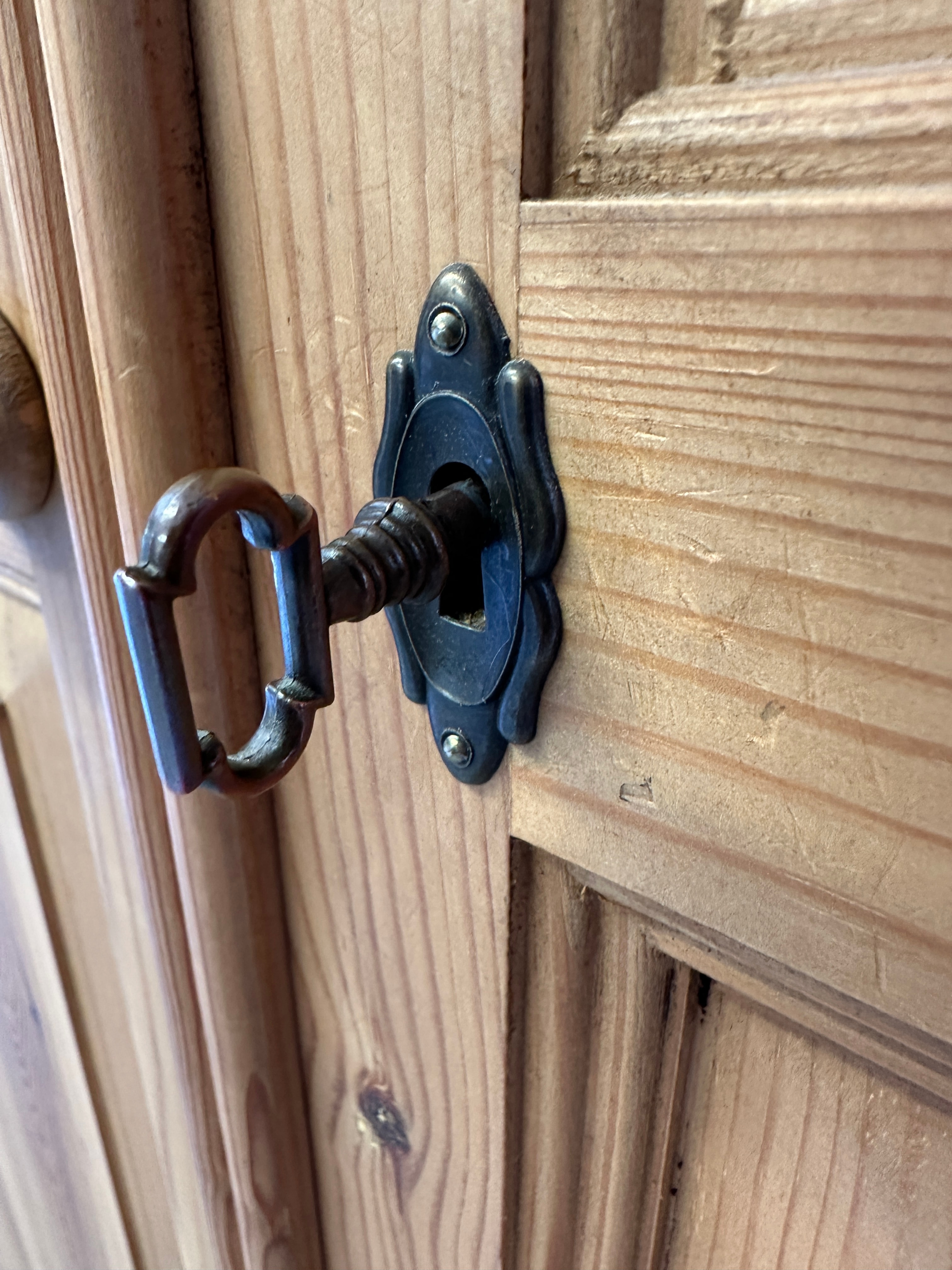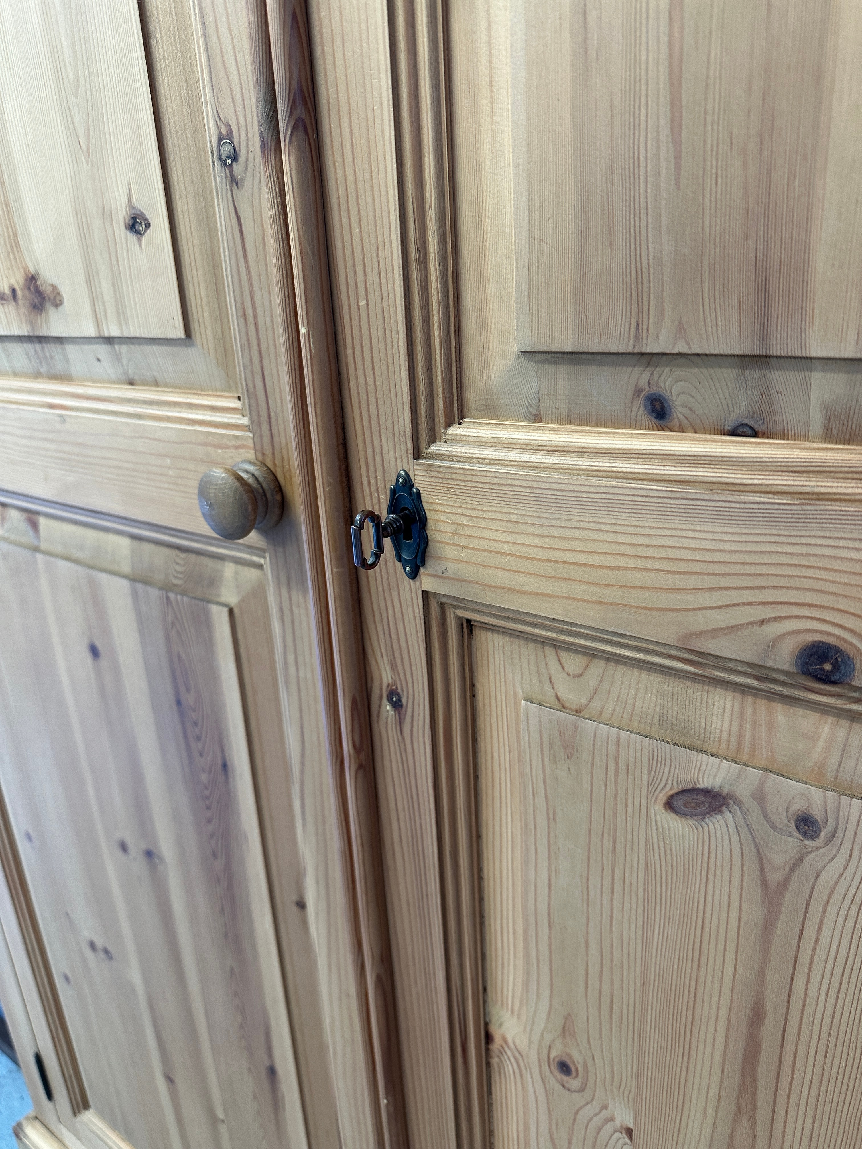 A pair of large, multi-section wooden wardrobes, constructed primarily of knotty pine with a light, natural wood finish both externally and internally. The design features a simple, rustic style with raised panel doors and unadorned top and base mouldings. Each unit presents a three-door configuration, with the pair forming a six-door exterior. Each interior section is fitted with a brass hanging rail. No visible text, maker’s marks, or other identifying inscriptions are discernible.