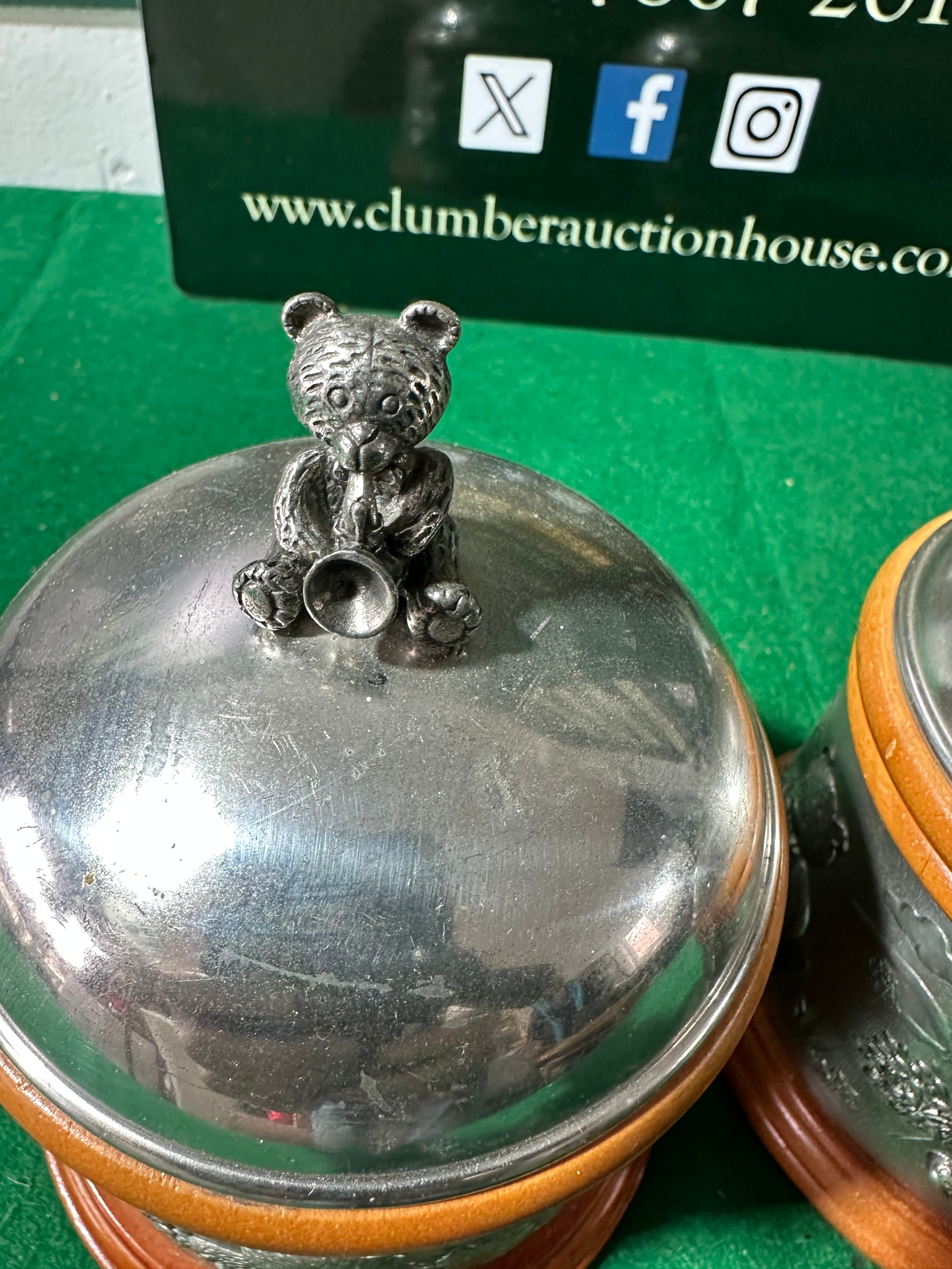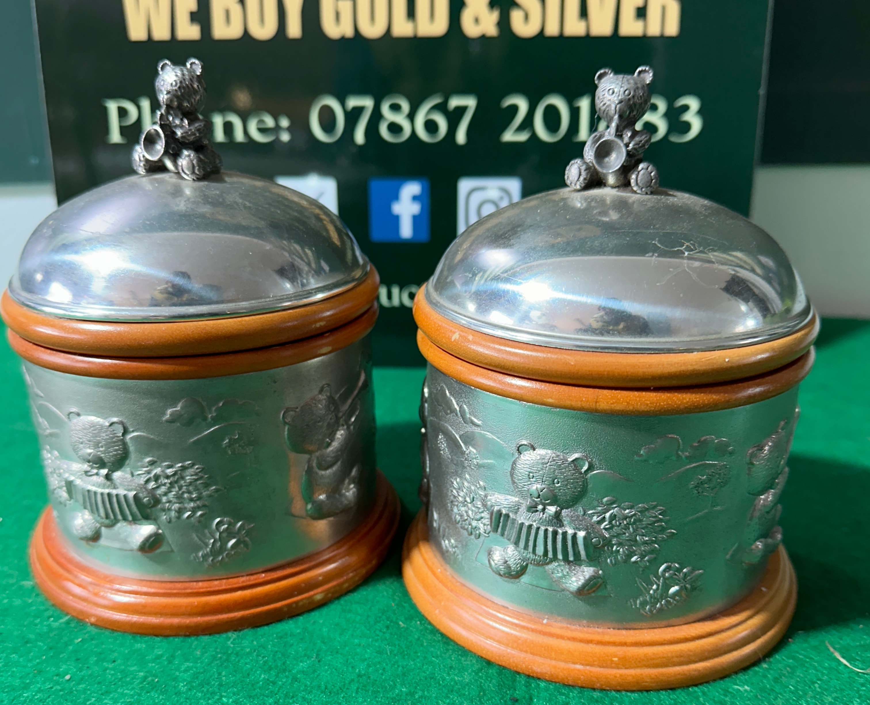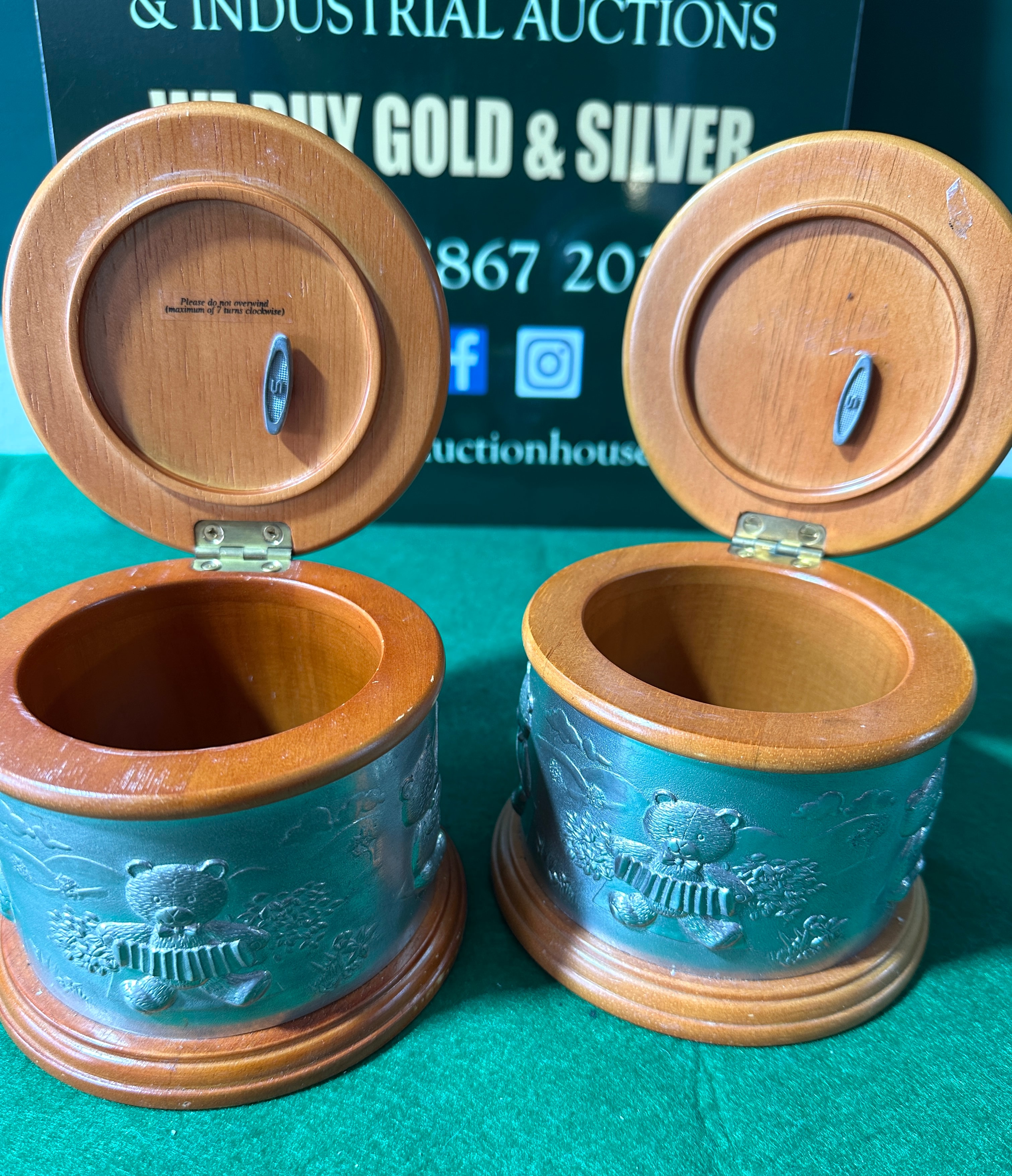 A pair of Royal Selangor ‘Teddy Bears’ Picnic’ pewter and wood music boxes. These matching contemporary musical boxes feature silver-toned pewter dome lids, each topped with a relief-moulded teddy bear holding a horn. The lids are hinged to a round, polished light-brown wooden body with a lower band of embossed pewter, depicting a continuous scene of teddy bears playing various musical instruments amidst foliage. The interiors are lined with dark felt, and small musical mechanisms are visible on the underside of each lid. Visible text on the inside of the lids reads: “Please do not overwind” and “(Exclusively for San Francisco Music Box Co.)”.