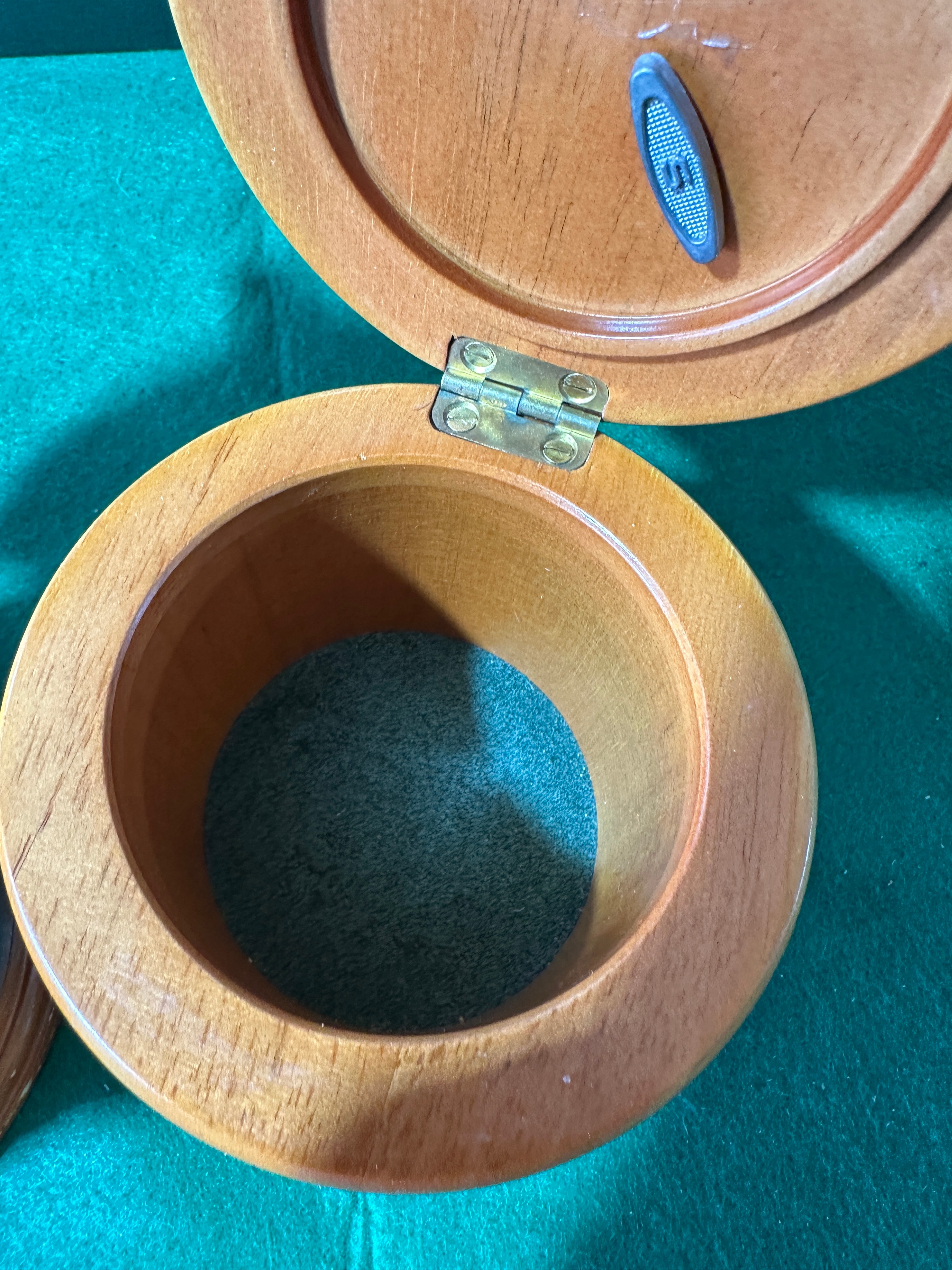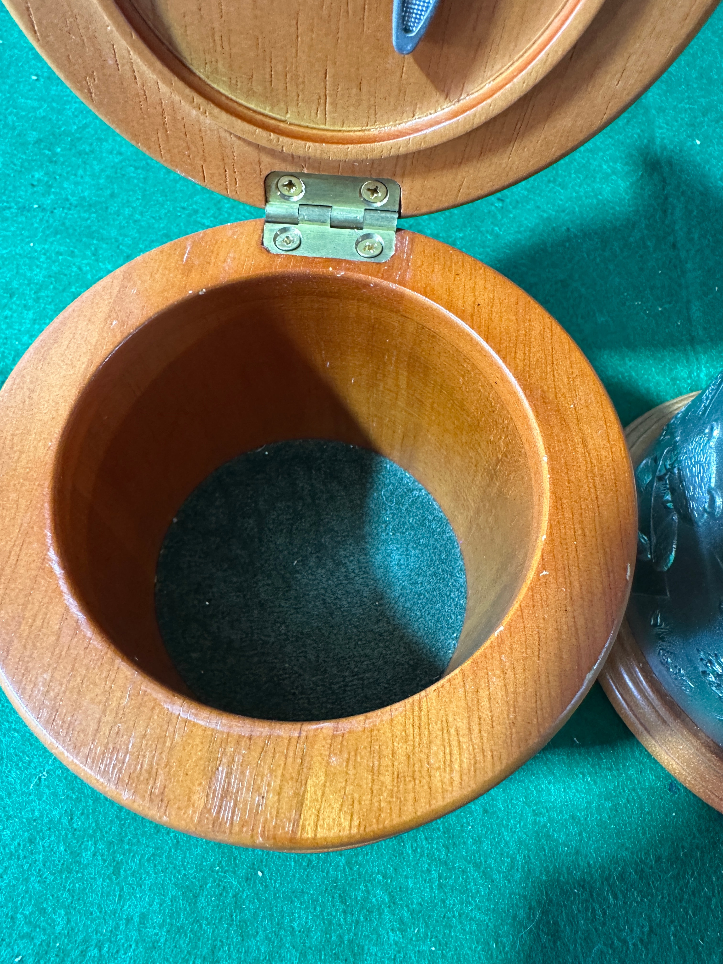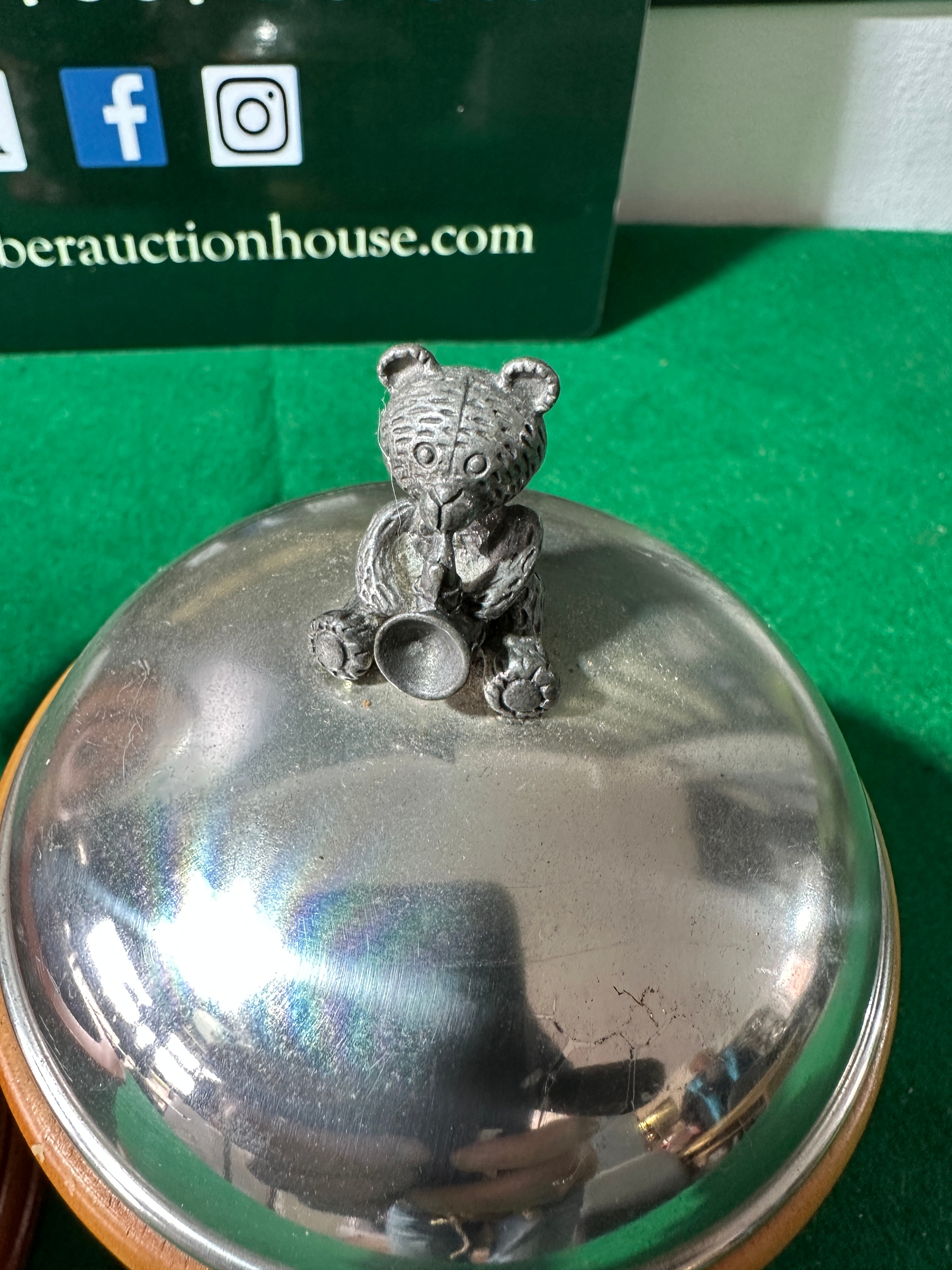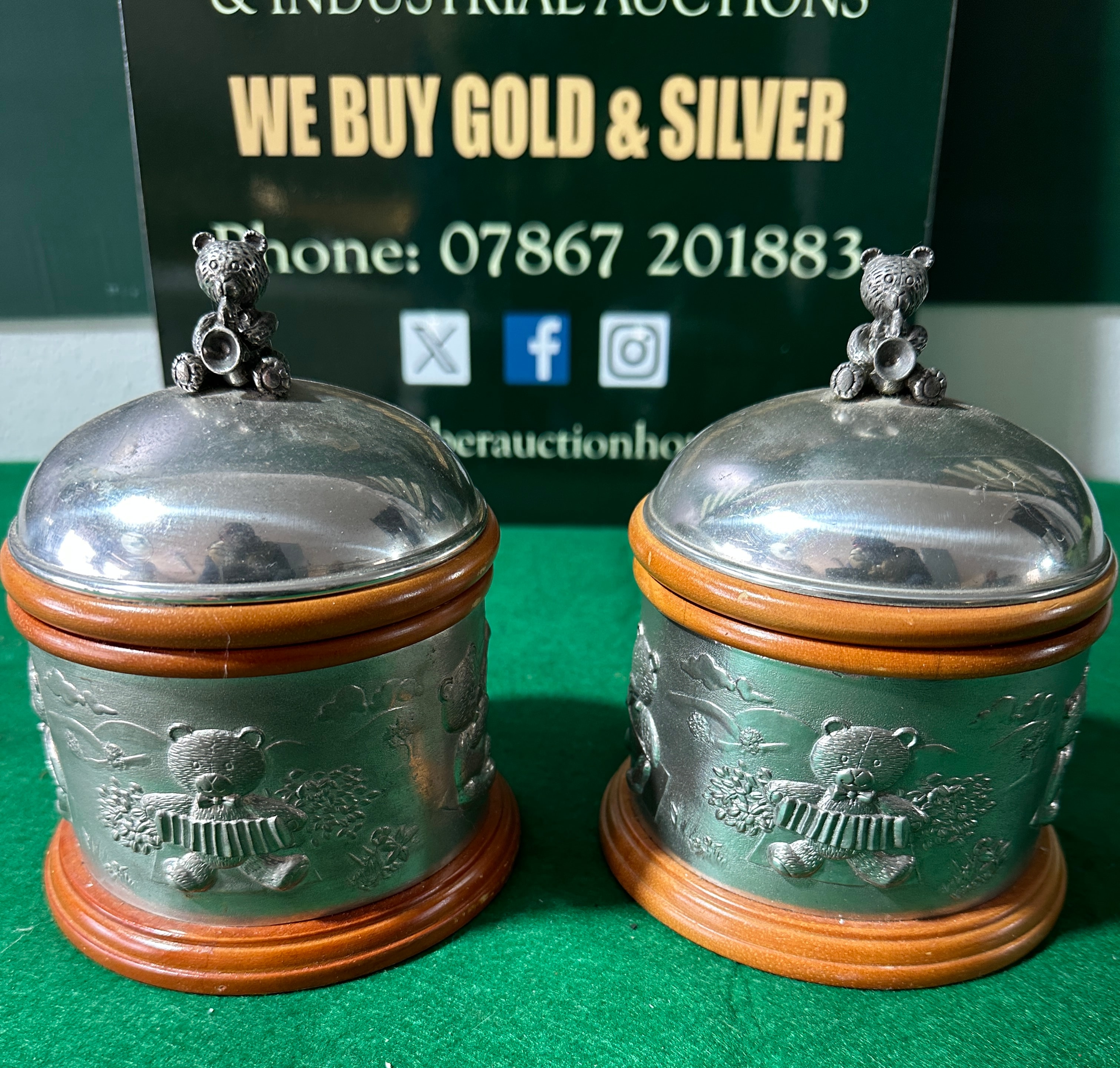 A pair of Royal Selangor ‘Teddy Bears’ Picnic’ pewter and wood music boxes. These matching contemporary musical boxes feature silver-toned pewter dome lids, each topped with a relief-moulded teddy bear holding a horn. The lids are hinged to a round, polished light-brown wooden body with a lower band of embossed pewter, depicting a continuous scene of teddy bears playing various musical instruments amidst foliage. The interiors are lined with dark felt, and small musical mechanisms are visible on the underside of each lid. Visible text on the inside of the lids reads: “Please do not overwind” and “(Exclusively for San Francisco Music Box Co.)”.