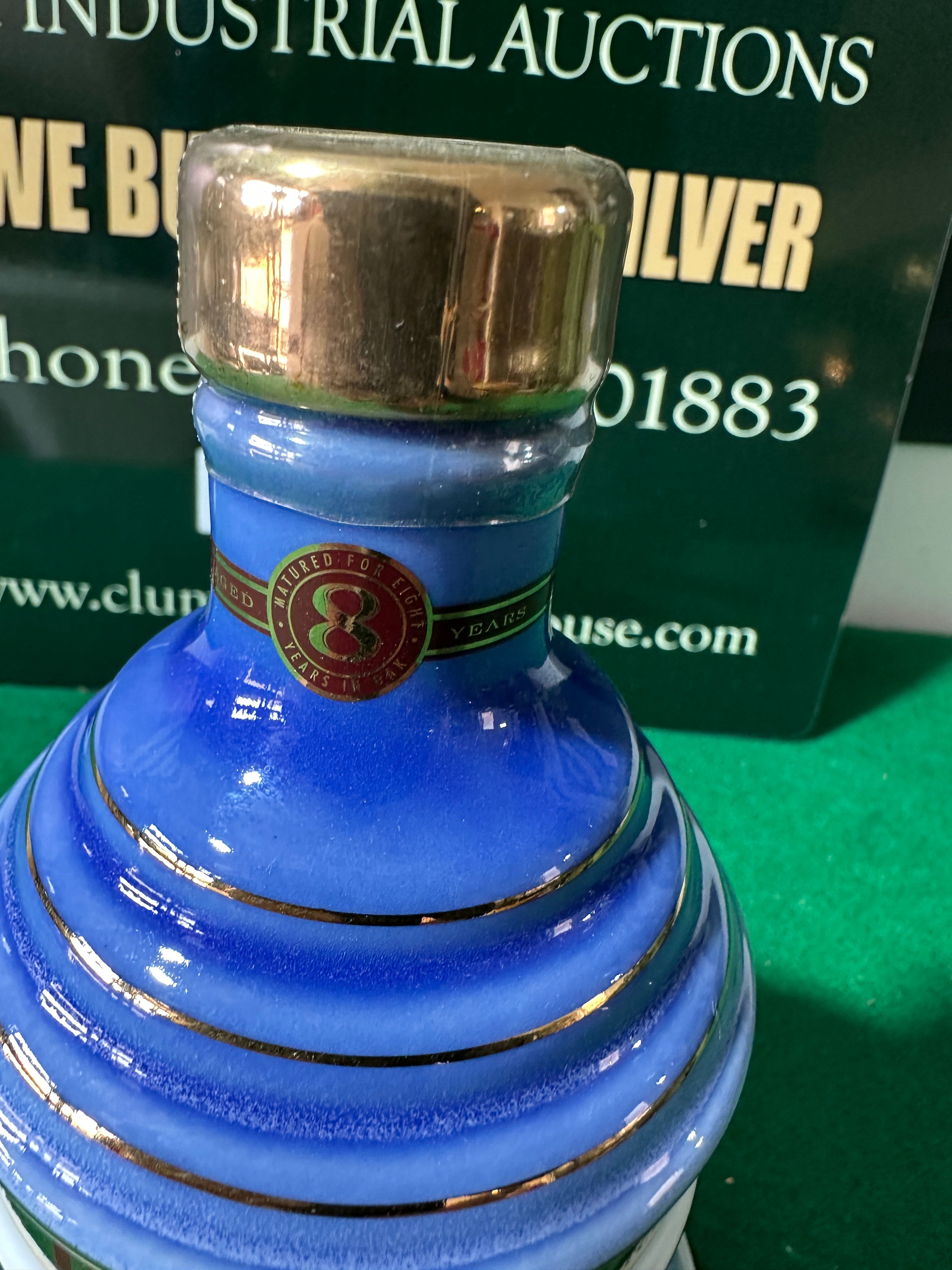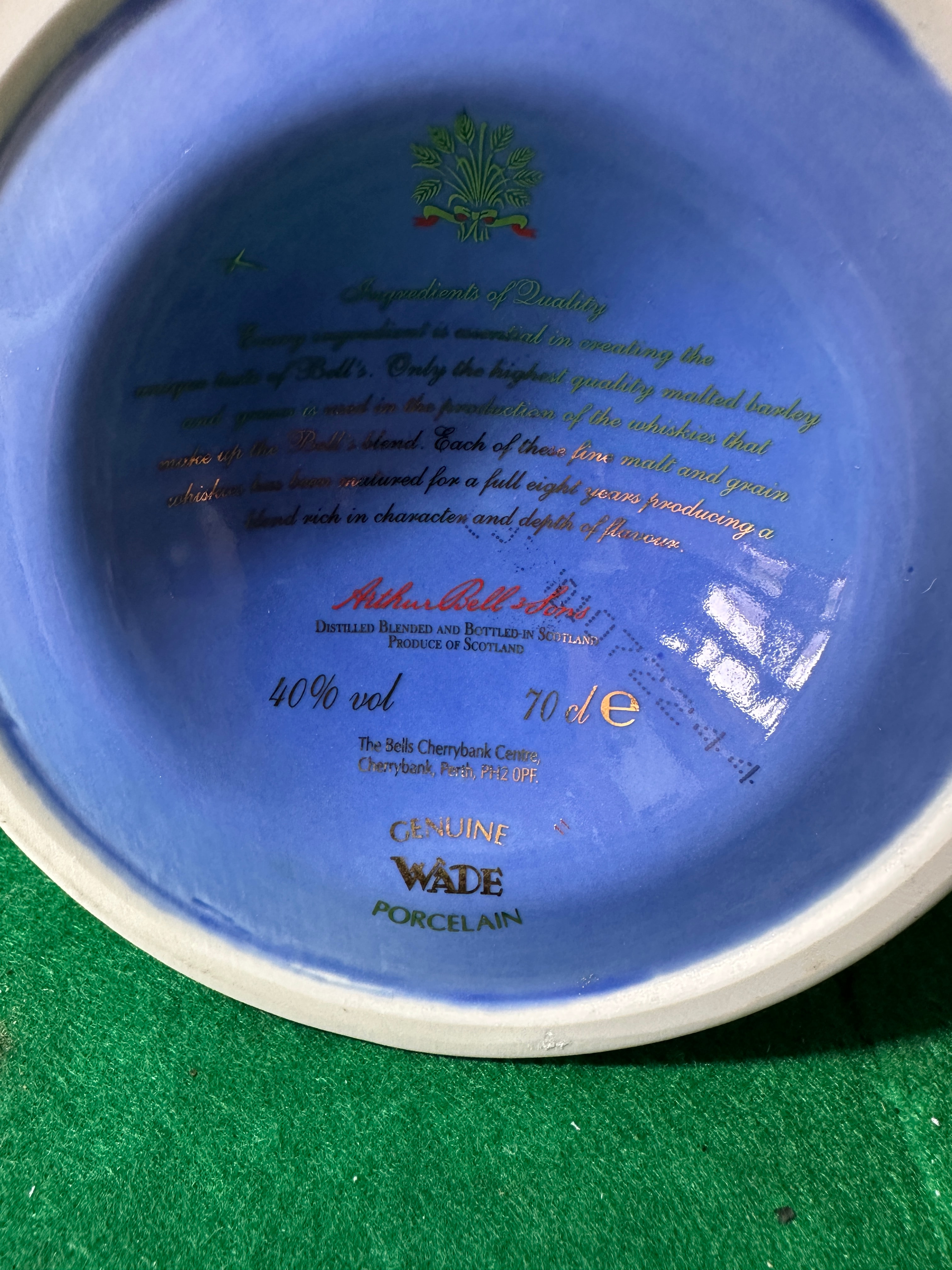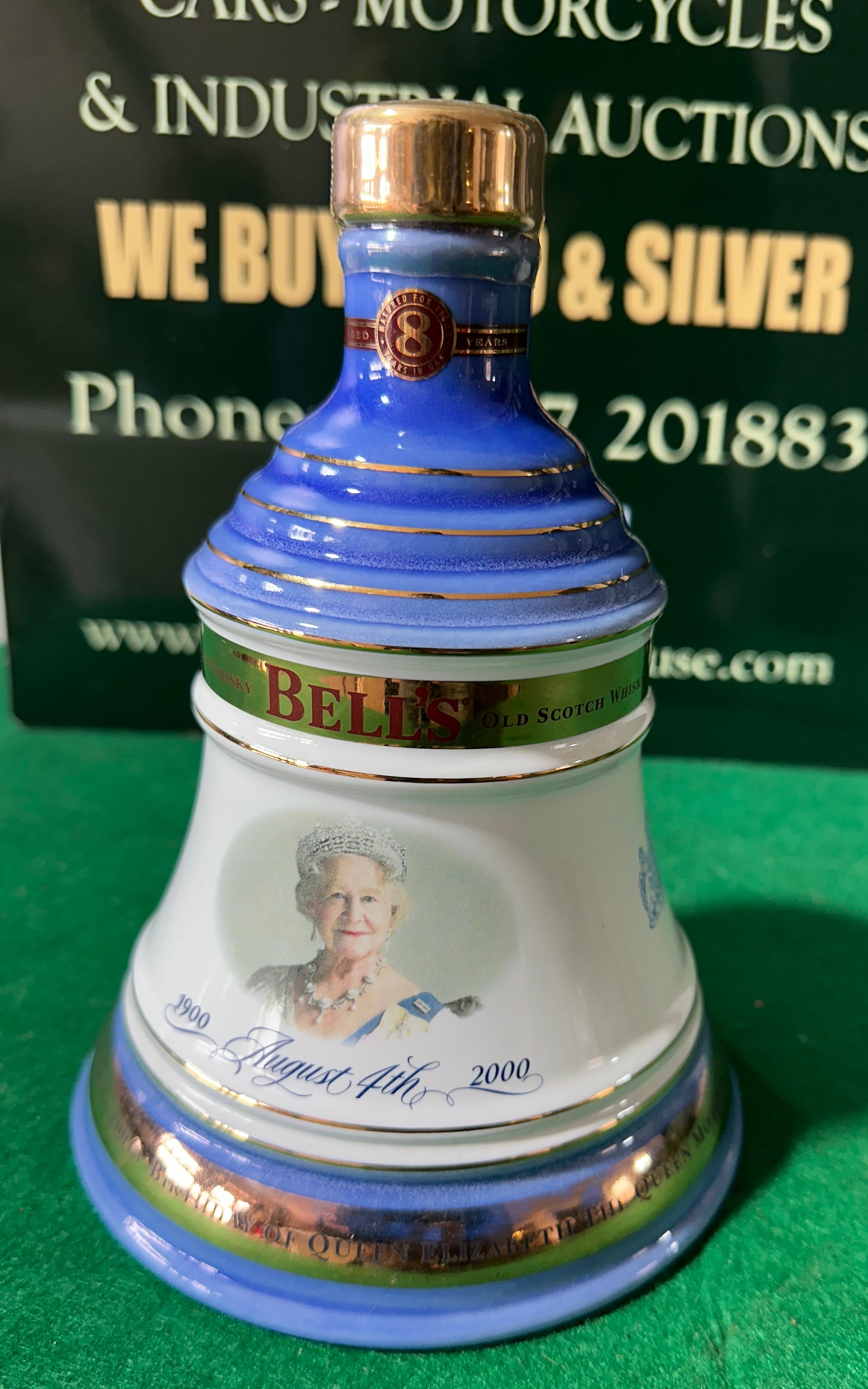 A Bell’s Queen Mother 100th Birthday 8 Year Old Blended Scotch Whisky Wade Porcelain Decanter, dated 2000. This bell-shaped commemorative ceramic decanter is made of genuine Wade Porcelain, predominantly glazed in cobalt blue and white with extensive gold accents. The front features a color portrait of Queen Elizabeth The Queen Mother, flanked by “1900 August 4th 2000” and inscribed with “HM QUEEN ELIZABETH THE QUEEN MOTHER.” The body displays “BELLS” and “OLD SCOTCH WHISKY,” while a red label on the neck indicates “MATURED FOR EIGHT YEARS.” The interior base contains gold text detailing “Ingredients of Quality,” “Arthur Bell & Sons,” “DISTILLED BLENDED AND BOTTLED IN SCOTLAND,” “PRODUCT OF SCOTLAND,” “40% vol,” “70 cl e,” and the address “The Bells Cherrybank Centre, Cherrybank, Perth PH2 0PE.”