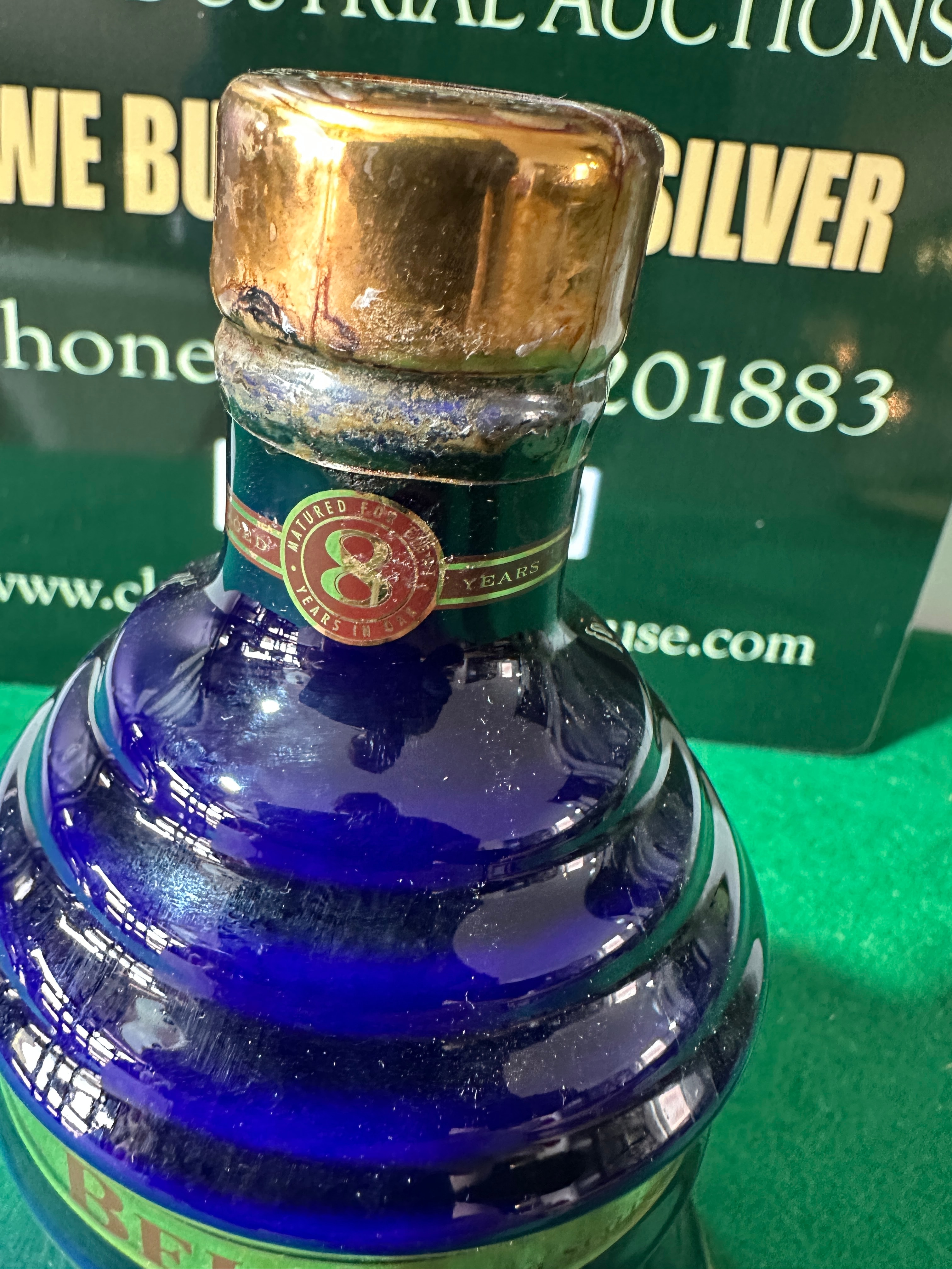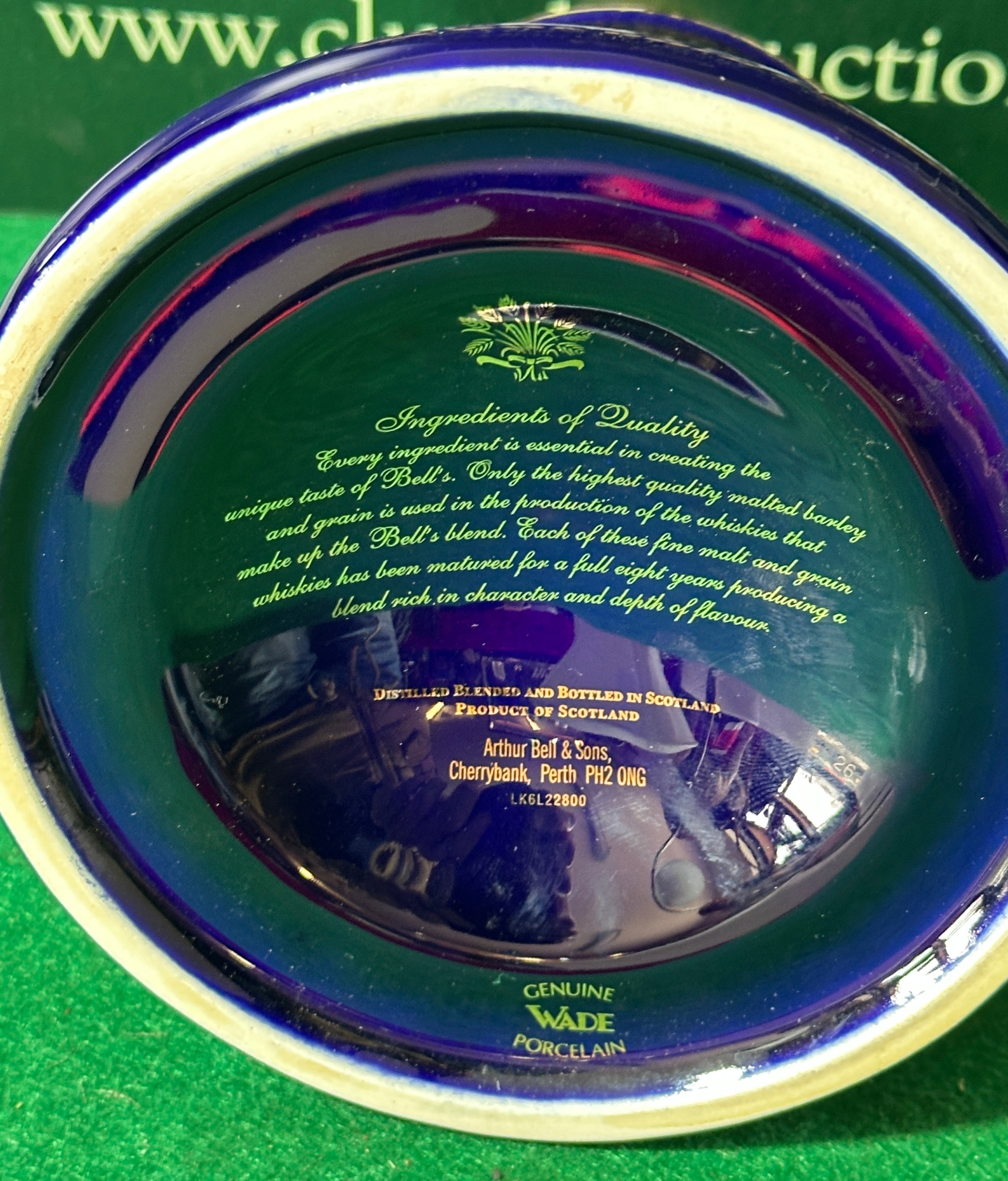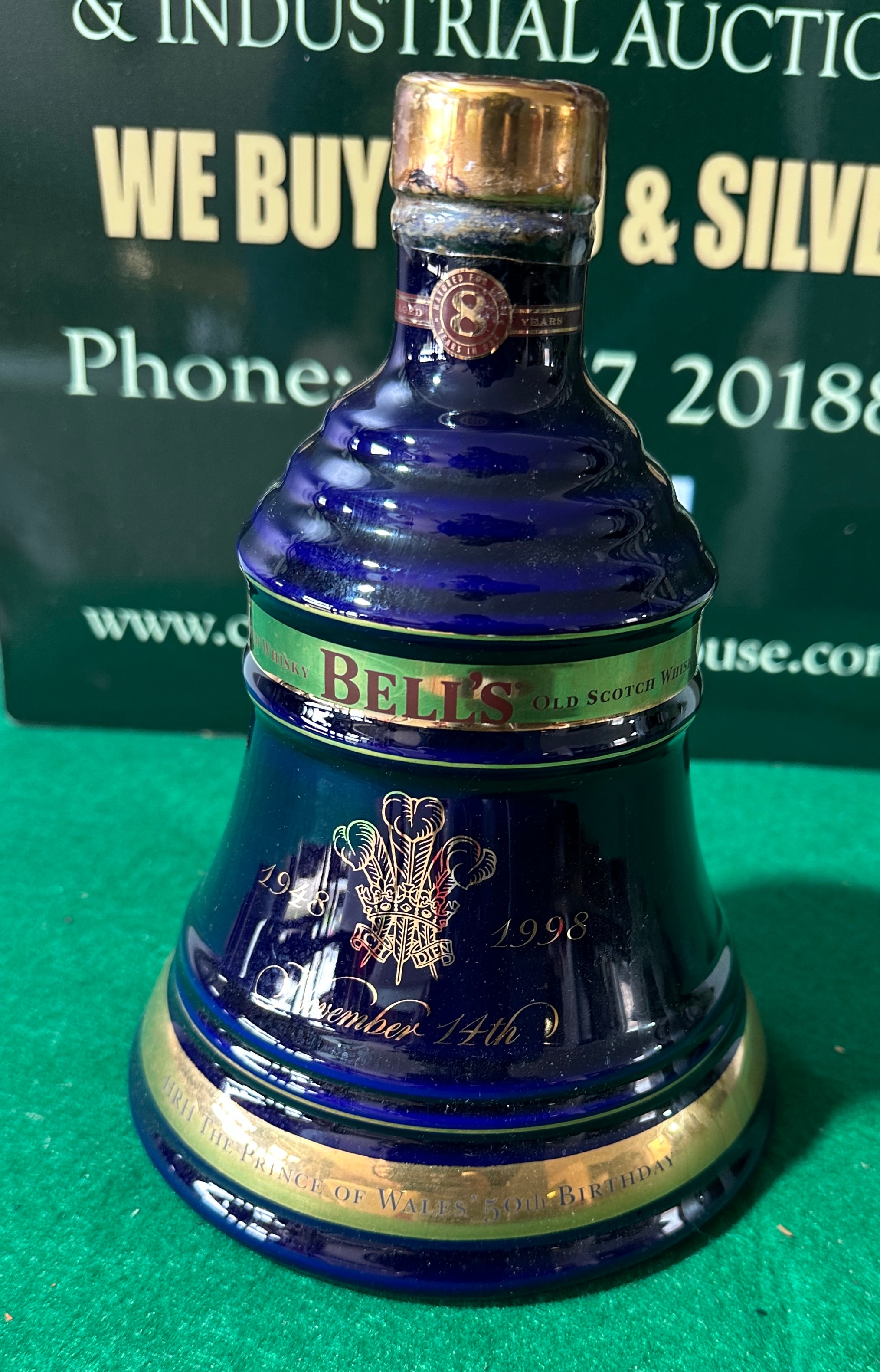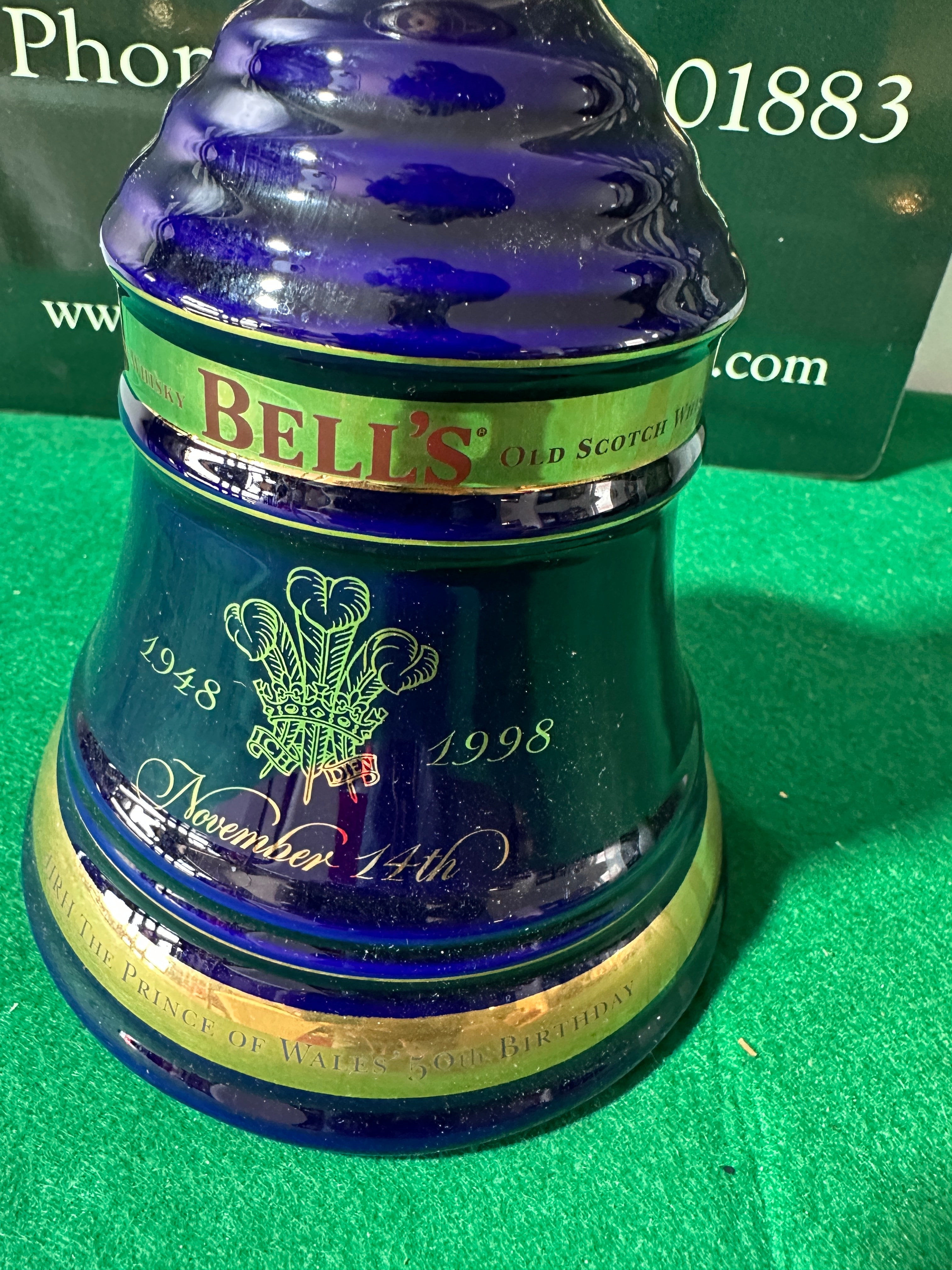 A commemorative Bell’s Prince of Wales 50th Birthday 1948-1998 8 Year Old Scotch Whisky decanter, crafted from genuine Wade porcelain. This bell-shaped decanter features a deep cobalt blue glaze, richly embellished with gold and green gilded details. Produced in 1998, it prominently displays the markings “1948 1998”, “November 14th”, and “TO H.R.H. THE PRINCE OF WALES 50th BIRTHDAY” alongside the Royal three feathers emblem. Further labels indicate the whisky was “MATURED FOR 8 YEARS”. The base is marked “GENUINE WADE PORCELAIN”, “Arthur Bell & Sons”, and “PRODUCT OF SCOTLAND”, with a batch number LK6L22800.