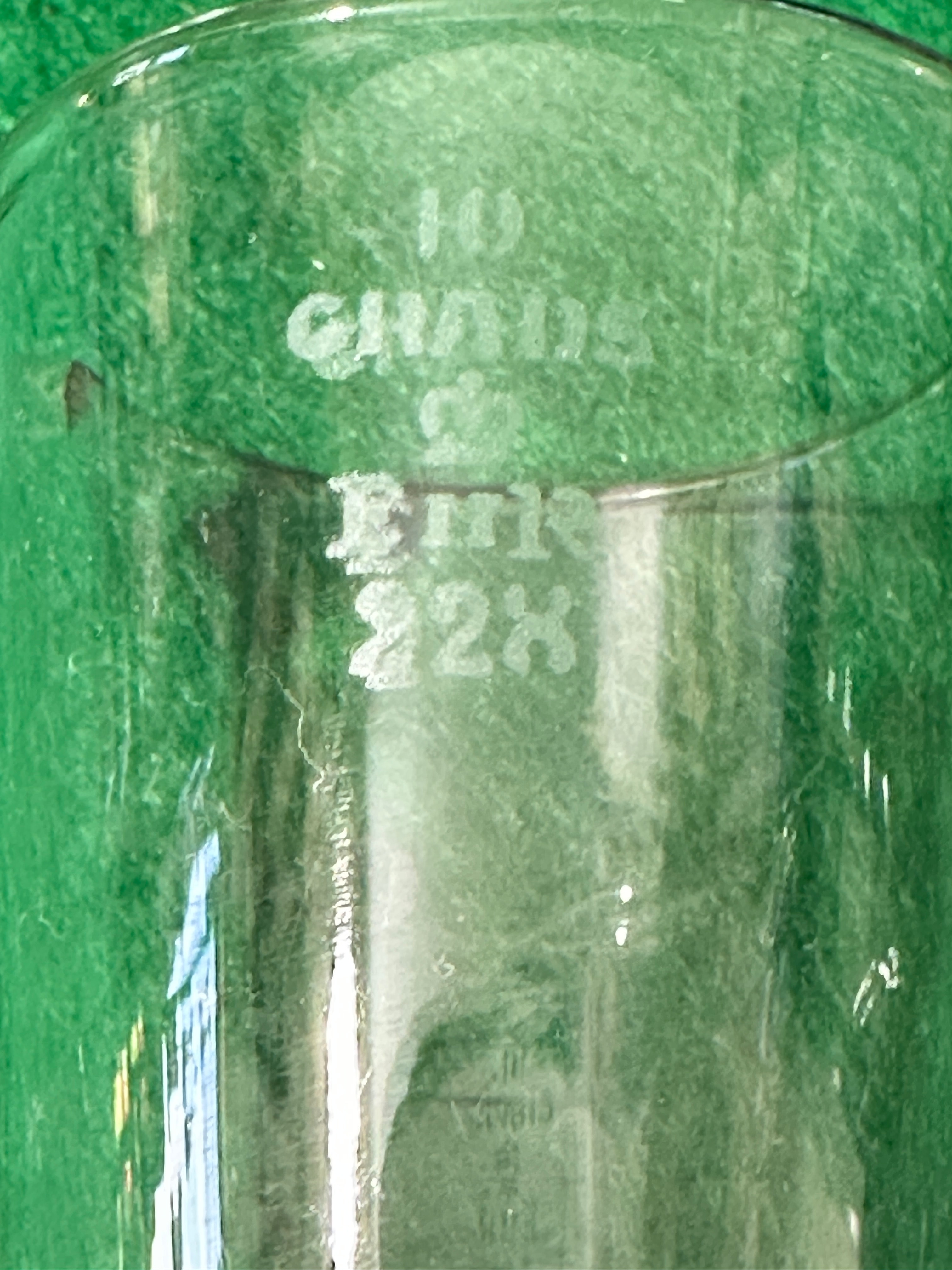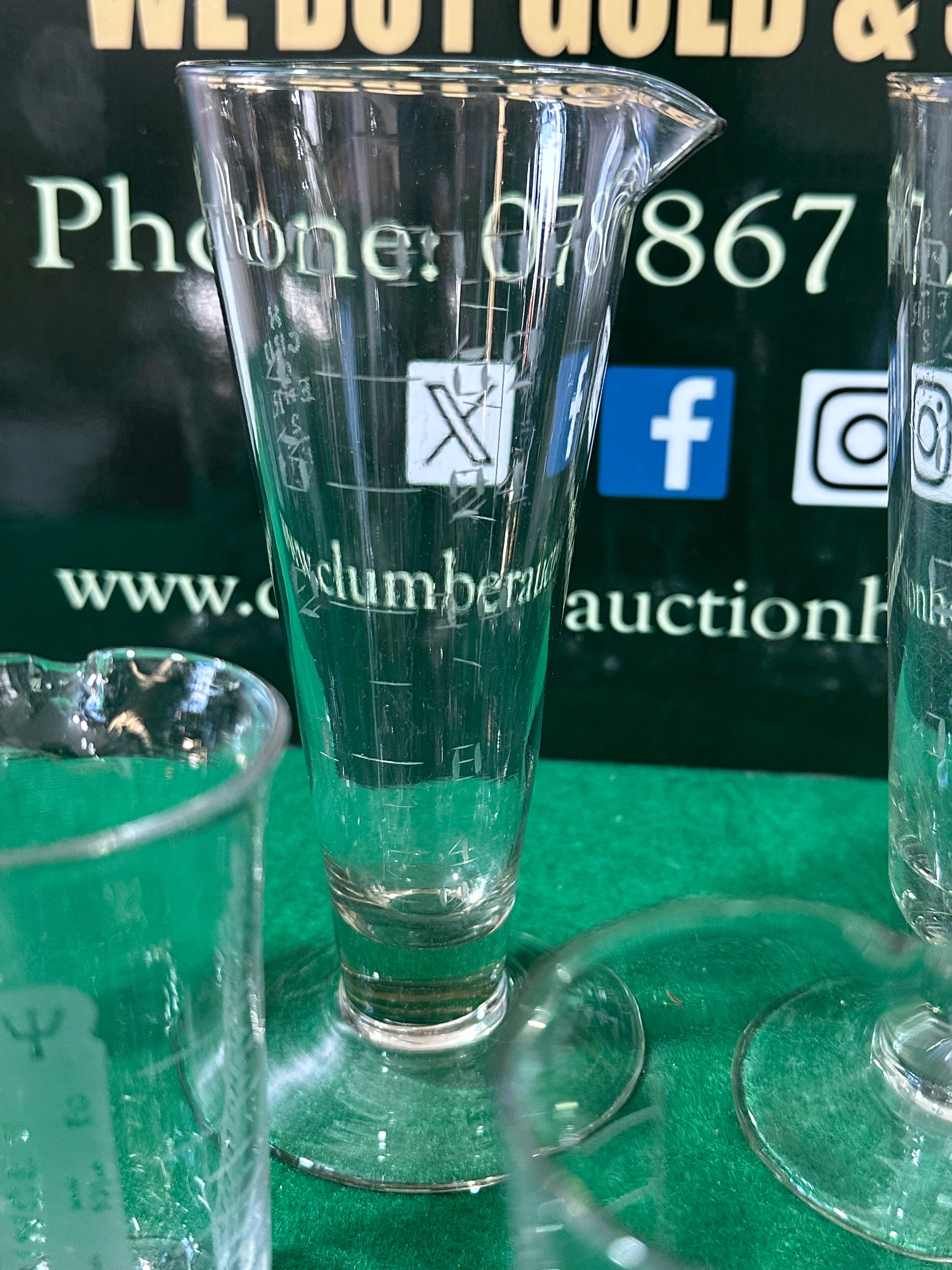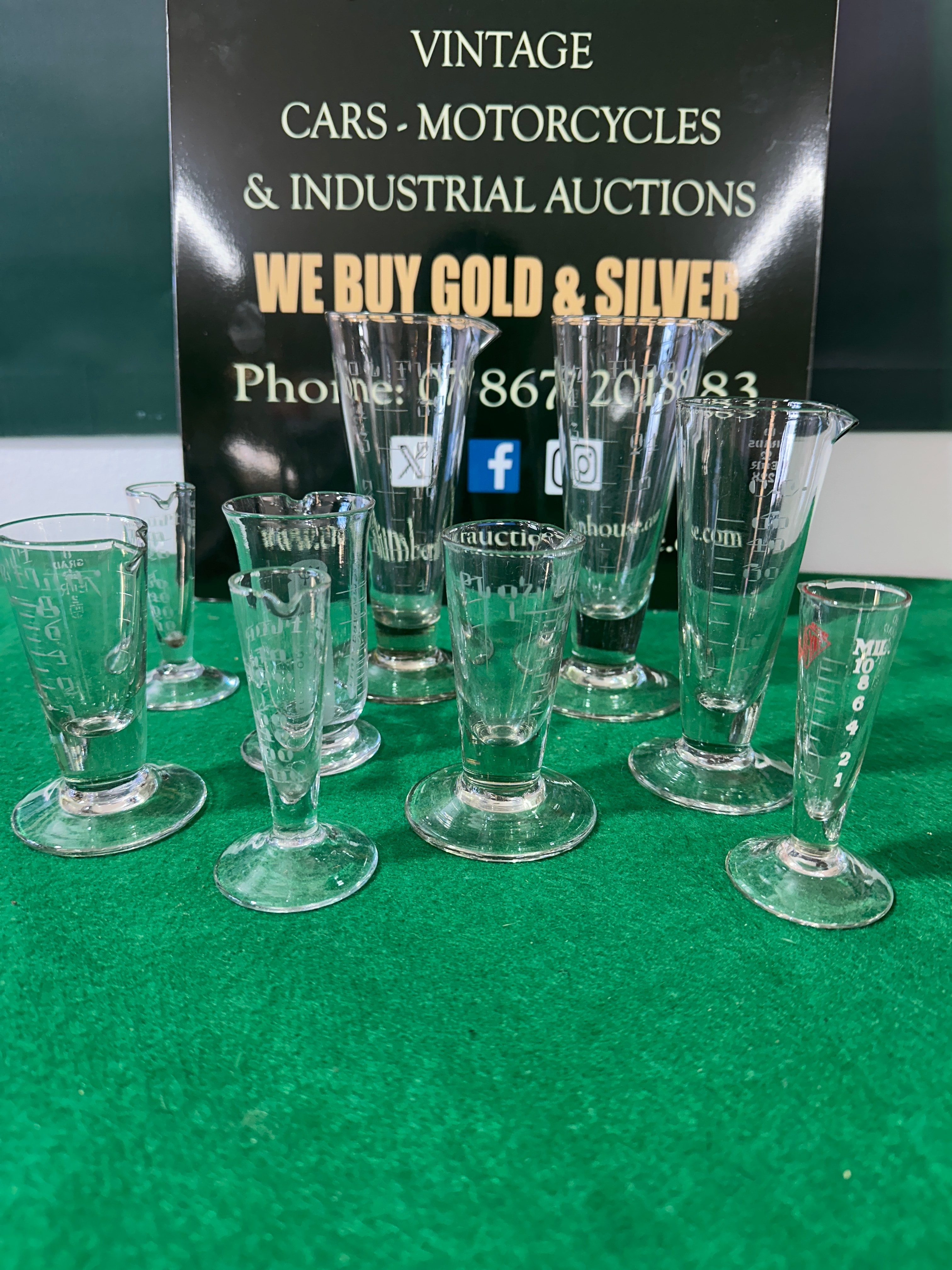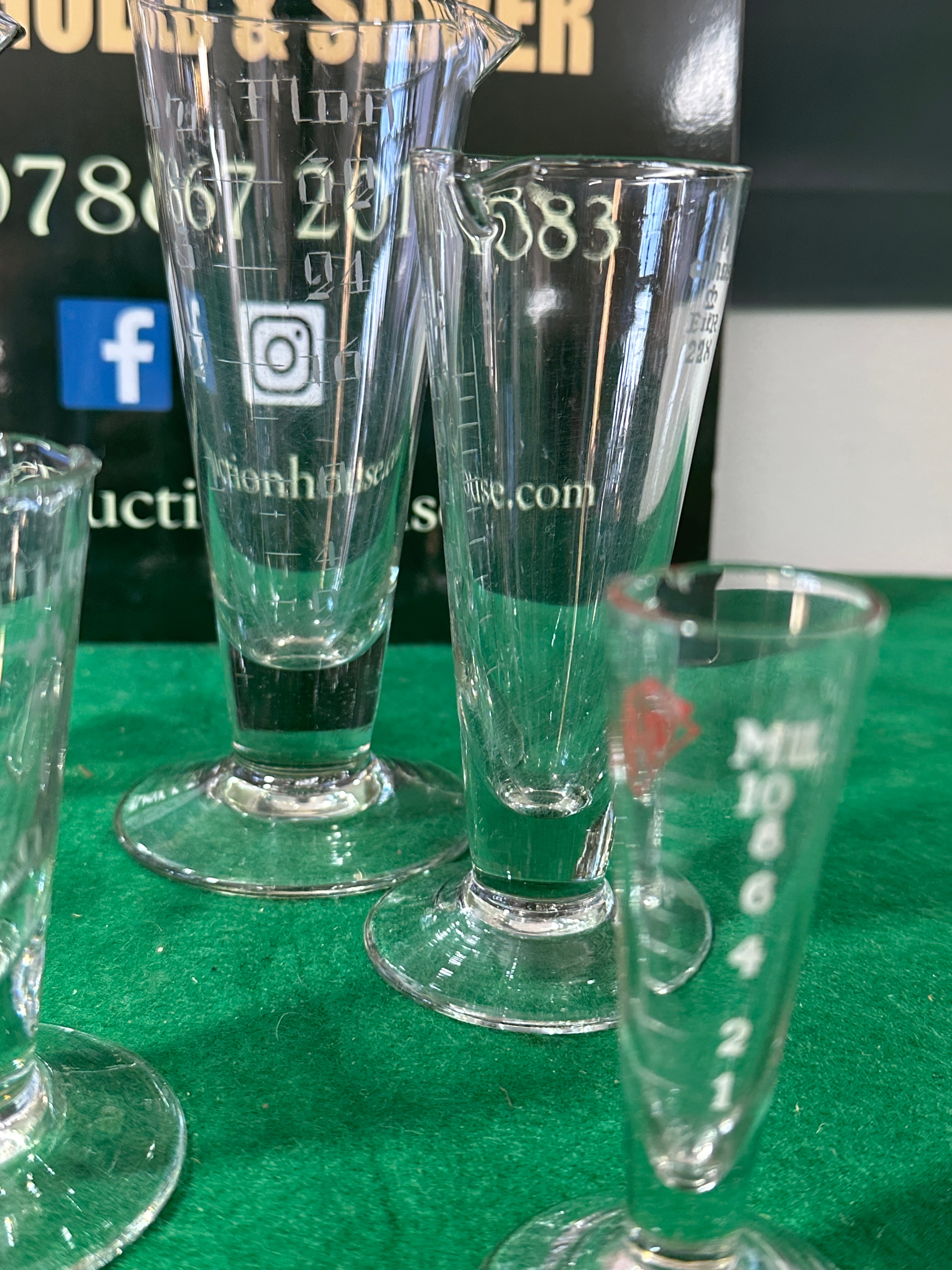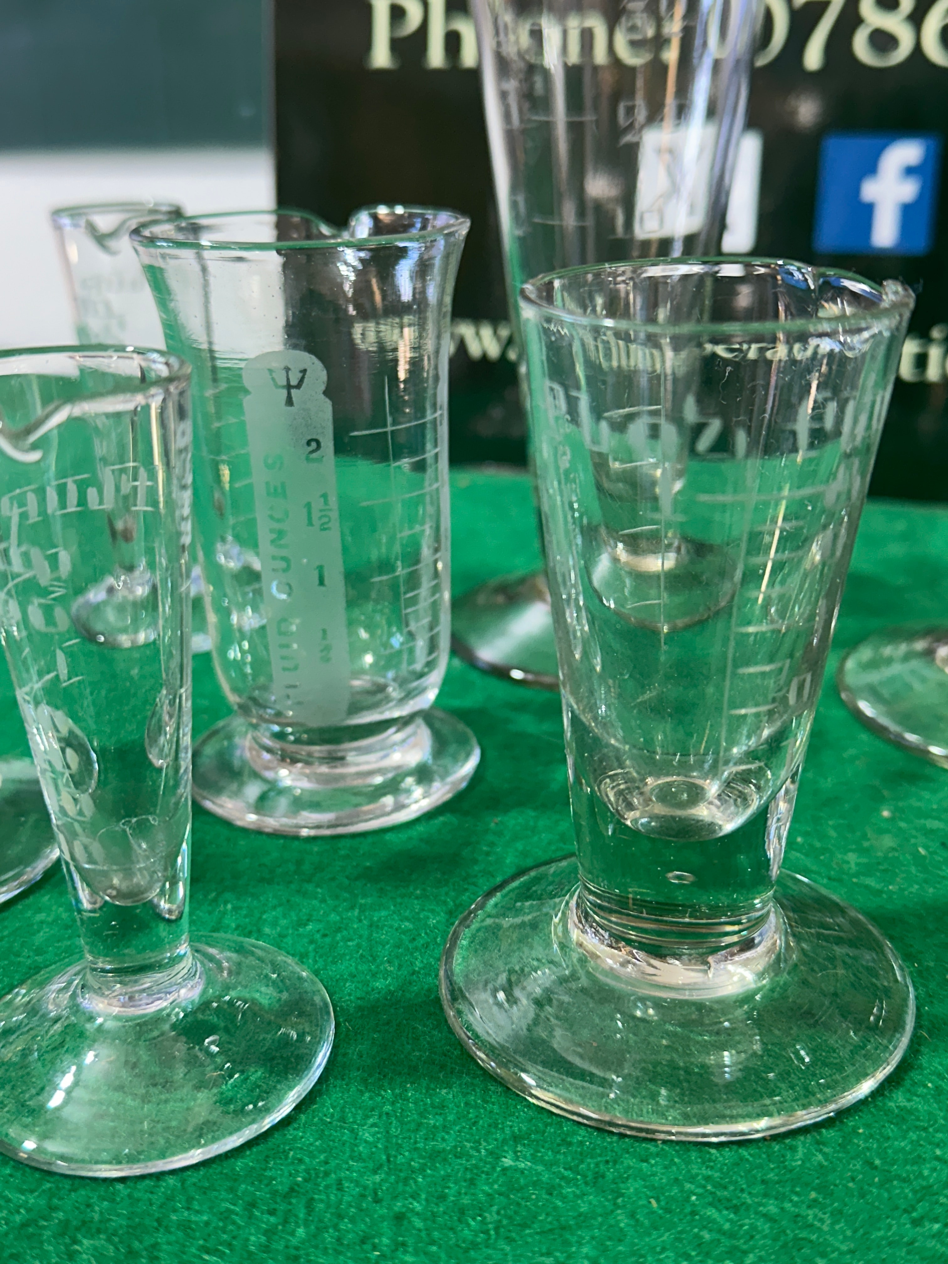 A collection of approximately ten clear glass measuring vessels, predominantly of various sizes and shapes. Several feature a pedestal base and pouring spout. These utilitarian items are etched with graduated scales, including clear markings for “MIL” (milliliters), “DRACHMS”, “FLUID OUNCES”, and “GRANS” (grains), accompanied by numerical values such as “10”, “15”, “30”, “60”, “120”, and “1”, “2”, “3”, “4”. One vessel is etched with “10 GRANS”, “FIK”, and “228”. Another displays a stylized ‘P’ or Greek psi (Ψ) symbol, often associated with pharmacy.