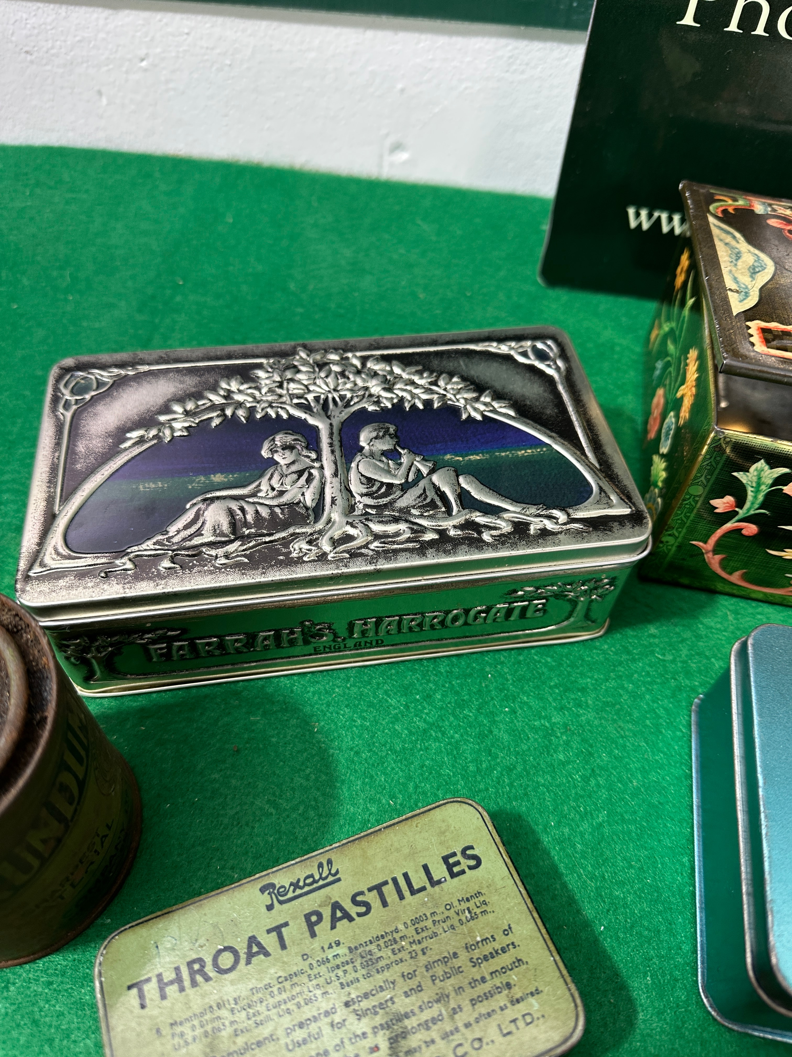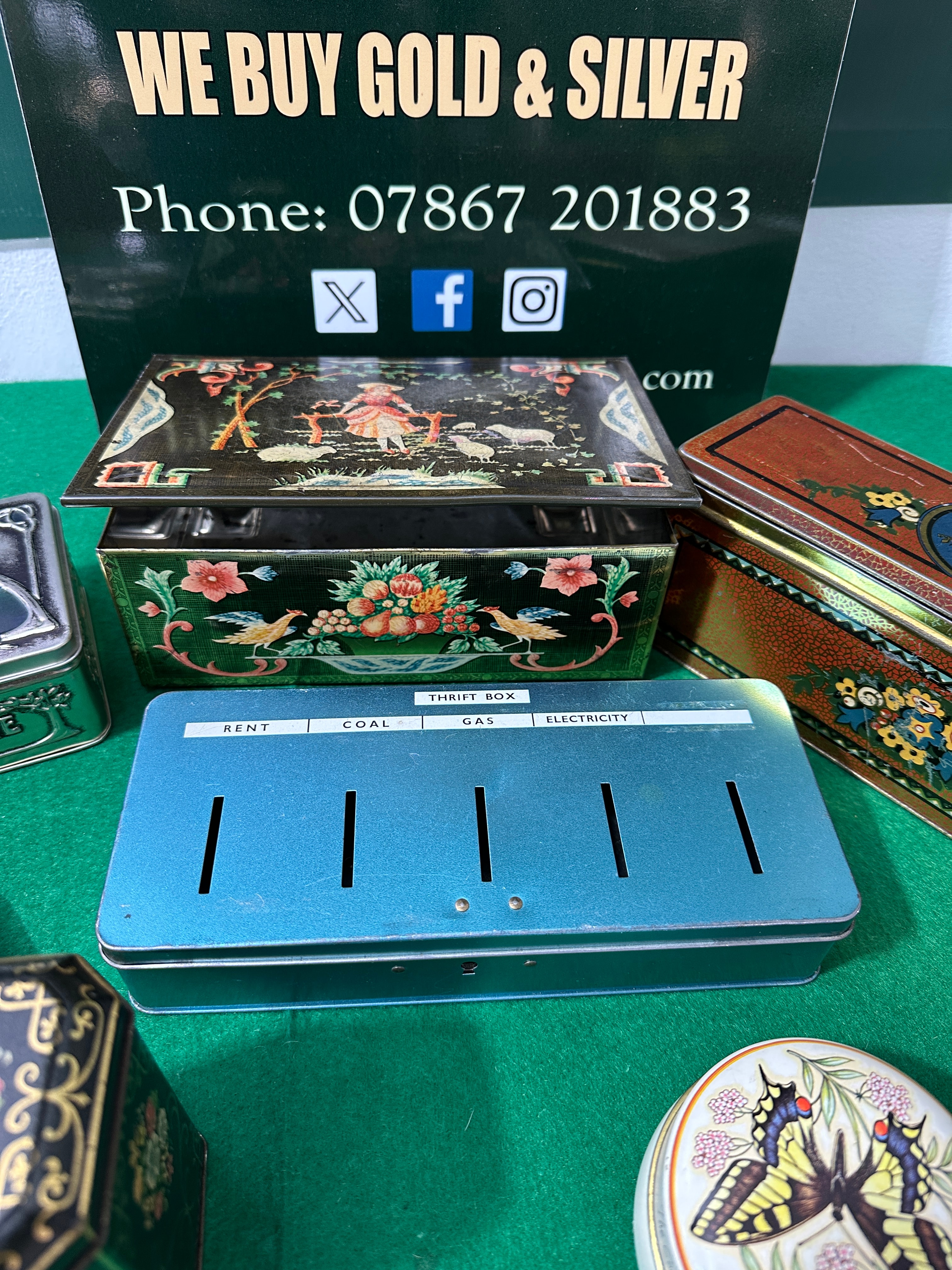 This lot comprises approximately nine assorted vintage and antique metal tins, predominantly tin, encompassing a variety of styles and functions. Included is an Art Nouveau-style embossed tin labeled “FARRAH’S HARROGATE ENGLAND.” The collection also features several decorative tins with chinoiserie, oriental floral, and bird motifs, one of which is specifically marked “C•W•S CREAM CRACKERS CRUMPSALL – CARDIFF” on its interior lid. A utilitarian blue “THRIFT BOX” is present, featuring labeled slots for “RENT,” “COAL,” “GAS,” and “ELECTRICITY.” Further items include a small “Rexall THROAT PASTILLES” tin from “UNITED-REXALL DRUG CO., LTD. NOTTINGHAM, MADE IN ENGLAND,” a cylindrical “CARBORUNDUM” tin, and a more modern round tin with a butterfly design from “The Countryside Collection by Bradshaw-Bowman.”