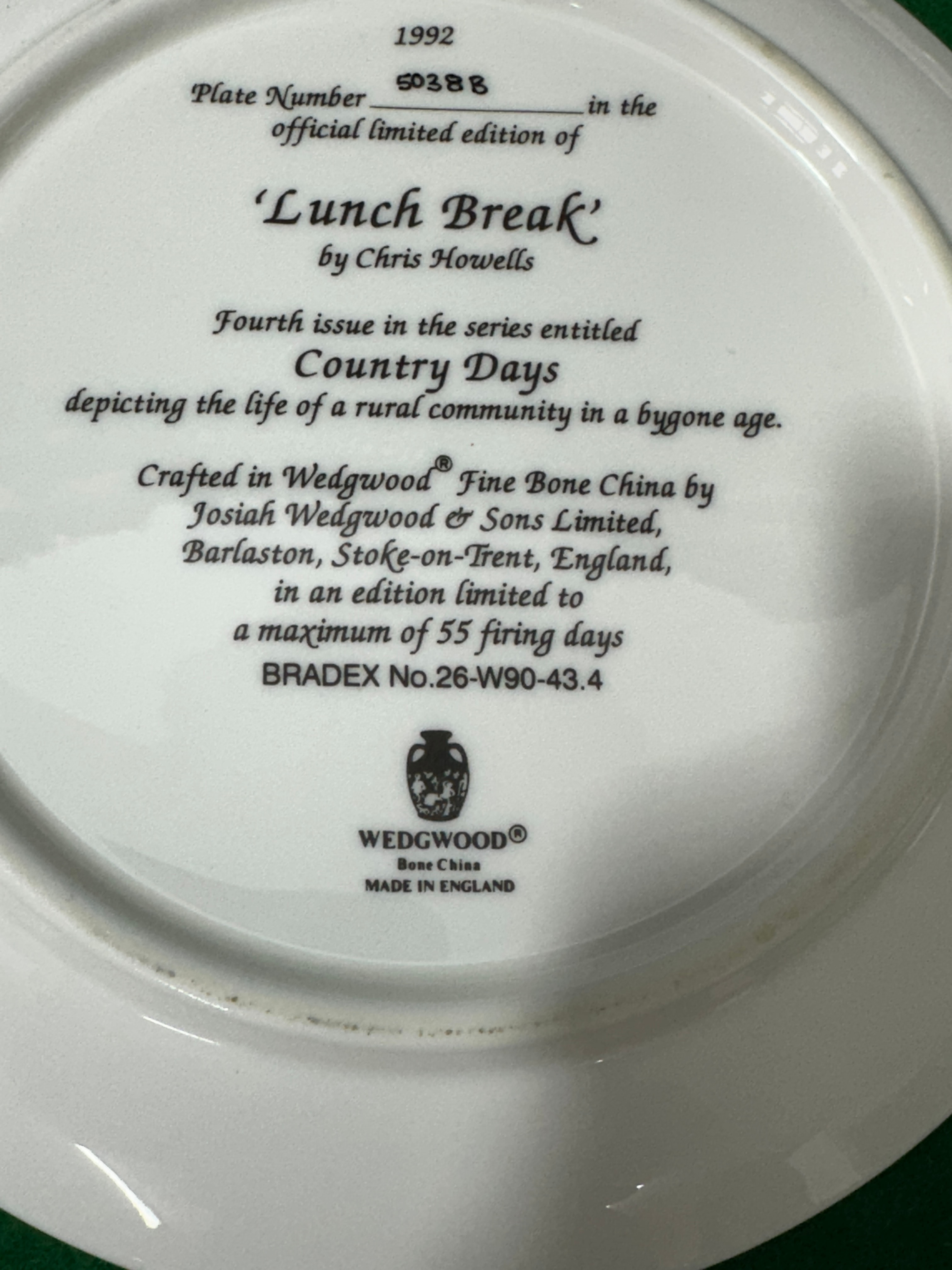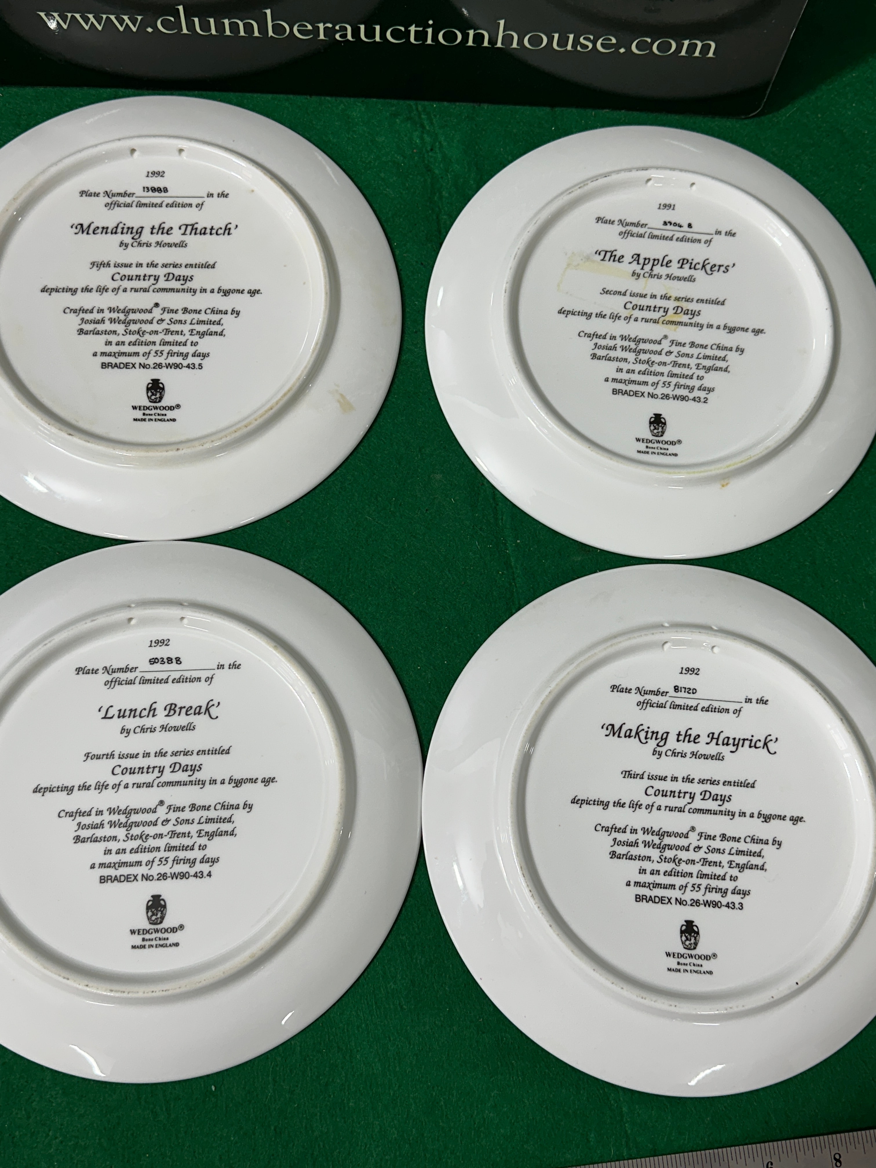 A set of four Wedgwood ‘Country Days’ series limited edition collector plates, designed by artist Chris Howells. Crafted from Fine Bone China and produced in England in 1991 and 1992, each plate depicts a detailed, idyllic rural landscape scene illustrating life in a bygone age. The individual plate titles include “Lunch Break,” “Mending the Thatch,” “The Apple Pickers,” and “Making the Hayrick.” The reverse of each plate is extensively marked with series issue numbers (Third, Fourth, Fifth, Seventh), unique plate numbers (e.g., 5D38B), BRADEX numbers (e.g., 26-W90-43.4), and manufacturer details confirming production by Josiah Wedgwood & Sons Limited in Barlaston, Stoke-on-Trent, England, as an official limited edition restricted to a maximum of 55 firing days.