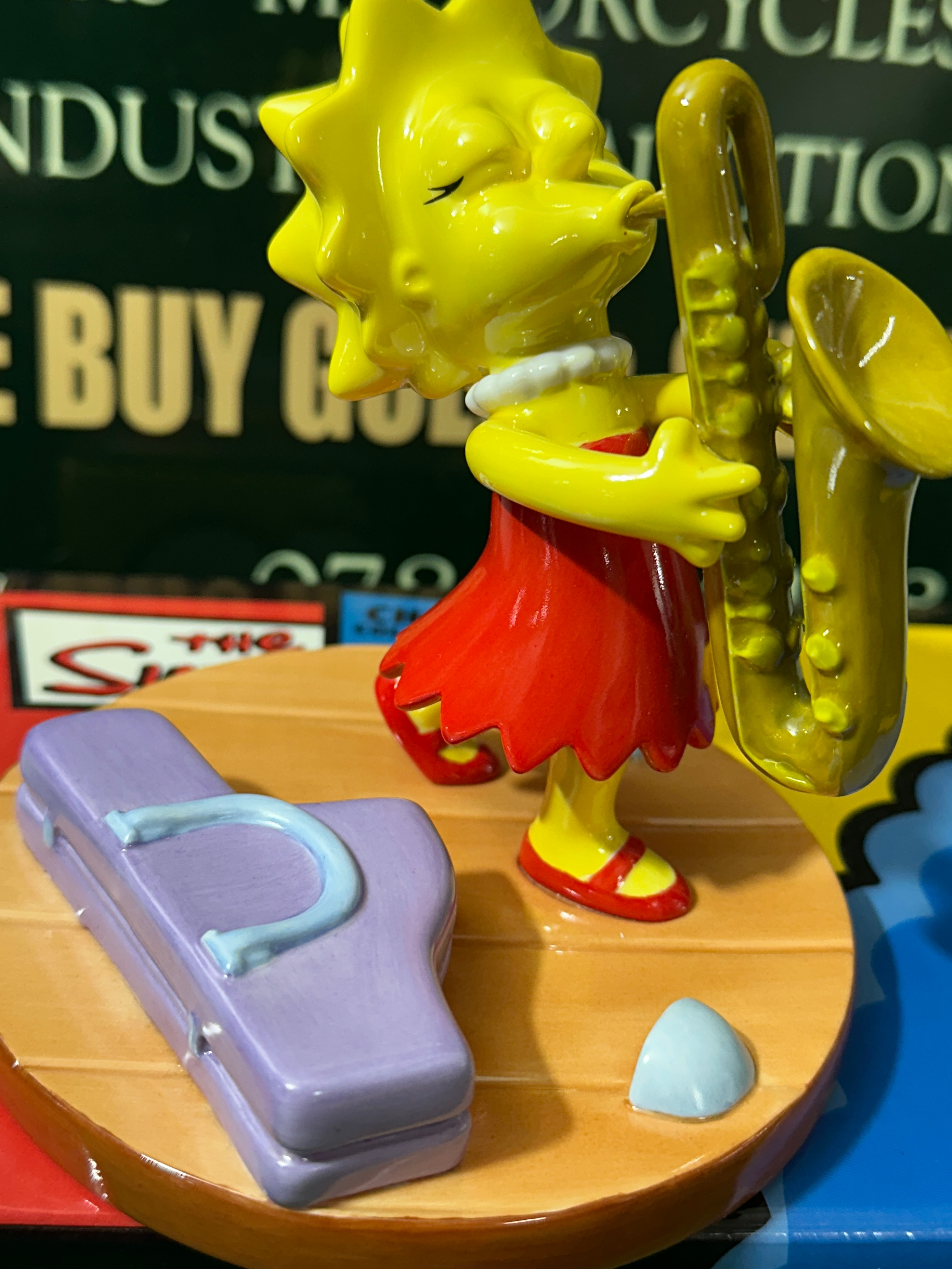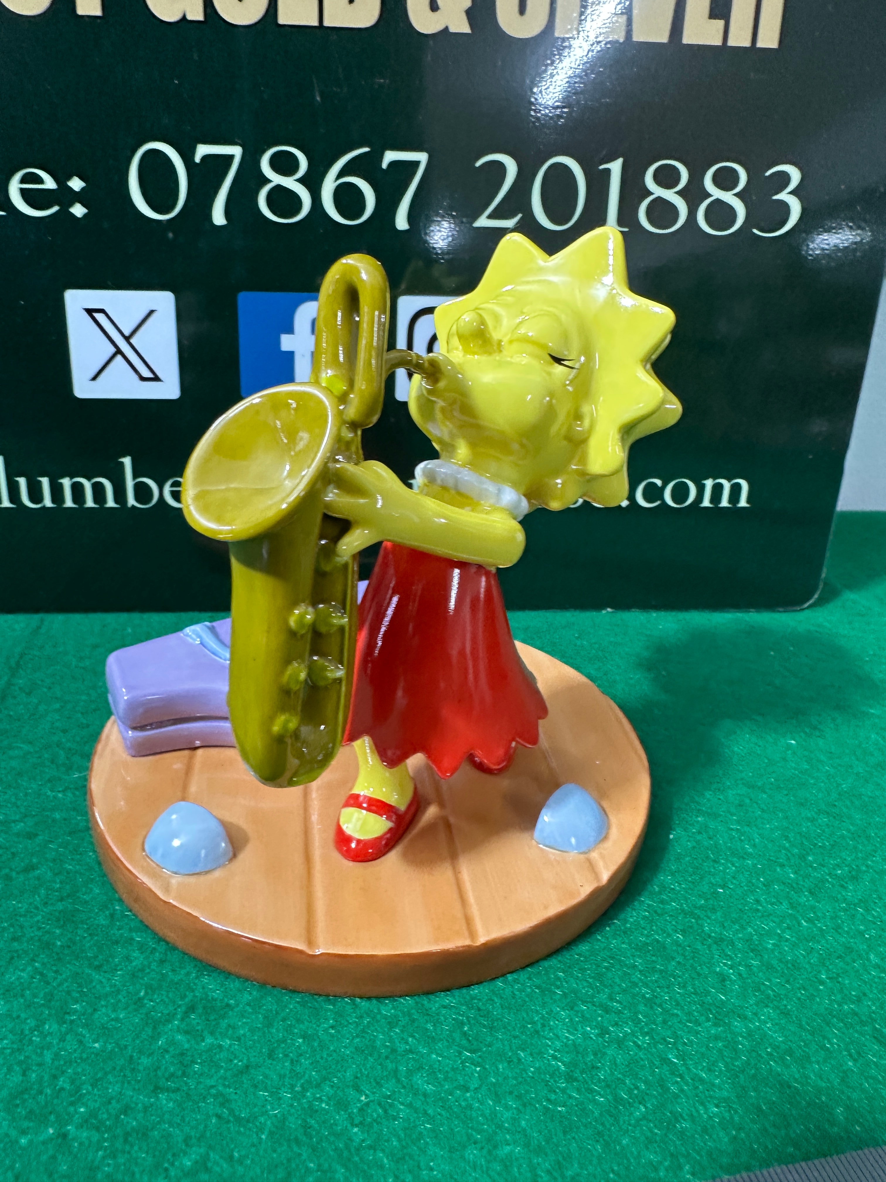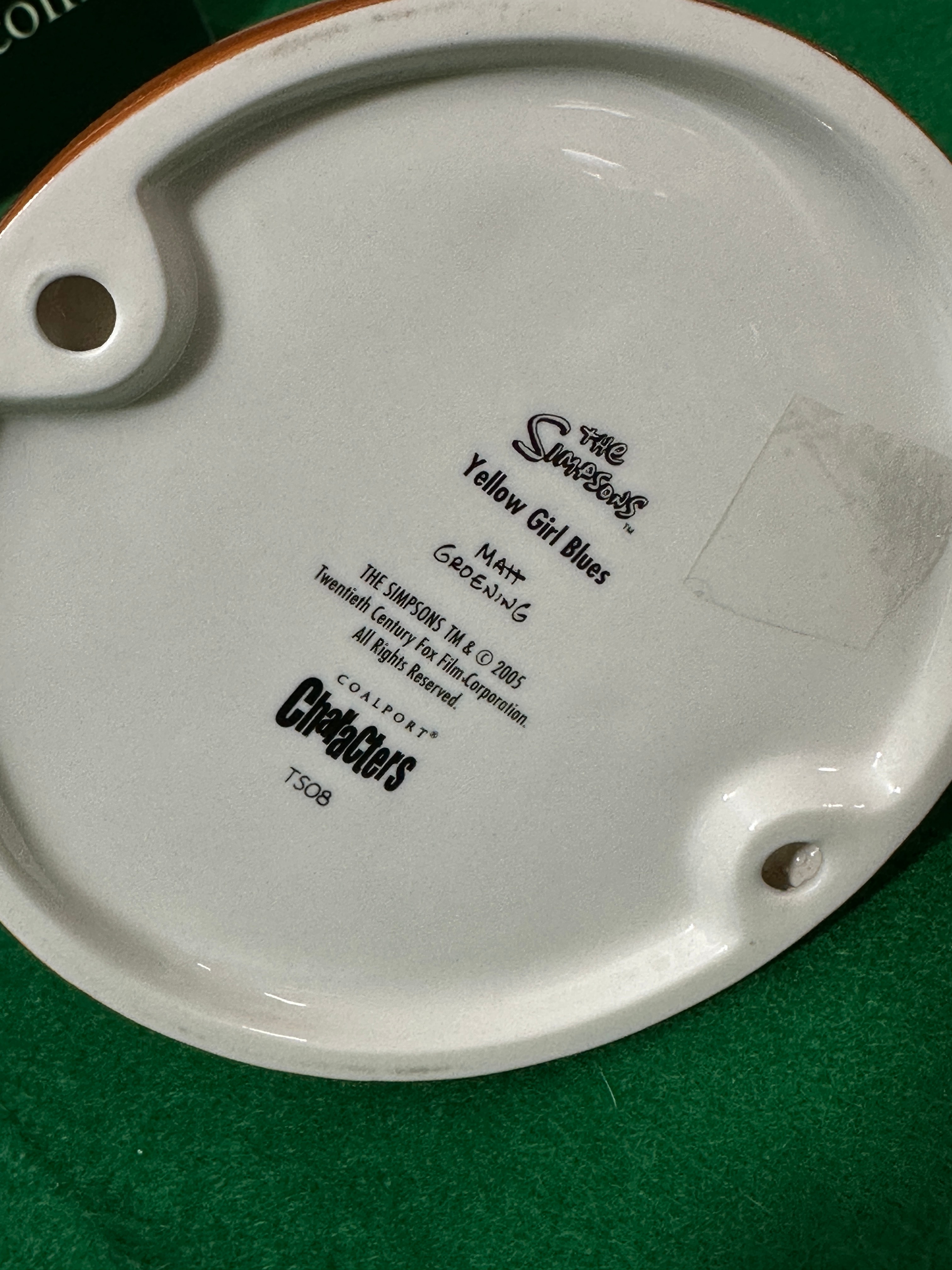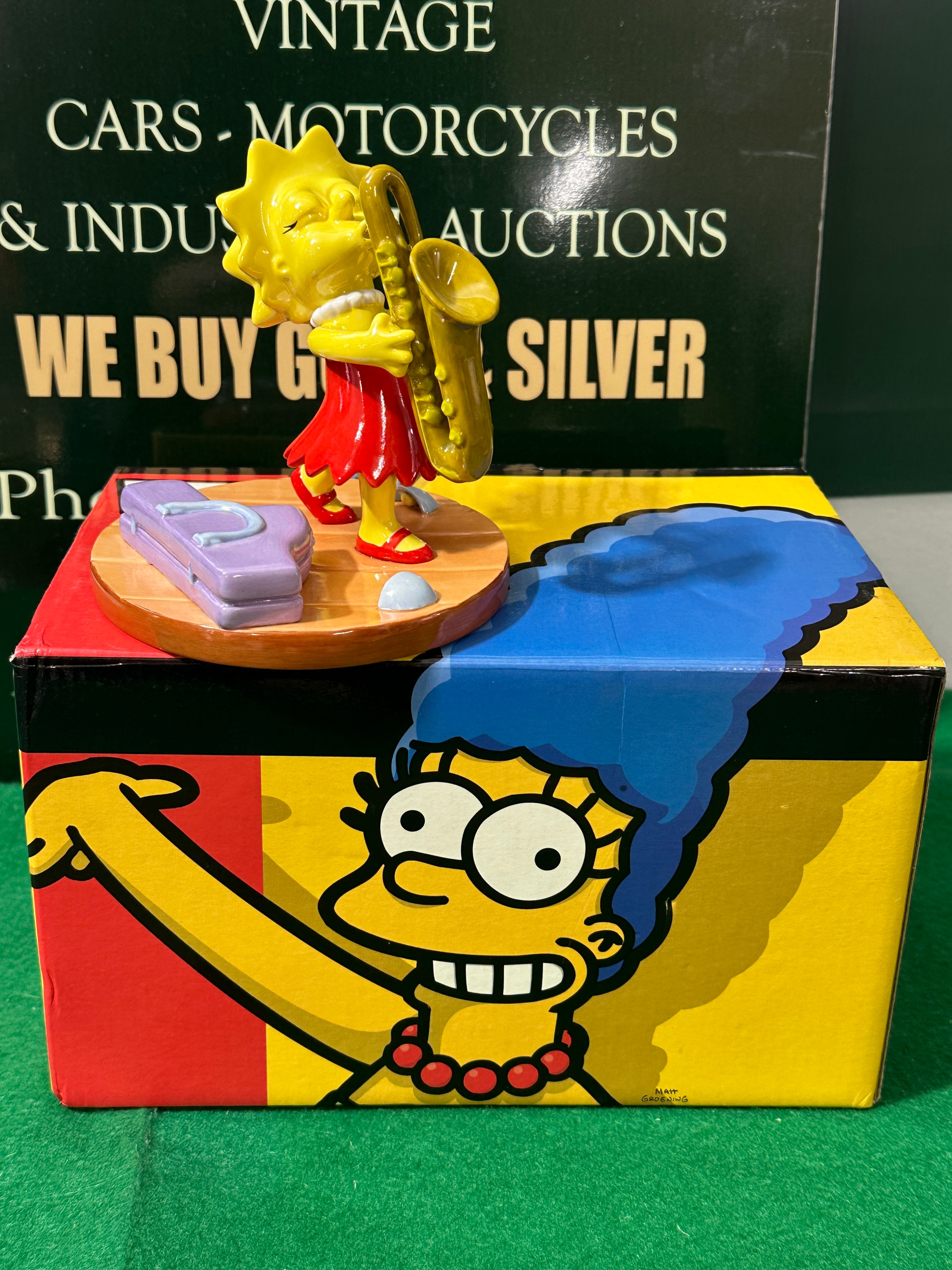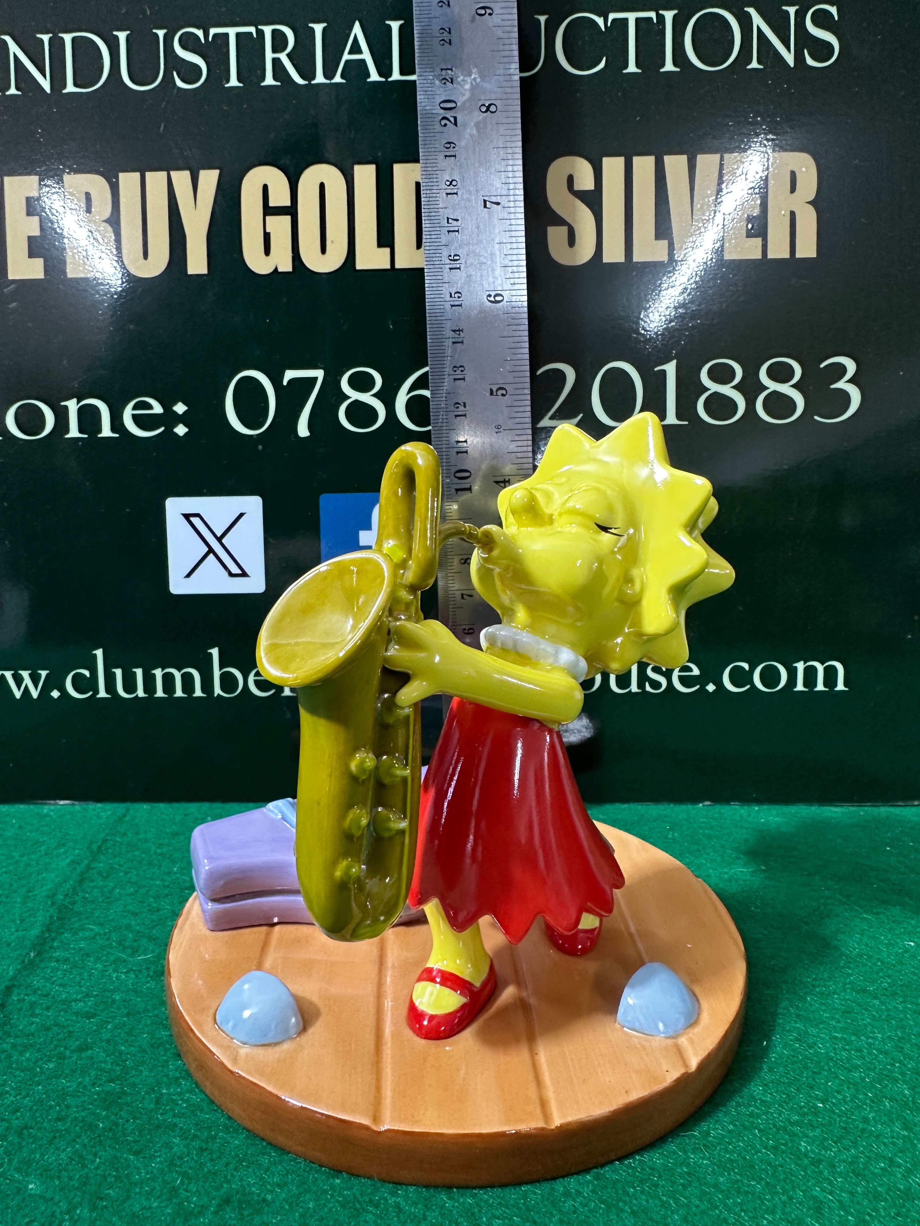 A glazed ceramic figurine by Coalport Characters, depicting the animated character Lisa Simpson from “The Simpsons” playing a yellow saxophone. Titled ‘Yellow Girl Blues’, the figurine stands on a round, wood-effect base which also features a purple saxophone case and two light blue accent pieces. The underside of the base is clearly marked with “THE Simpsons” logo, the title “Yellow Girl Blues,” “MATT GROENING,” and copyright information “THE SIMPSONS TM & © 2005 Twentieth Century Fox Film Corporation.” It also bears the manufacturer’s mark “COALPORT® CHaracTers TS08.” The item is a modern collectible, dated 2005, and is accompanied by its original box featuring Marge Simpson.