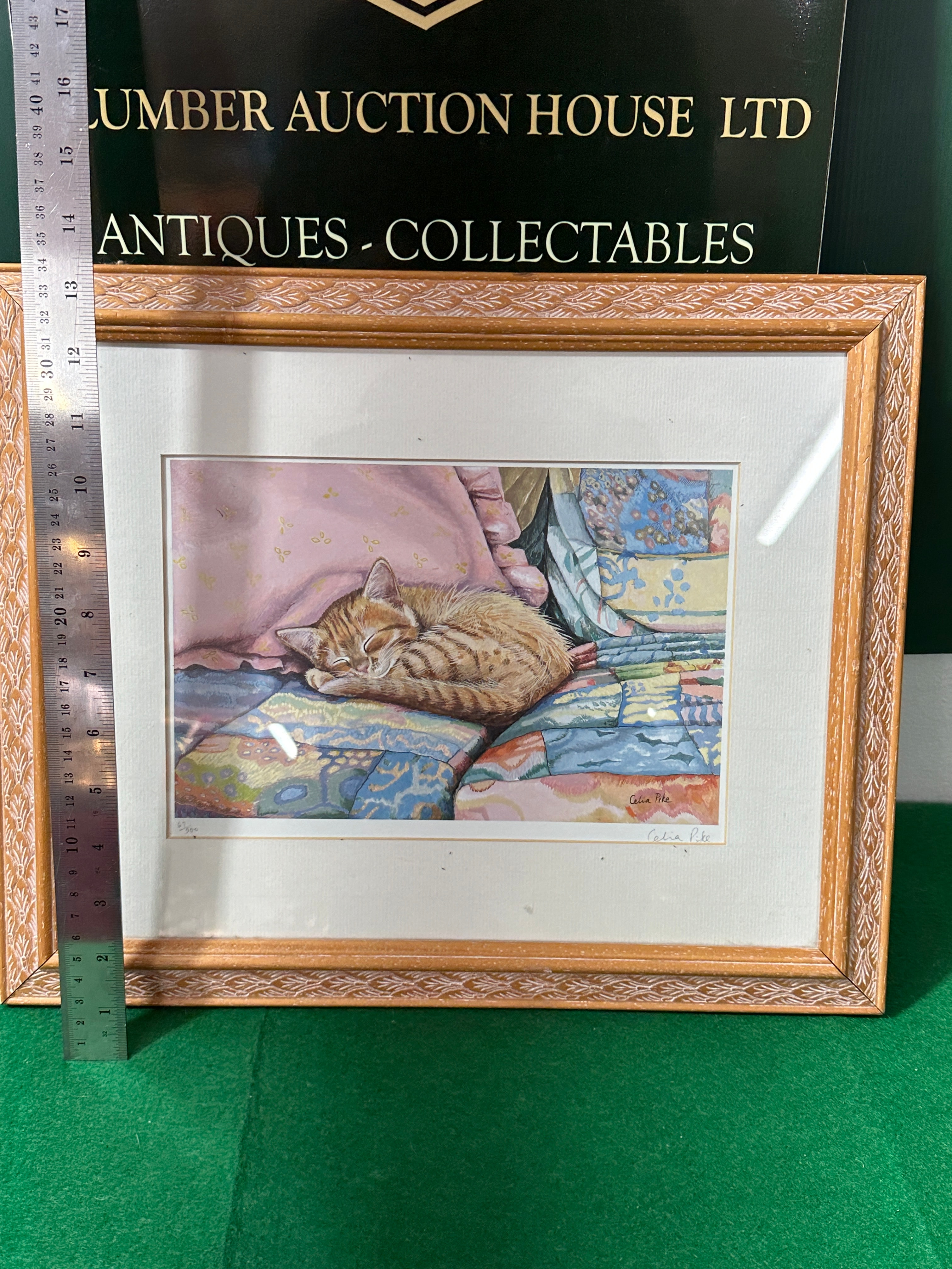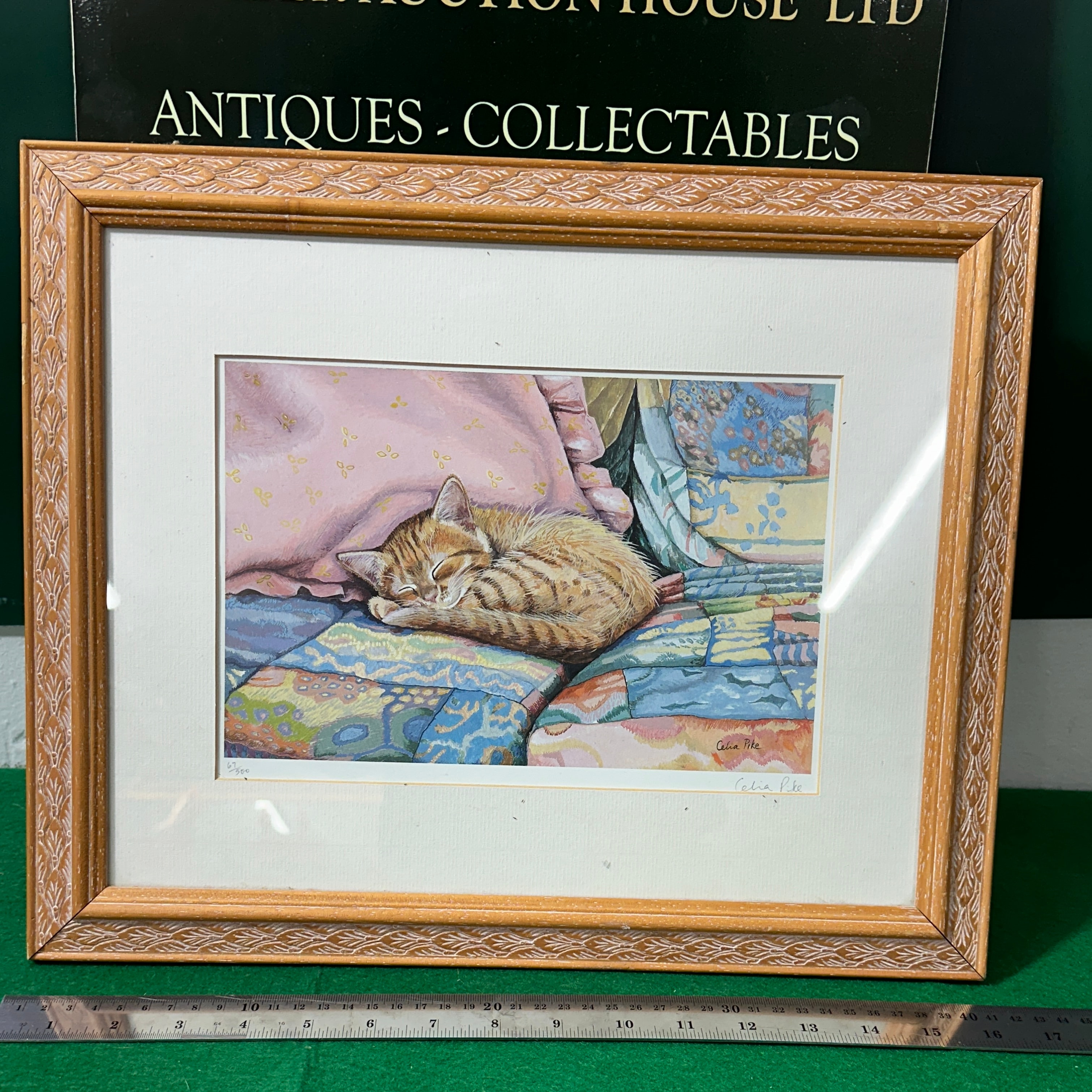 A framed limited edition print by Celia Pike, depicting a sleeping tabby cat. The print features a tabby cat nestled on a vibrant patchwork quilt. It is presented under glass within a light-colored wooden frame with a carved or molded decorative border and a white mat. The print is signed ‘Celia Pike’ in the lower right corner. A limited edition number, ‘5/’ followed by an illegible second number, and potentially the word ‘Print’ are visible in the lower left corner.