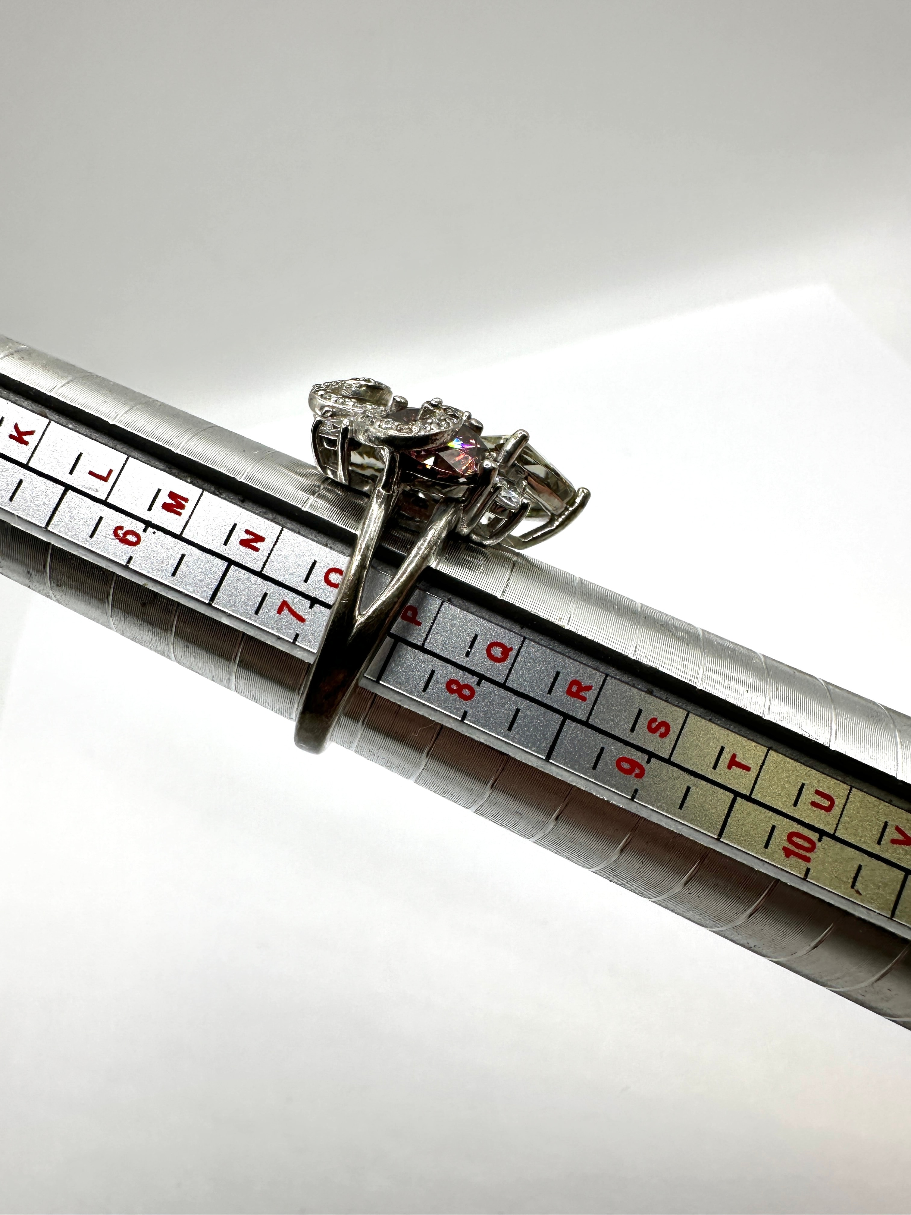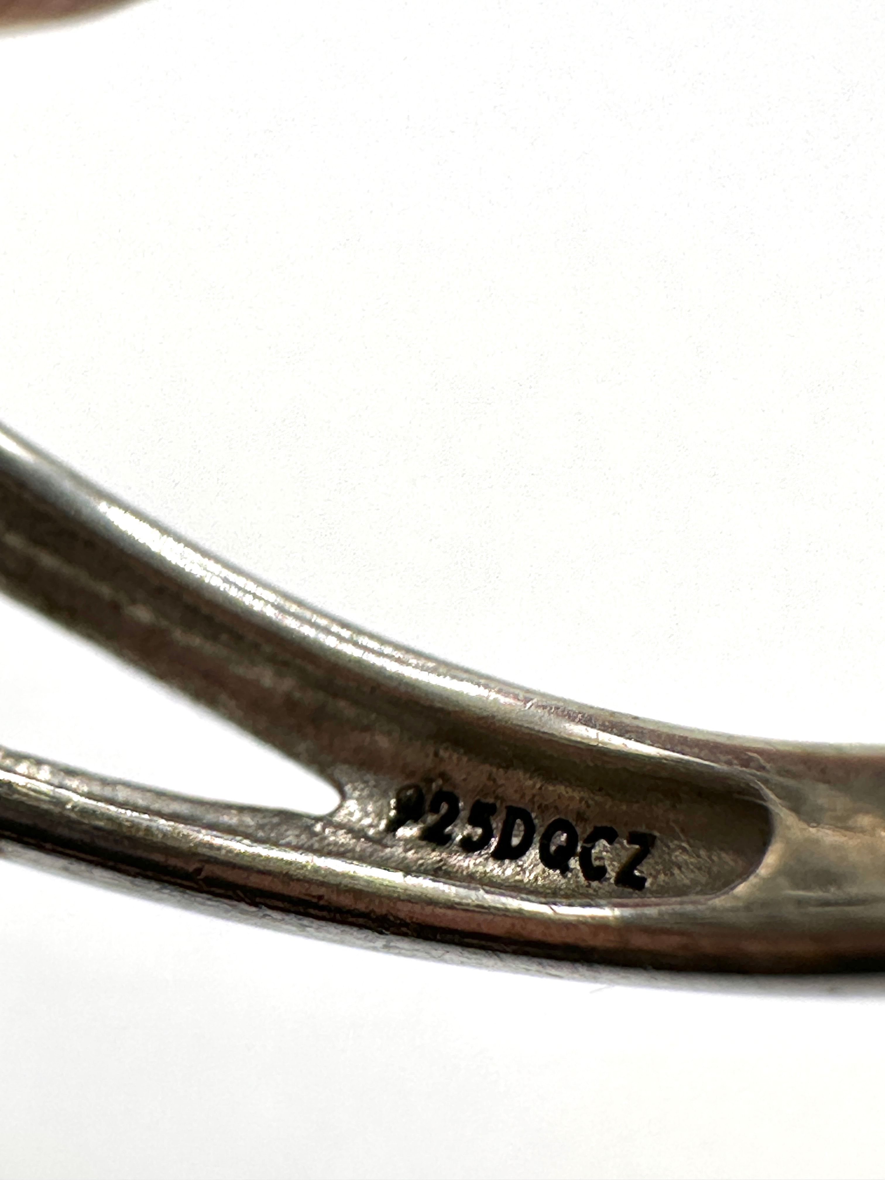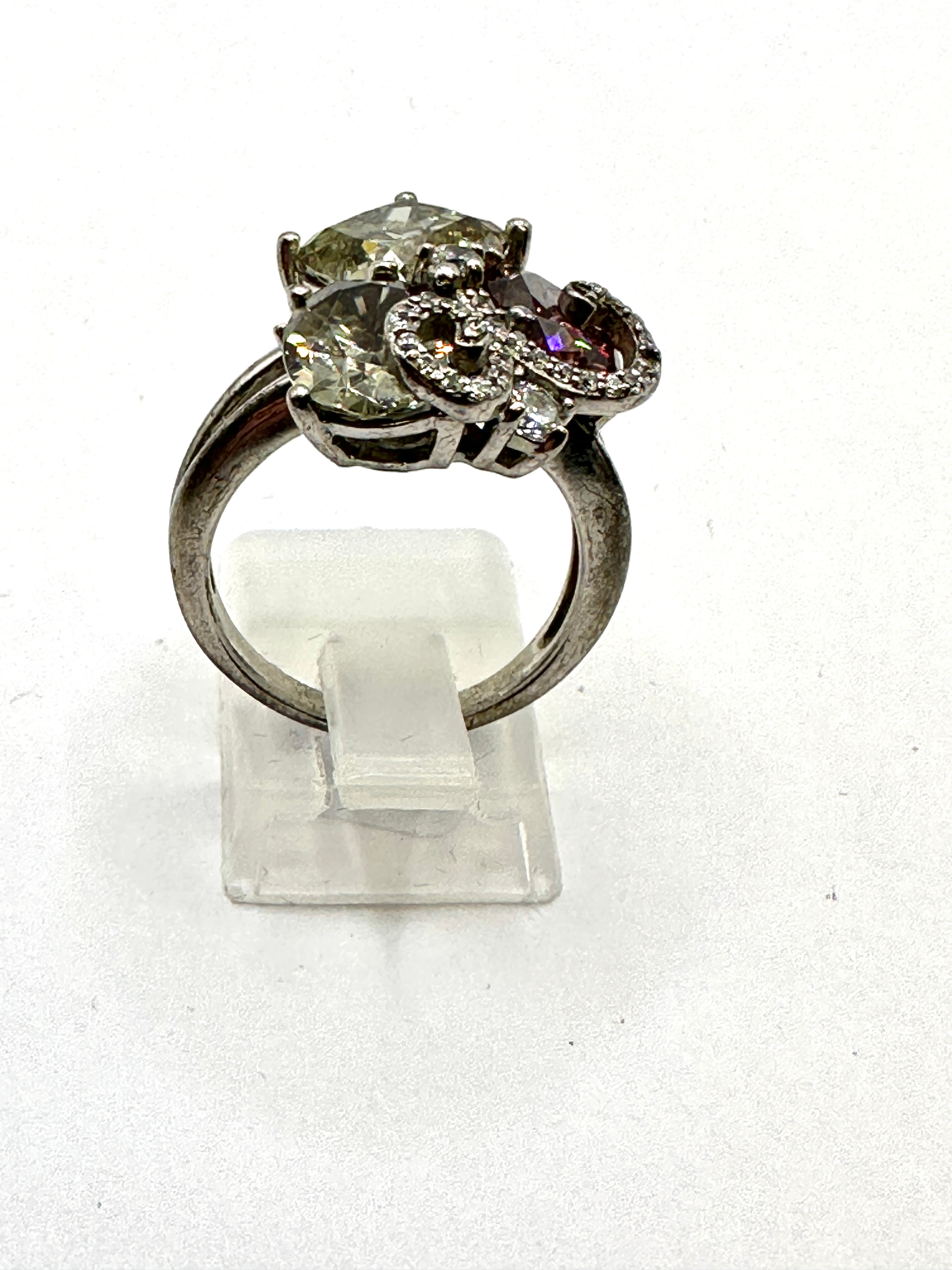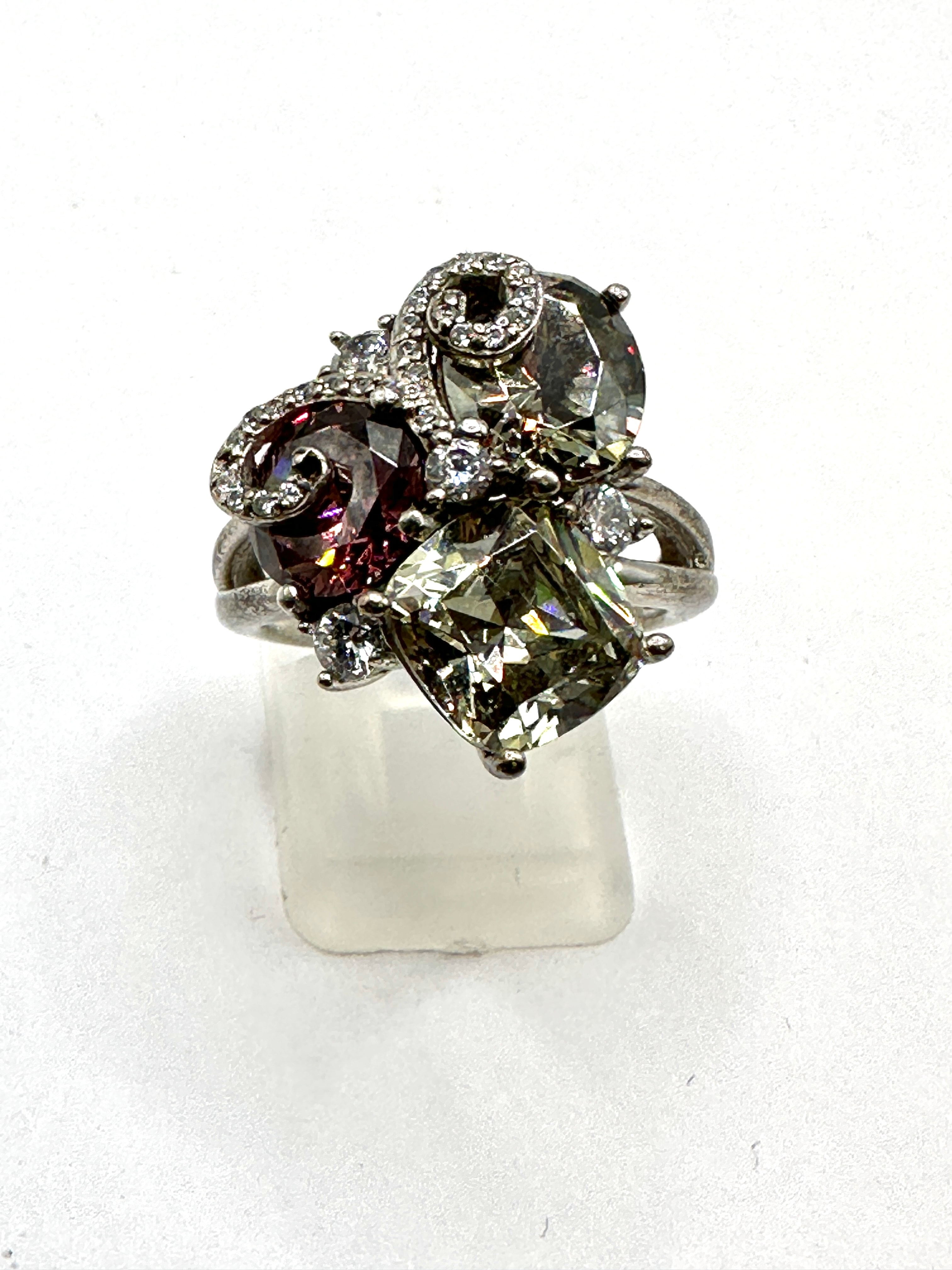 A contemporary sterling silver cocktail ring, approximately US size 8, featuring an abstract multi-stone cluster design. The ring’s face showcases three prominent faceted simulant stones: one cushion-cut light olive-green, and two oval-cut stones—one reddish-purple and another light olive-green. These are complemented by numerous smaller, round, colorless accent stones pave-set into swirling metalwork. The interior of the band is stamped “925DQZ”, indicating sterling silver and identifying the larger stones as diamond-quality cubic zirconia or a similar simulant.