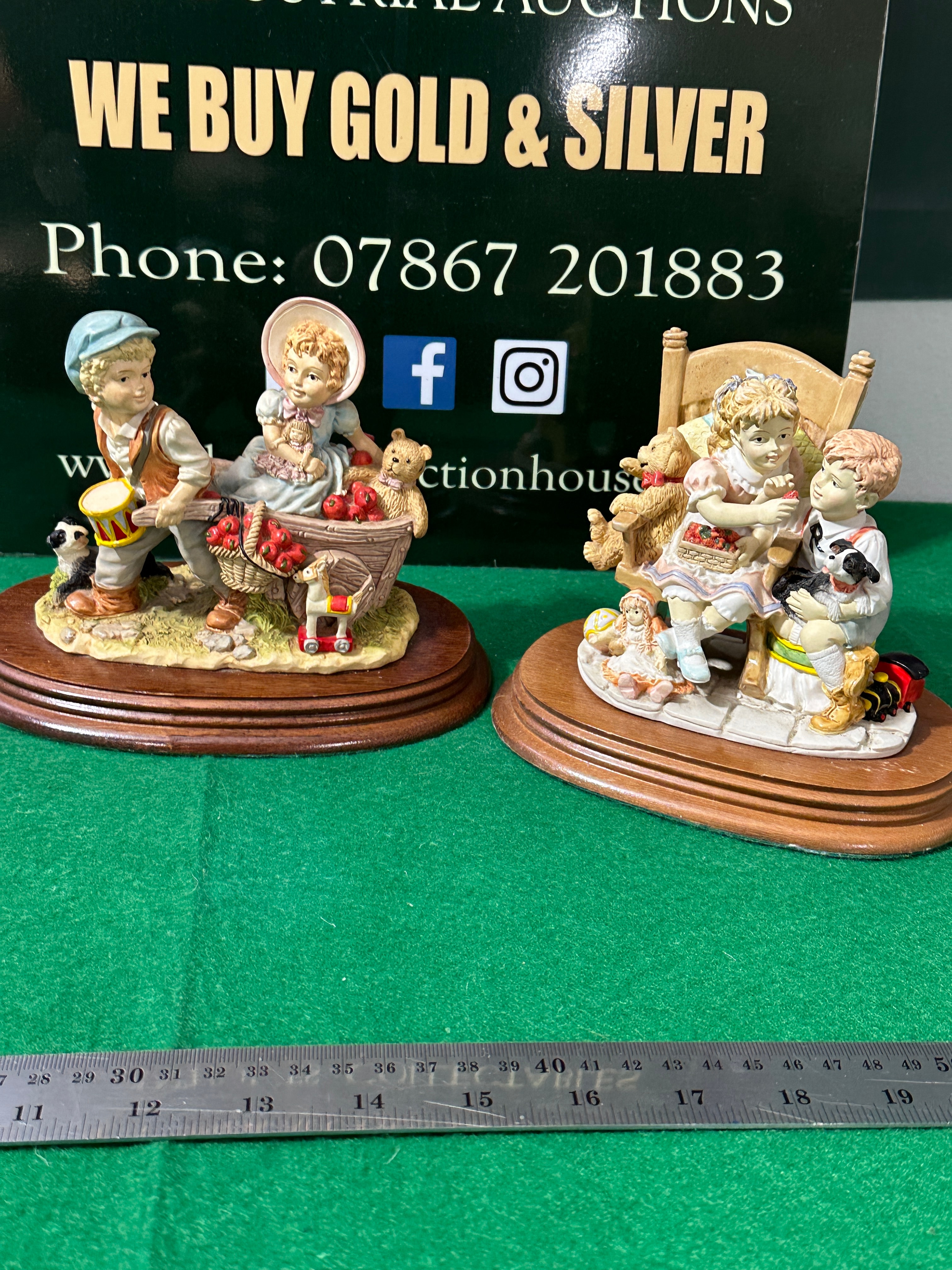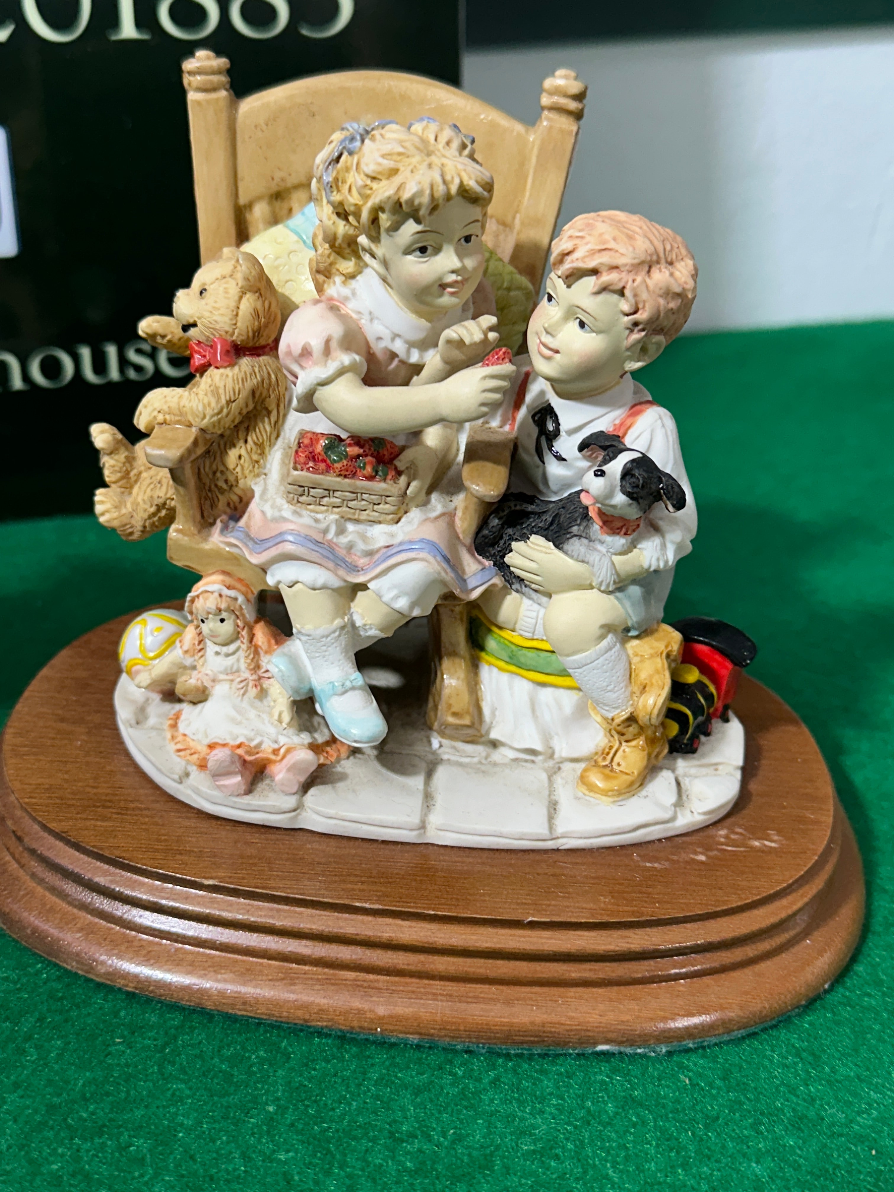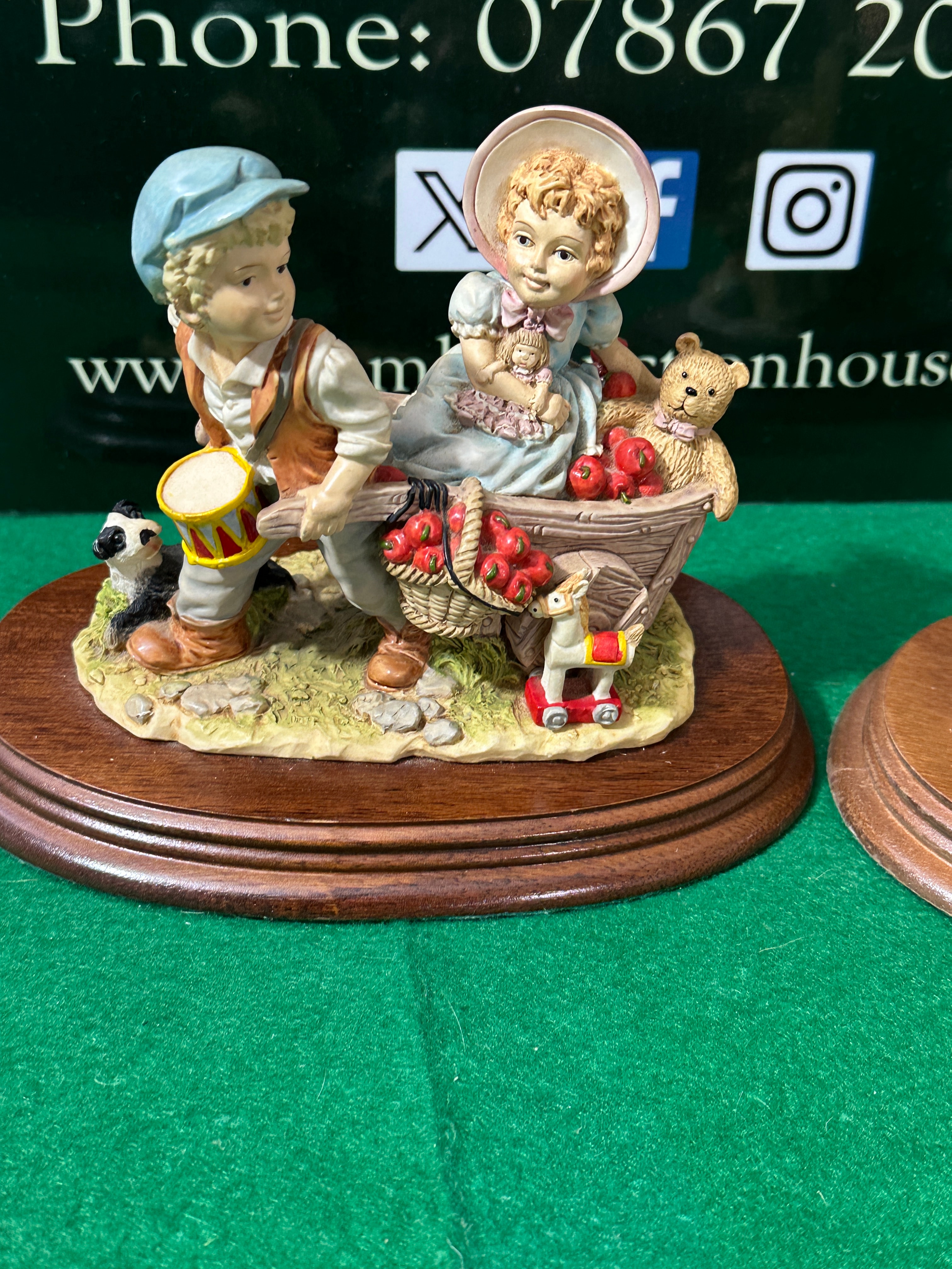 A pair of The Leonardo Collection figurines, titled “Playing In The Orchard” and “Best Friends,” produced in 1997. These decorative figurine groups are crafted from resin or cold-cast porcelain, each mounted on a polished wooden plinth with a green felt underside. The first piece, “Playing In The Orchard,” depicts a boy pushing a wheelbarrow containing a girl, apples, and toys, accompanied by a small dog. The second piece, “Best Friends,” features a boy and girl seated together, surrounded by toys, with the girl holding a basket of strawberries and the boy cradling a small dog. Both compositions are executed in a sentimental, pastoral style with detailed, hand-painted finishes.