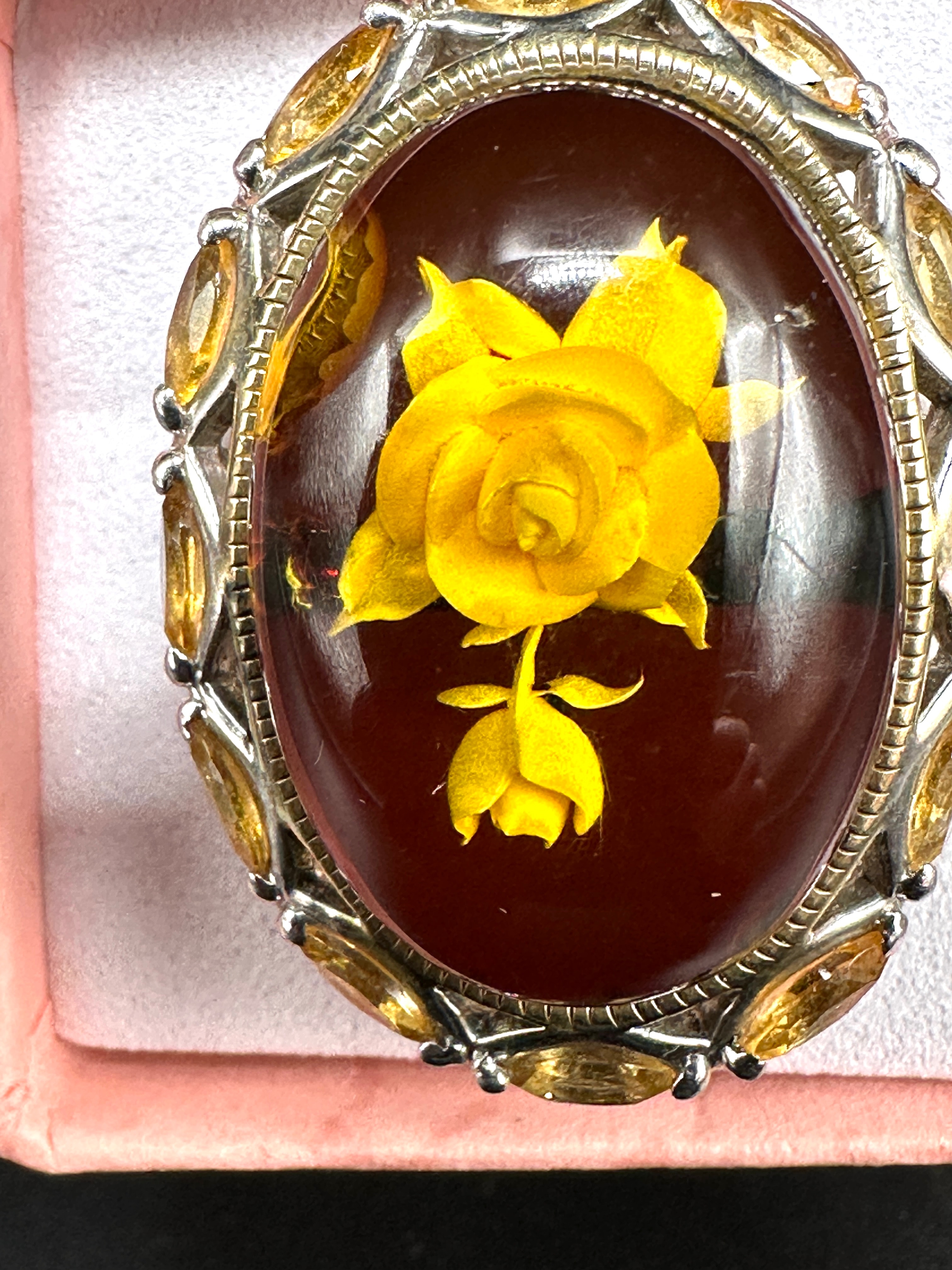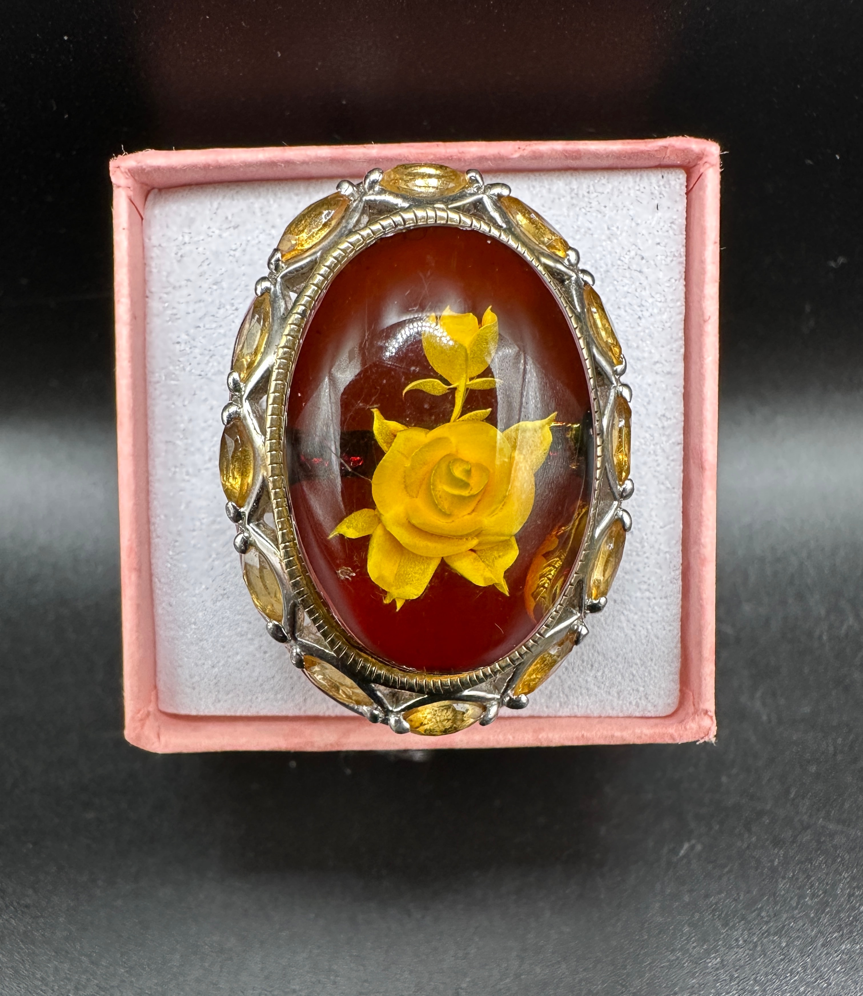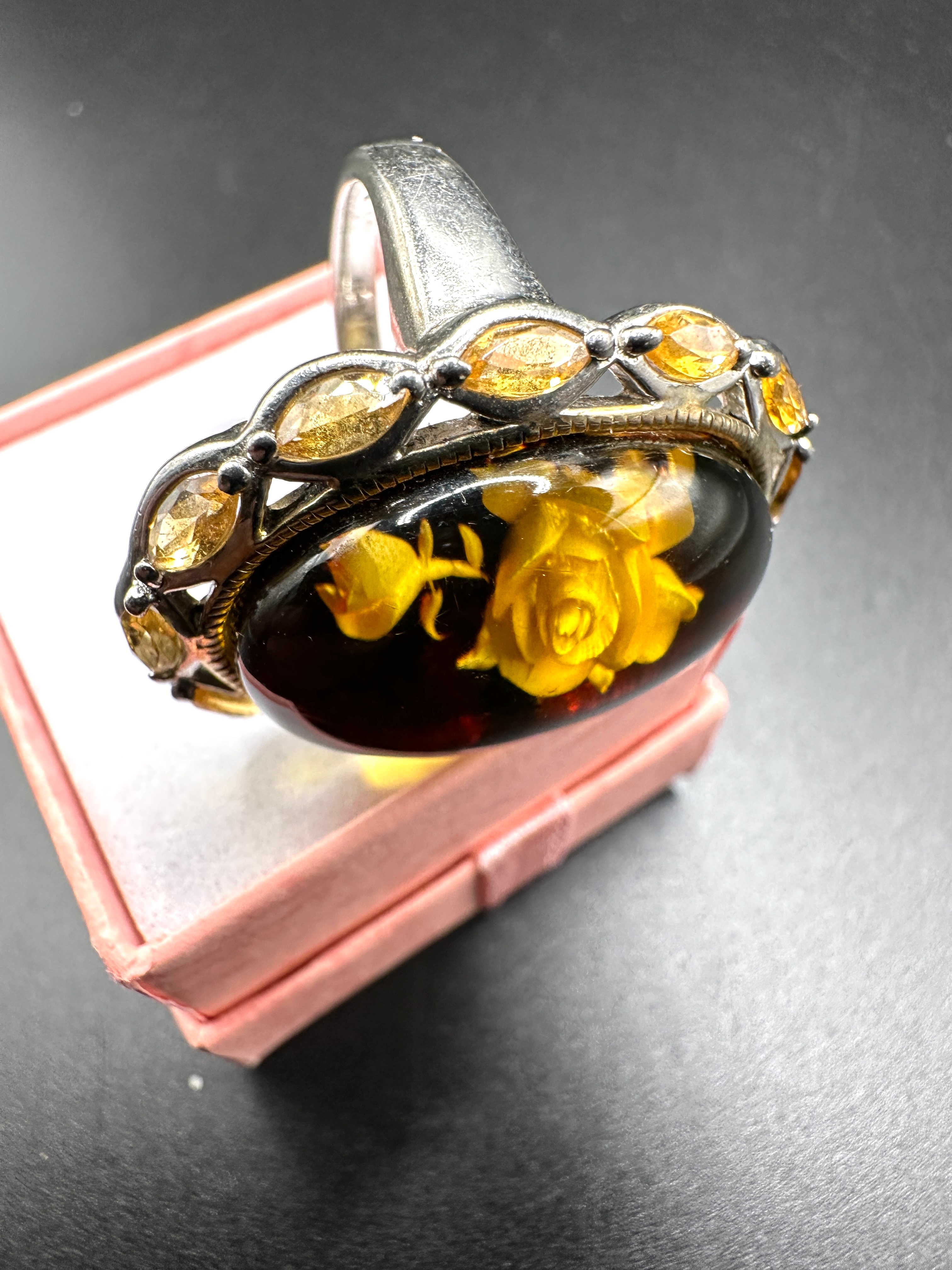 A Sterling Silver Reverse Intaglio Amber Rose Ring. This oval-shaped statement ring features a central translucent dark reddish-brown cabochon, which encapsulates a detailed yellow floral inclusion resembling a rose, consistent with reverse intaglio carving. The central stone is set in a silver-toned metal frame surrounded by a border of numerous small, oval-cut, yellow-orange translucent stones. The ring’s band is made of sterling silver, indicated by the ‘925’ mark on the interior.
