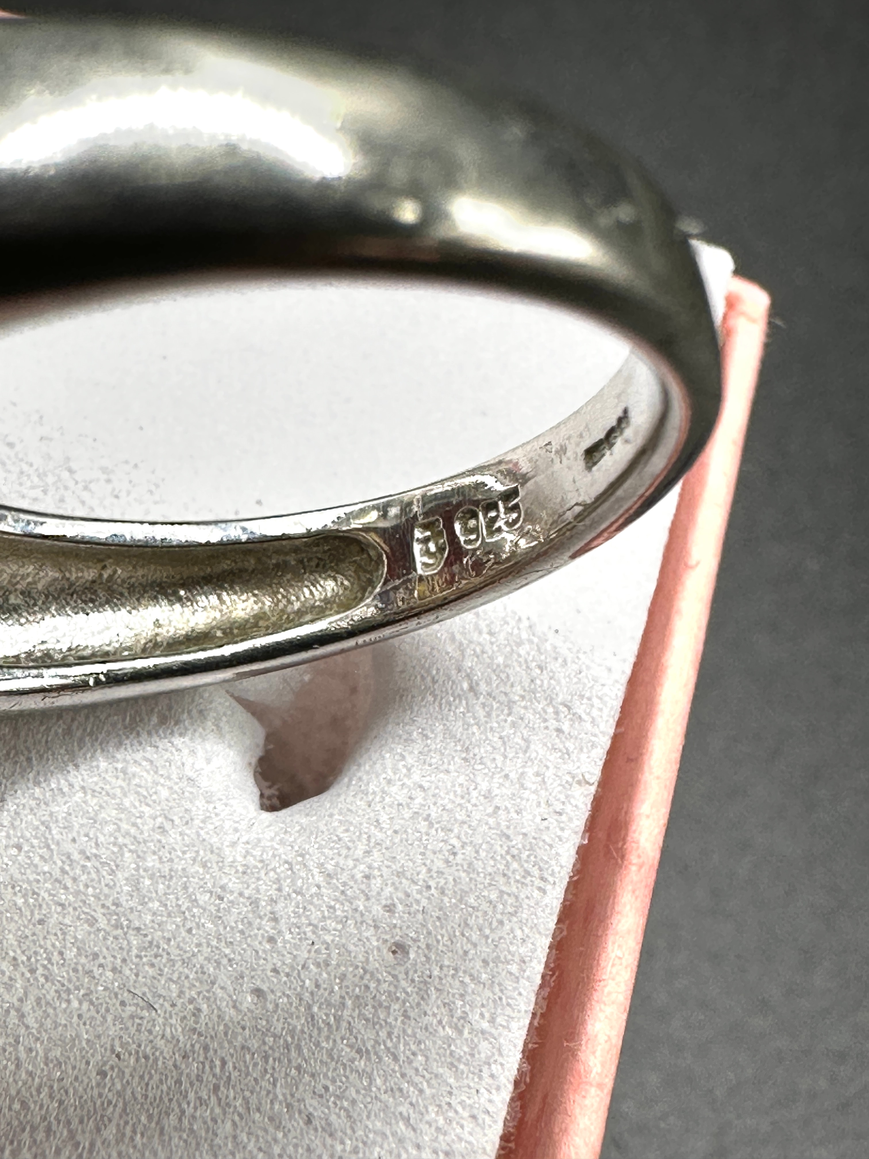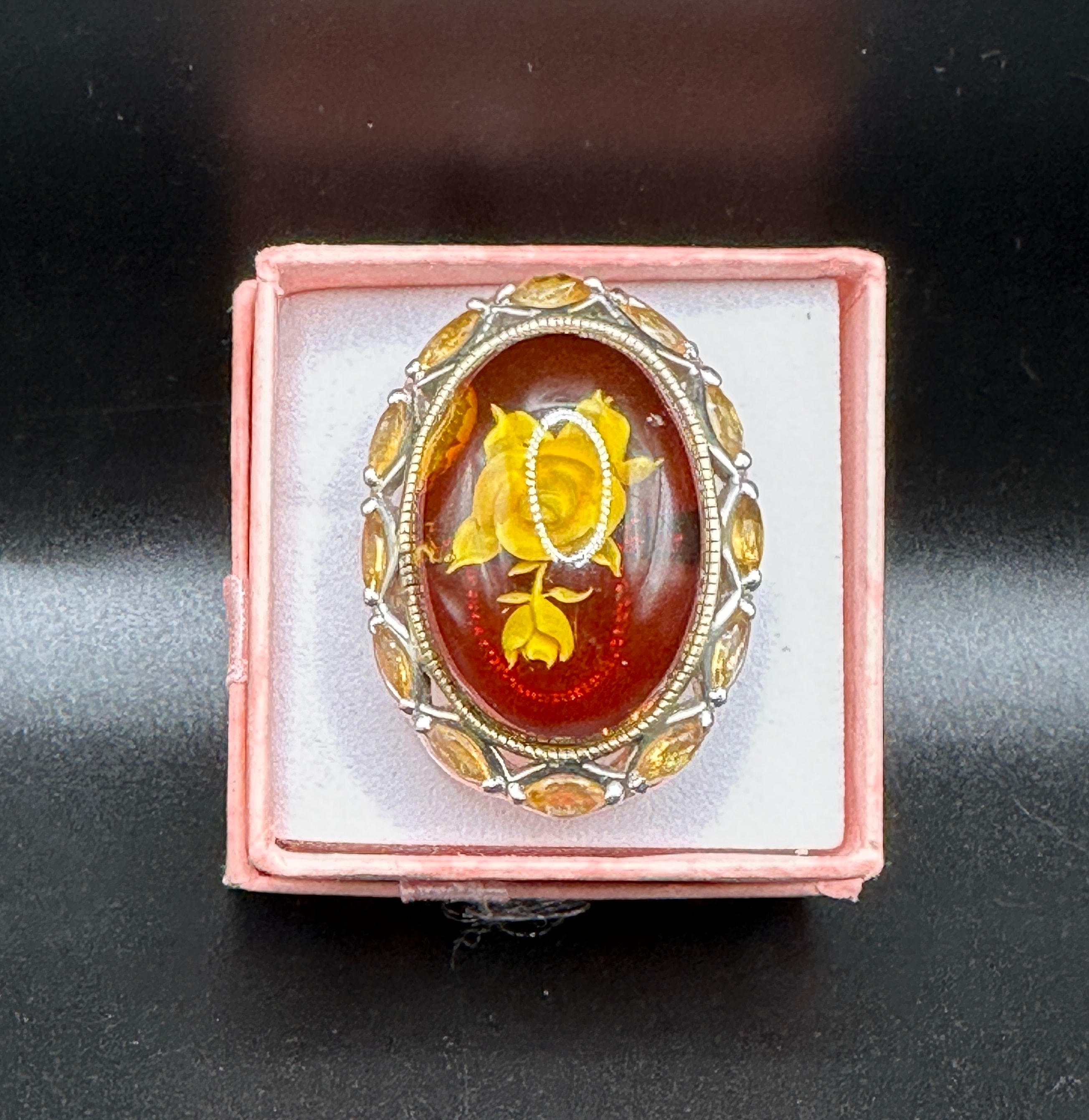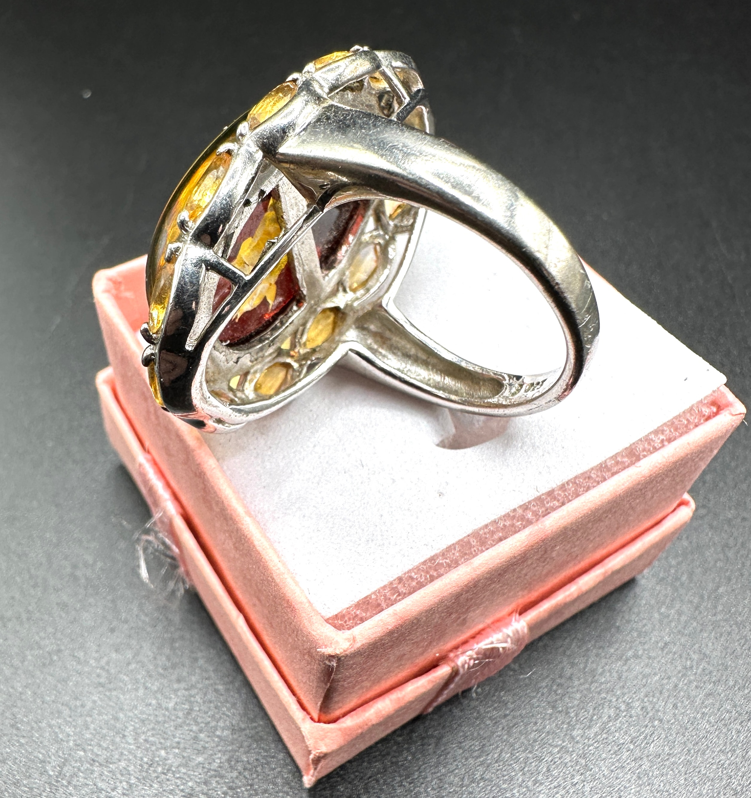 A Sterling Silver Reverse Intaglio Amber Rose Ring. This oval-shaped statement ring features a central translucent dark reddish-brown cabochon, which encapsulates a detailed yellow floral inclusion resembling a rose, consistent with reverse intaglio carving. The central stone is set in a silver-toned metal frame surrounded by a border of numerous small, oval-cut, yellow-orange translucent stones. The ring’s band is made of sterling silver, indicated by the ‘925’ mark on the interior.