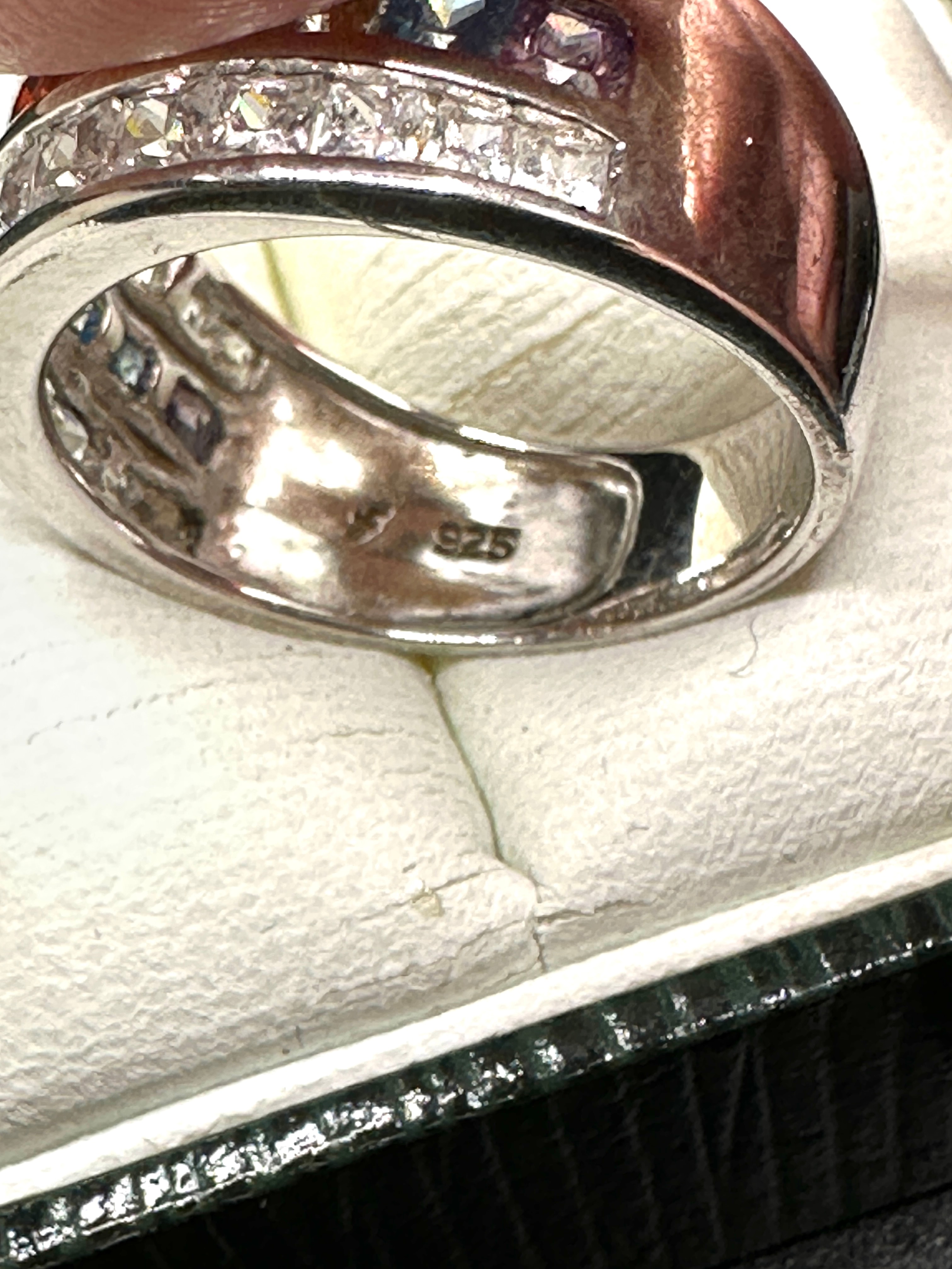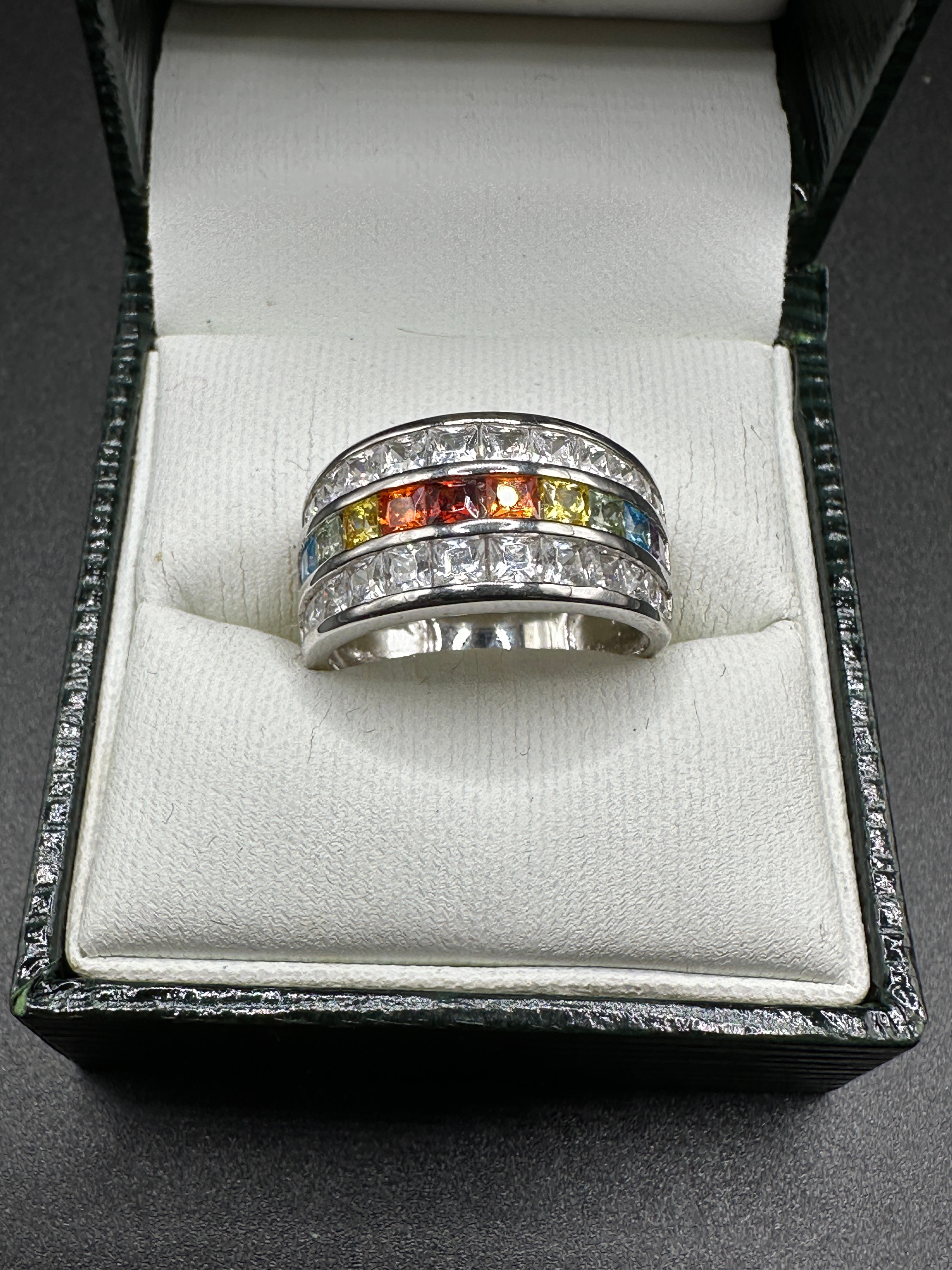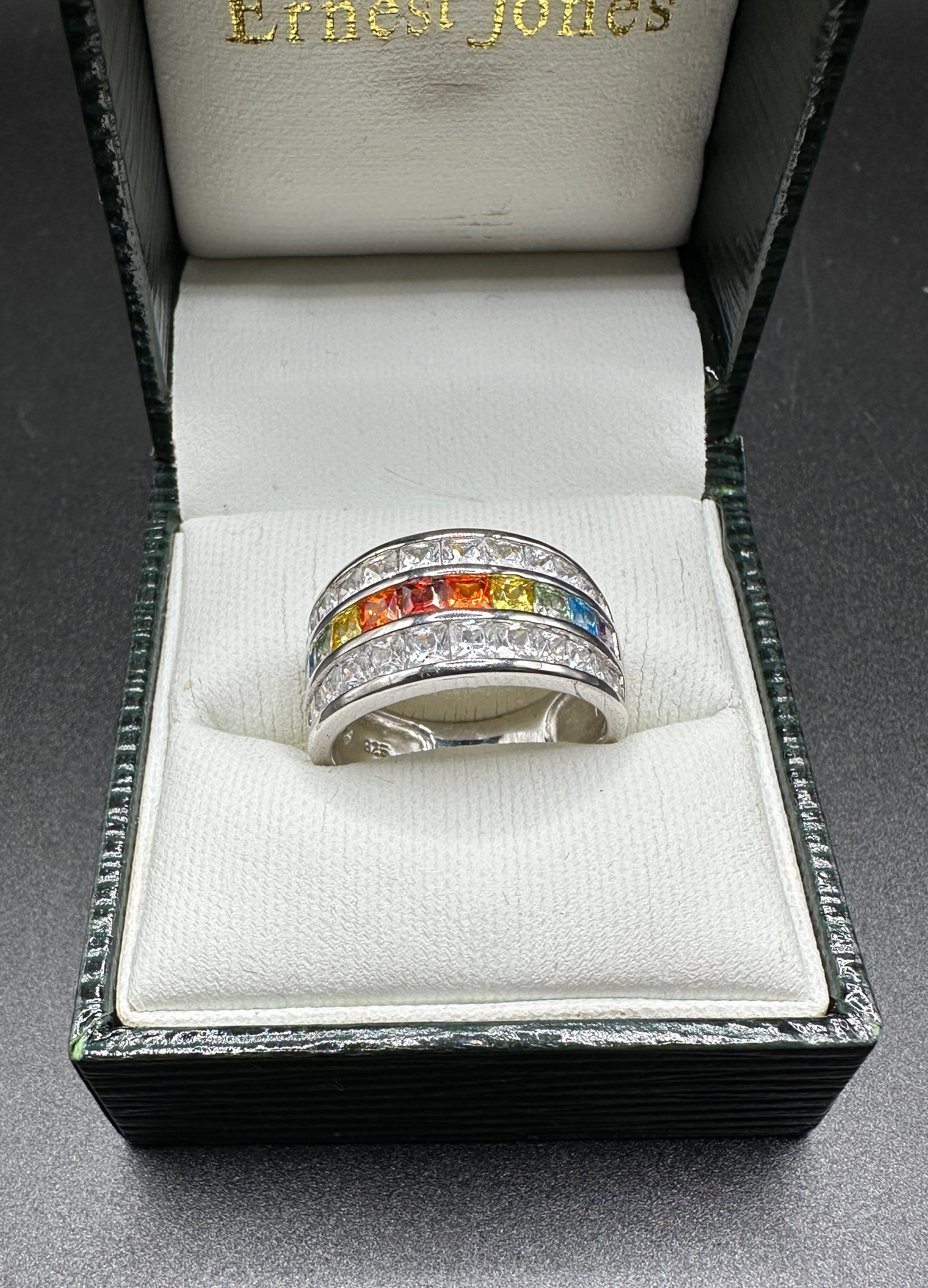 A Park Lane ‘Over the Rainbow’ ring, crafted in sterling silver, marked ‘925’ to the interior band. The wide, multi-row band features a central row of channel-set, square-cut, multi-colored stones displaying a spectrum of red, orange, yellow, green, blue, and purple hues. This central row is flanked by two outer rows of channel-set, square-cut, clear stones. Presented within an ‘Ernest Jones’ branded dark green and white box.
