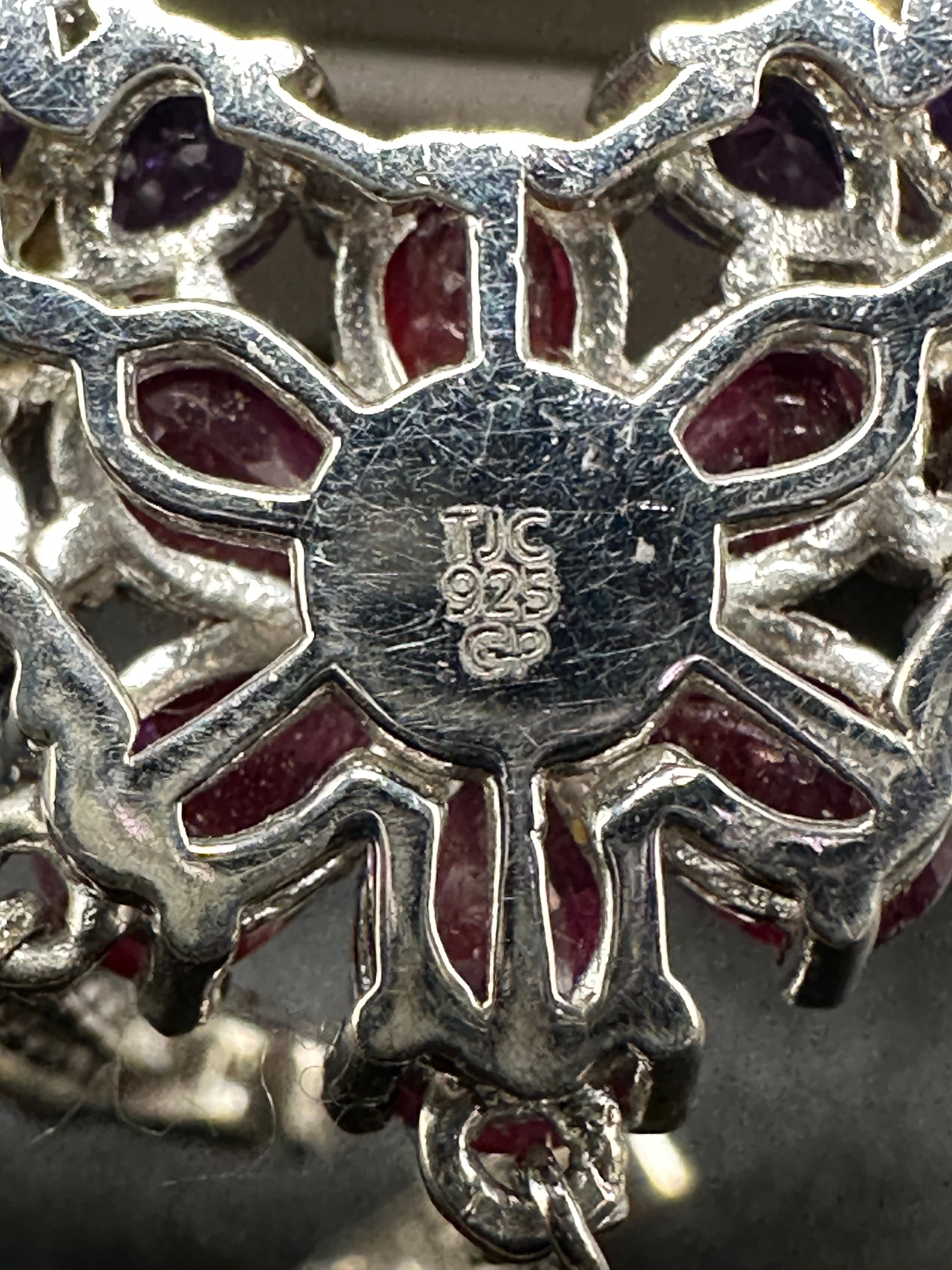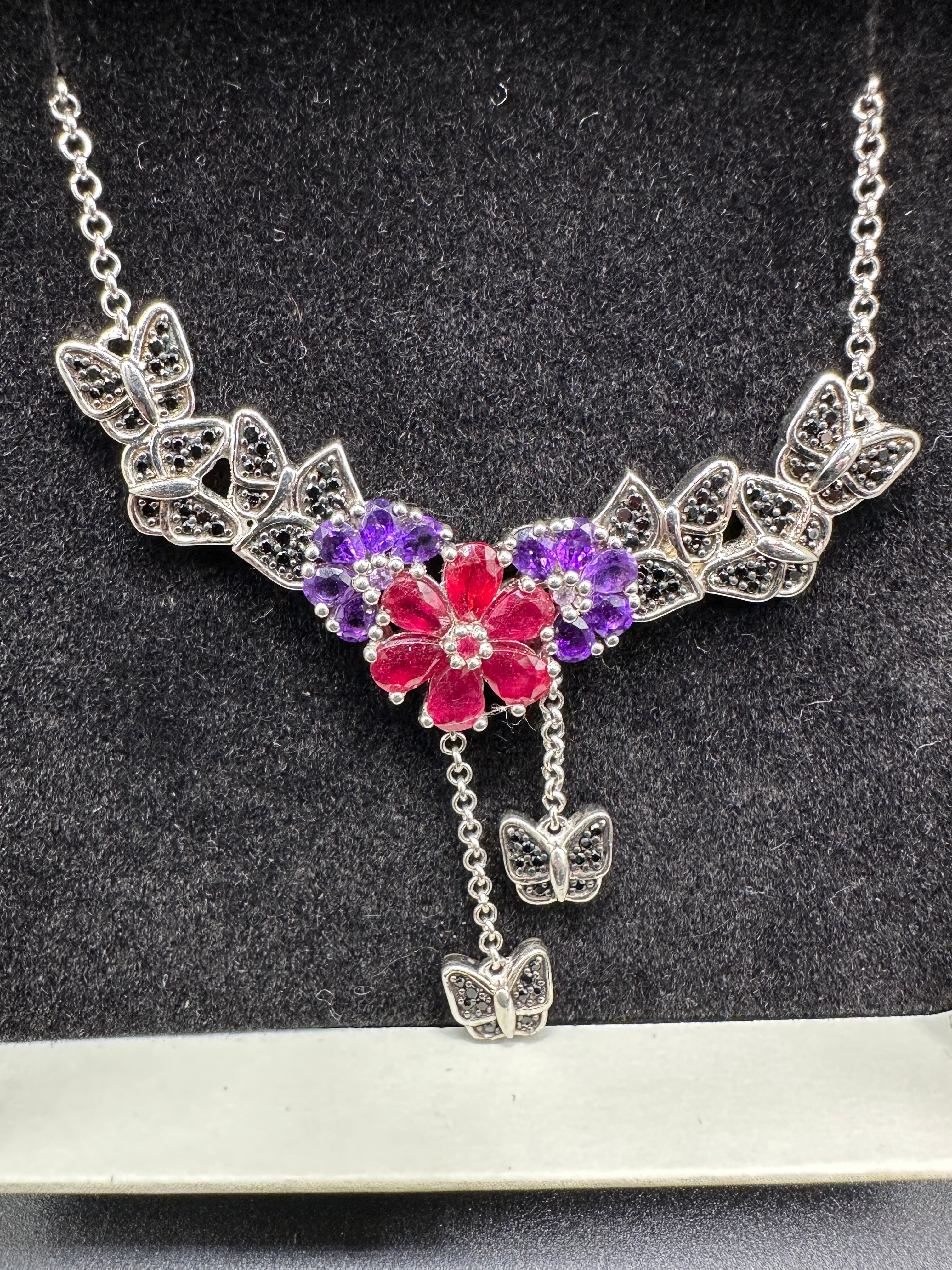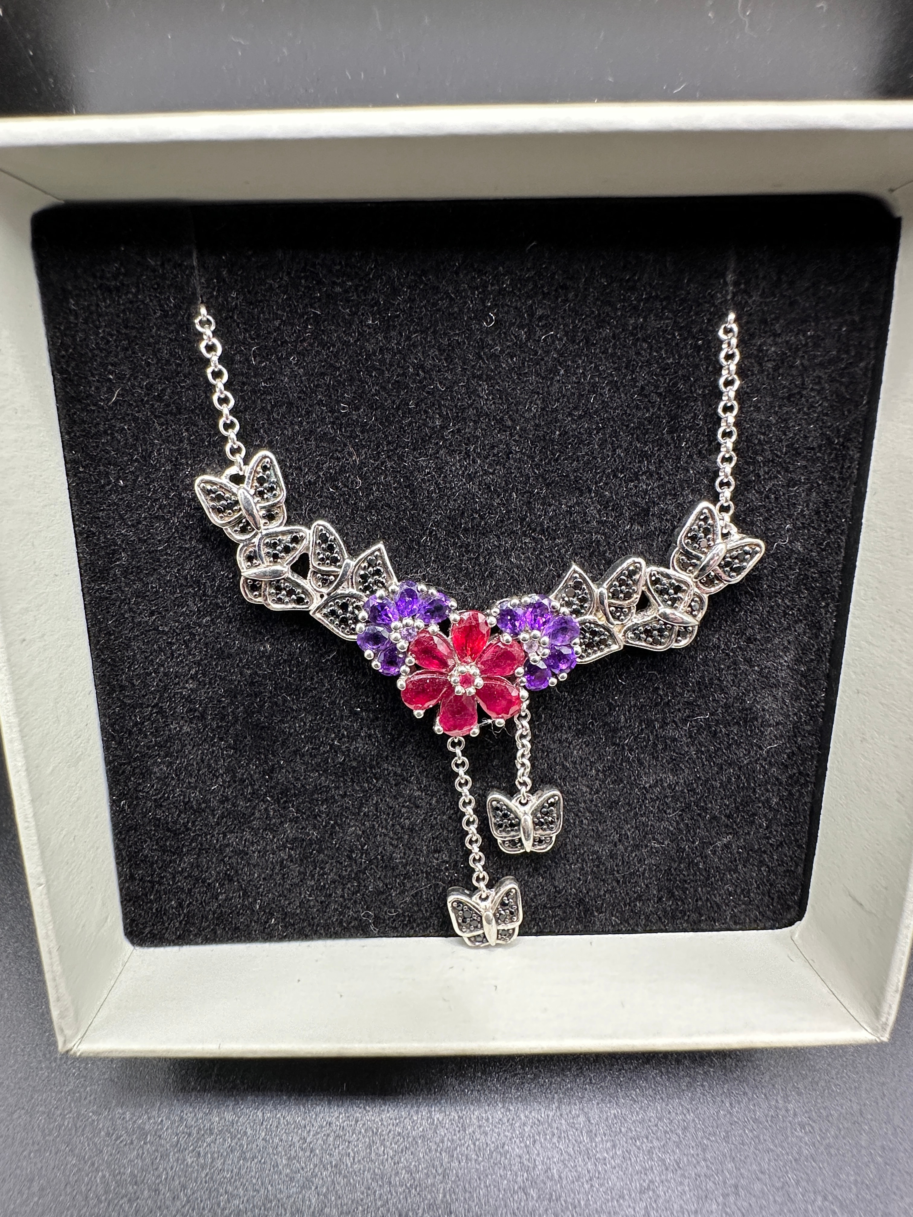 A modern Sterling Silver necklace, verified by the “925” hallmark, featuring a central collar-style pendant. The design prominently displays a floral and butterfly motif, with a central flower set with red/pink faceted stones, flanked by two flowers set with purple faceted stones. The remaining elements of the collar and three dangling butterflies are adorned with numerous small, black faceted stones. The reverse of the central pendant is also marked with “TJC” and “QJ”. The necklace is presented in a white gift box.